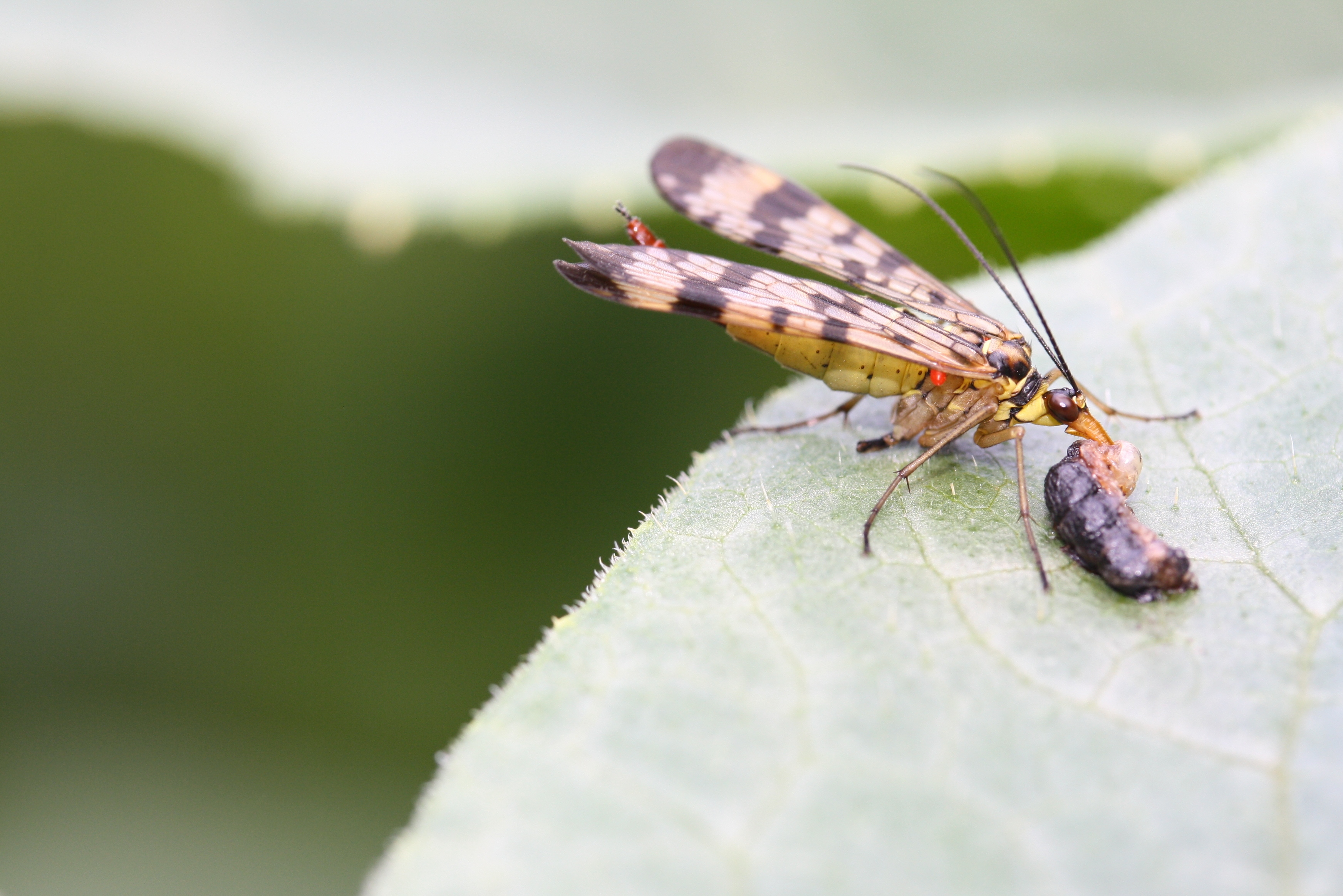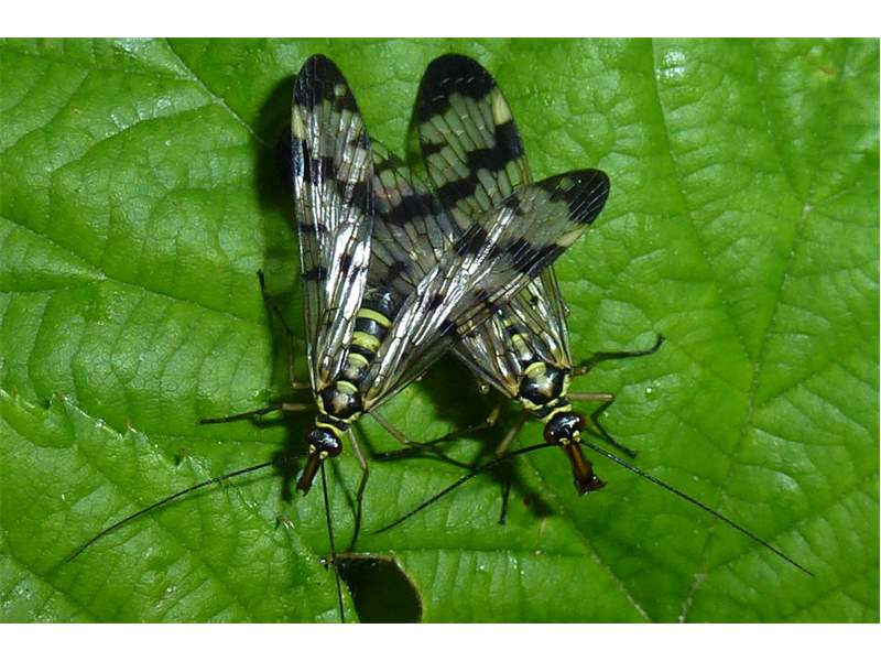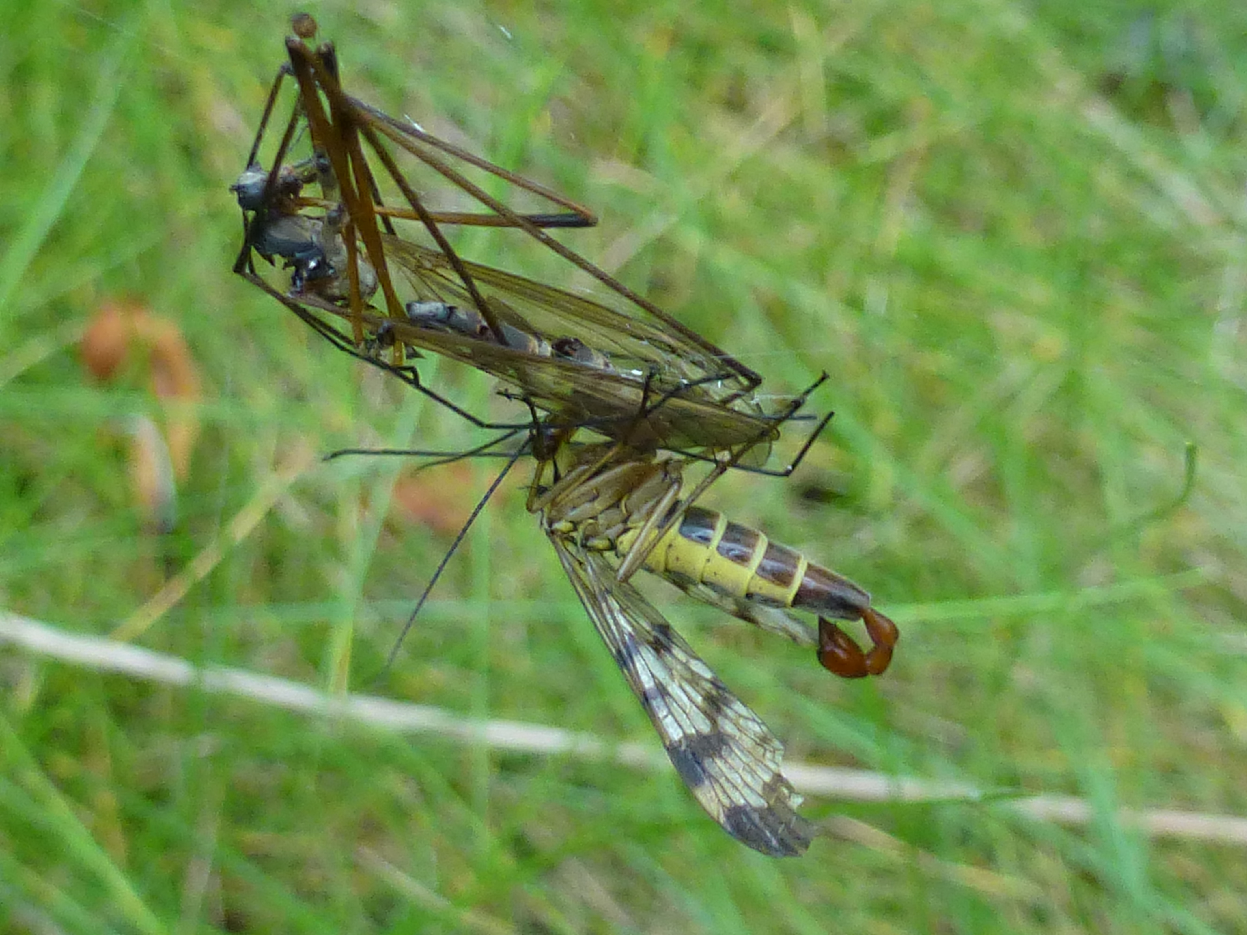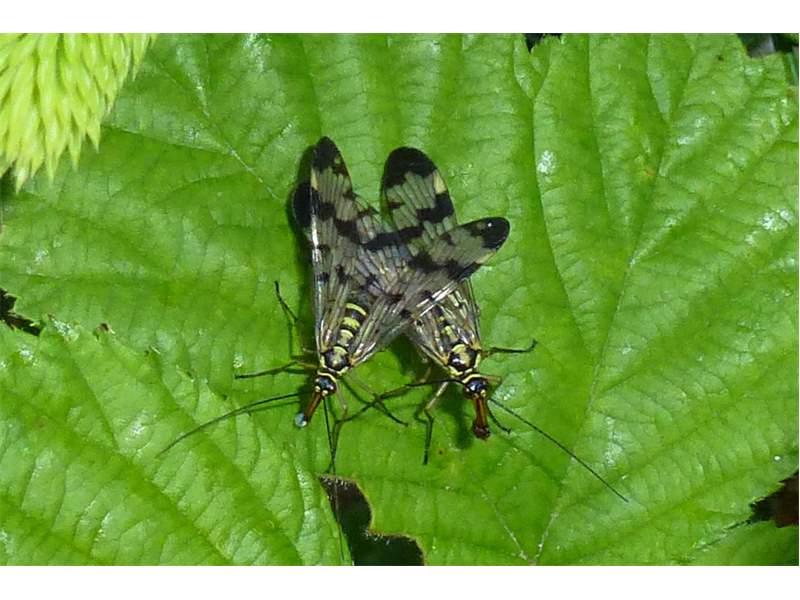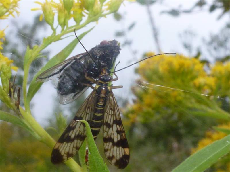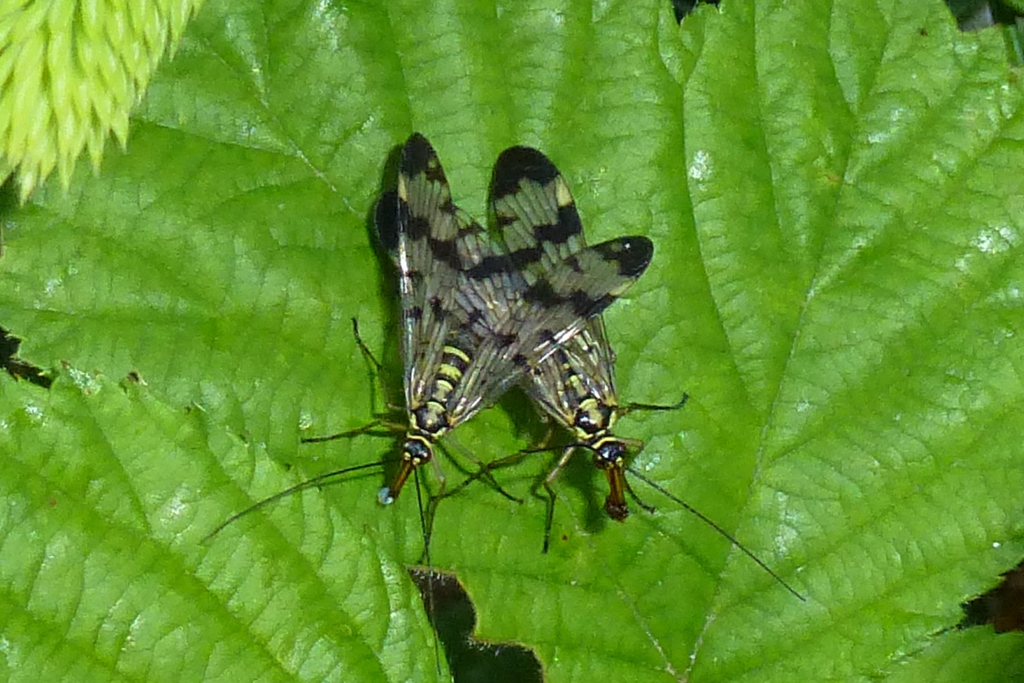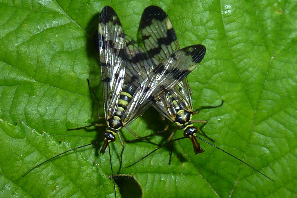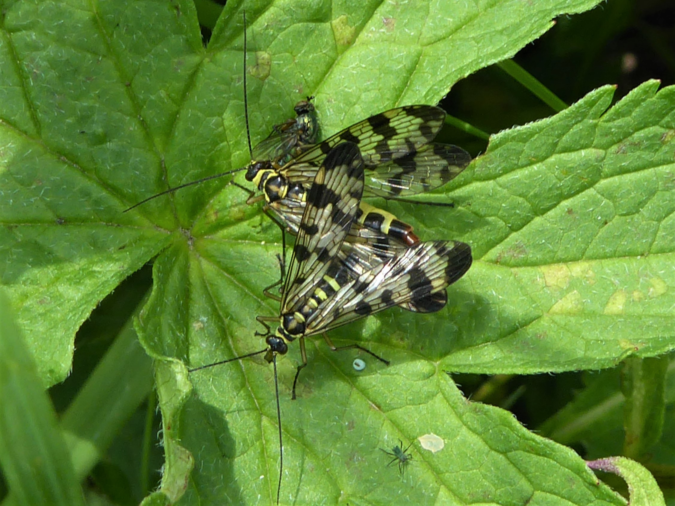 Skorpionsfliegen bei der Kopulation, (09.08.2010 im Tharandter Wald am Triebischsee). Das Männchen hält das Weibchen nicht nur mit dem zangenförmigen Abdominalfortsatz fest, sondern hat seine Flügel noch so über die des Weibchens gelegt, dass ein Fortfliegen unmöglich ist. Die Hochzeit findet an einer toten Raupe (von Gregärparasiten befallen) statt, an denen die Adulten Nahrung aufnehmen