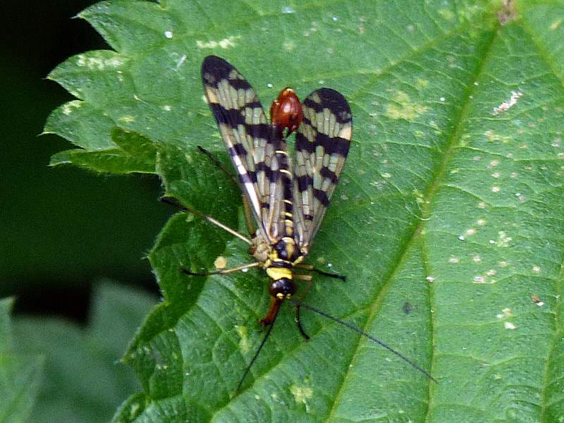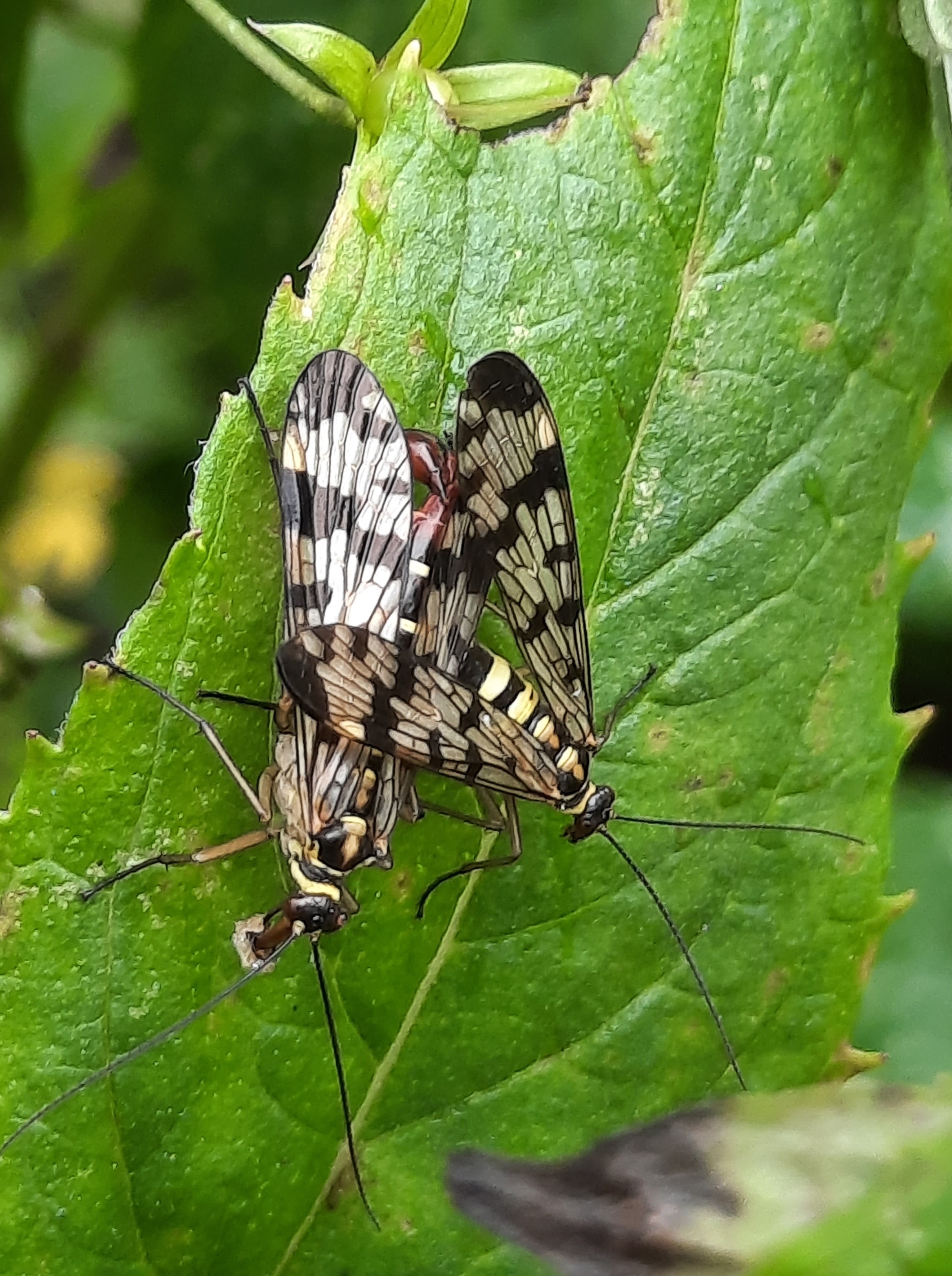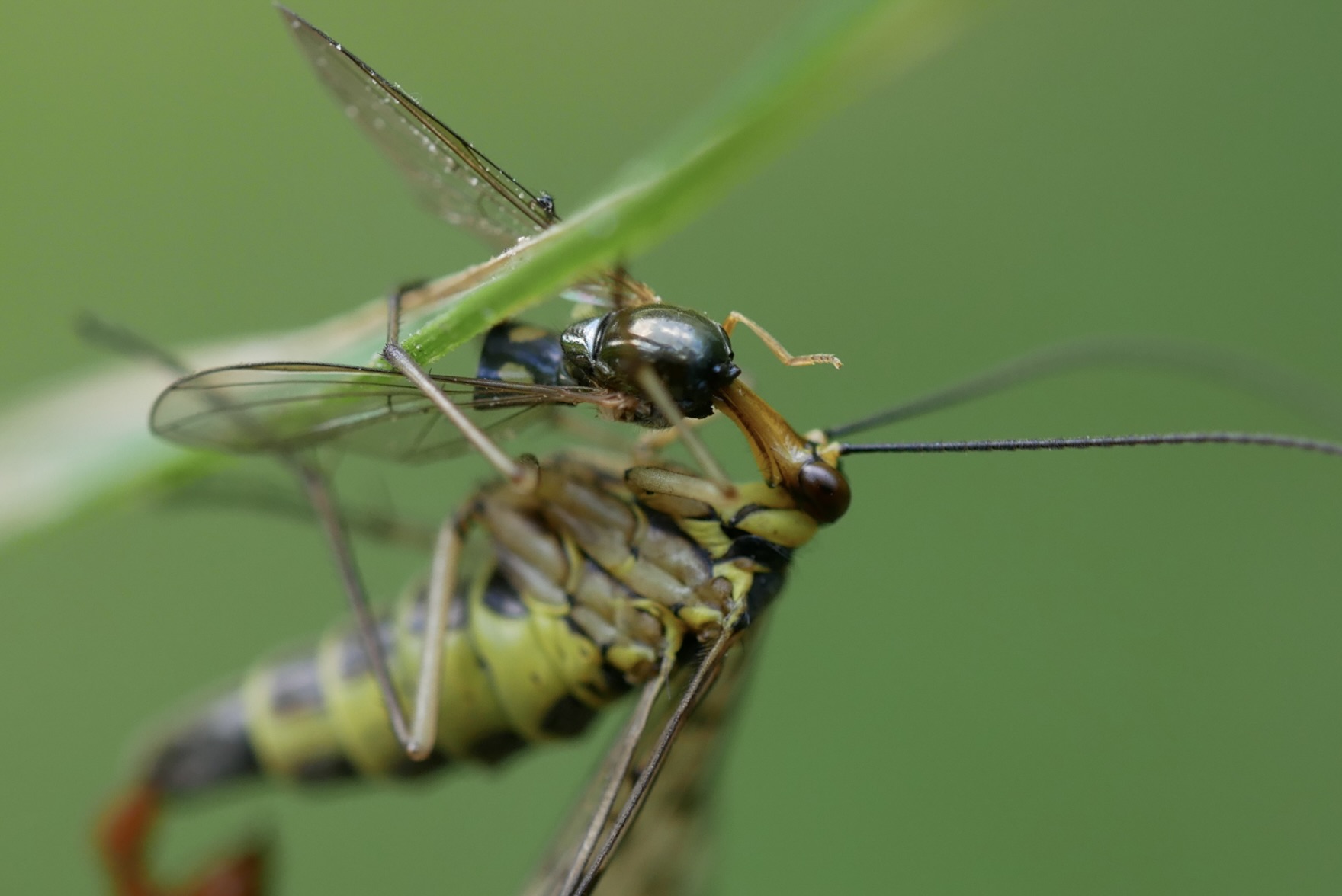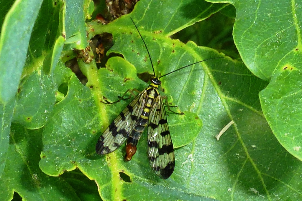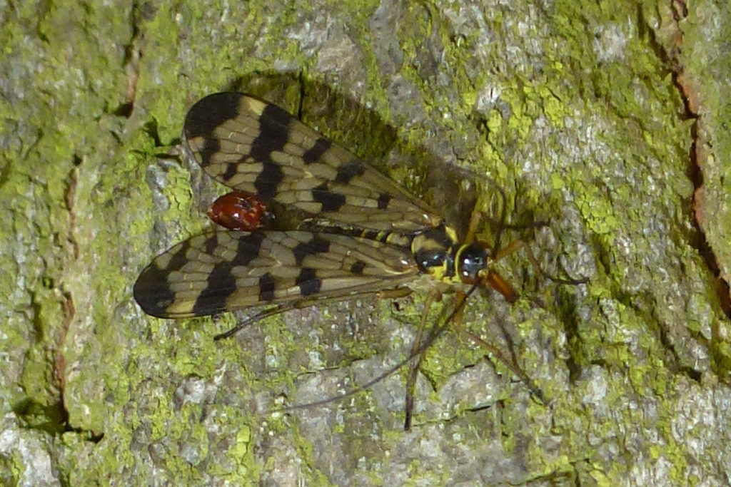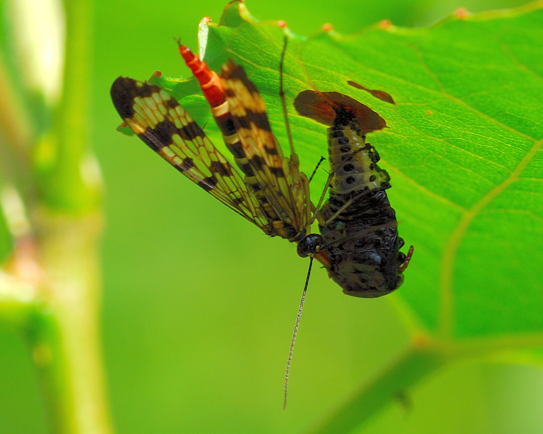 Skorpionsfliegen bei der Kopulation, (09.08.2010 im Tharandter Wald am Triebischsee). Das Männchen hält das Weibchen nicht nur mit dem zangenförmigen Abdominalfortsatz fest, sondern hat seine Flügel noch so über die des Weibchens gelegt, dass ein Fortfliegen unmöglich ist. Die Hochzeit findet an einer toten Raupe (von Gregärparasiten befallen) statt, an denen die Adulten Nahrung aufnehmen