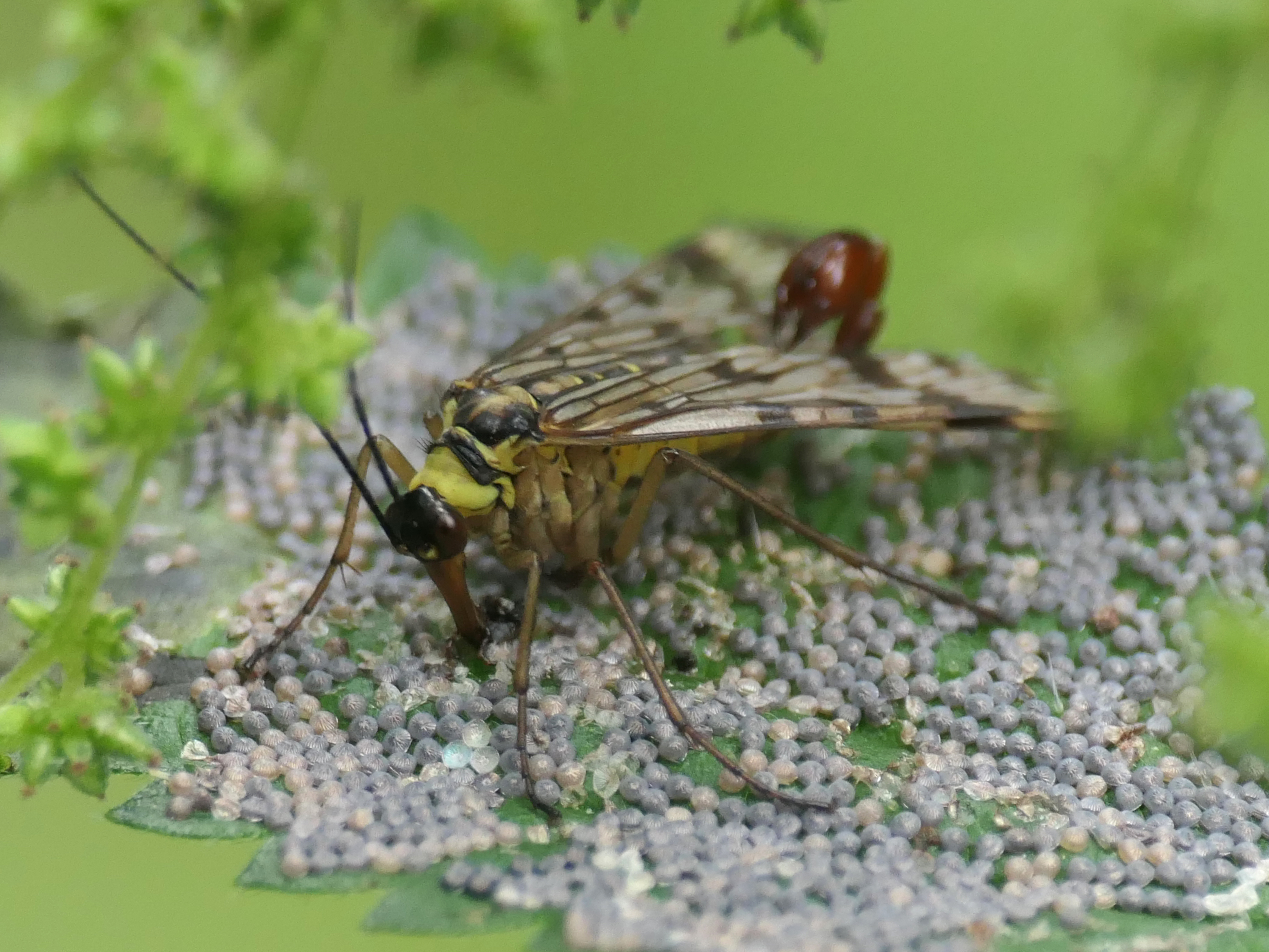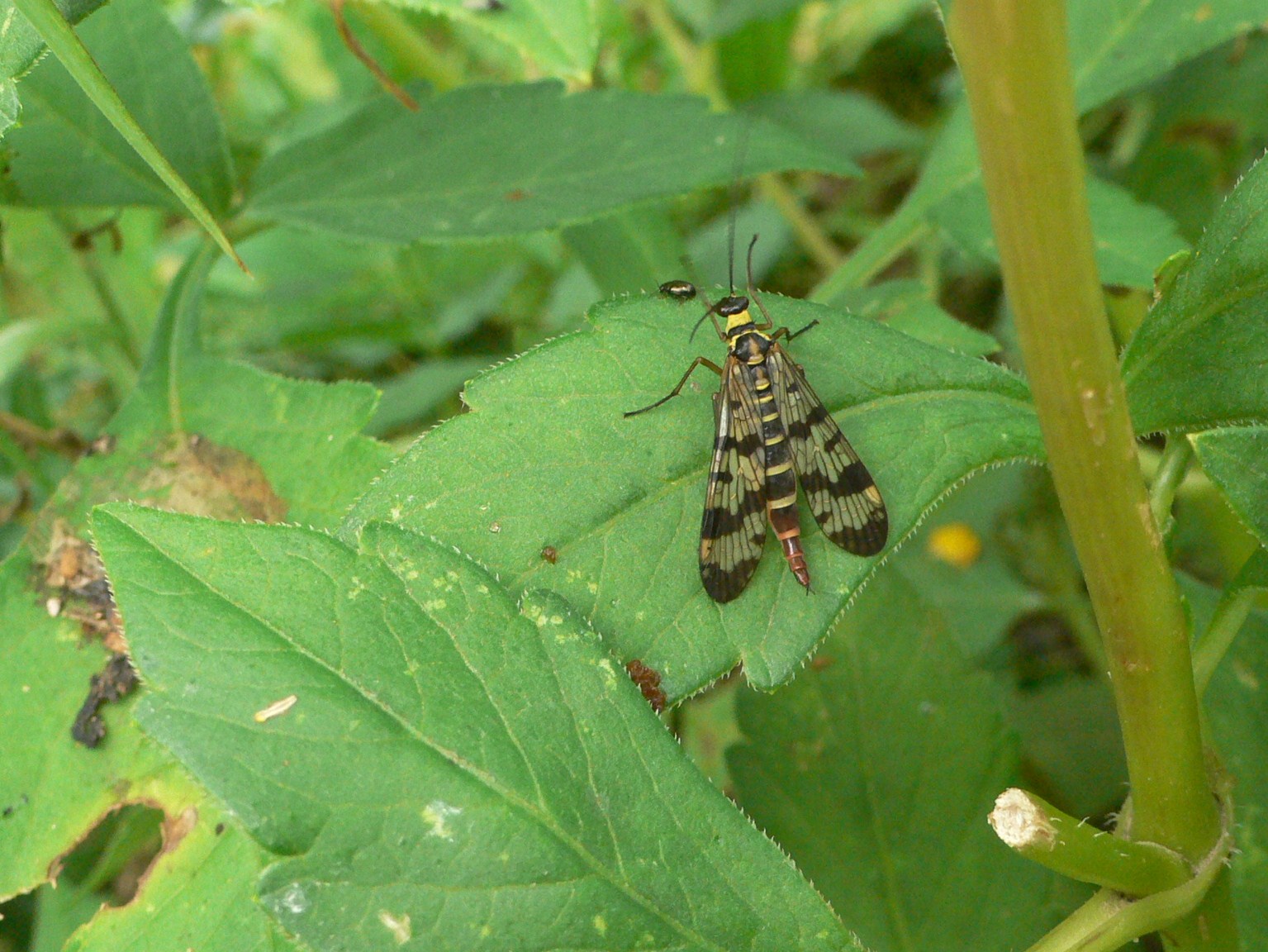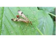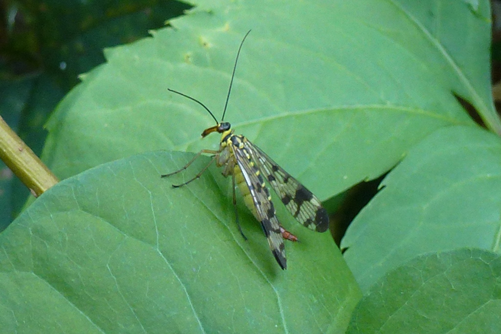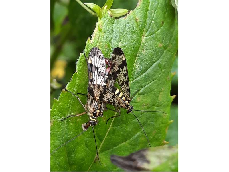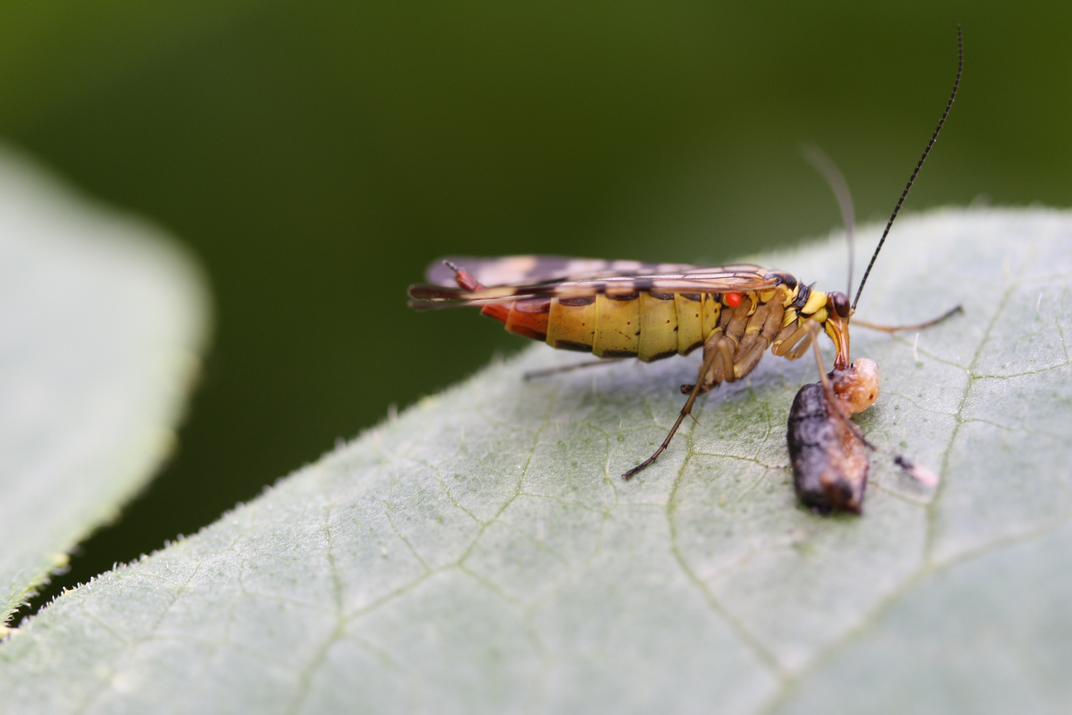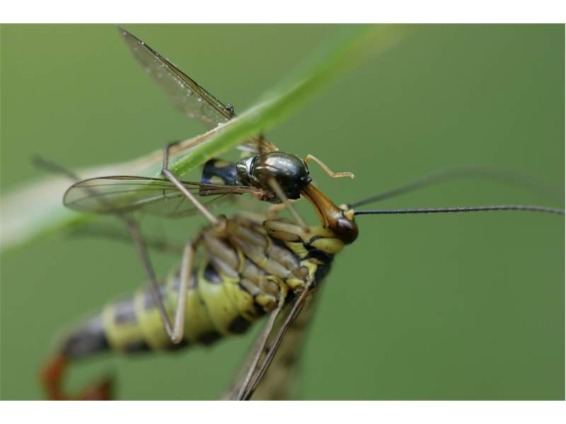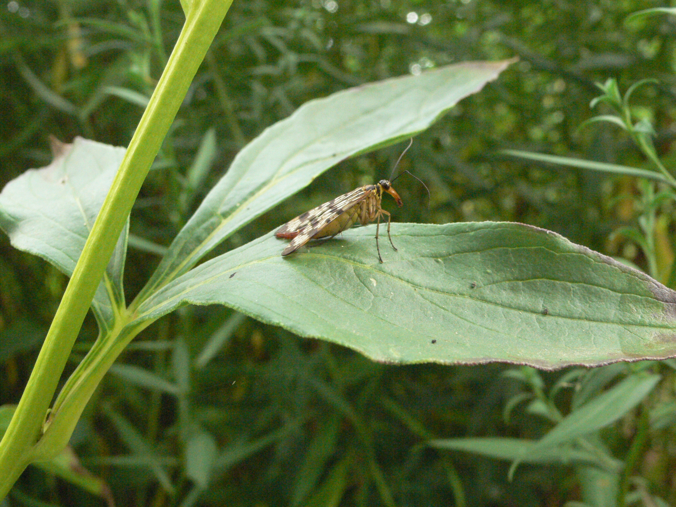 Skorpionsfliegen bei der Kopulation, (09.08.2010 im Tharandter Wald am Triebischsee). Das Männchen hält das Weibchen nicht nur mit dem zangenförmigen Abdominalfortsatz fest, sondern hat seine Flügel noch so über die des Weibchens gelegt, dass ein Fortfliegen unmöglich ist. Die Hochzeit findet an einer toten Raupe (von Gregärparasiten befallen) statt, an denen die Adulten Nahrung aufnehmen