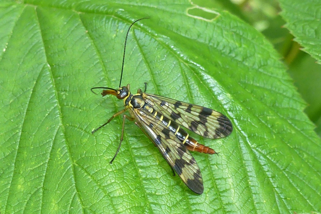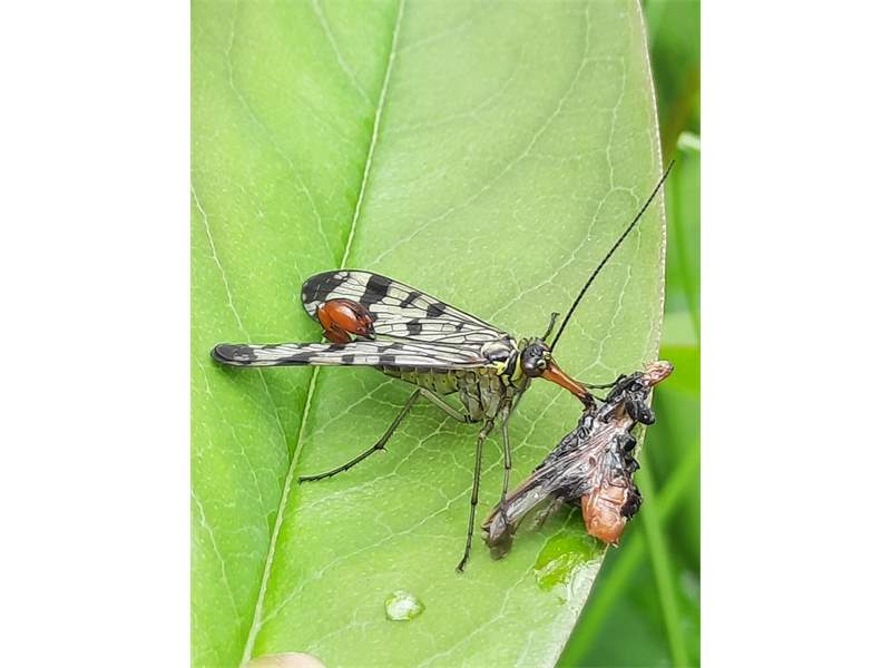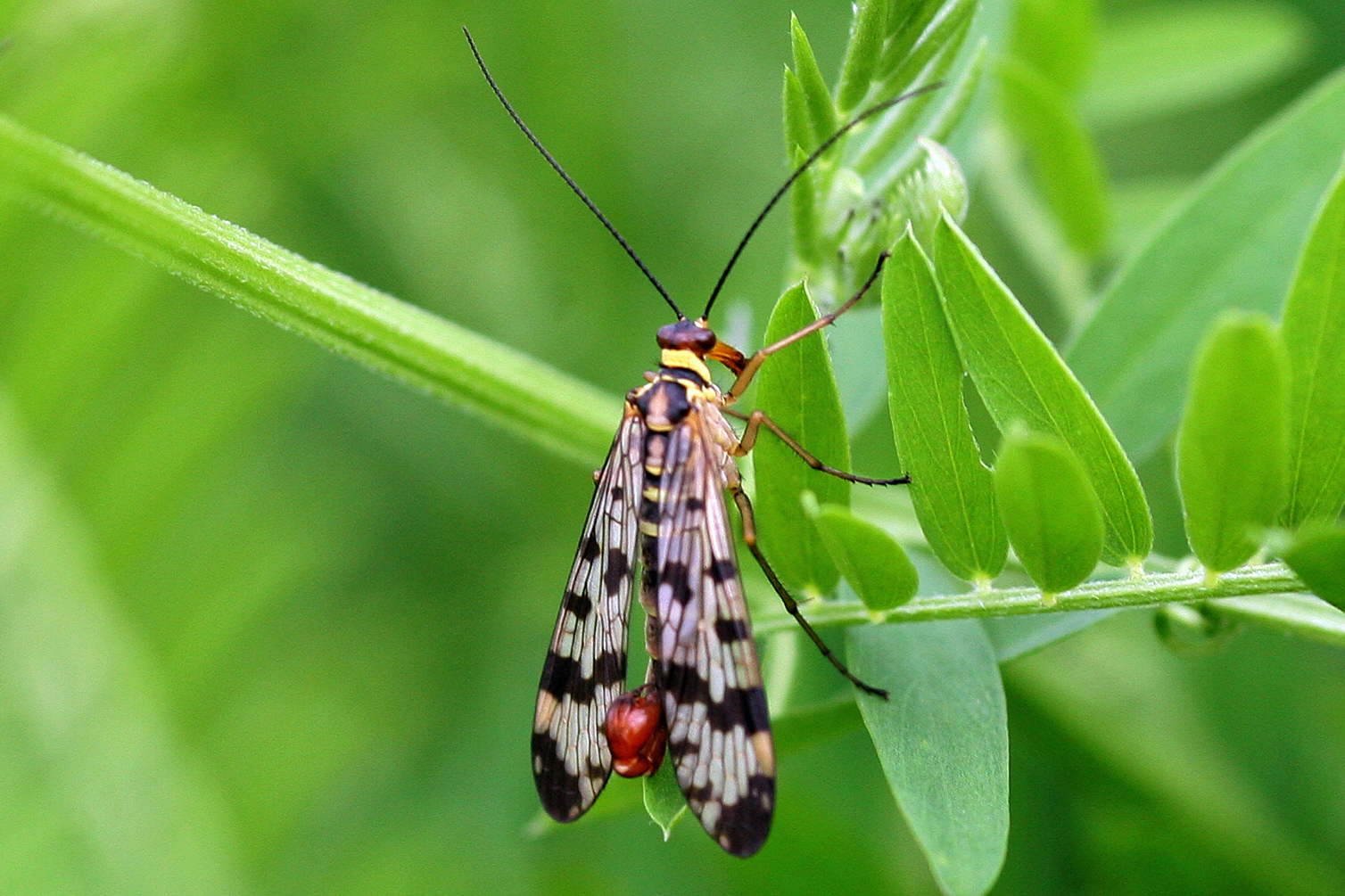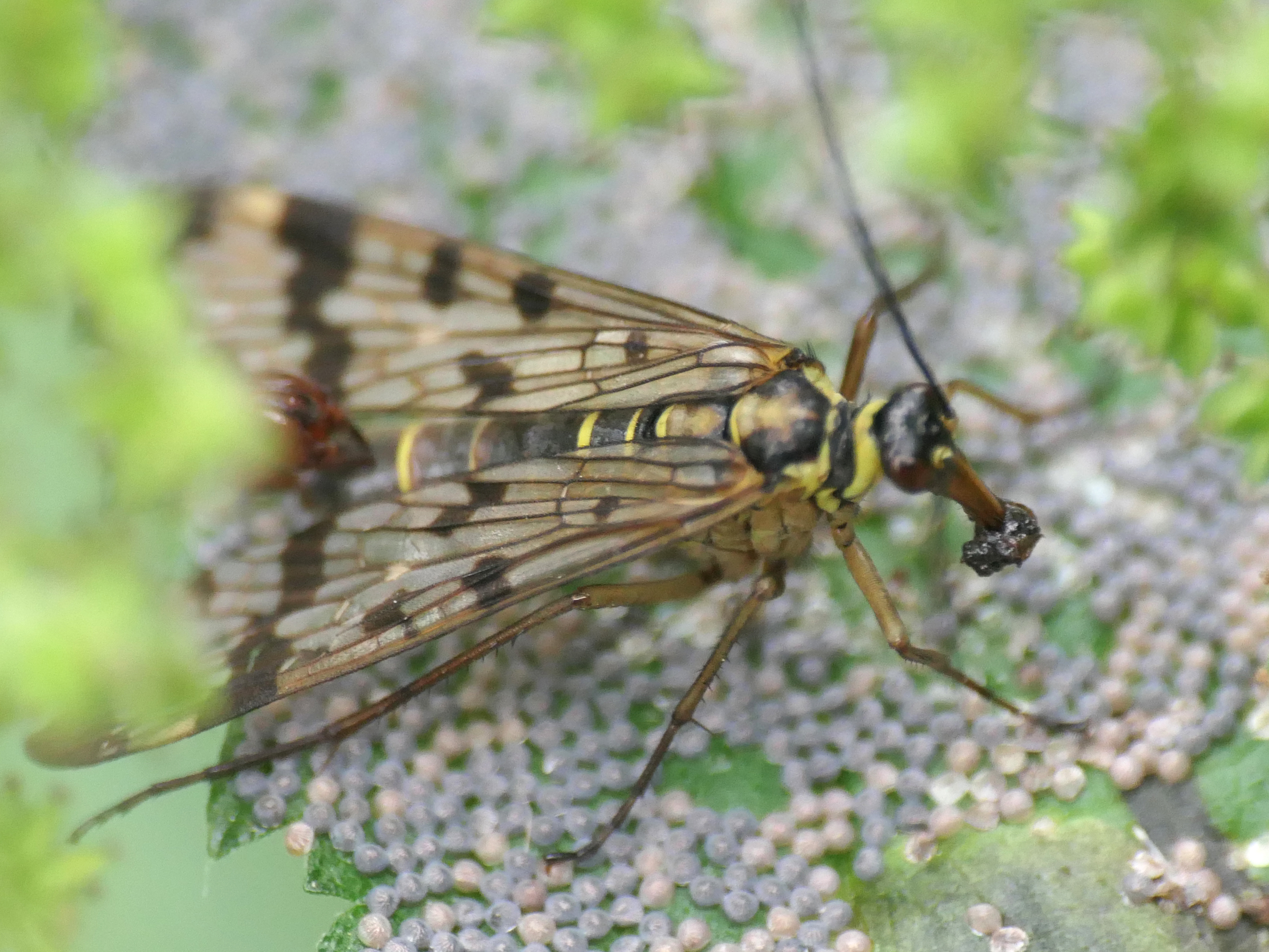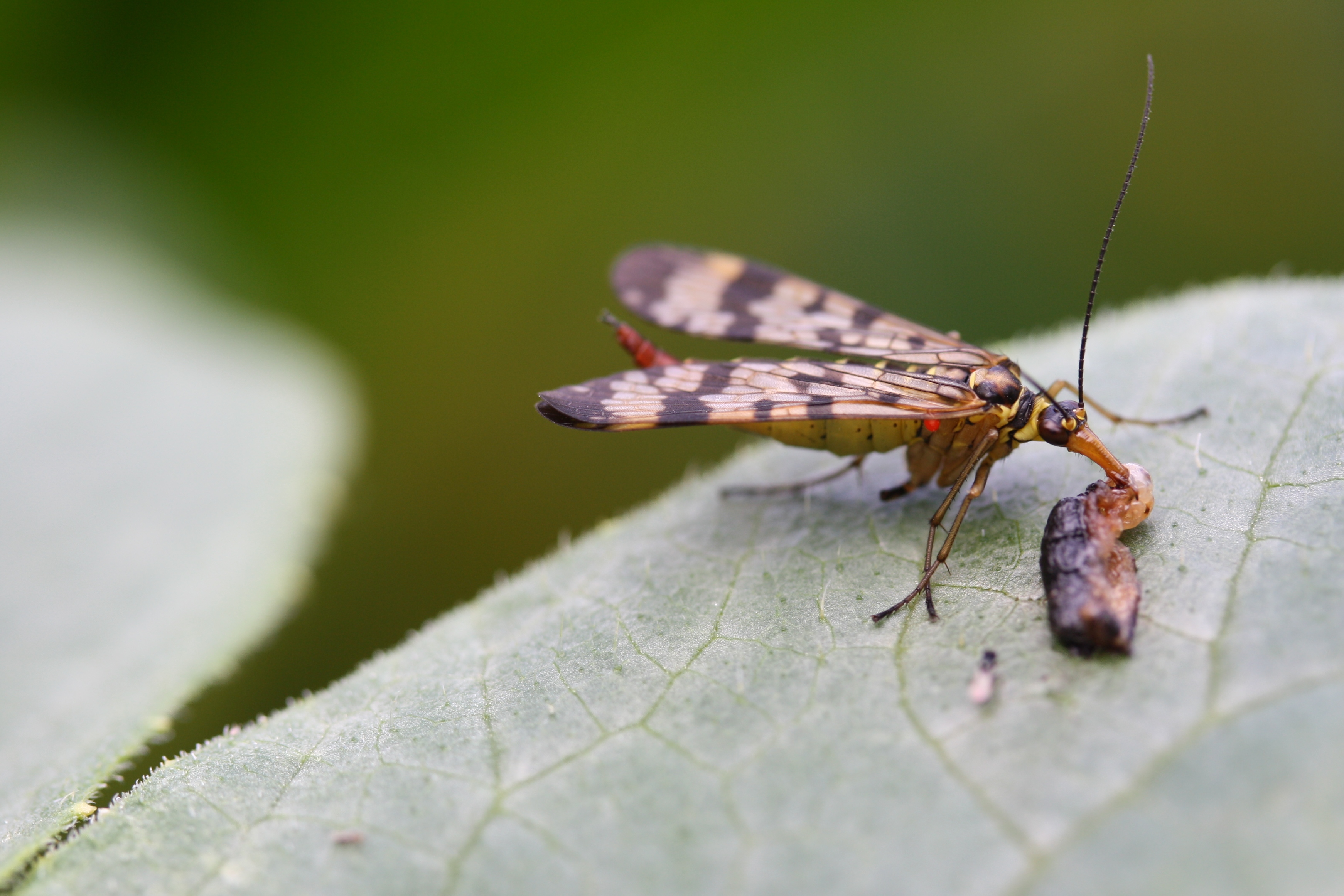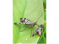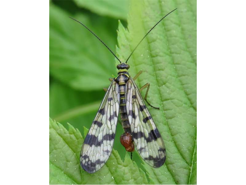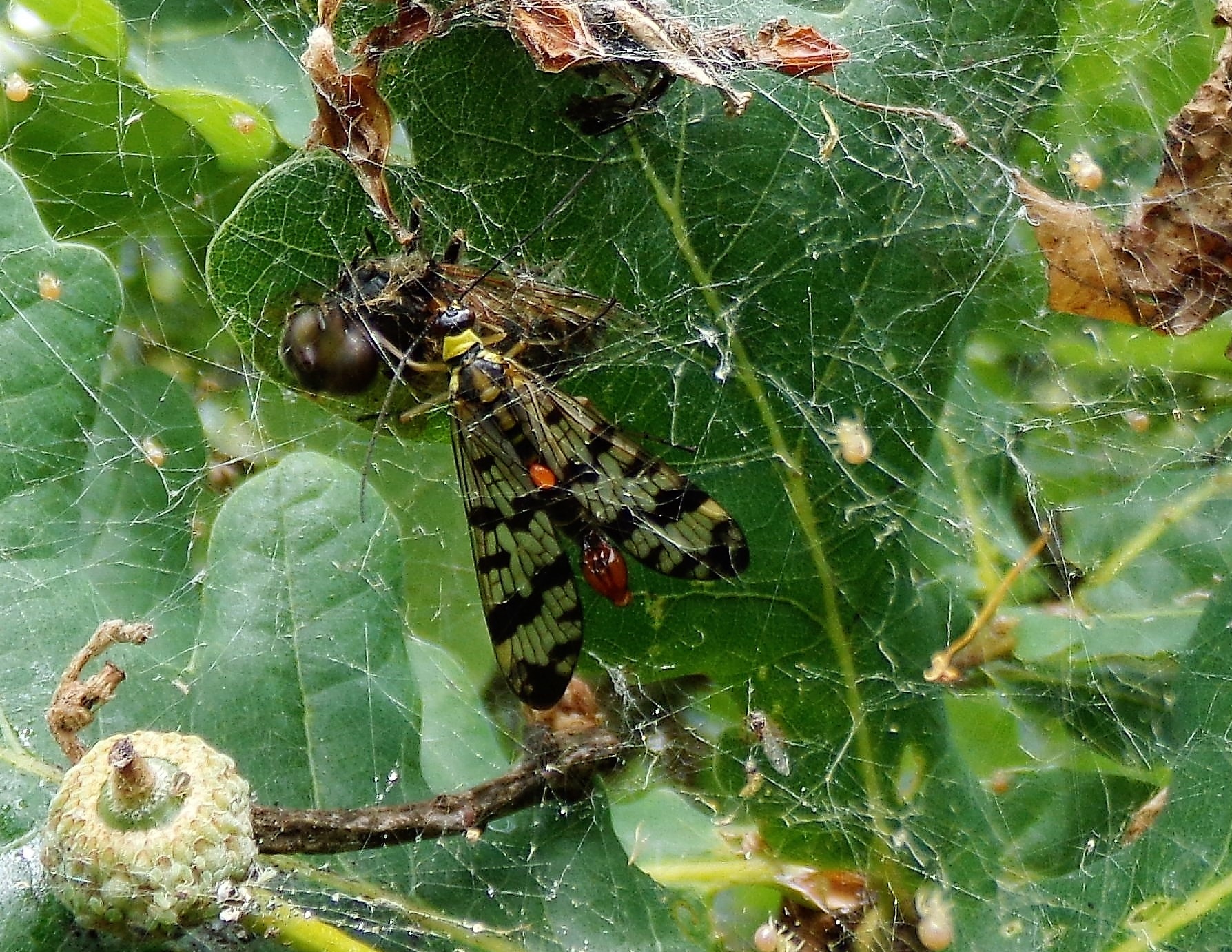 Skorpionsfliegen bei der Kopulation, (09.08.2010 im Tharandter Wald am Triebischsee). Das Männchen hält das Weibchen nicht nur mit dem zangenförmigen Abdominalfortsatz fest, sondern hat seine Flügel noch so über die des Weibchens gelegt, dass ein Fortfliegen unmöglich ist. Die Hochzeit findet an einer toten Raupe (von Gregärparasiten befallen) statt, an denen die Adulten Nahrung aufnehmen