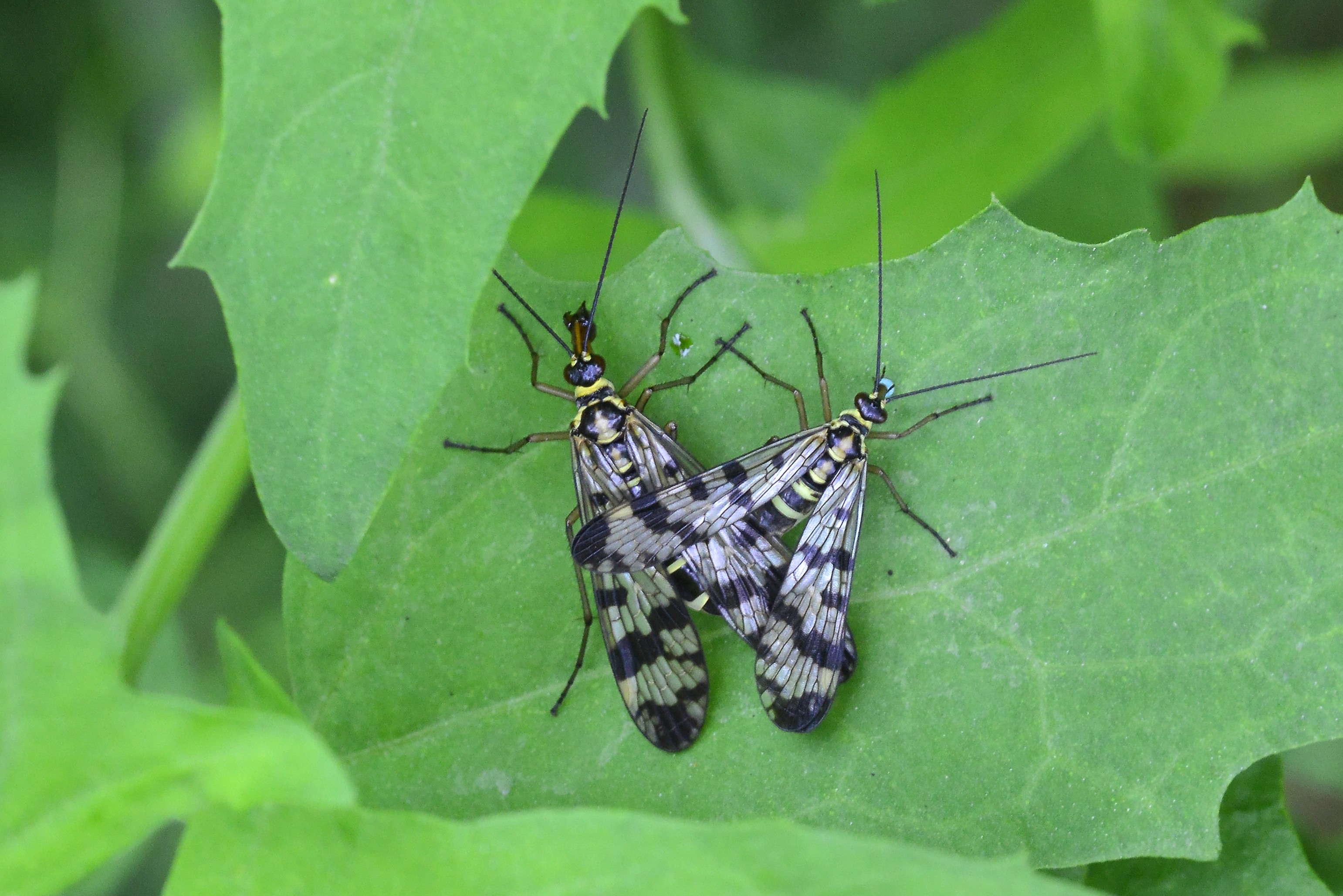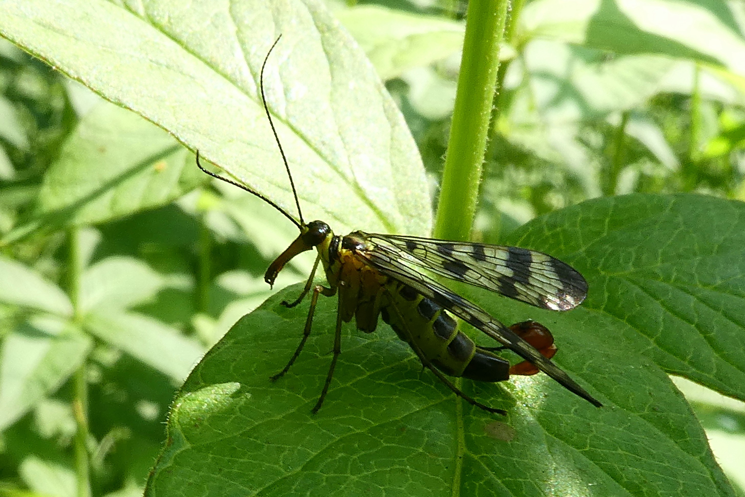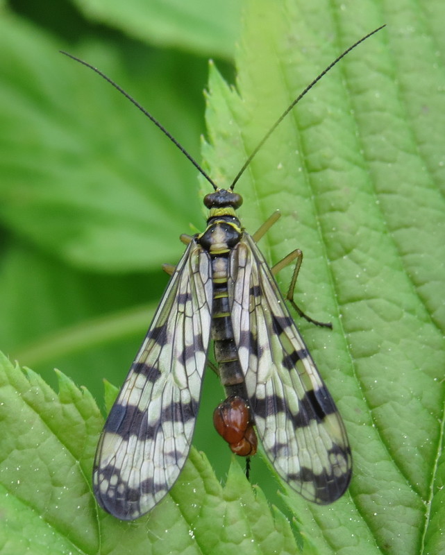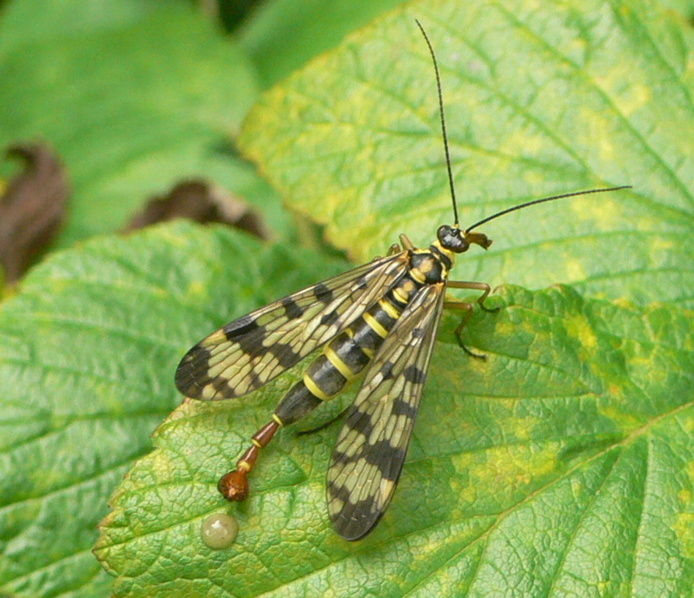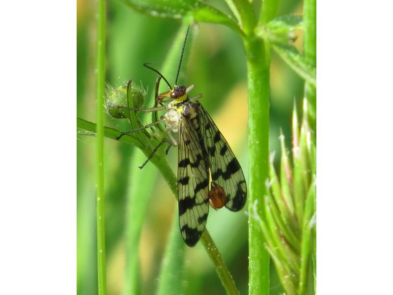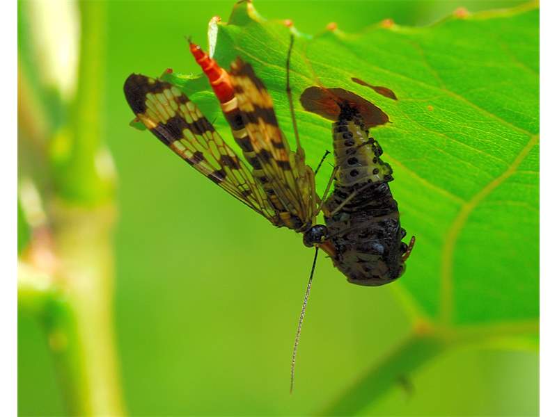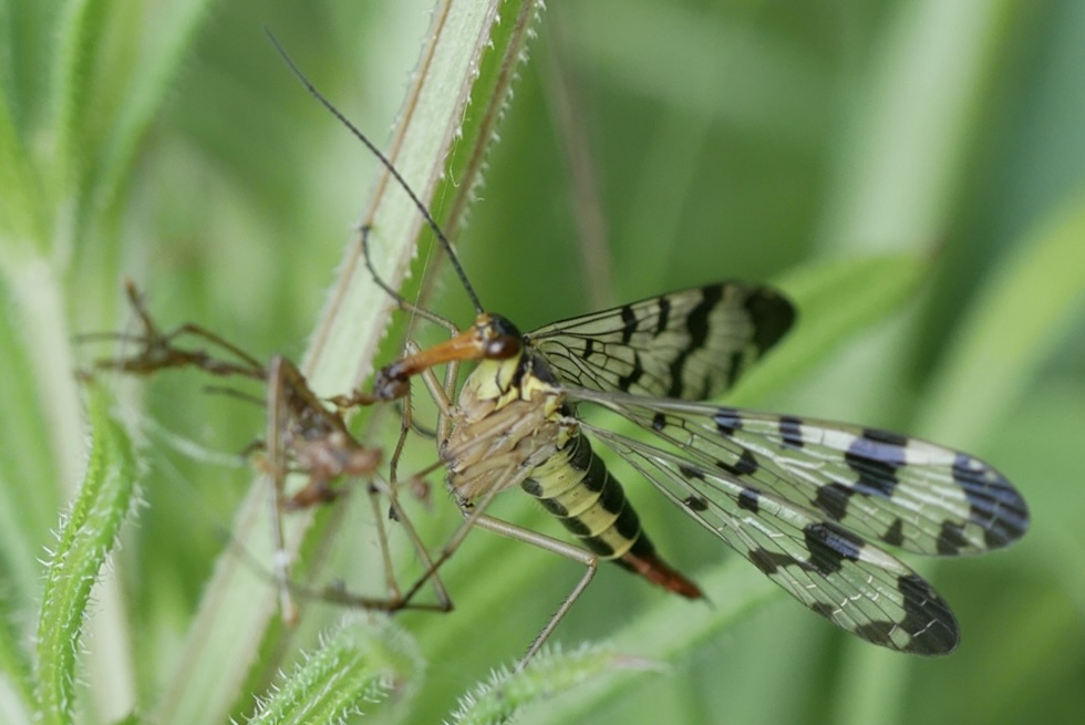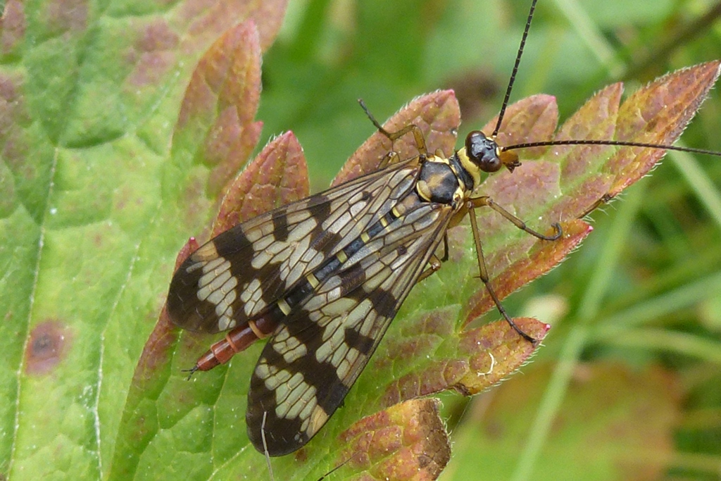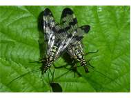 Skorpionsfliegen bei der Kopulation, (09.08.2010 im Tharandter Wald am Triebischsee). Das Männchen hält das Weibchen nicht nur mit dem zangenförmigen Abdominalfortsatz fest, sondern hat seine Flügel noch so über die des Weibchens gelegt, dass ein Fortfliegen unmöglich ist. Die Hochzeit findet an einer toten Raupe (von Gregärparasiten befallen) statt, an denen die Adulten Nahrung aufnehmen