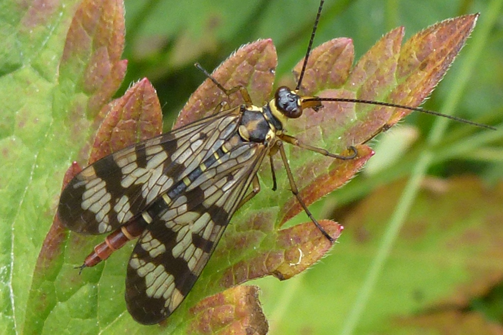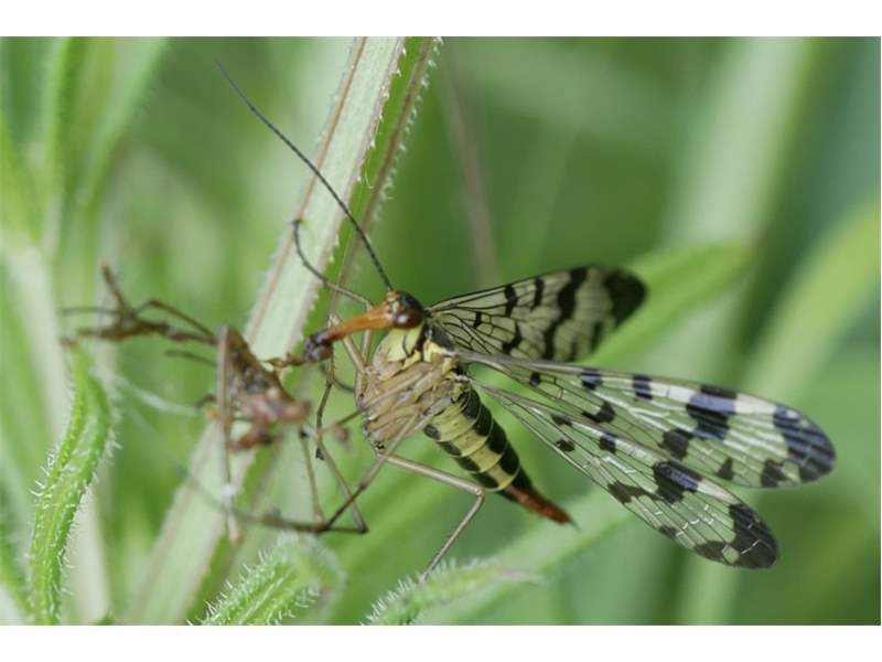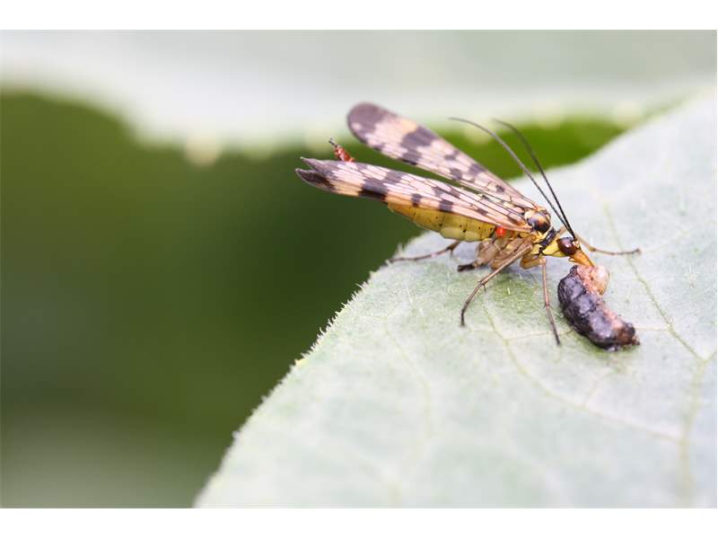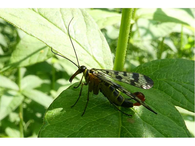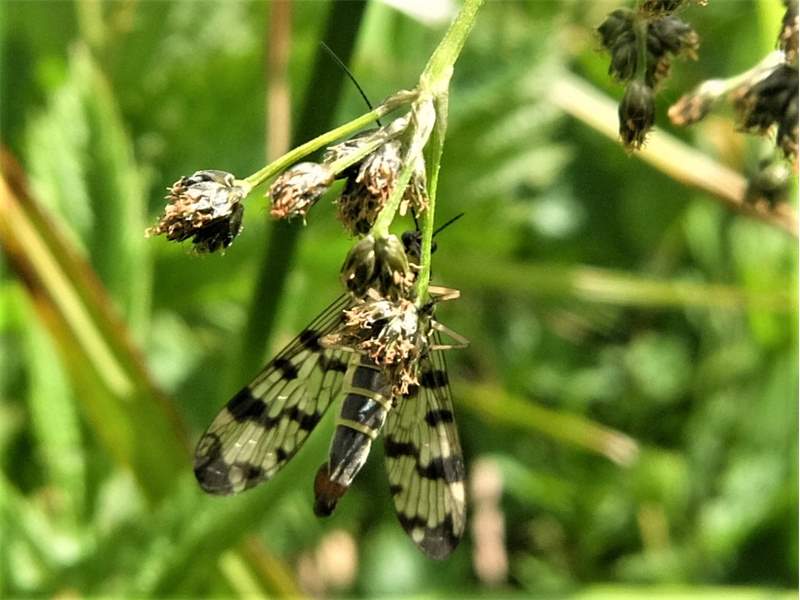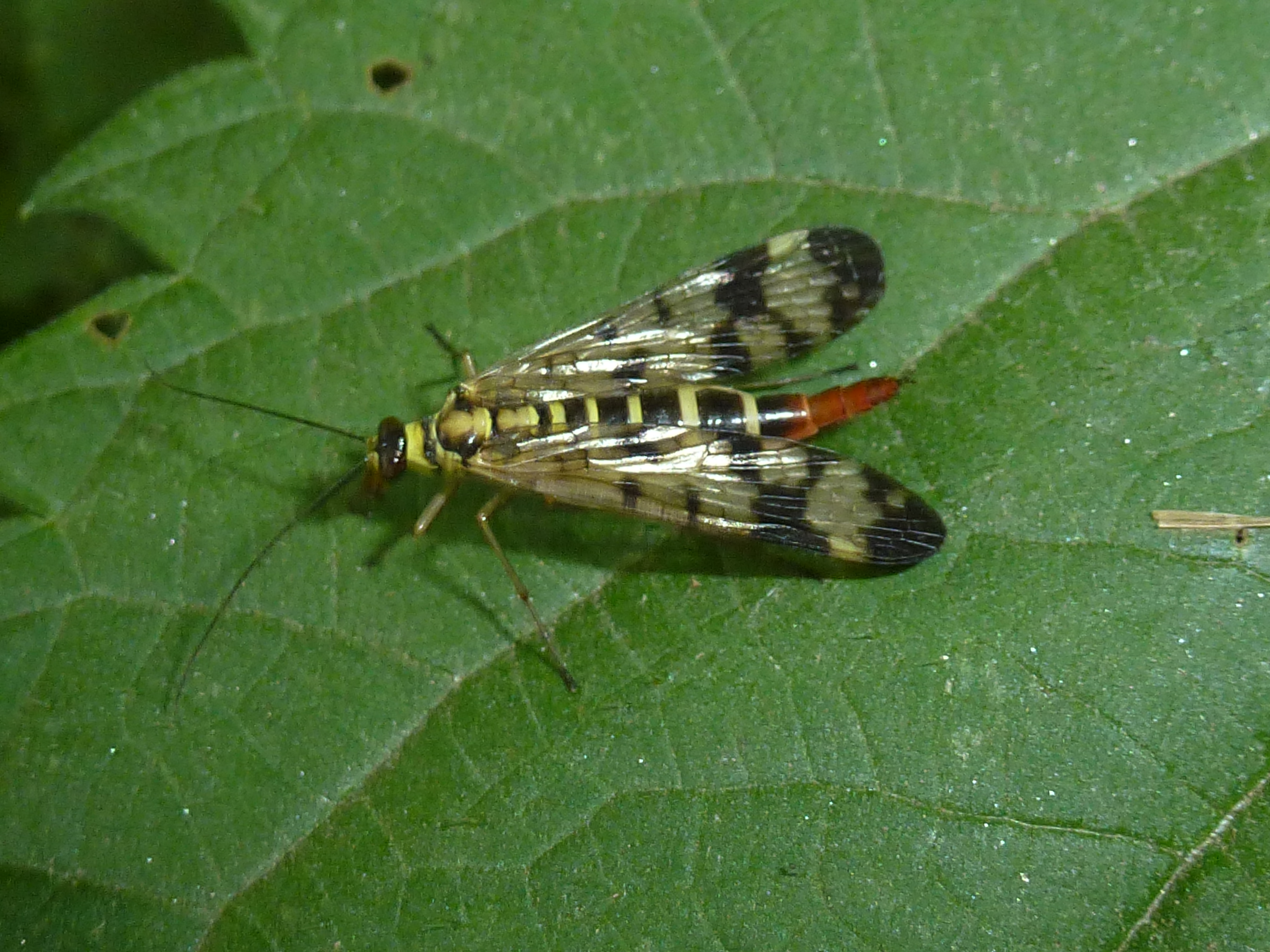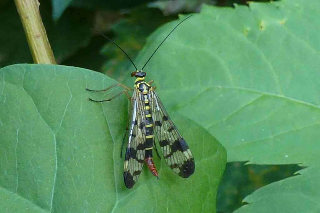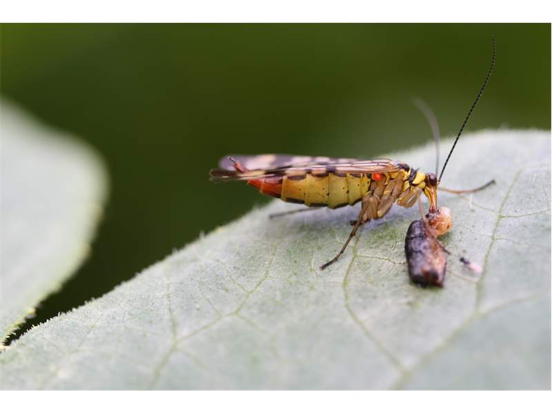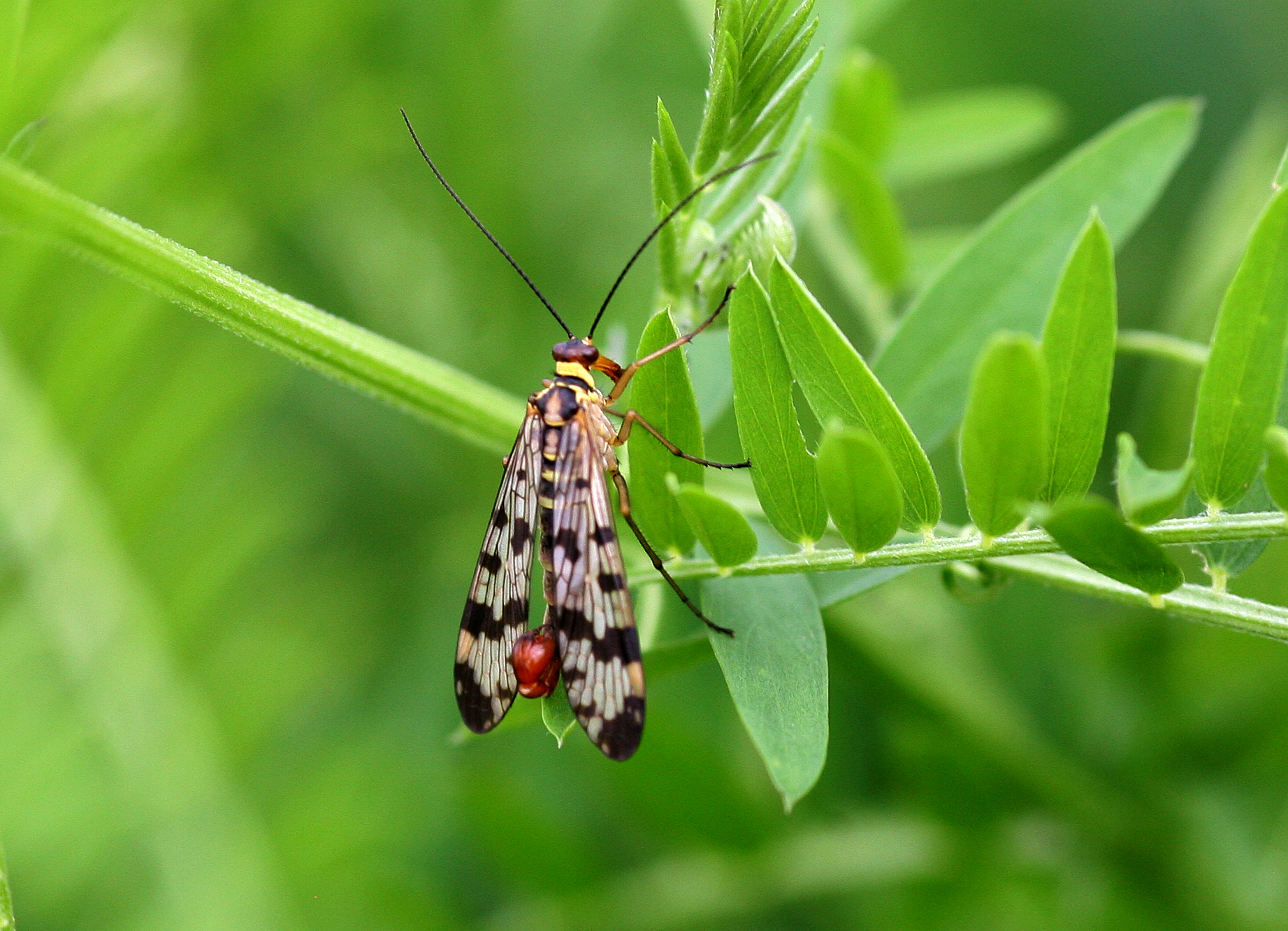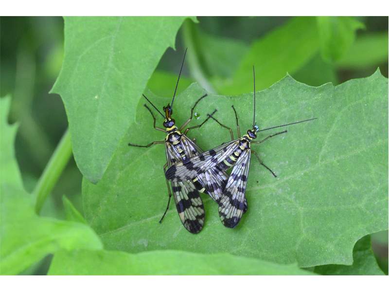 Skorpionsfliegen bei der Kopulation, (09.08.2010 im Tharandter Wald am Triebischsee). Das Männchen hält das Weibchen nicht nur mit dem zangenförmigen Abdominalfortsatz fest, sondern hat seine Flügel noch so über die des Weibchens gelegt, dass ein Fortfliegen unmöglich ist. Die Hochzeit findet an einer toten Raupe (von Gregärparasiten befallen) statt, an denen die Adulten Nahrung aufnehmen