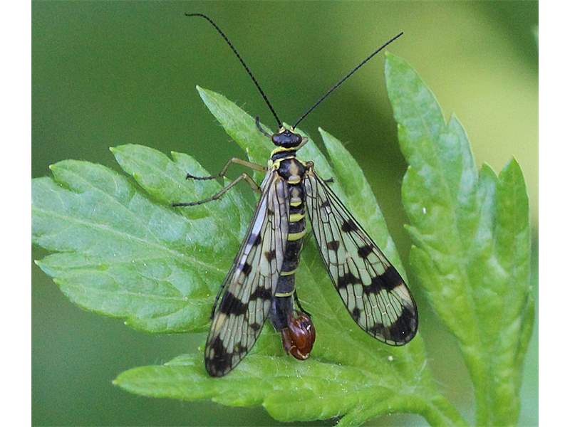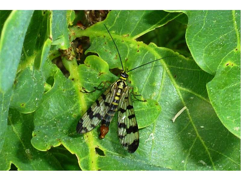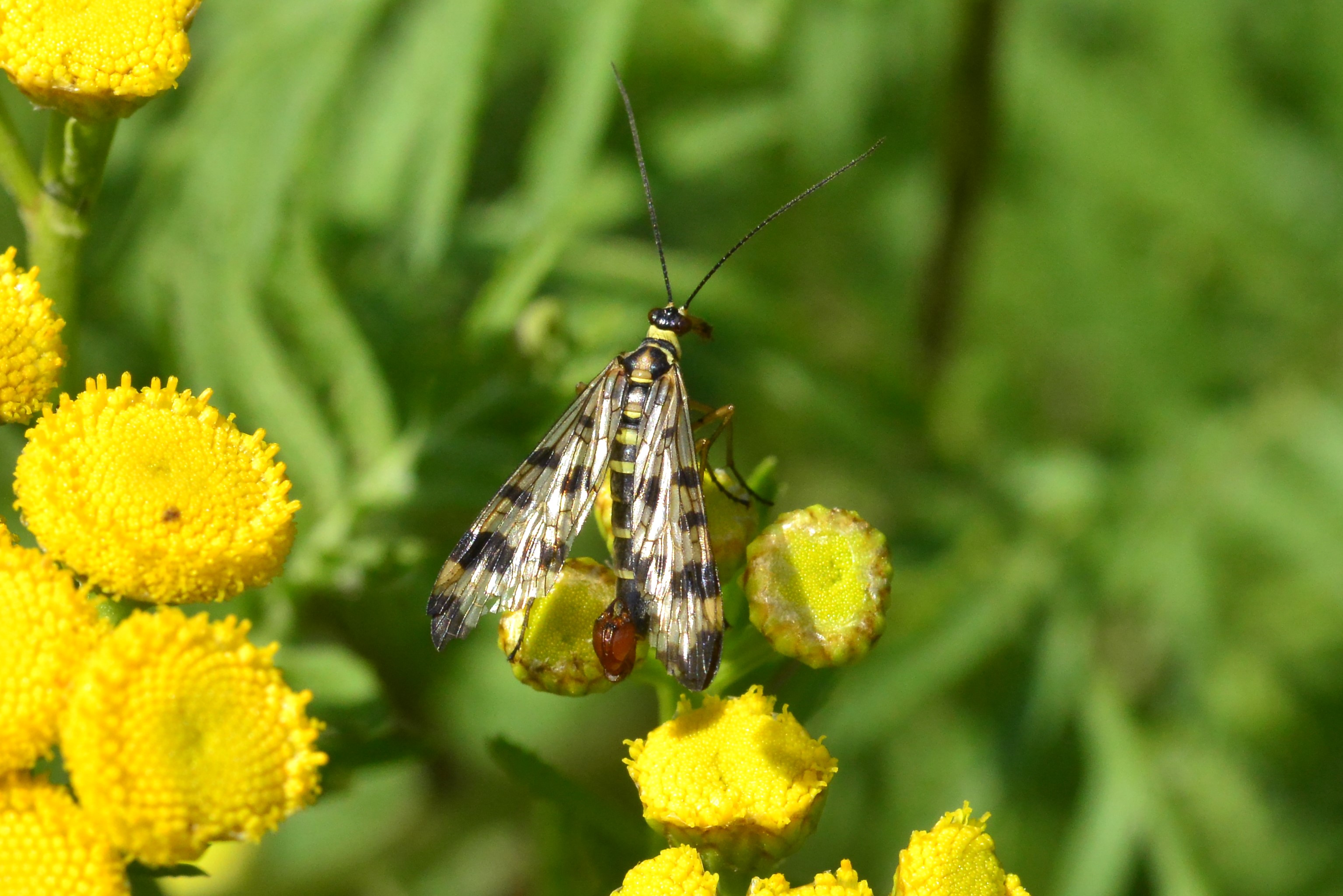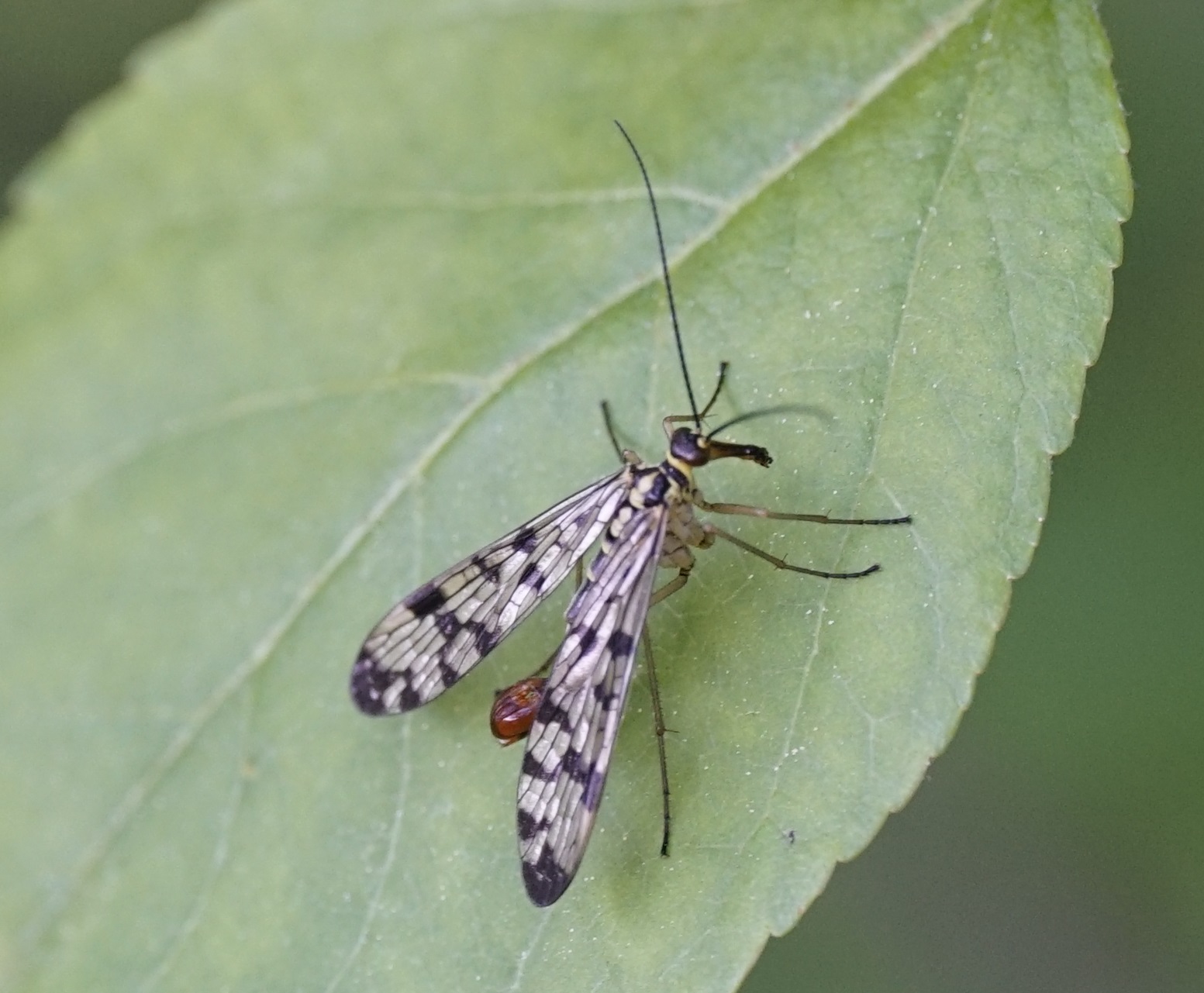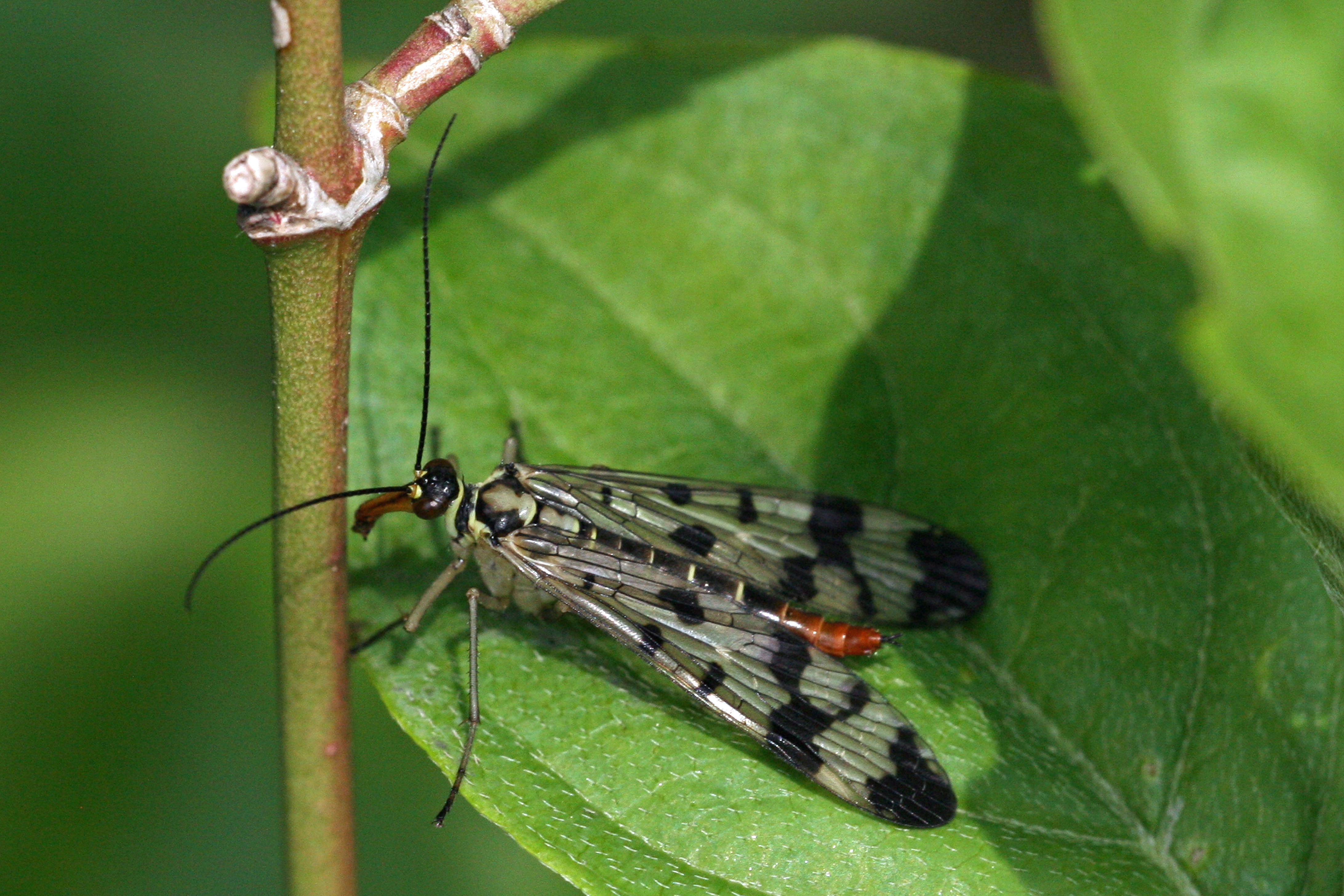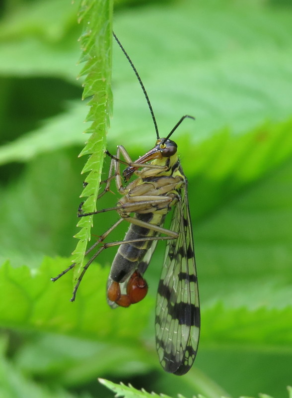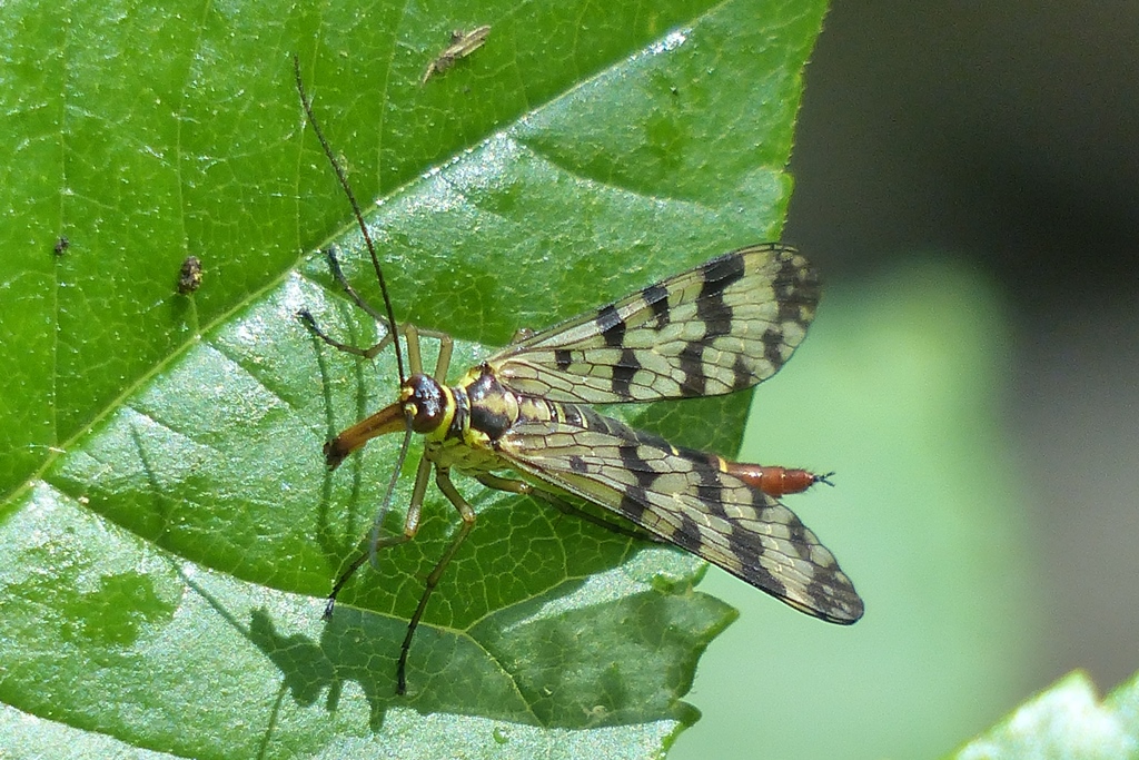Skorpionsfliegen bei der Kopulation, (09.08.2010 im Tharandter Wald am Triebischsee). Das Männchen hält das Weibchen nicht nur mit dem zangenförmigen Abdominalfortsatz fest, sondern hat seine Flügel noch so über die des Weibchens gelegt, dass ein Fortfliegen unmöglich ist. Die Hochzeit findet an einer toten Raupe (von Gregärparasiten befallen) statt, an denen die Adulten Nahrung aufnehmen