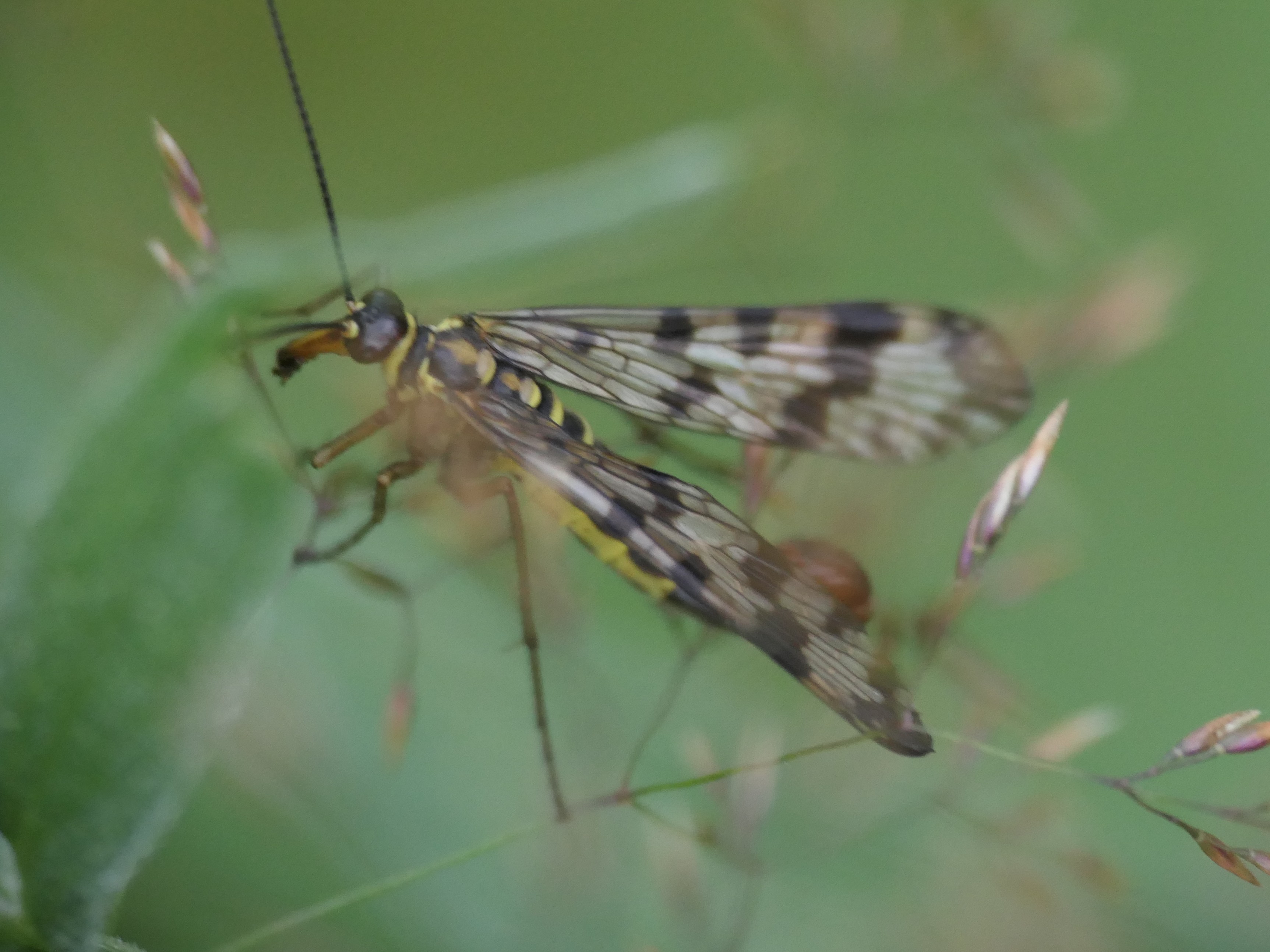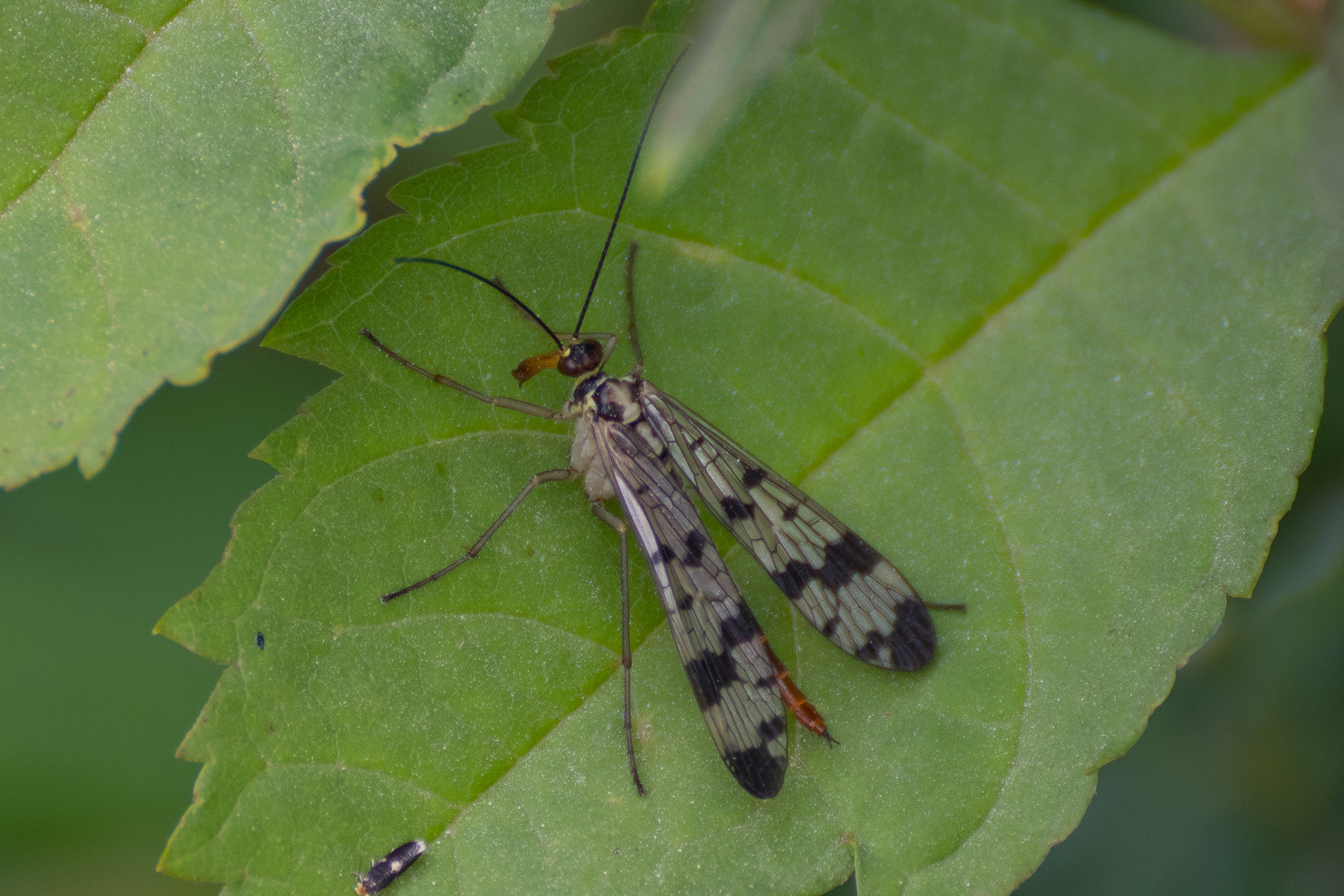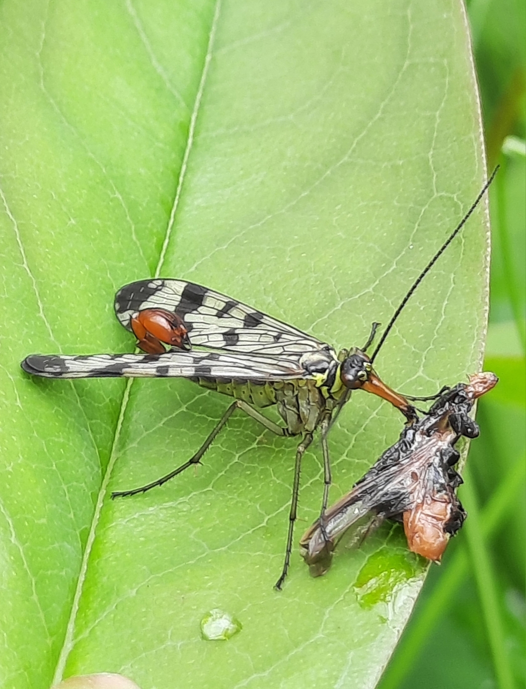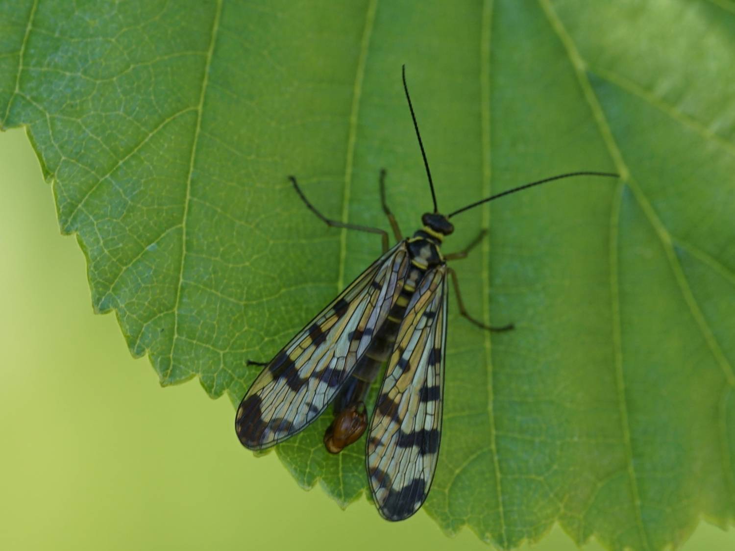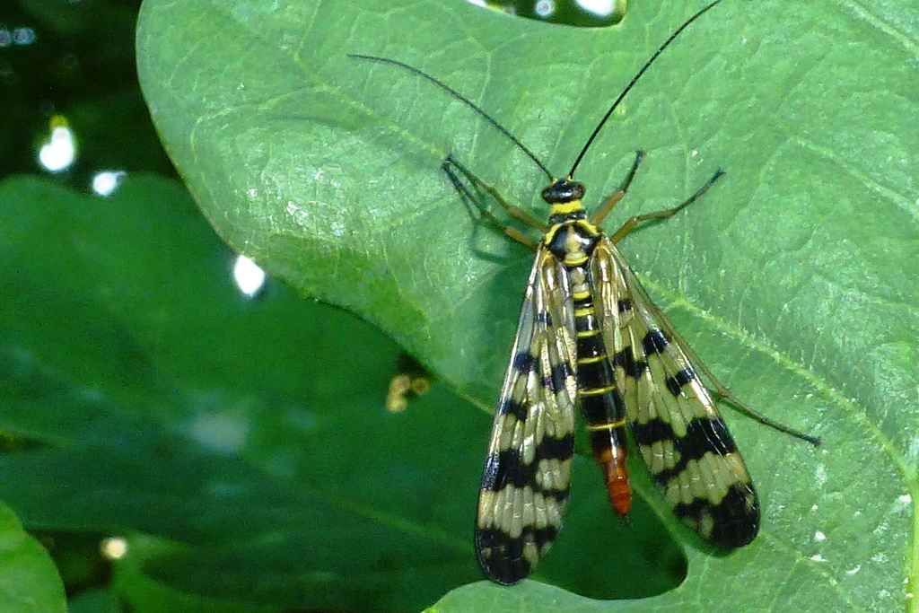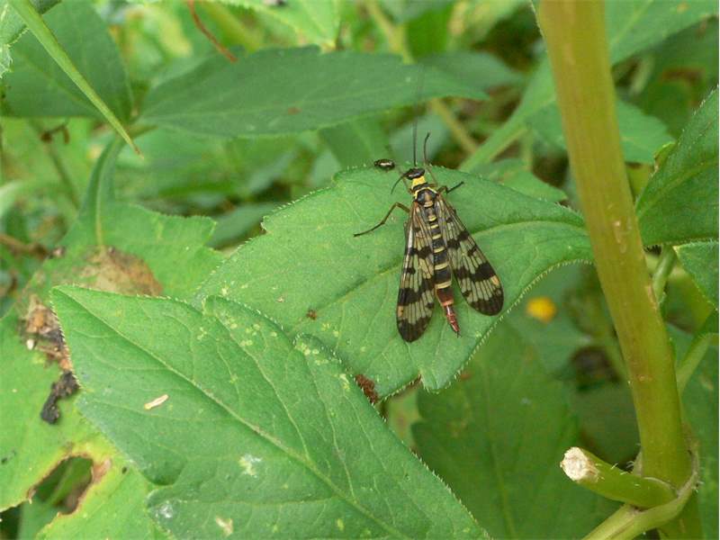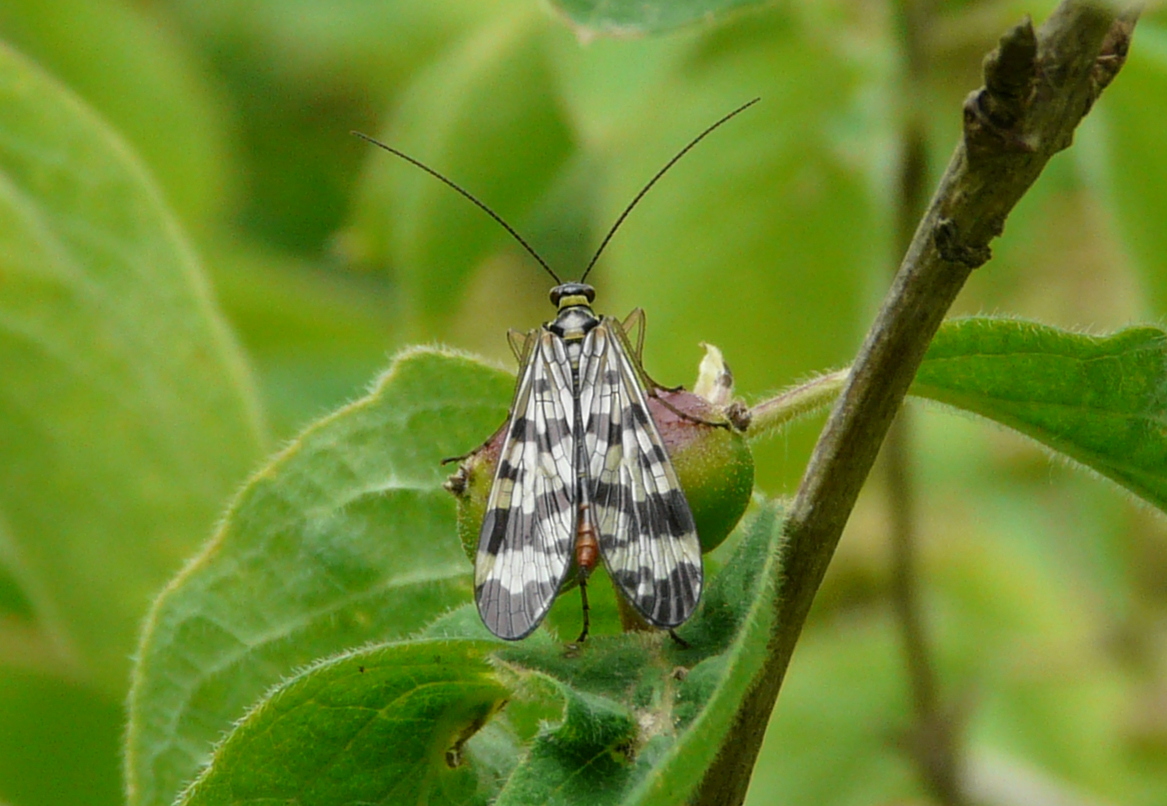 Skorpionsfliegen bei der Kopulation, (09.08.2010 im Tharandter Wald am Triebischsee). Das Männchen hält das Weibchen nicht nur mit dem zangenförmigen Abdominalfortsatz fest, sondern hat seine Flügel noch so über die des Weibchens gelegt, dass ein Fortfliegen unmöglich ist. Die Hochzeit findet an einer toten Raupe (von Gregärparasiten befallen) statt, an denen die Adulten Nahrung aufnehmen
