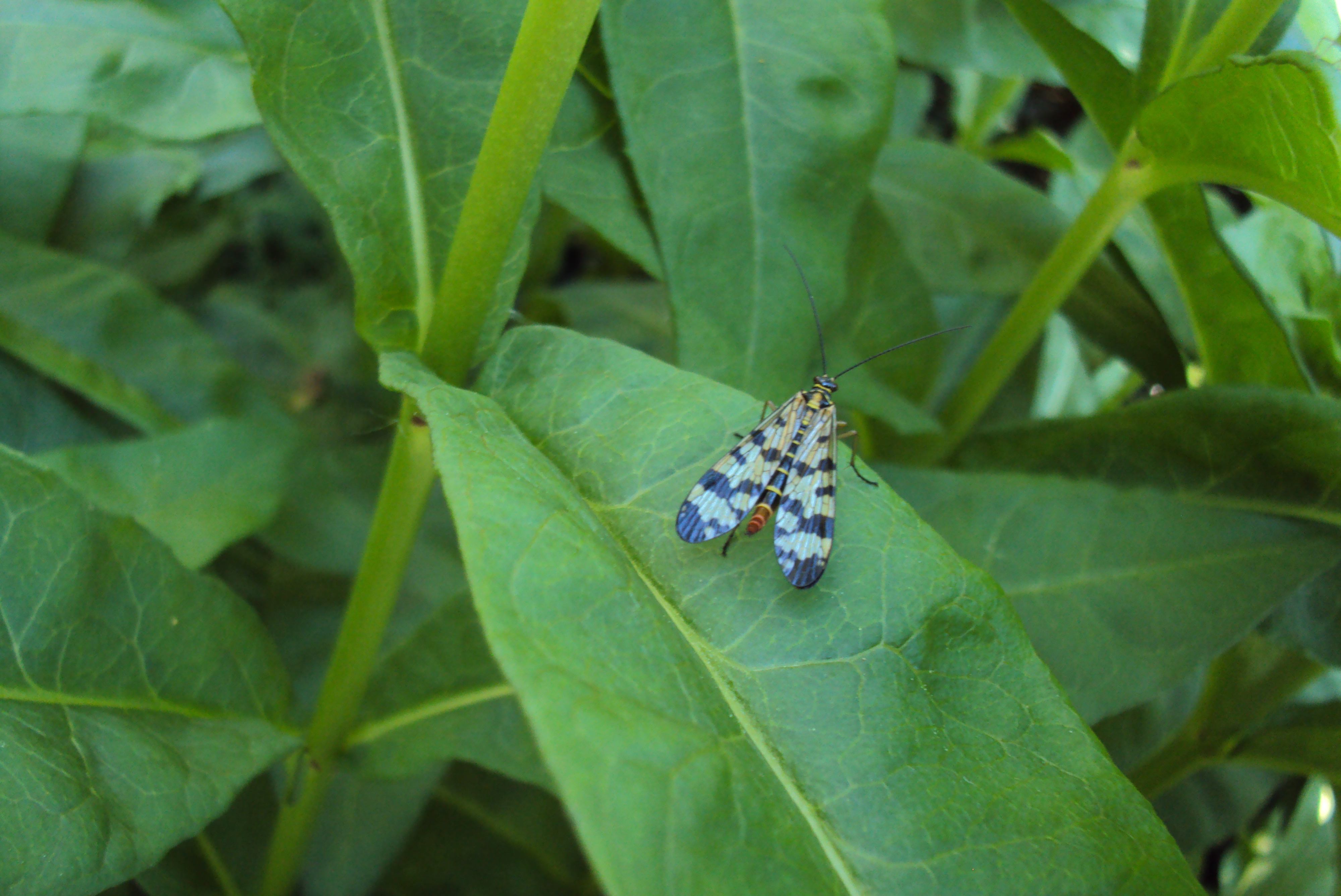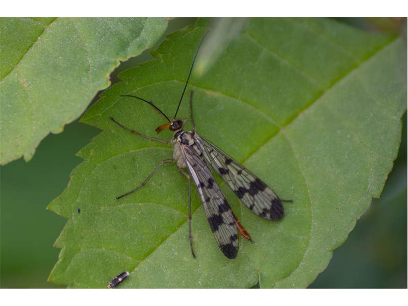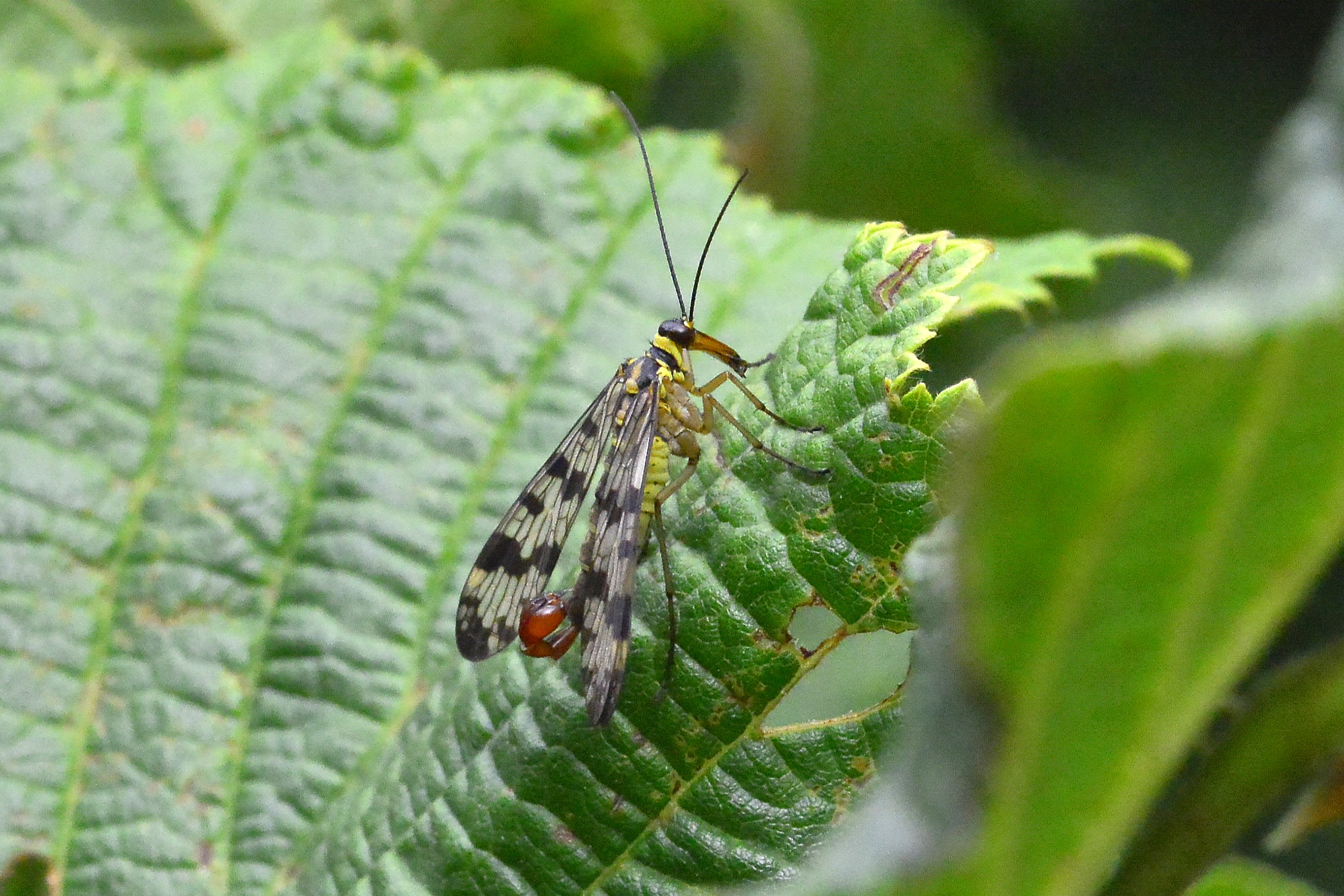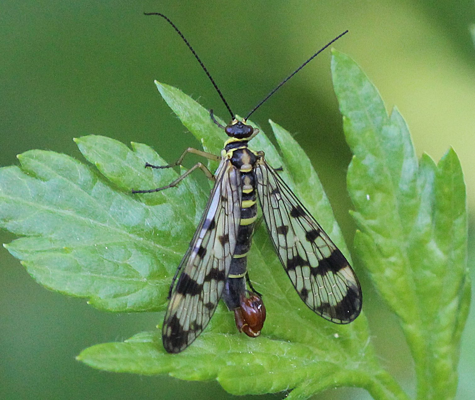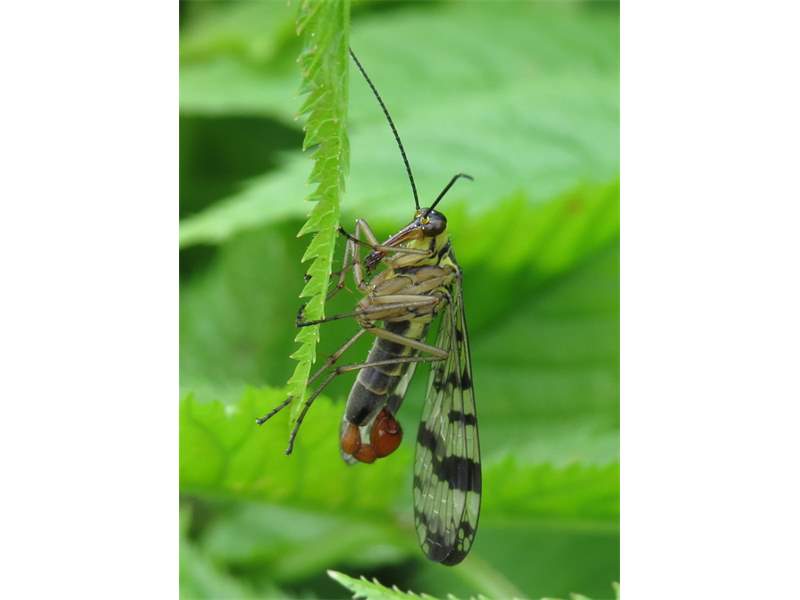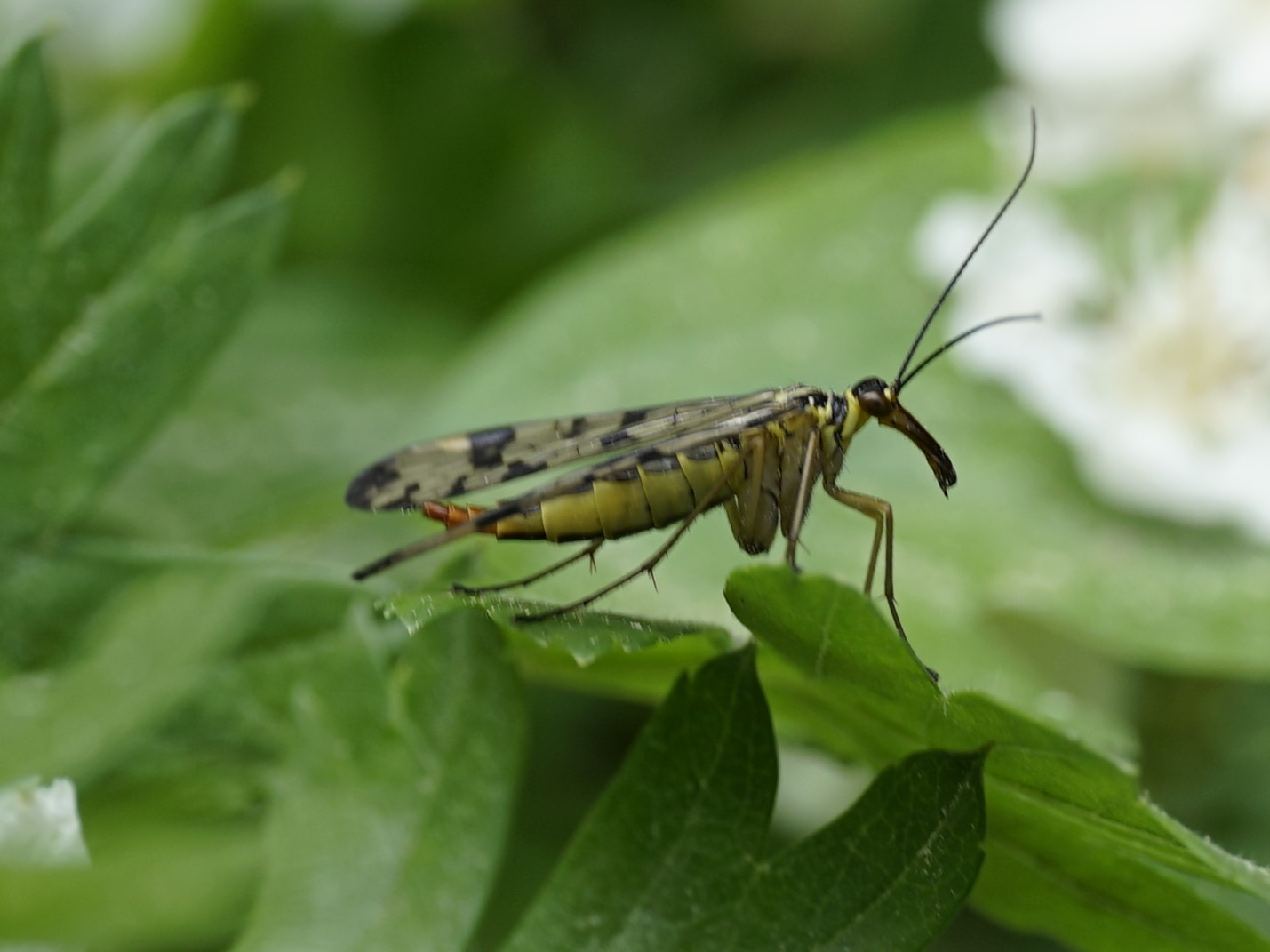Skorpionsfliegen bei der Kopulation, (09.08.2010 im Tharandter Wald am Triebischsee). Das Männchen hält das Weibchen nicht nur mit dem zangenförmigen Abdominalfortsatz fest, sondern hat seine Flügel noch so über die des Weibchens gelegt, dass ein Fortfliegen unmöglich ist. Die Hochzeit findet an einer toten Raupe (von Gregärparasiten befallen) statt, an denen die Adulten Nahrung aufnehmen