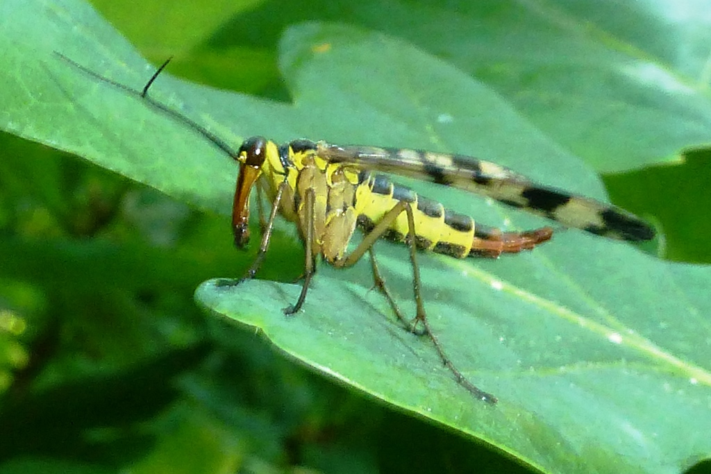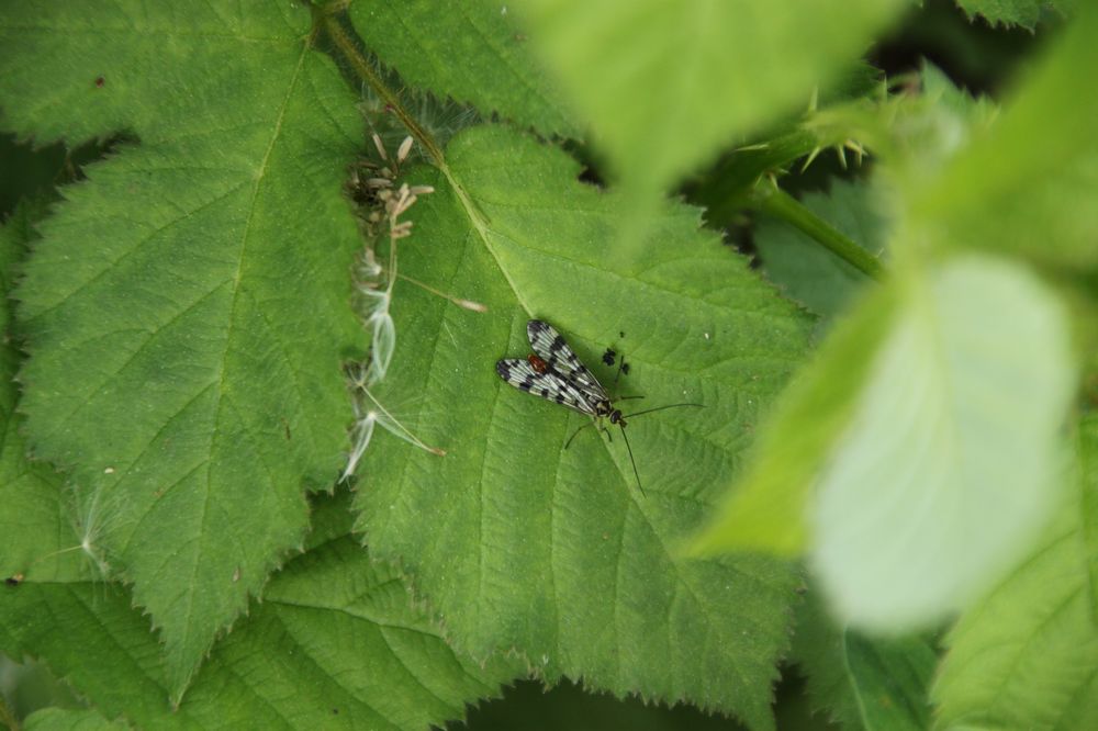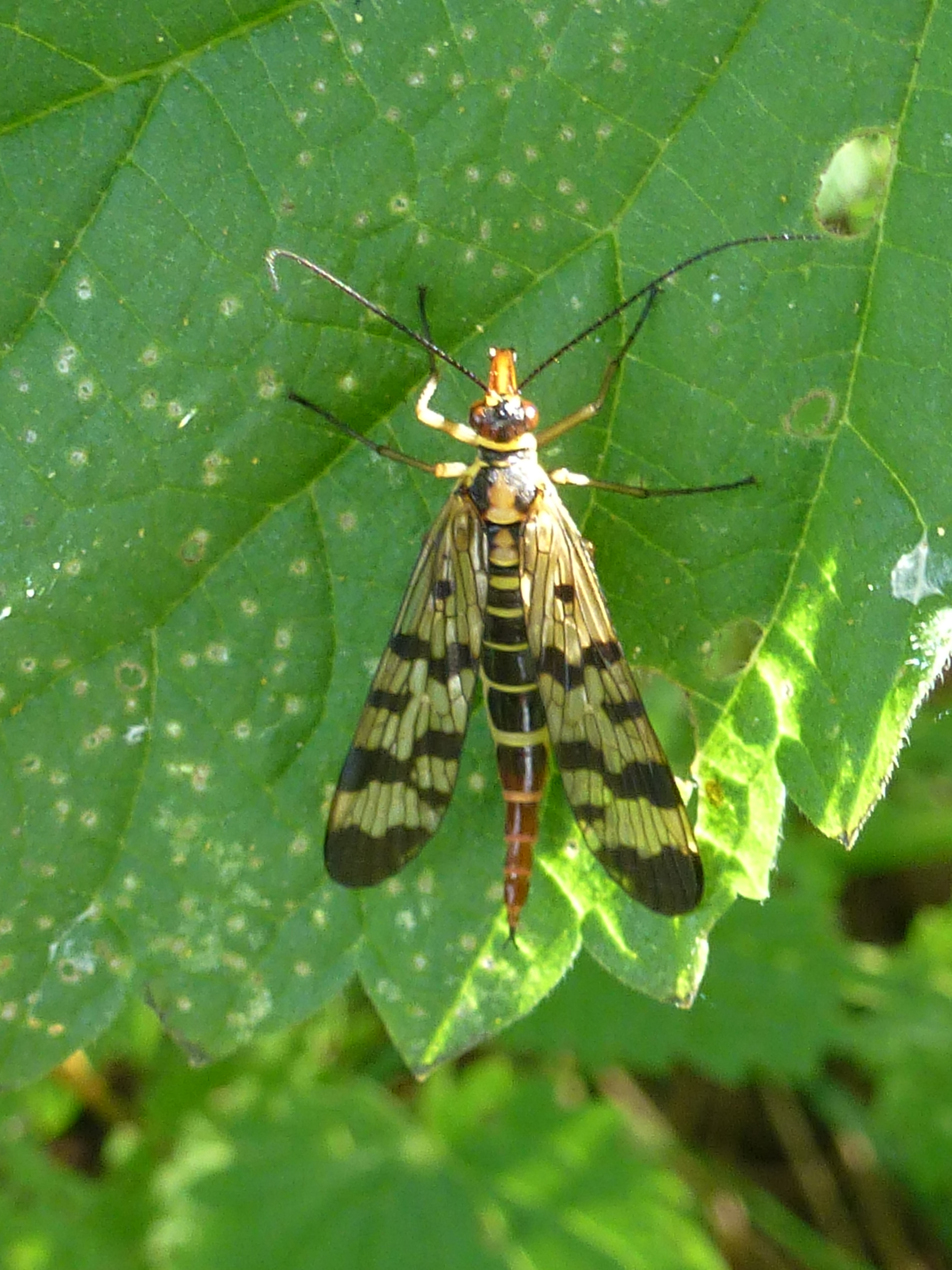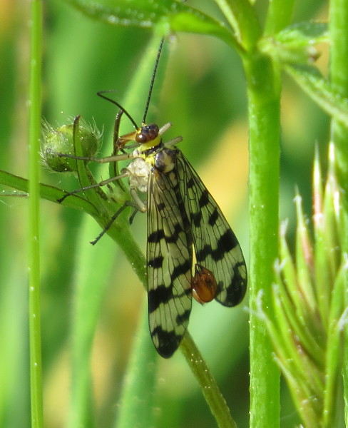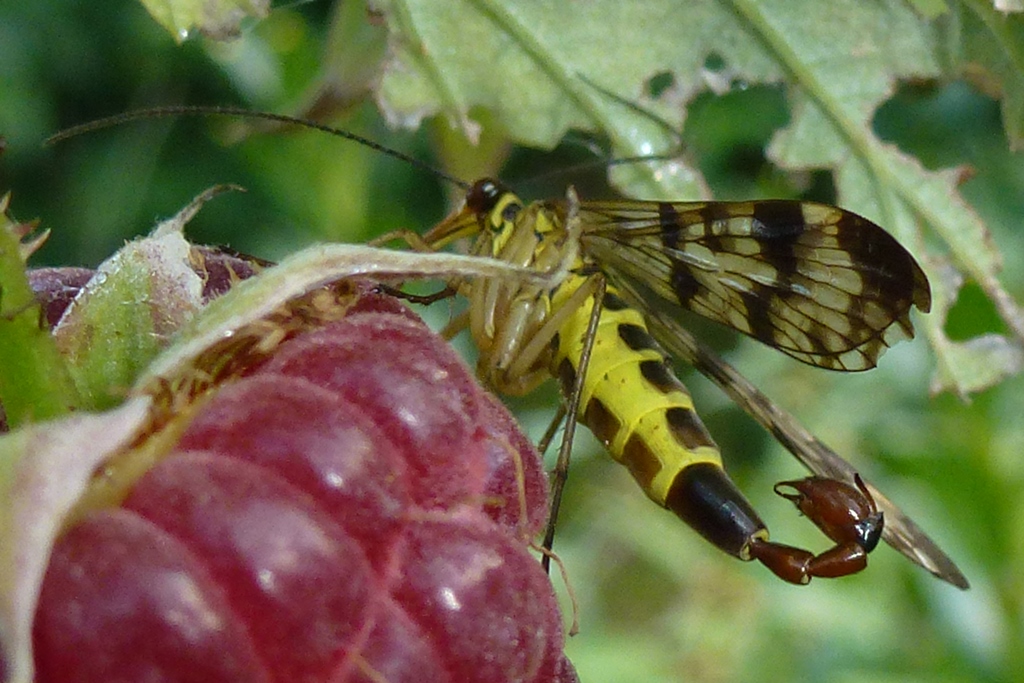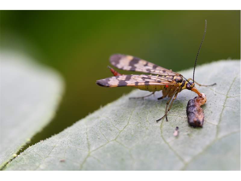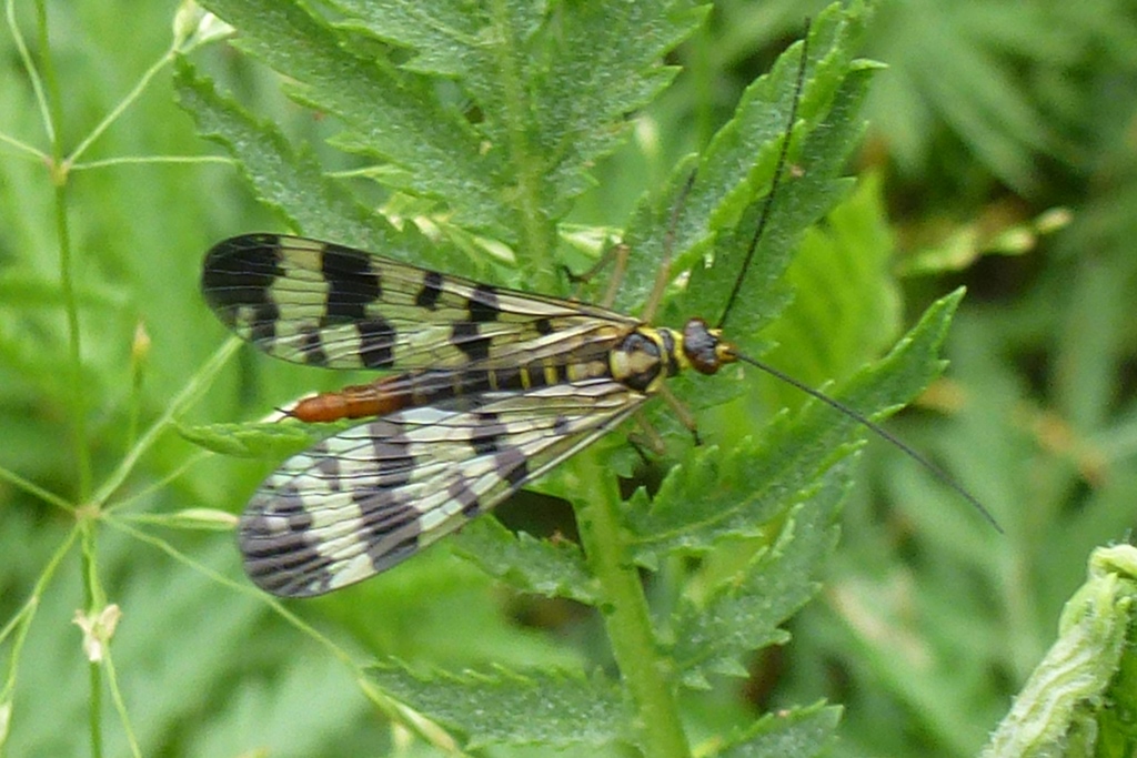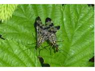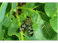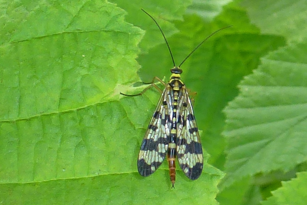 Skorpionsfliegen bei der Kopulation, (09.08.2010 im Tharandter Wald am Triebischsee). Das Männchen hält das Weibchen nicht nur mit dem zangenförmigen Abdominalfortsatz fest, sondern hat seine Flügel noch so über die des Weibchens gelegt, dass ein Fortfliegen unmöglich ist. Die Hochzeit findet an einer toten Raupe (von Gregärparasiten befallen) statt, an denen die Adulten Nahrung aufnehmen