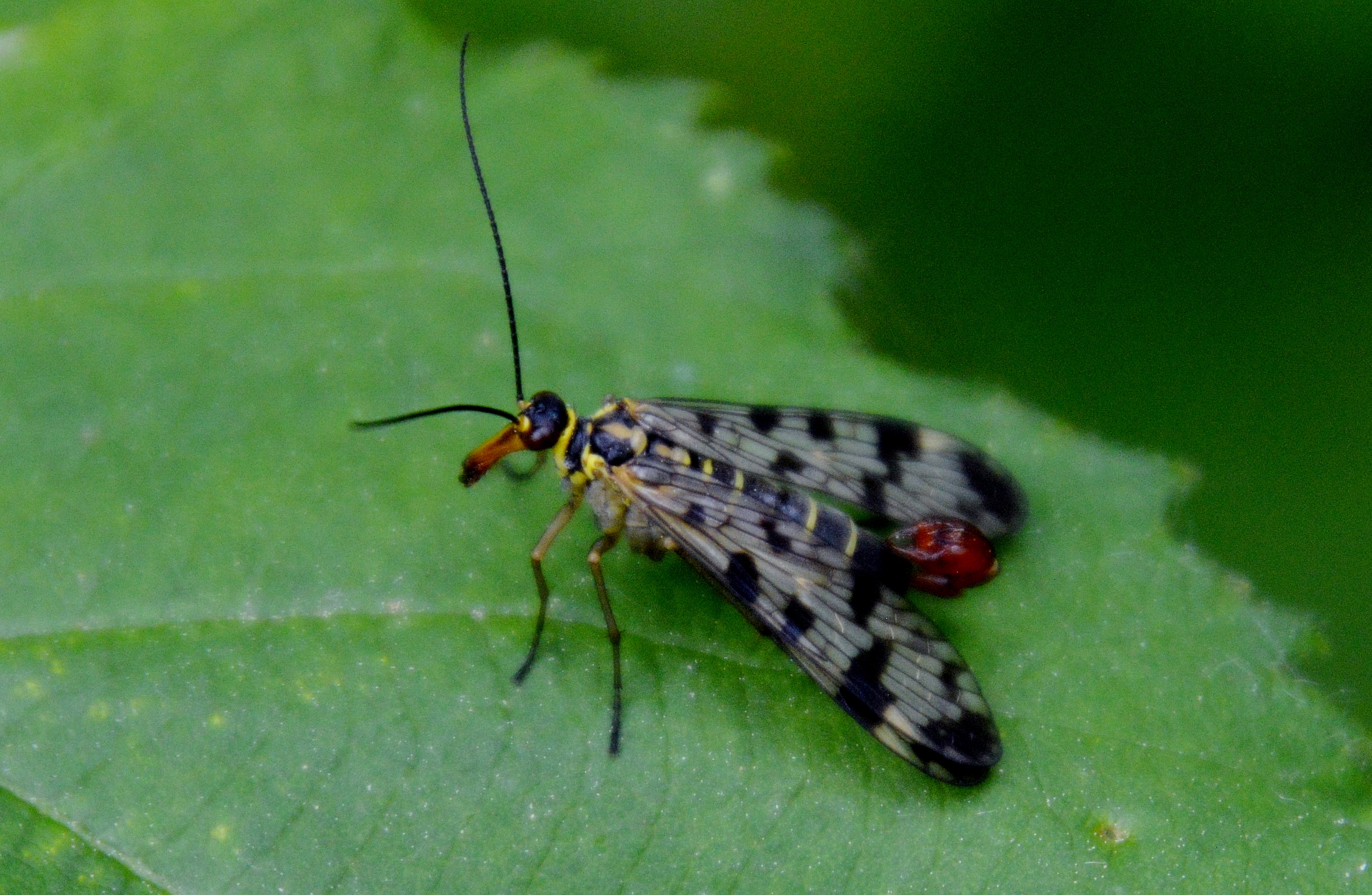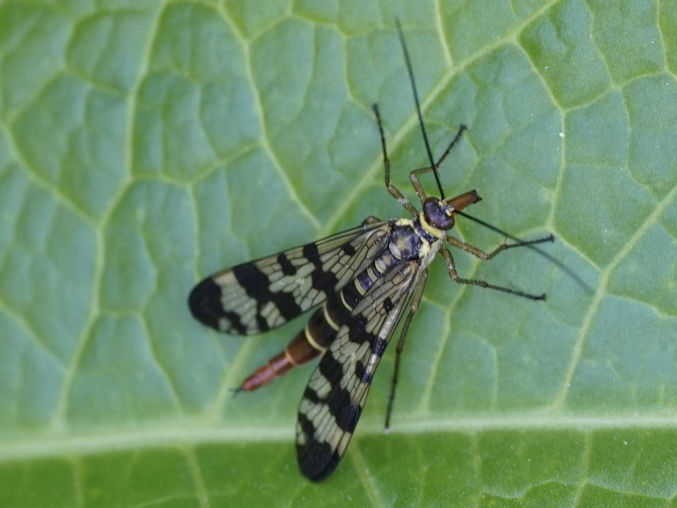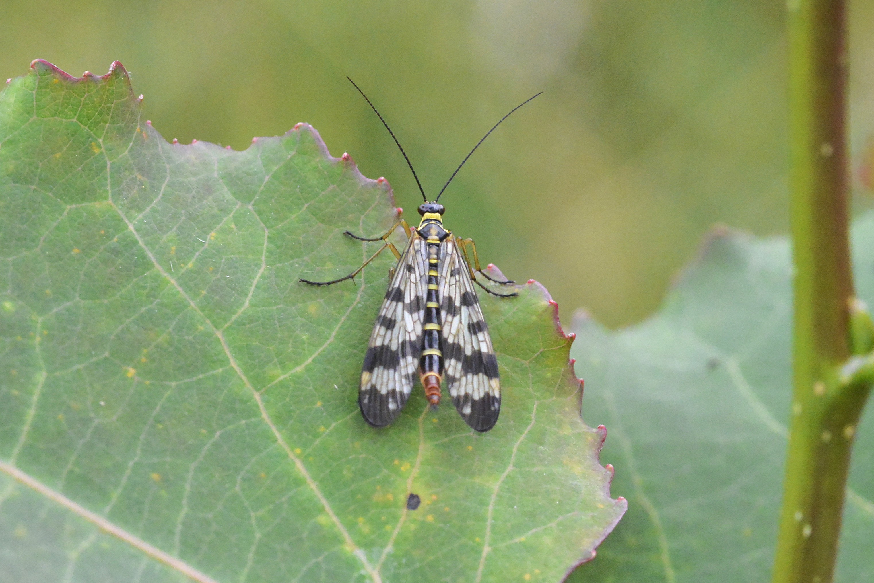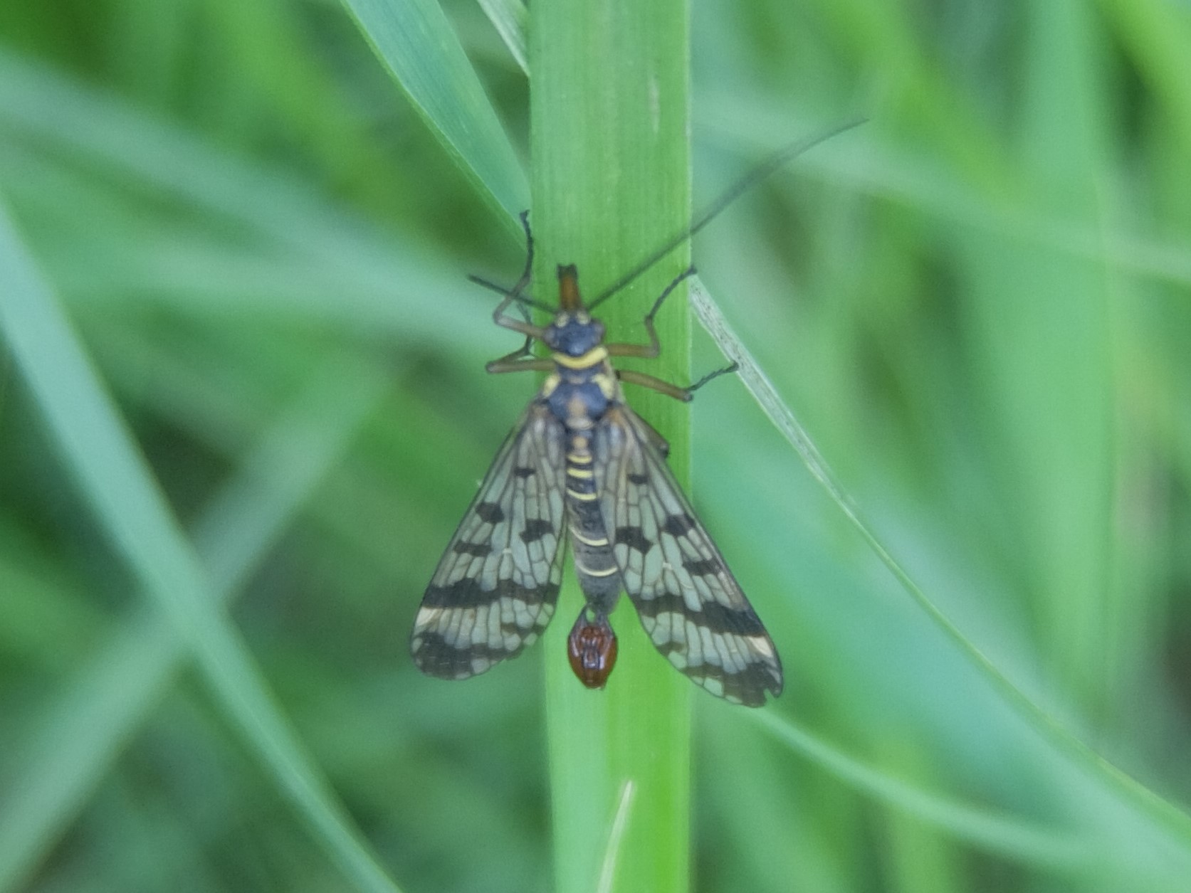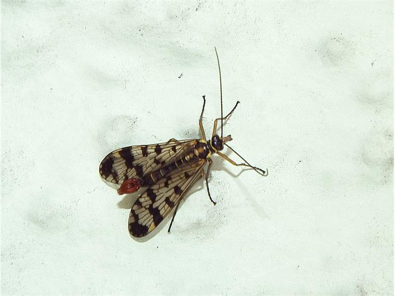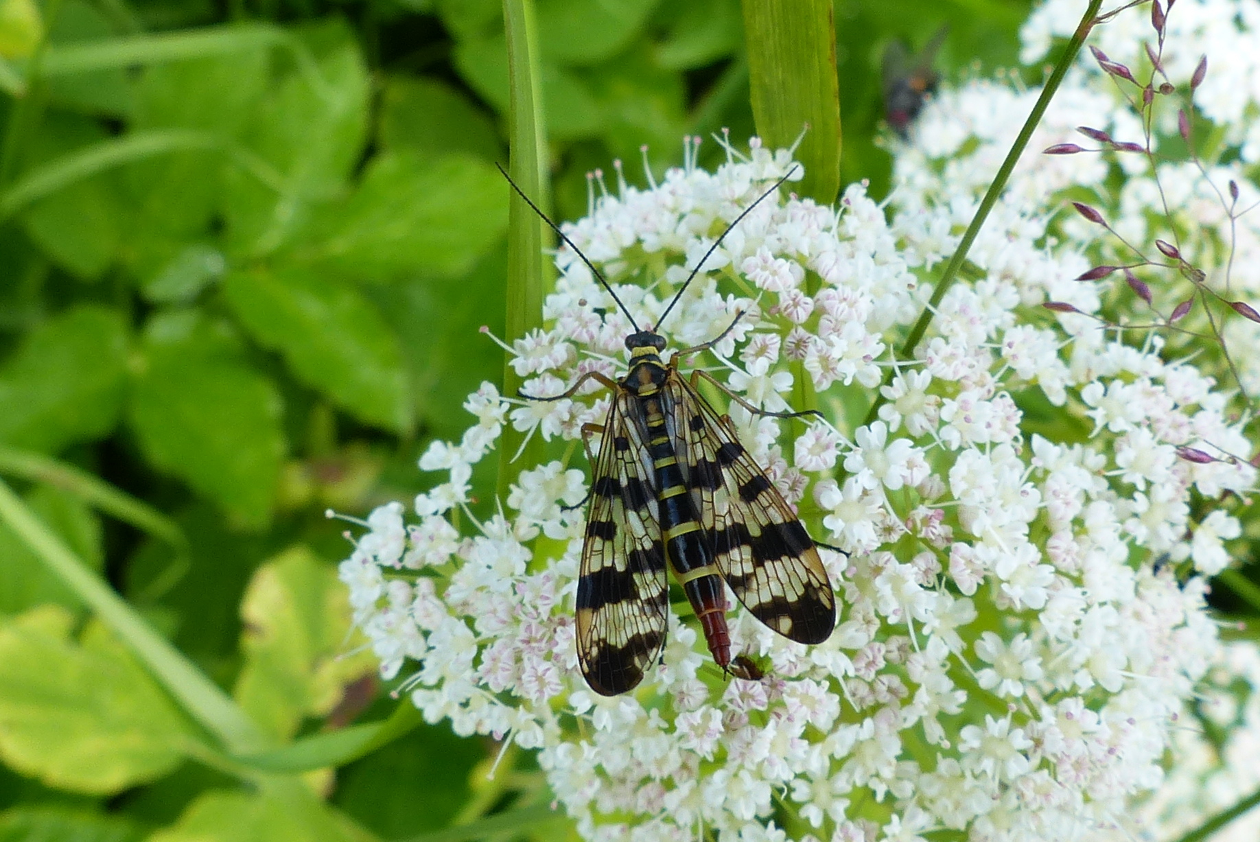Skorpionsfliegen bei der Kopulation, (09.08.2010 im Tharandter Wald am Triebischsee). Das Männchen hält das Weibchen nicht nur mit dem zangenförmigen Abdominalfortsatz fest, sondern hat seine Flügel noch so über die des Weibchens gelegt, dass ein Fortfliegen unmöglich ist. Die Hochzeit findet an einer toten Raupe (von Gregärparasiten befallen) statt, an denen die Adulten Nahrung aufnehmen