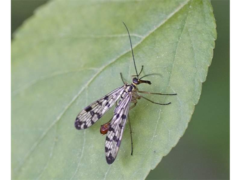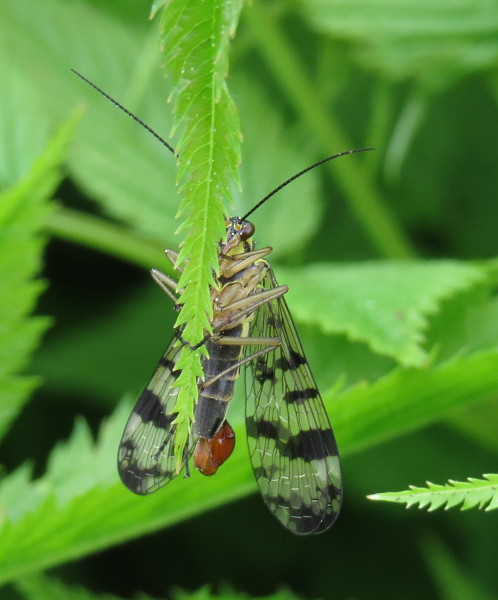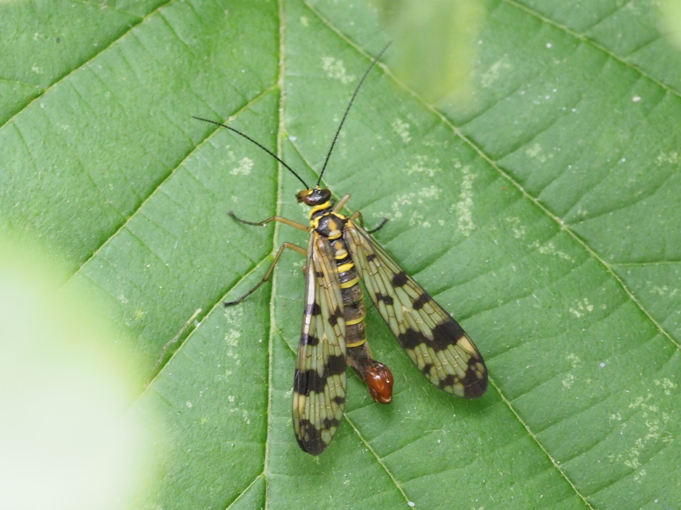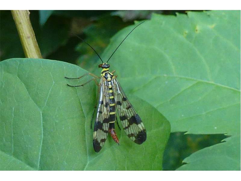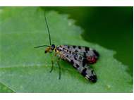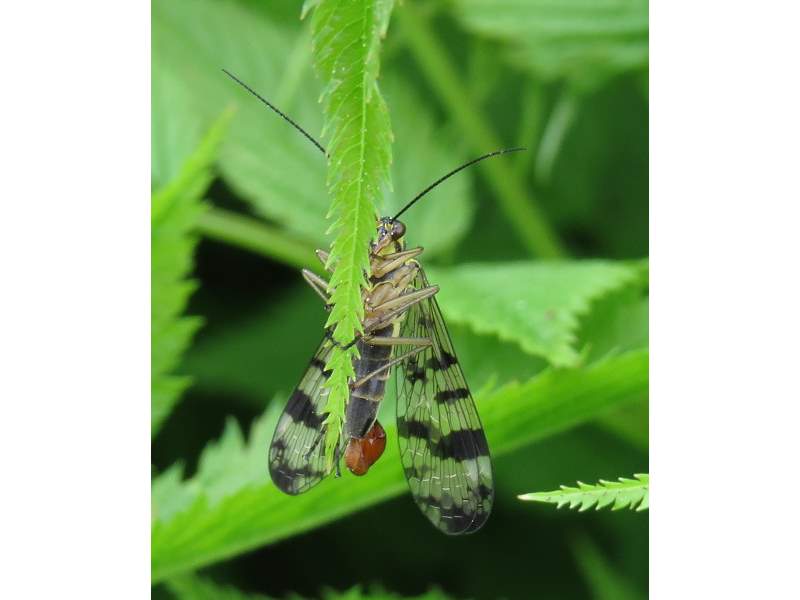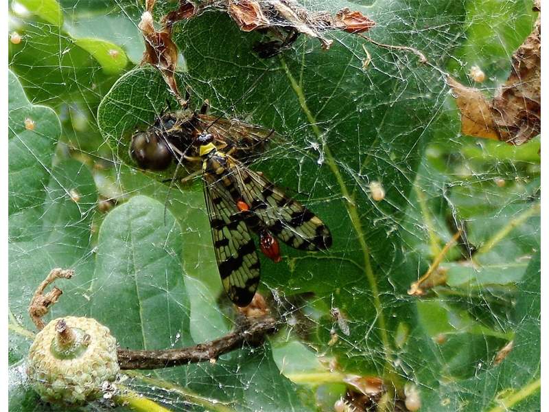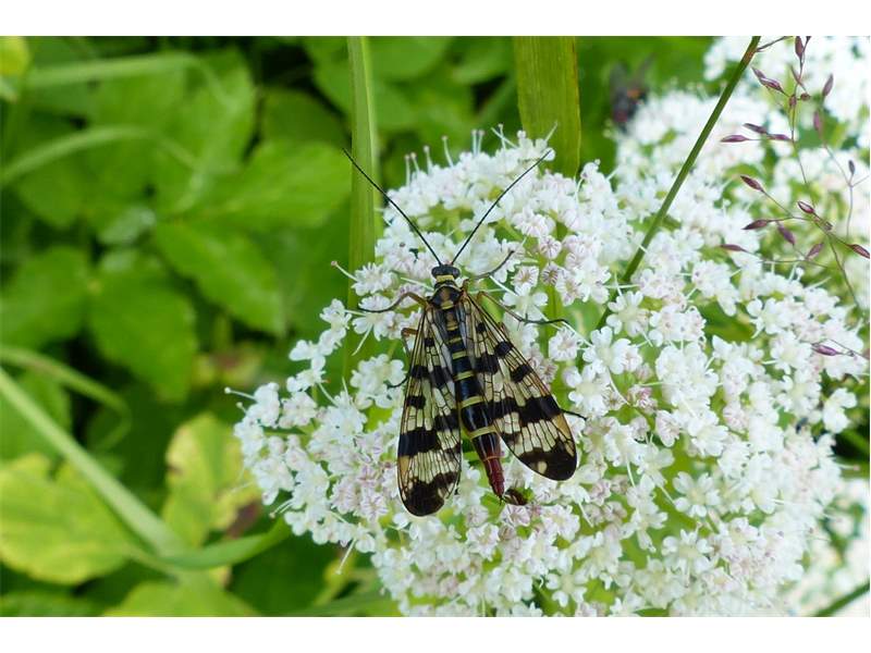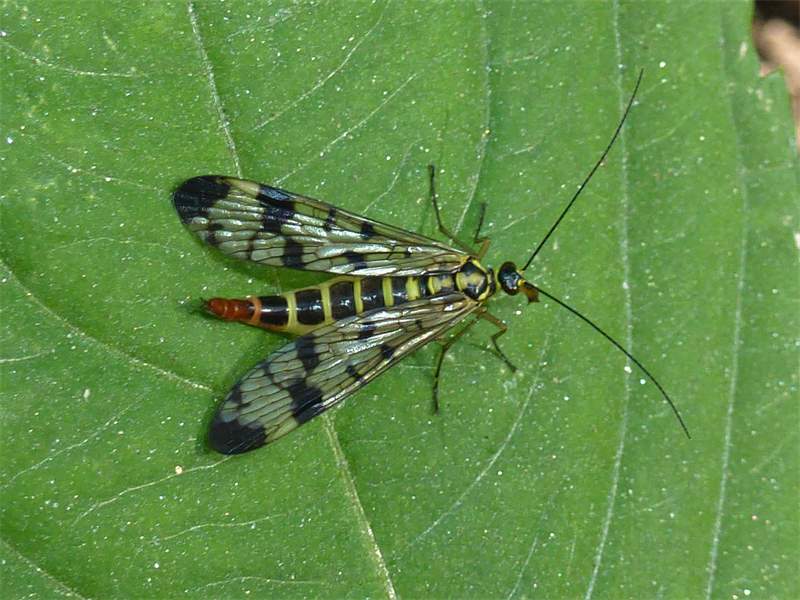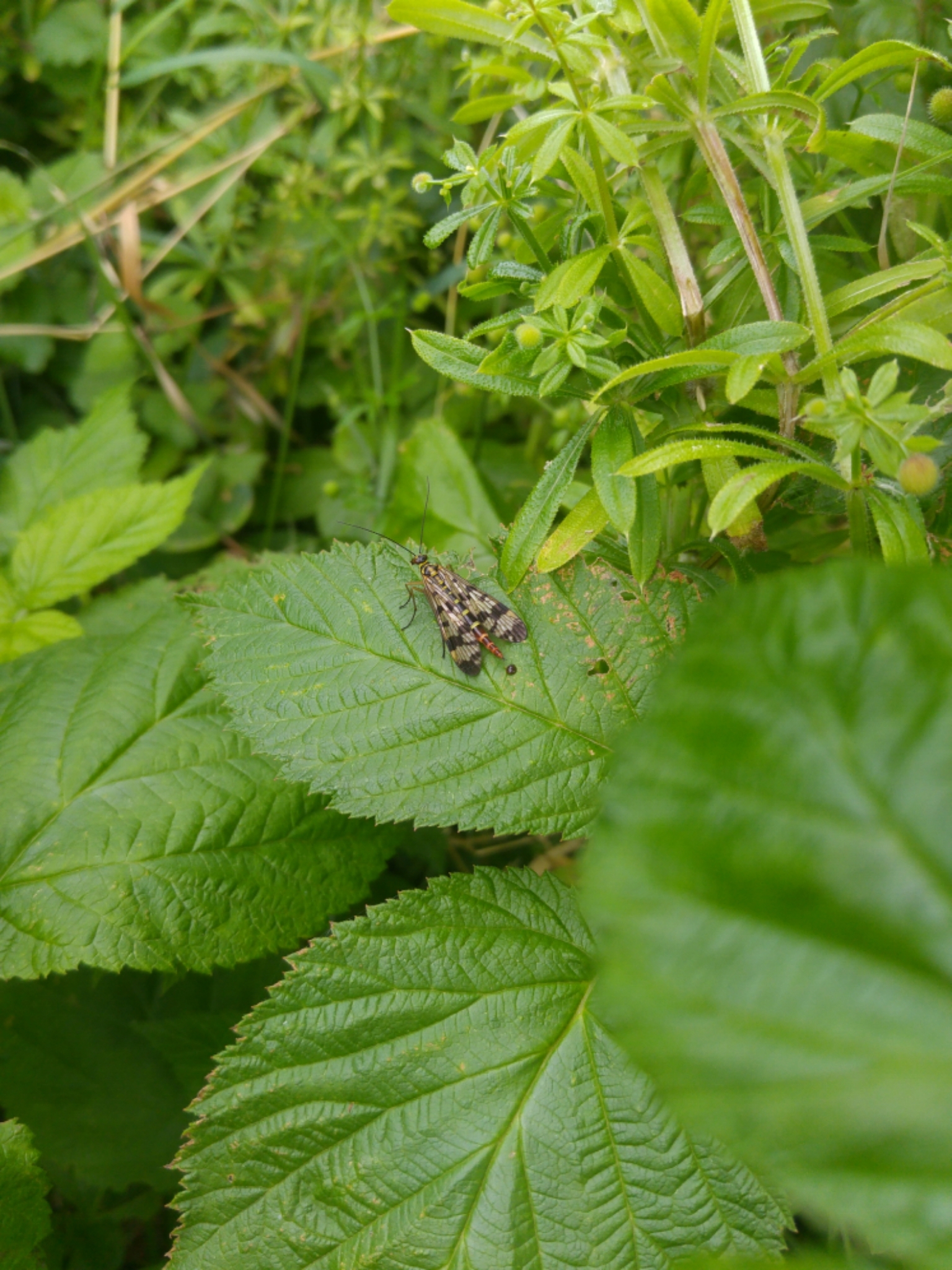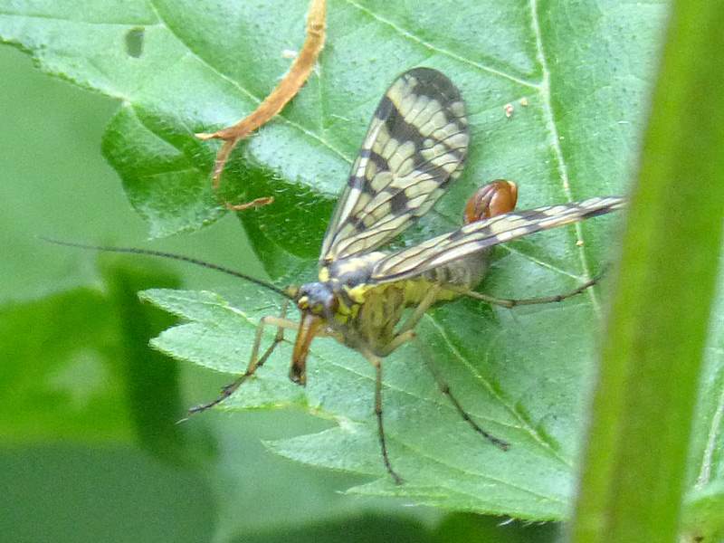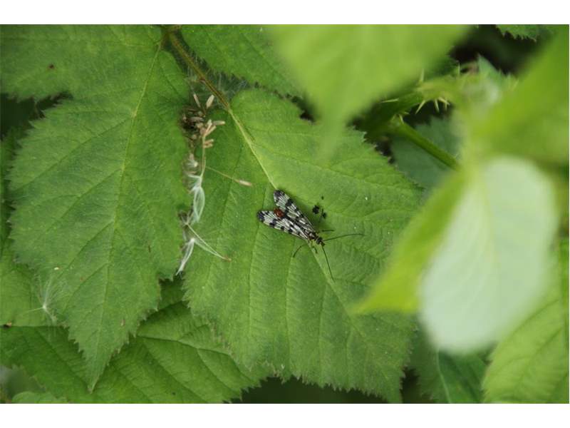 Skorpionsfliegen bei der Kopulation, (09.08.2010 im Tharandter Wald am Triebischsee). Das Männchen hält das Weibchen nicht nur mit dem zangenförmigen Abdominalfortsatz fest, sondern hat seine Flügel noch so über die des Weibchens gelegt, dass ein Fortfliegen unmöglich ist. Die Hochzeit findet an einer toten Raupe (von Gregärparasiten befallen) statt, an denen die Adulten Nahrung aufnehmen