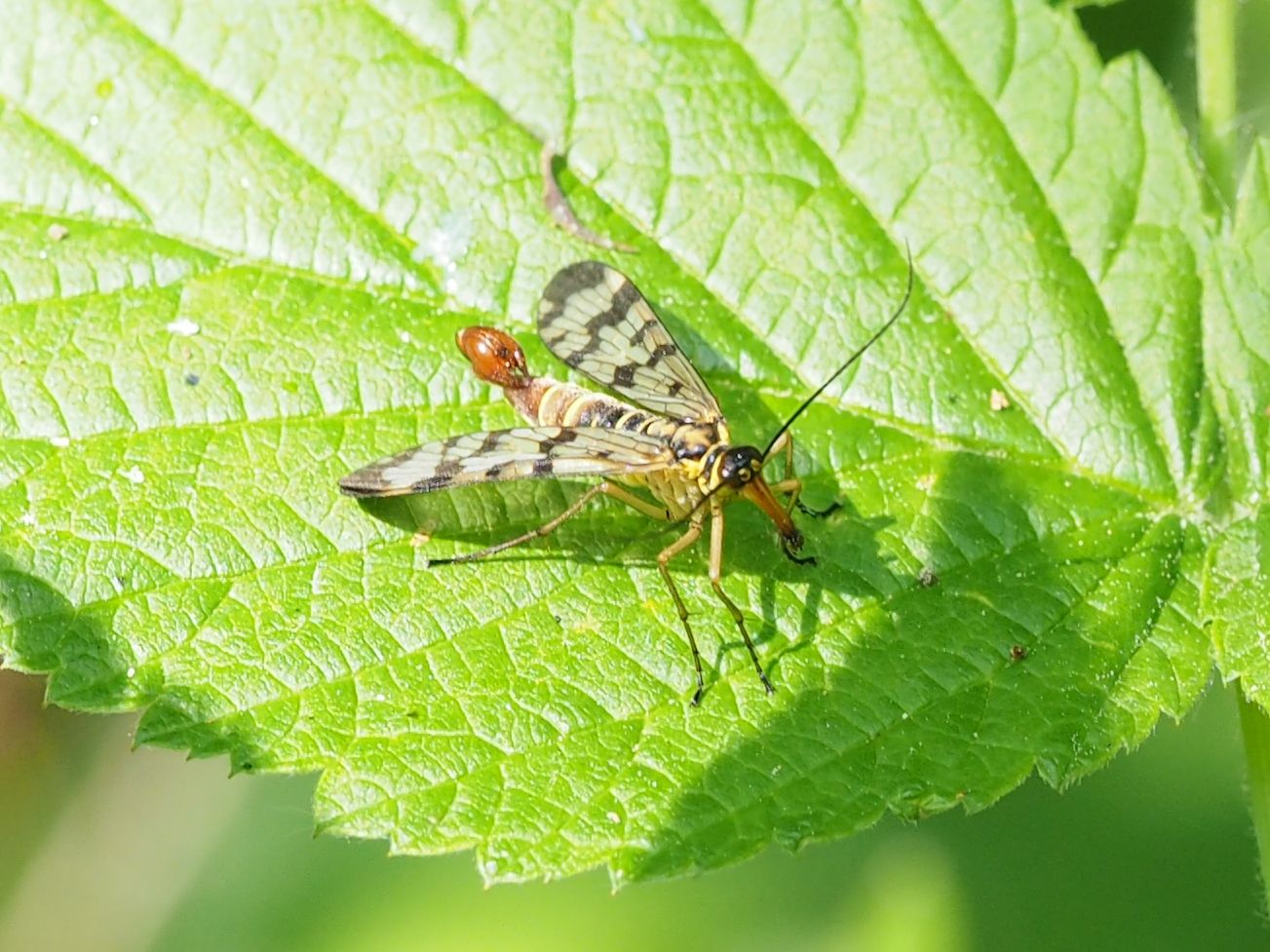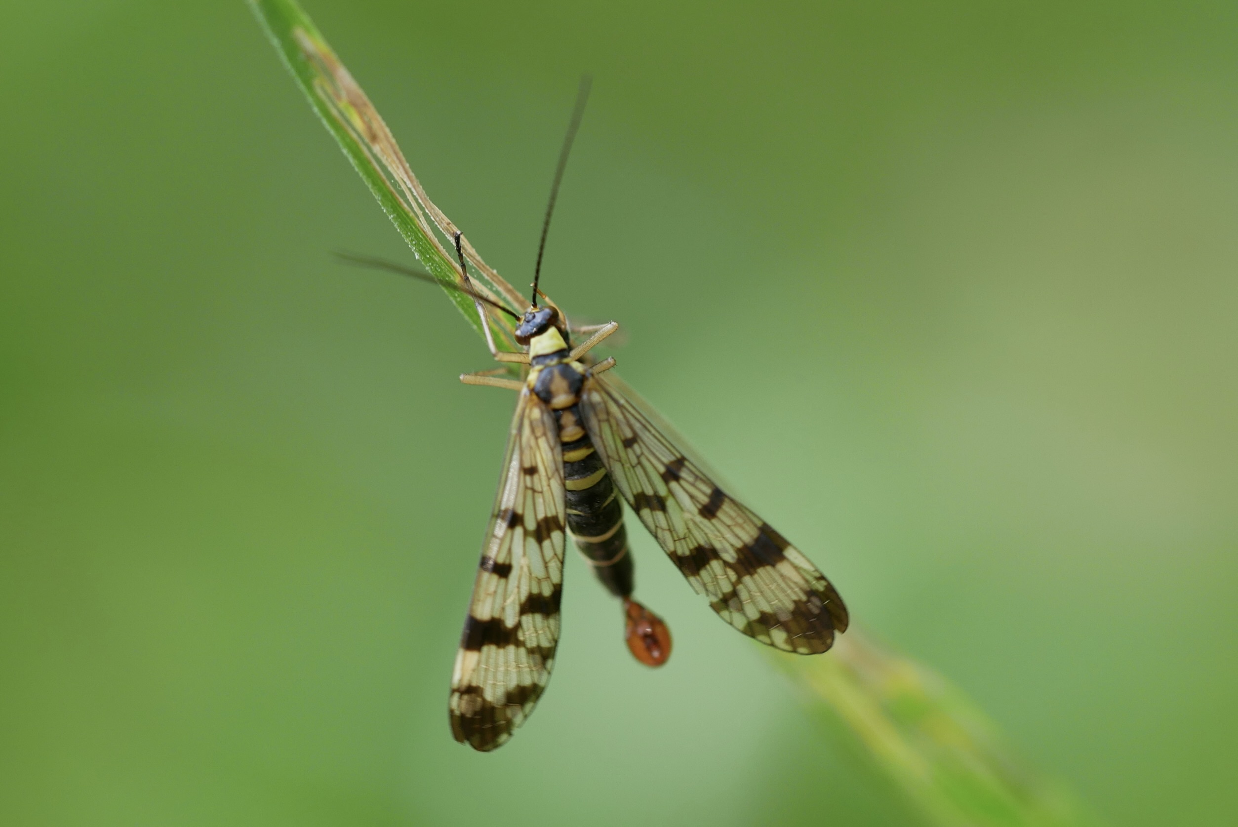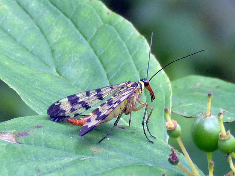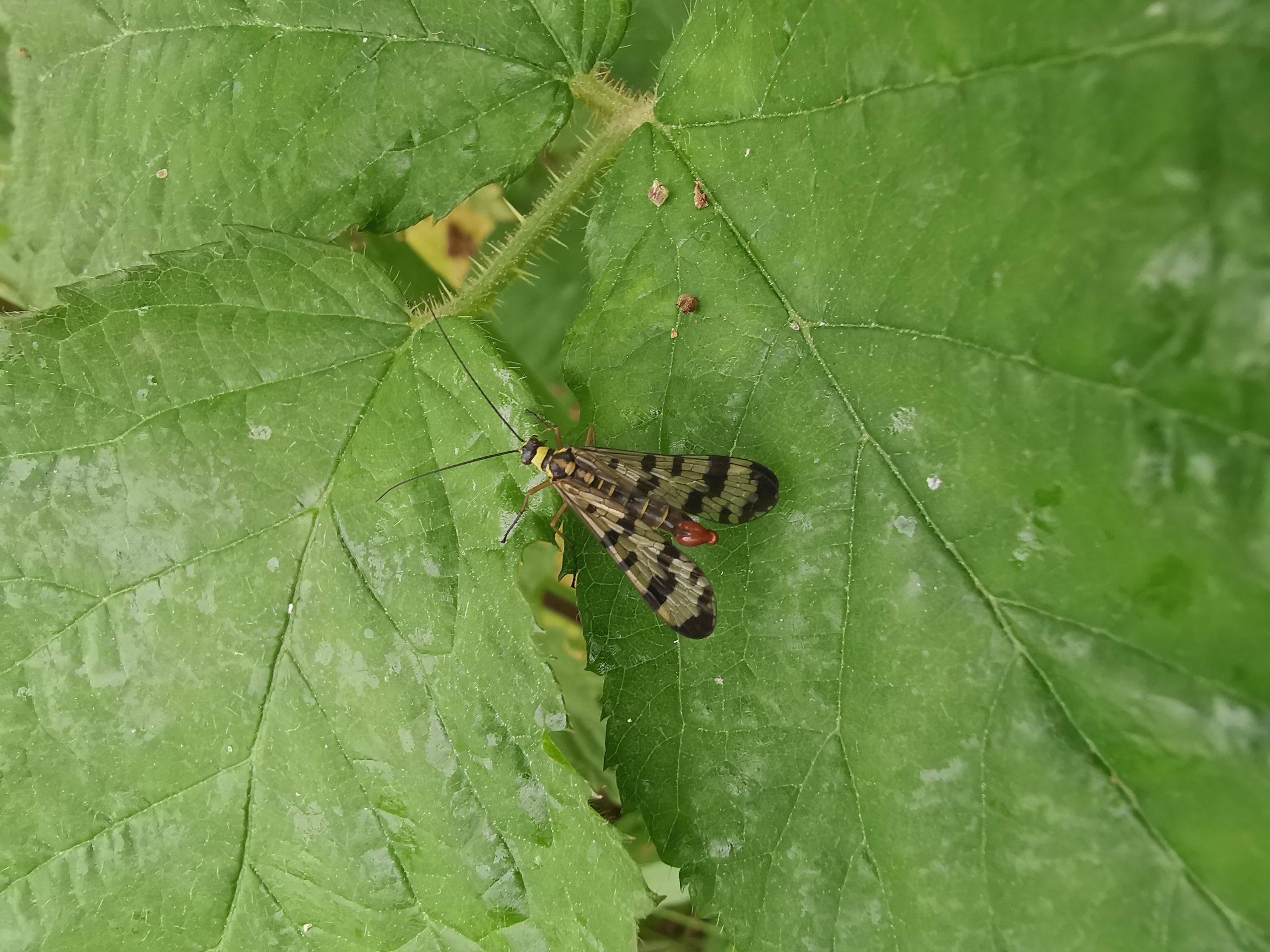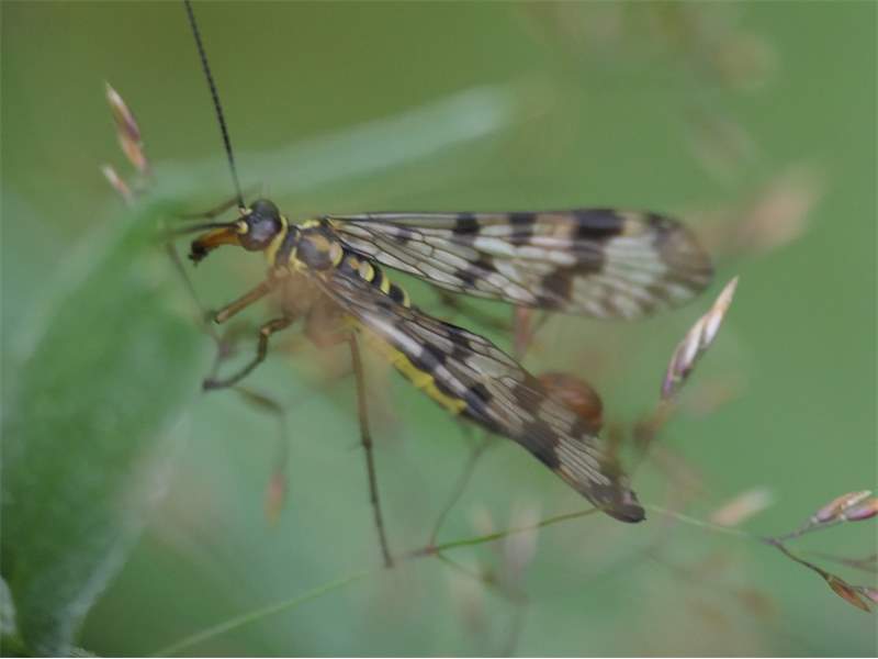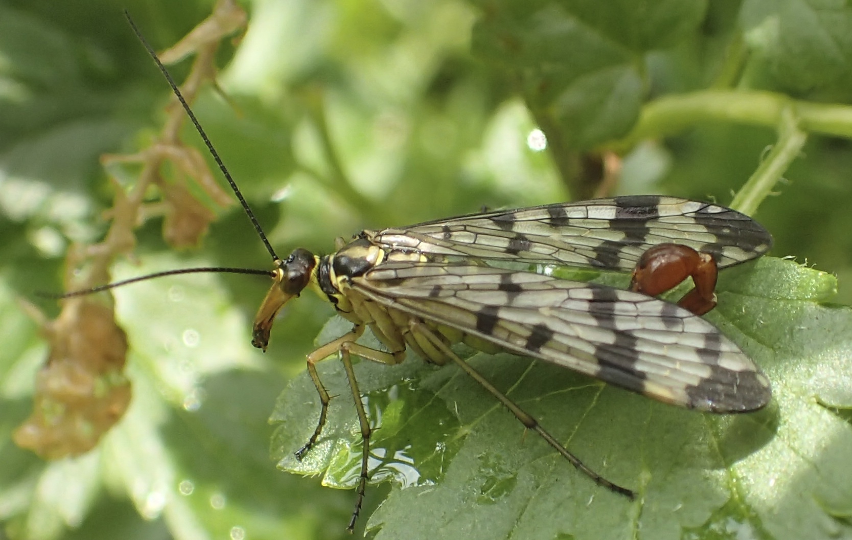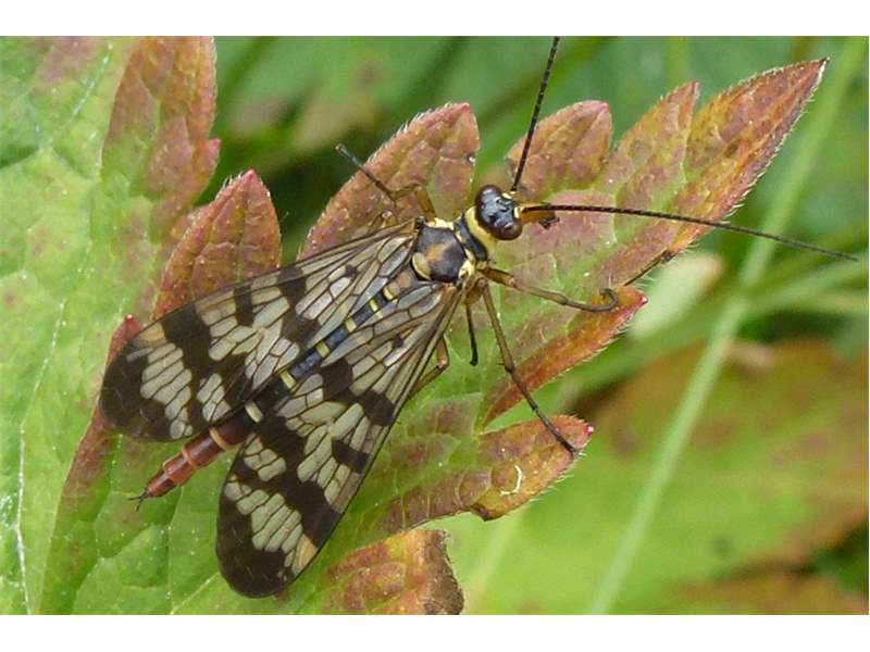 Skorpionsfliegen bei der Kopulation, (09.08.2010 im Tharandter Wald am Triebischsee). Das Männchen hält das Weibchen nicht nur mit dem zangenförmigen Abdominalfortsatz fest, sondern hat seine Flügel noch so über die des Weibchens gelegt, dass ein Fortfliegen unmöglich ist. Die Hochzeit findet an einer toten Raupe (von Gregärparasiten befallen) statt, an denen die Adulten Nahrung aufnehmen