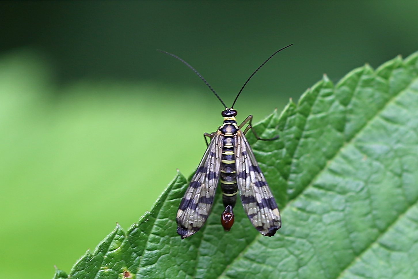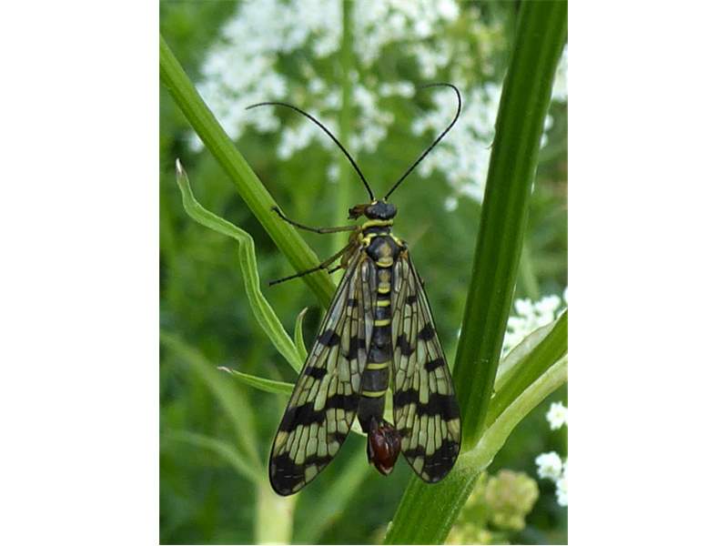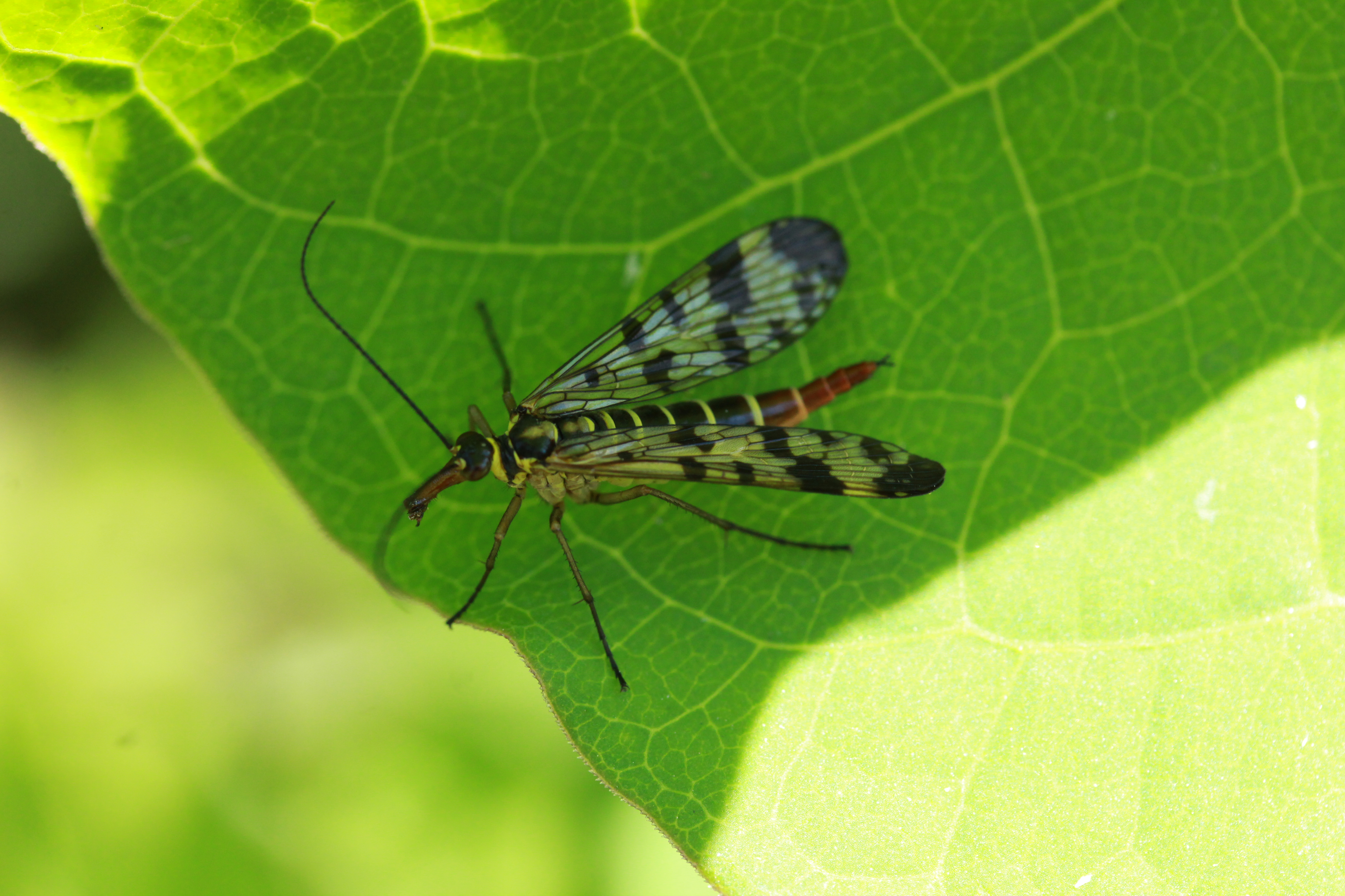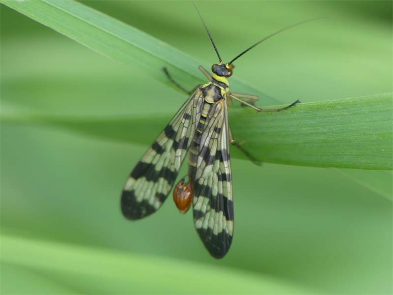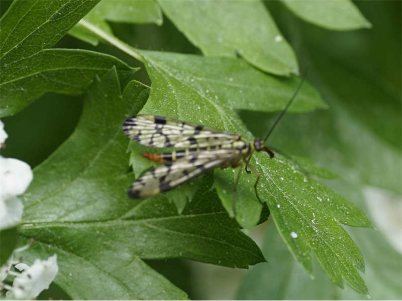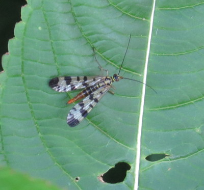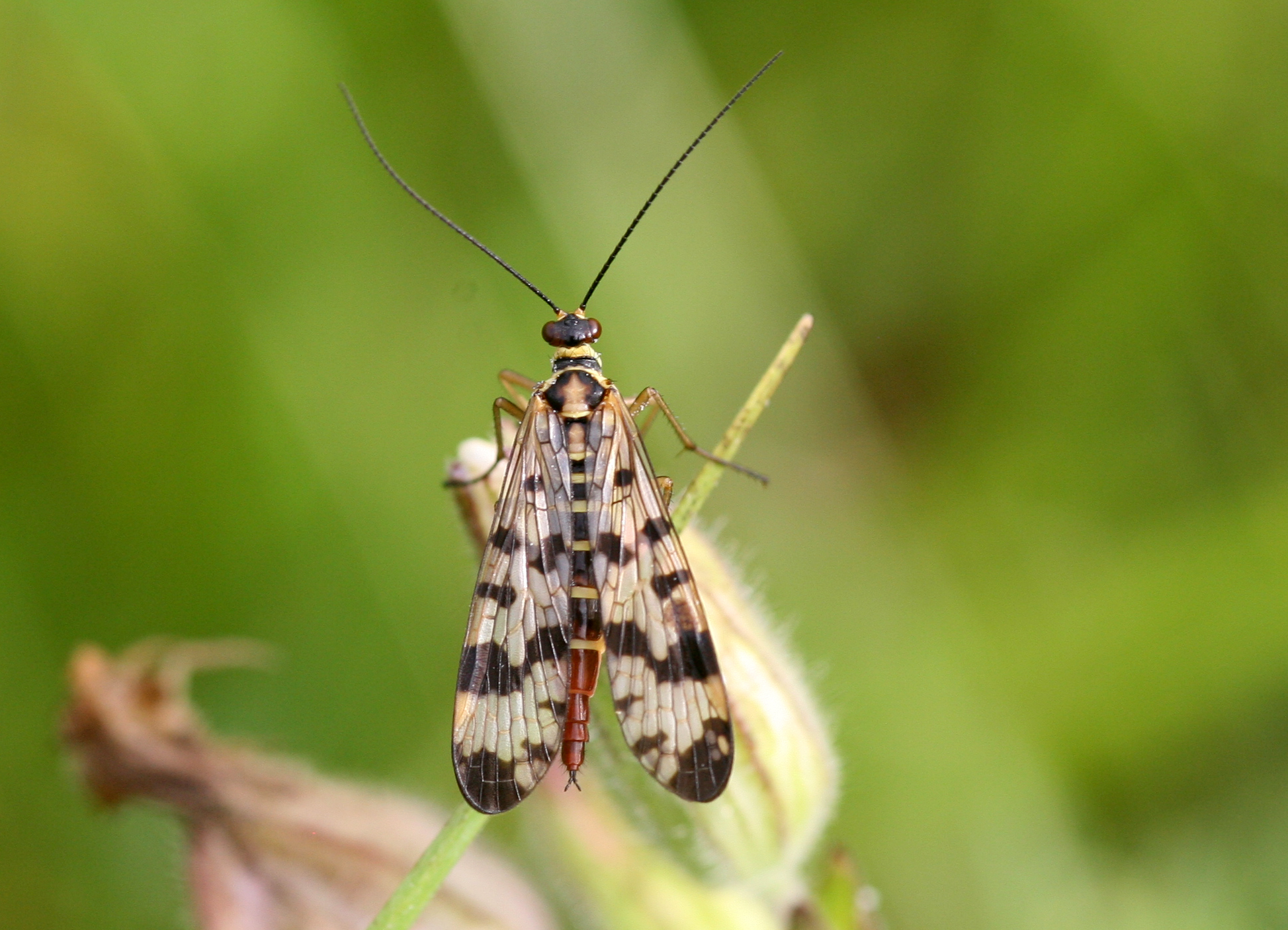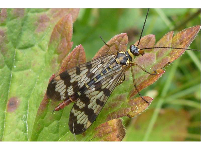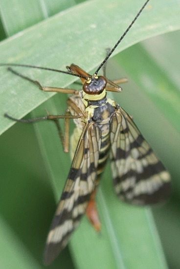 Skorpionsfliegen bei der Kopulation, (09.08.2010 im Tharandter Wald am Triebischsee). Das Männchen hält das Weibchen nicht nur mit dem zangenförmigen Abdominalfortsatz fest, sondern hat seine Flügel noch so über die des Weibchens gelegt, dass ein Fortfliegen unmöglich ist. Die Hochzeit findet an einer toten Raupe (von Gregärparasiten befallen) statt, an denen die Adulten Nahrung aufnehmen