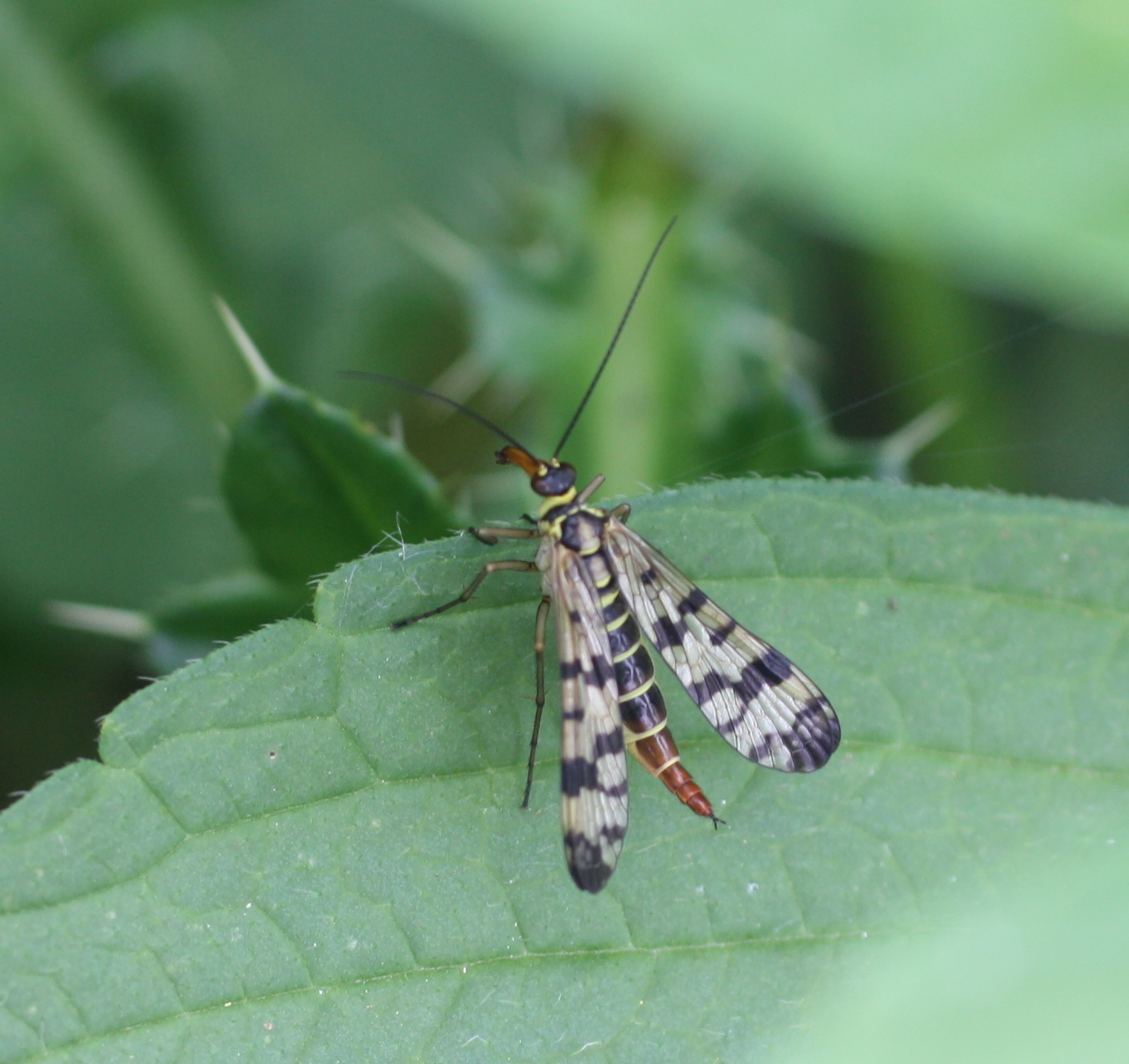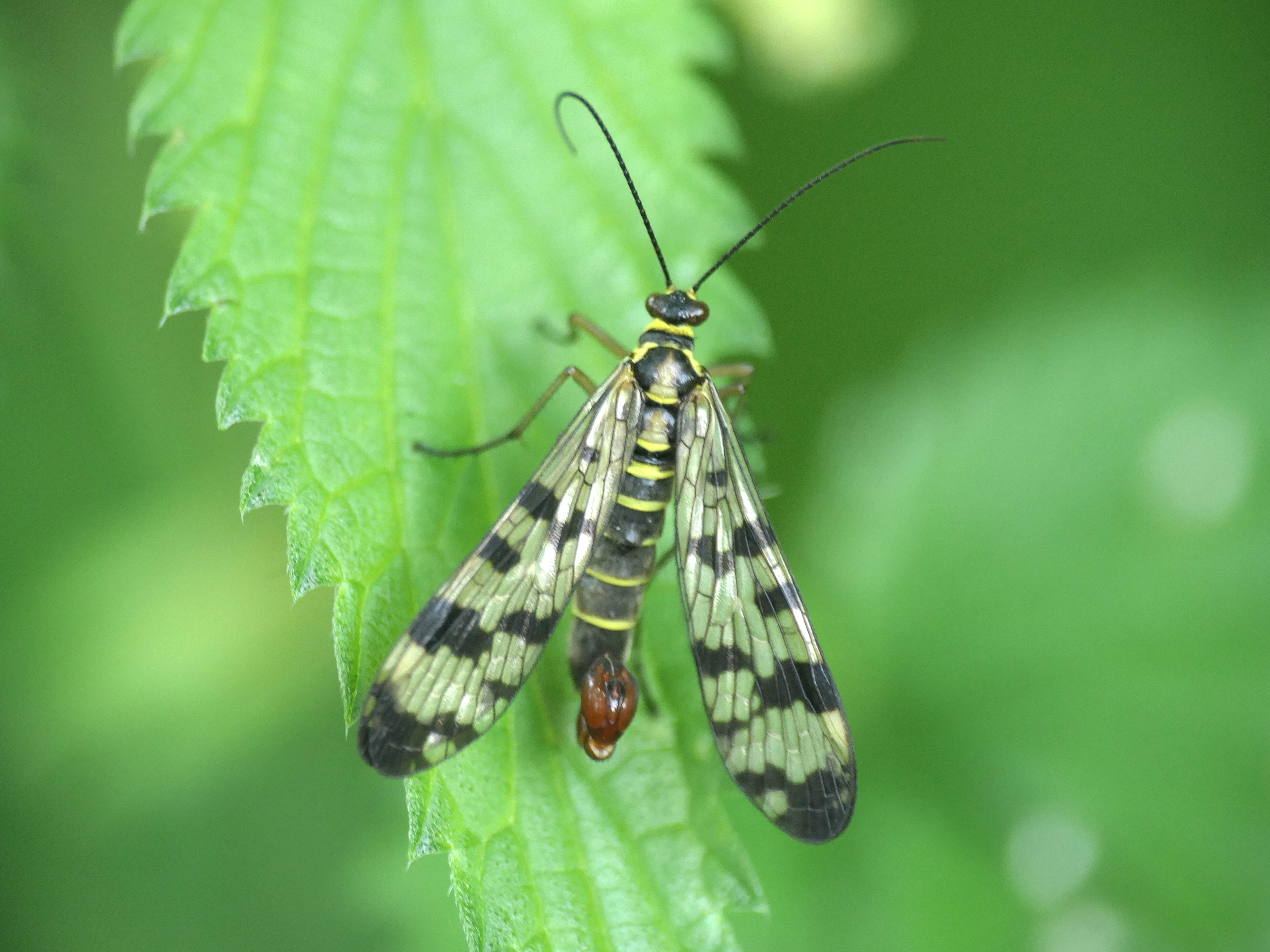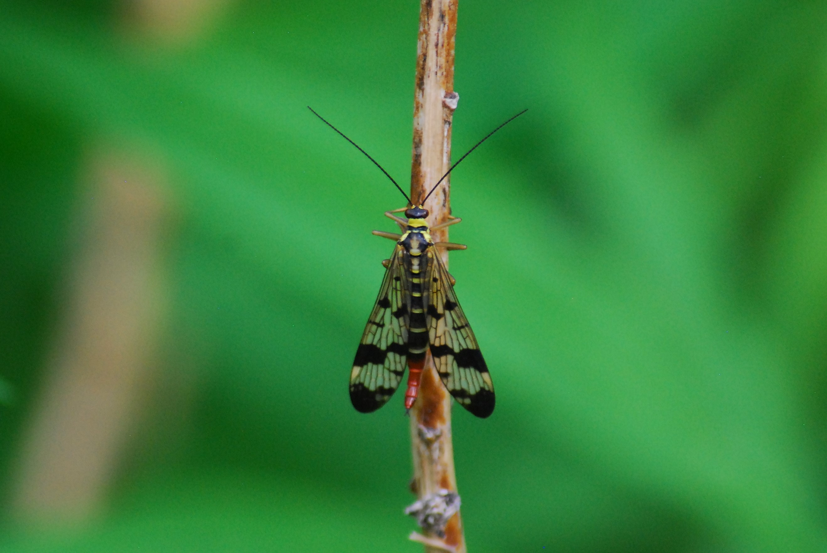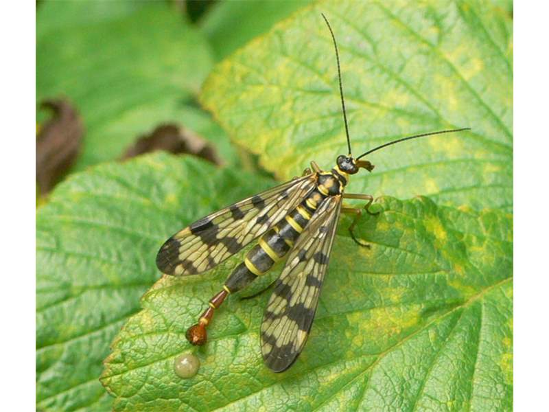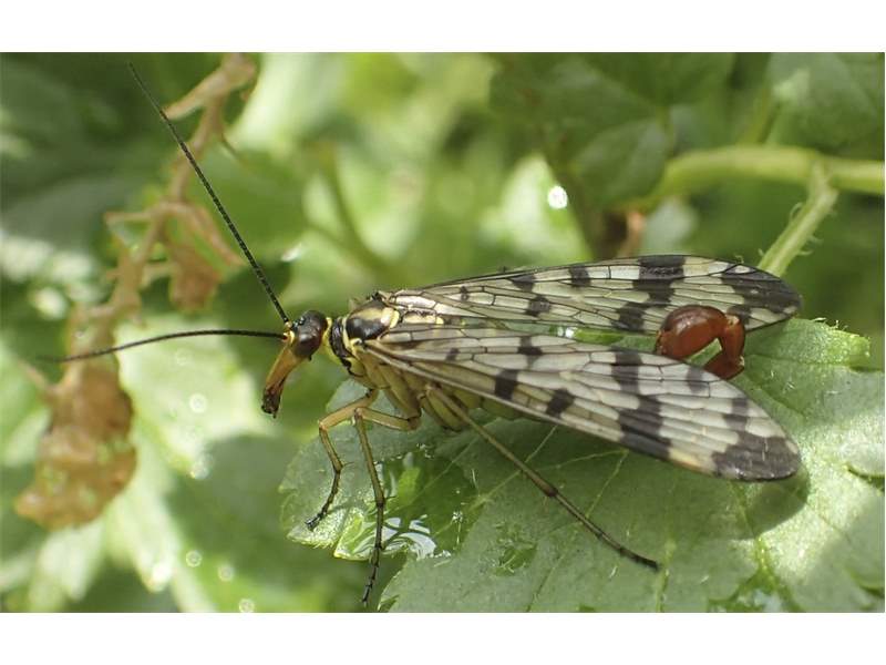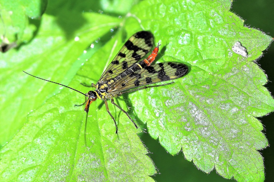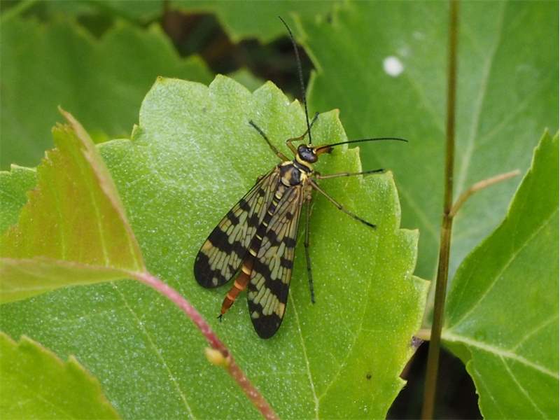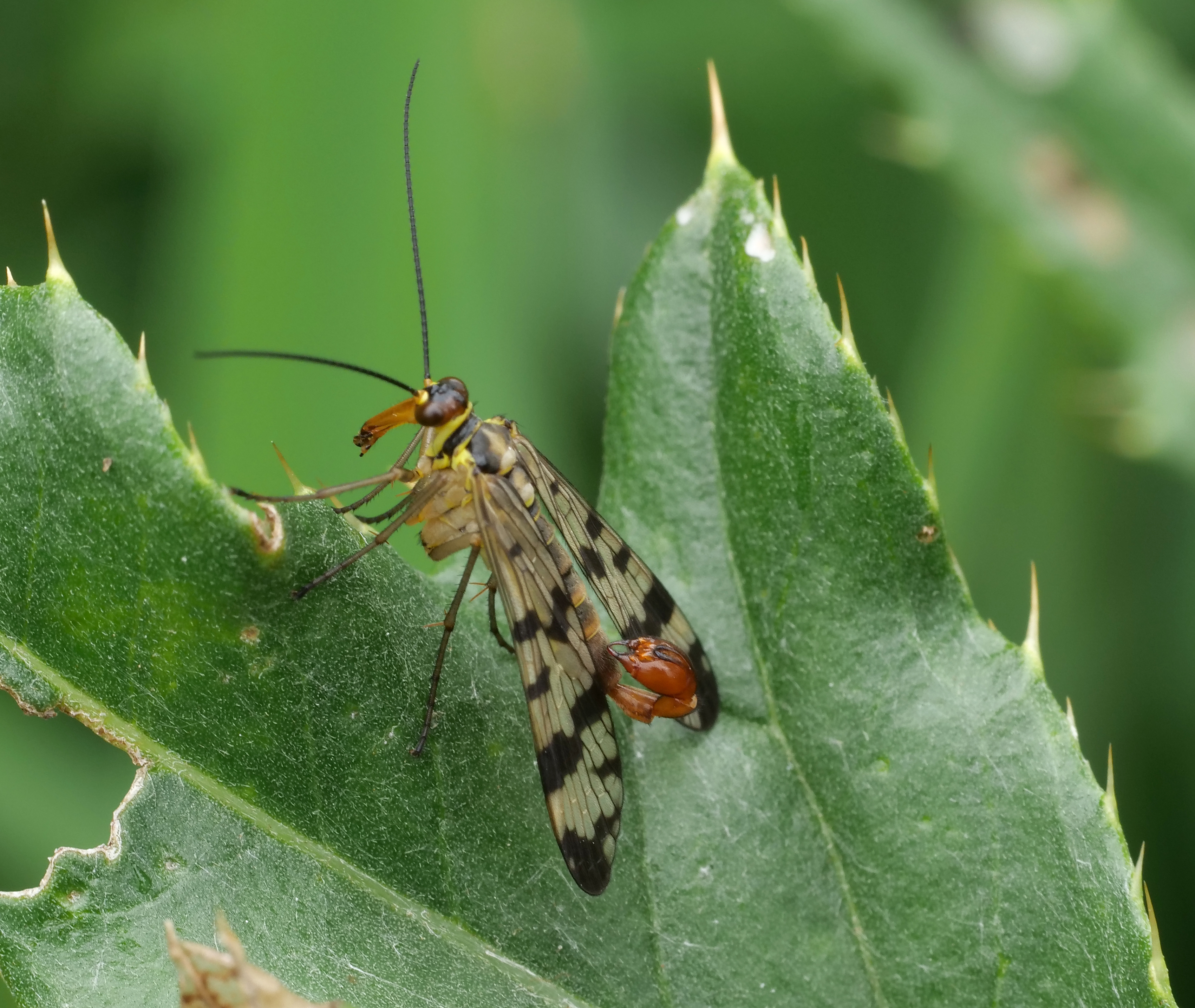 Skorpionsfliegen bei der Kopulation, (09.08.2010 im Tharandter Wald am Triebischsee). Das Männchen hält das Weibchen nicht nur mit dem zangenförmigen Abdominalfortsatz fest, sondern hat seine Flügel noch so über die des Weibchens gelegt, dass ein Fortfliegen unmöglich ist. Die Hochzeit findet an einer toten Raupe (von Gregärparasiten befallen) statt, an denen die Adulten Nahrung aufnehmen