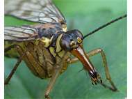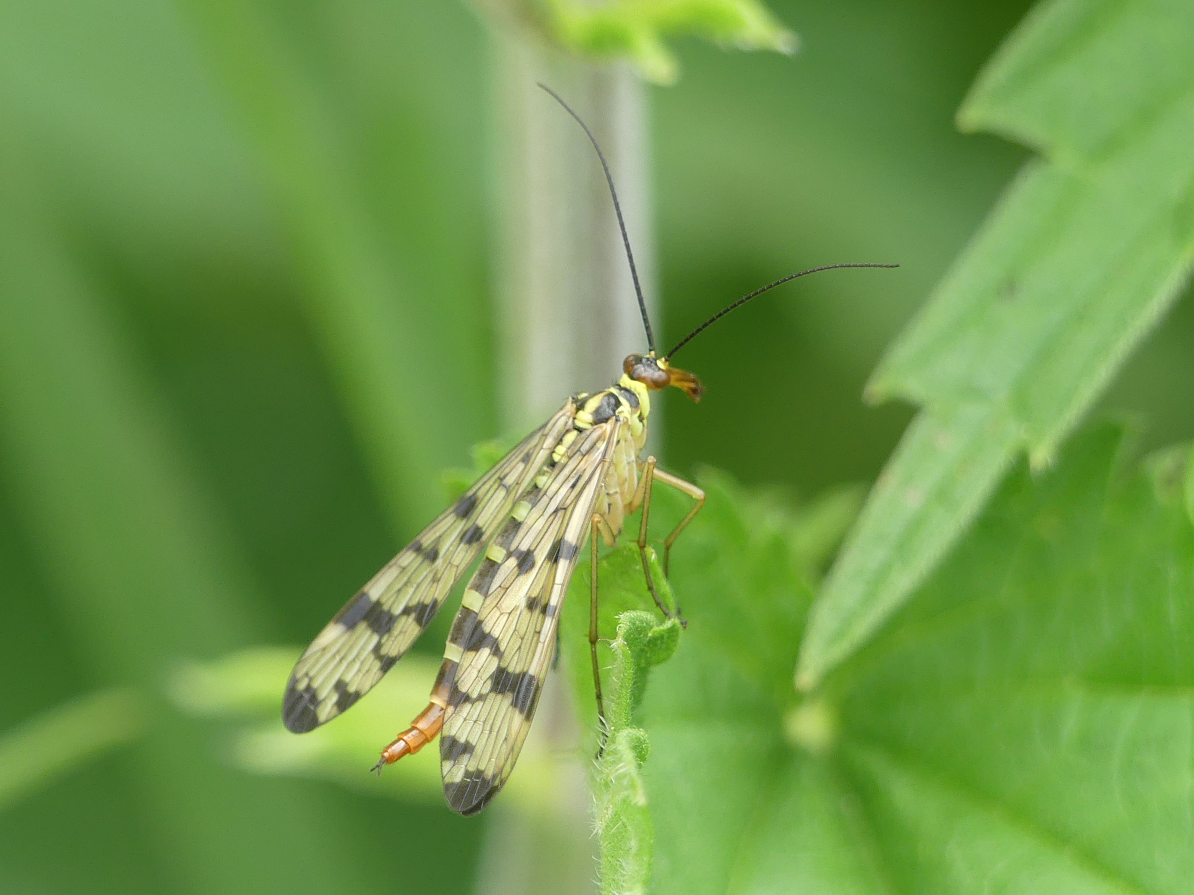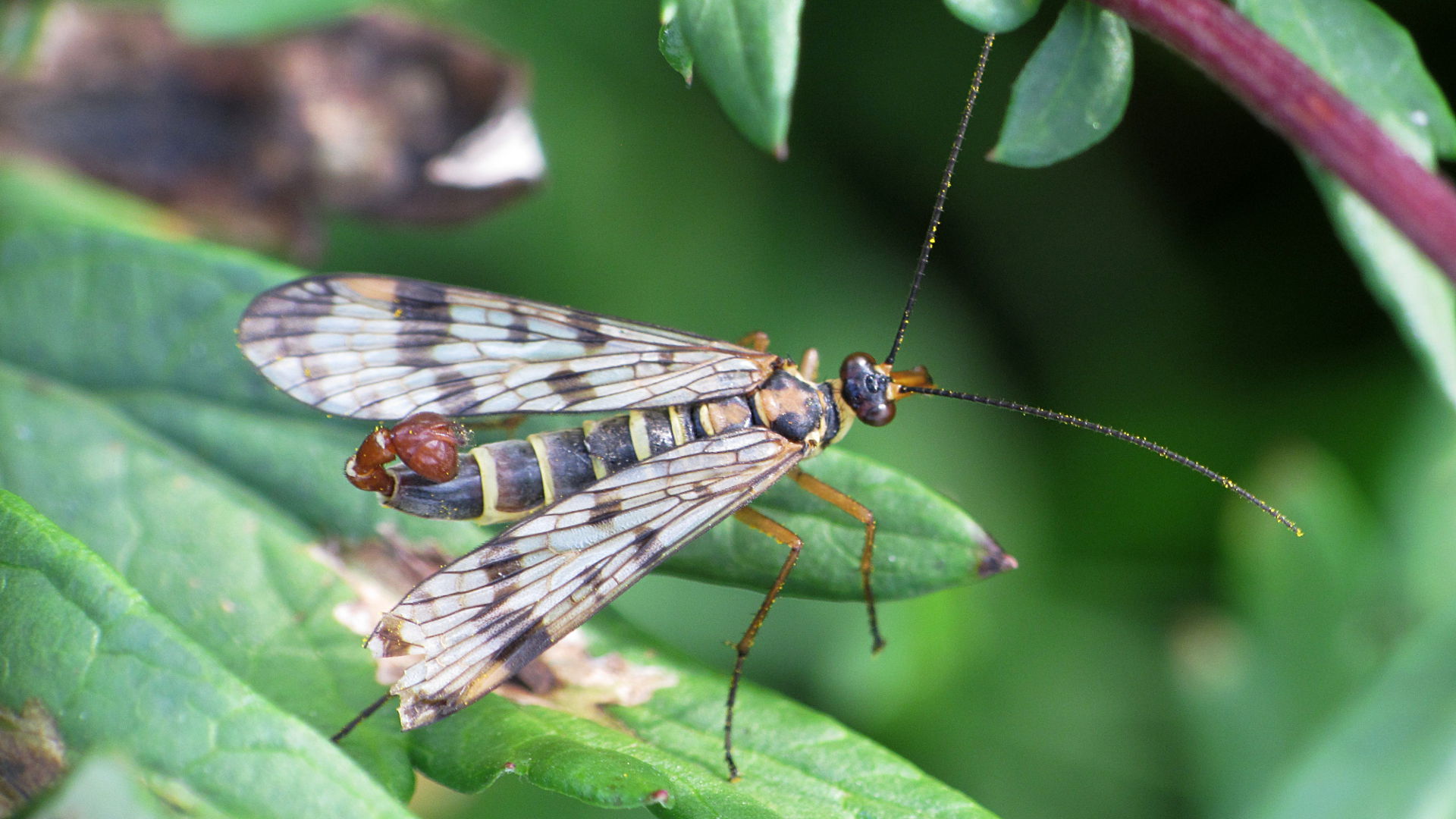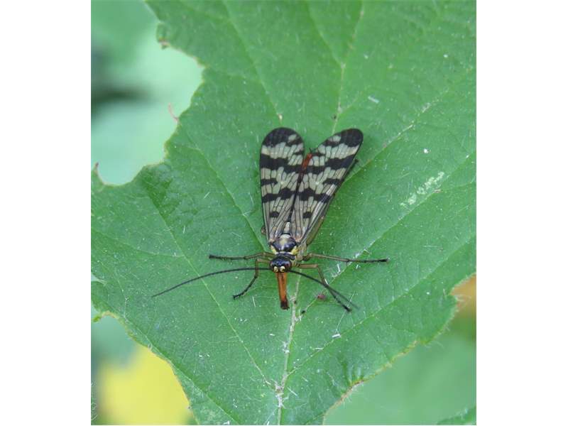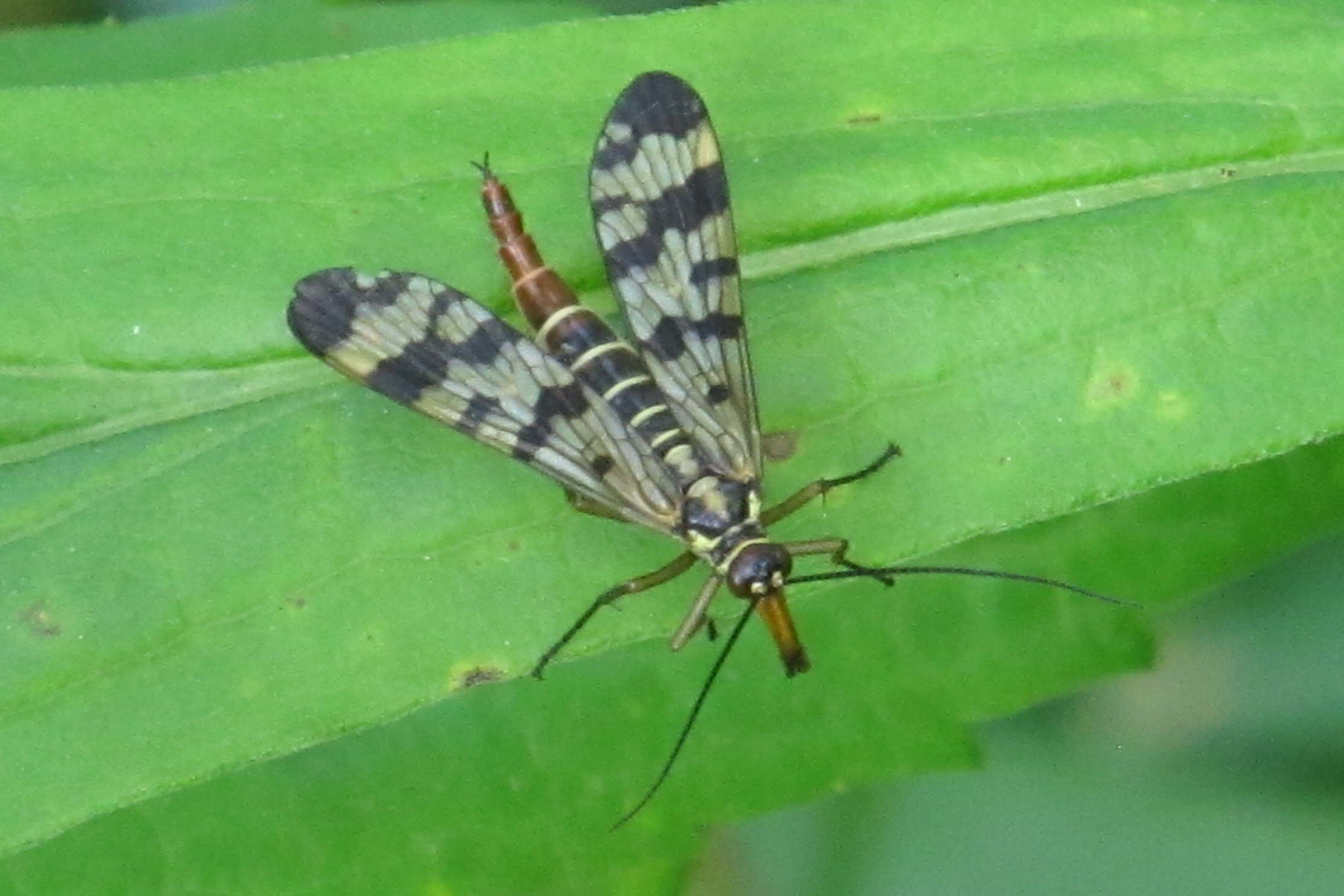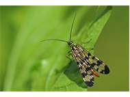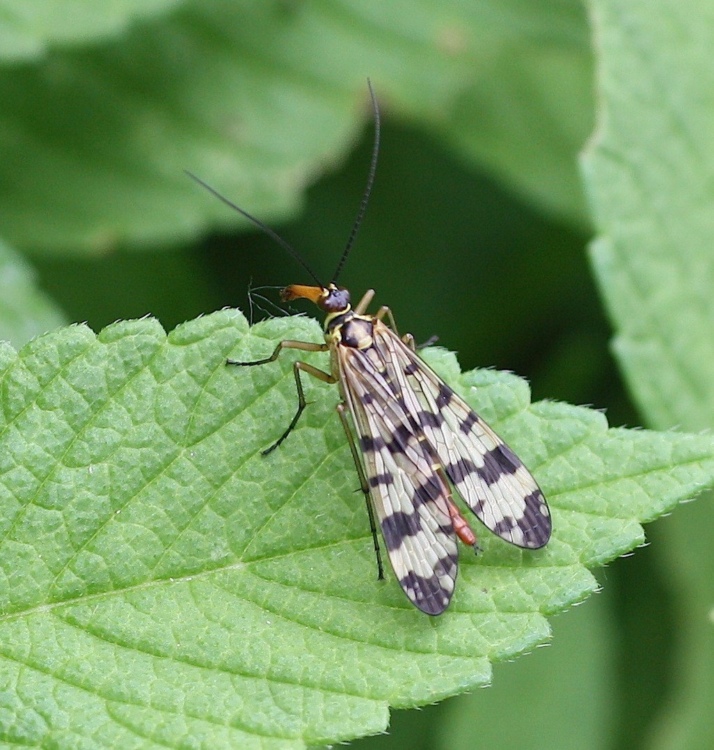 Skorpionsfliegen bei der Kopulation, (09.08.2010 im Tharandter Wald am Triebischsee). Das Männchen hält das Weibchen nicht nur mit dem zangenförmigen Abdominalfortsatz fest, sondern hat seine Flügel noch so über die des Weibchens gelegt, dass ein Fortfliegen unmöglich ist. Die Hochzeit findet an einer toten Raupe (von Gregärparasiten befallen) statt, an denen die Adulten Nahrung aufnehmen