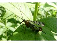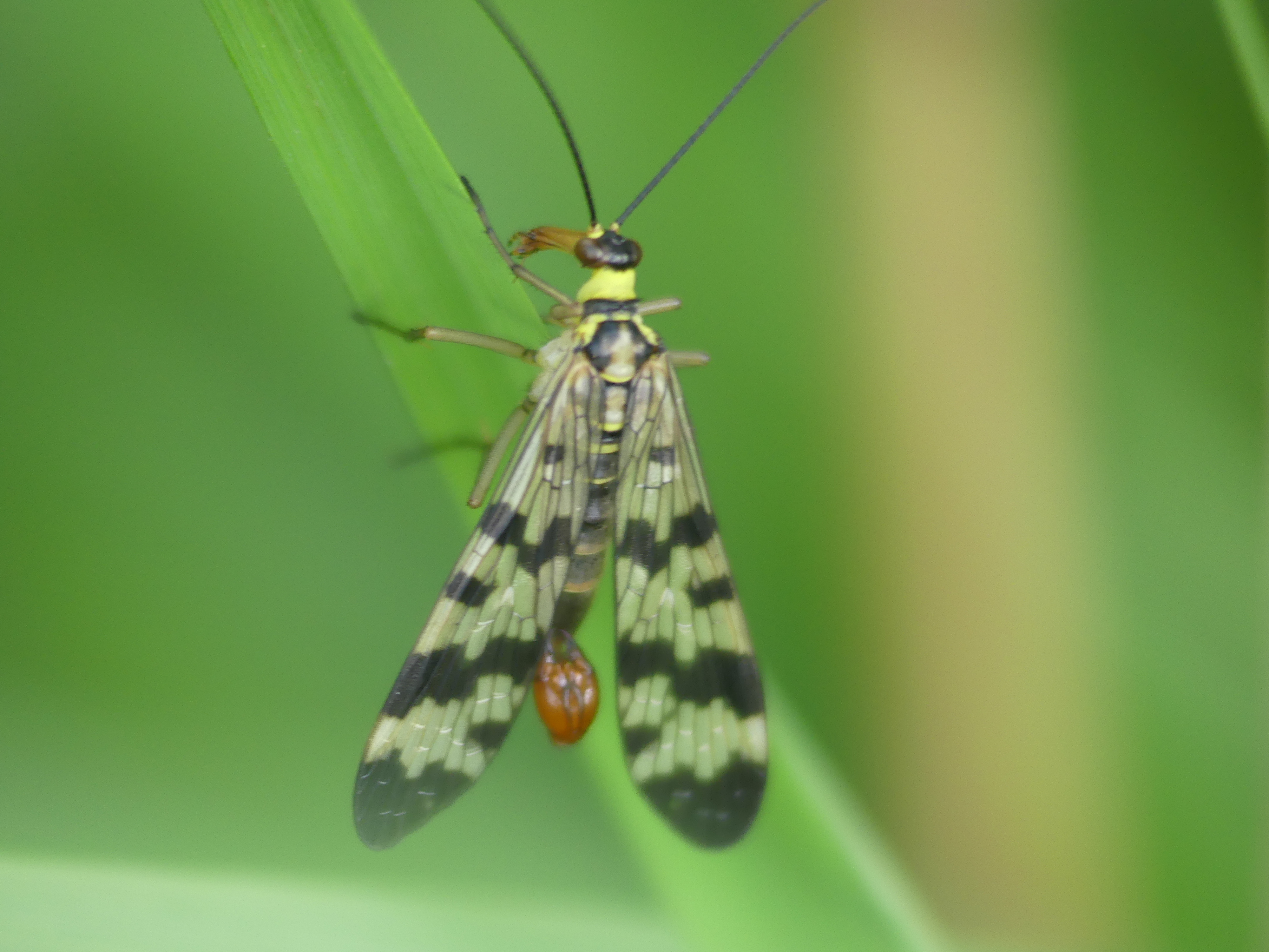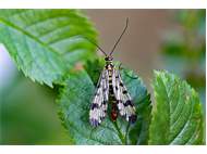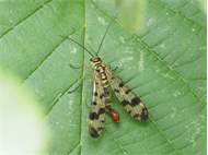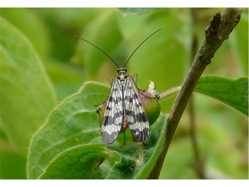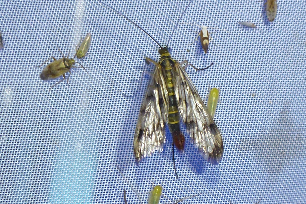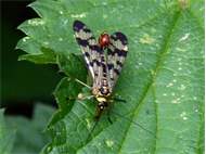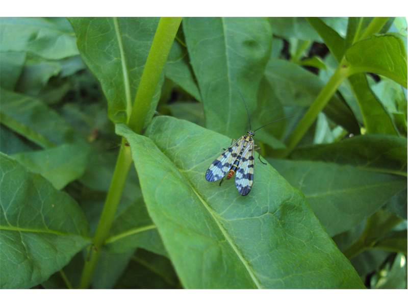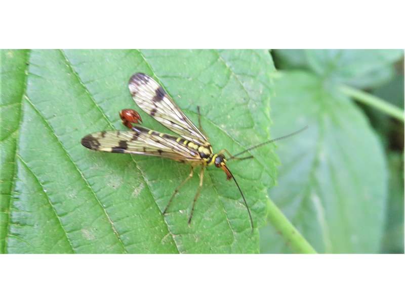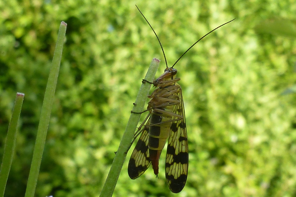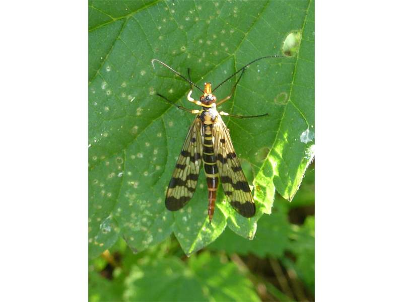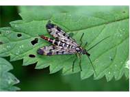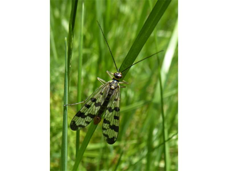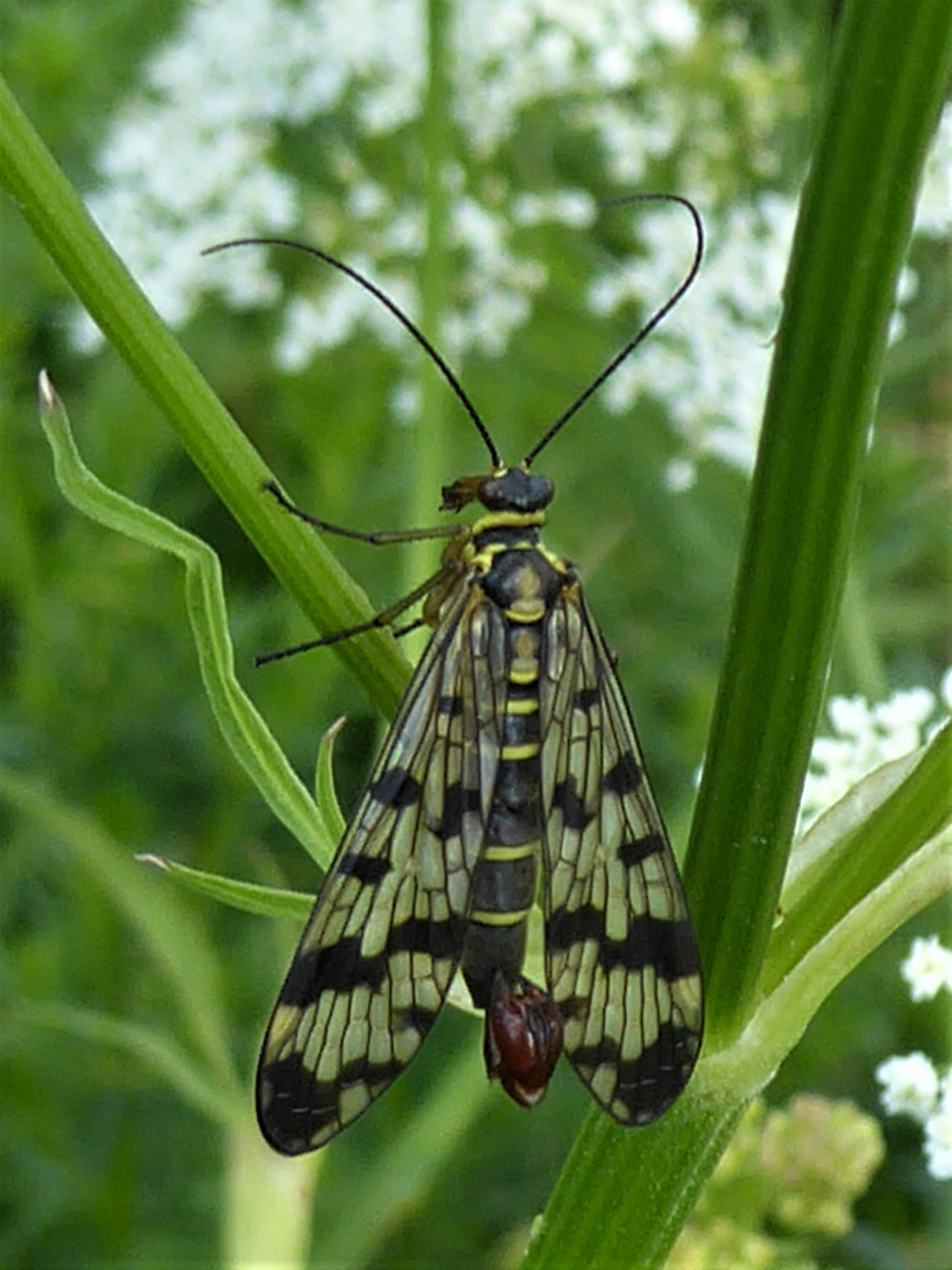 Skorpionsfliegen bei der Kopulation, (09.08.2010 im Tharandter Wald am Triebischsee). Das Männchen hält das Weibchen nicht nur mit dem zangenförmigen Abdominalfortsatz fest, sondern hat seine Flügel noch so über die des Weibchens gelegt, dass ein Fortfliegen unmöglich ist. Die Hochzeit findet an einer toten Raupe (von Gregärparasiten befallen) statt, an denen die Adulten Nahrung aufnehmen