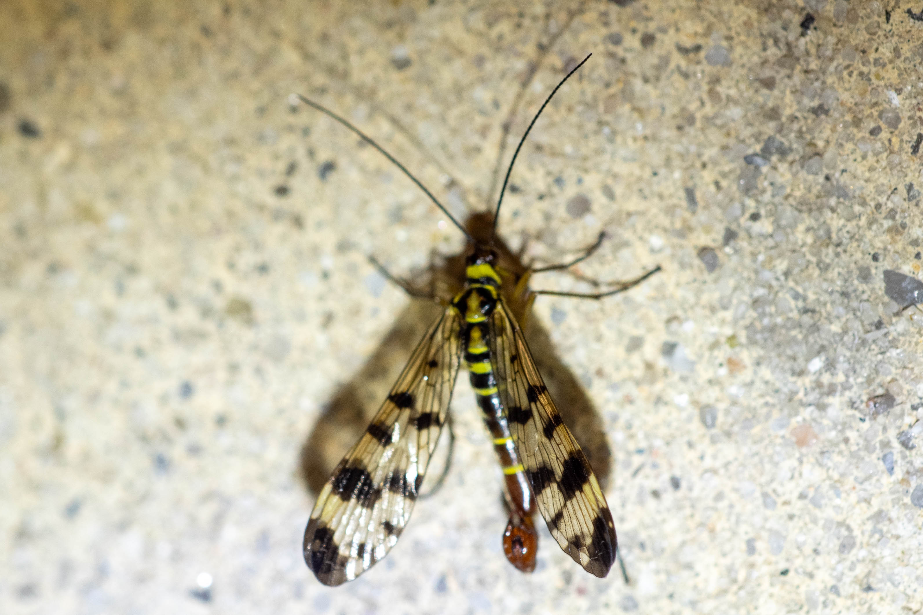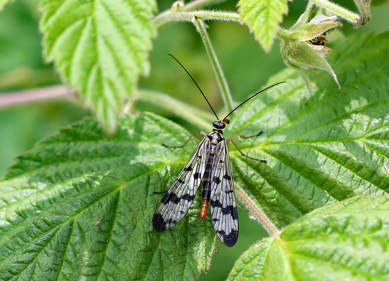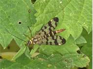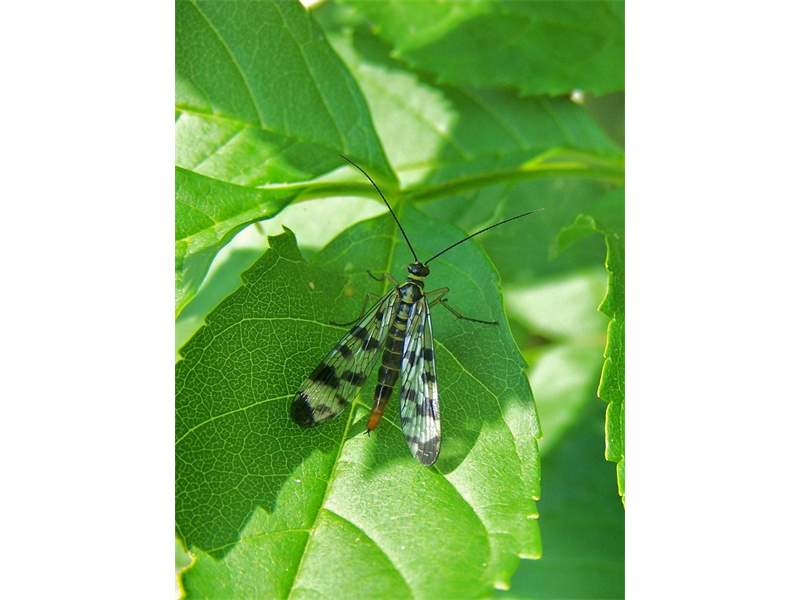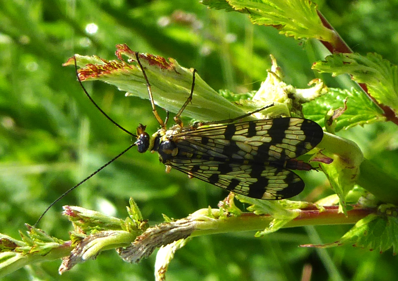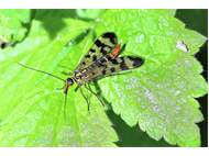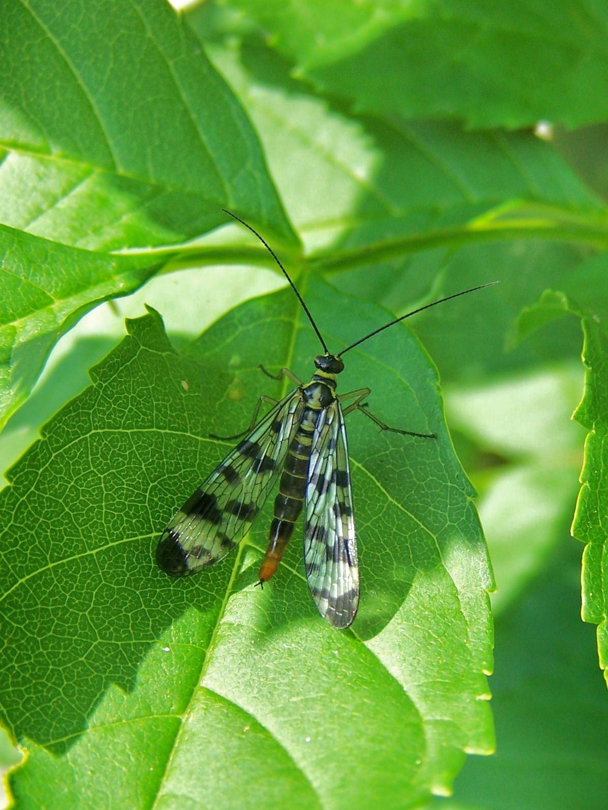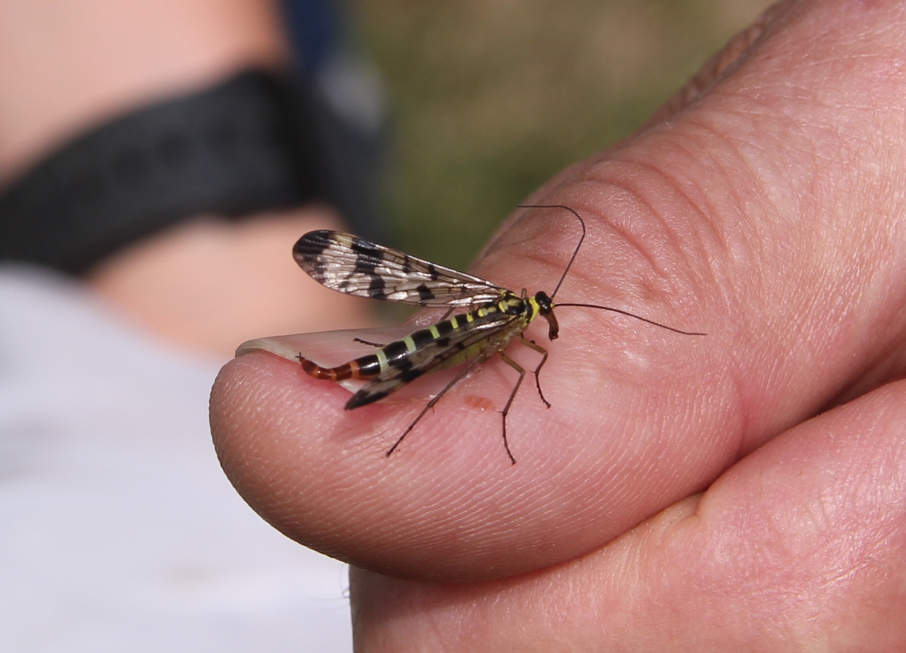 Skorpionsfliegen bei der Kopulation, (09.08.2010 im Tharandter Wald am Triebischsee). Das Männchen hält das Weibchen nicht nur mit dem zangenförmigen Abdominalfortsatz fest, sondern hat seine Flügel noch so über die des Weibchens gelegt, dass ein Fortfliegen unmöglich ist. Die Hochzeit findet an einer toten Raupe (von Gregärparasiten befallen) statt, an denen die Adulten Nahrung aufnehmen