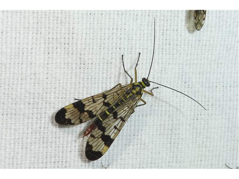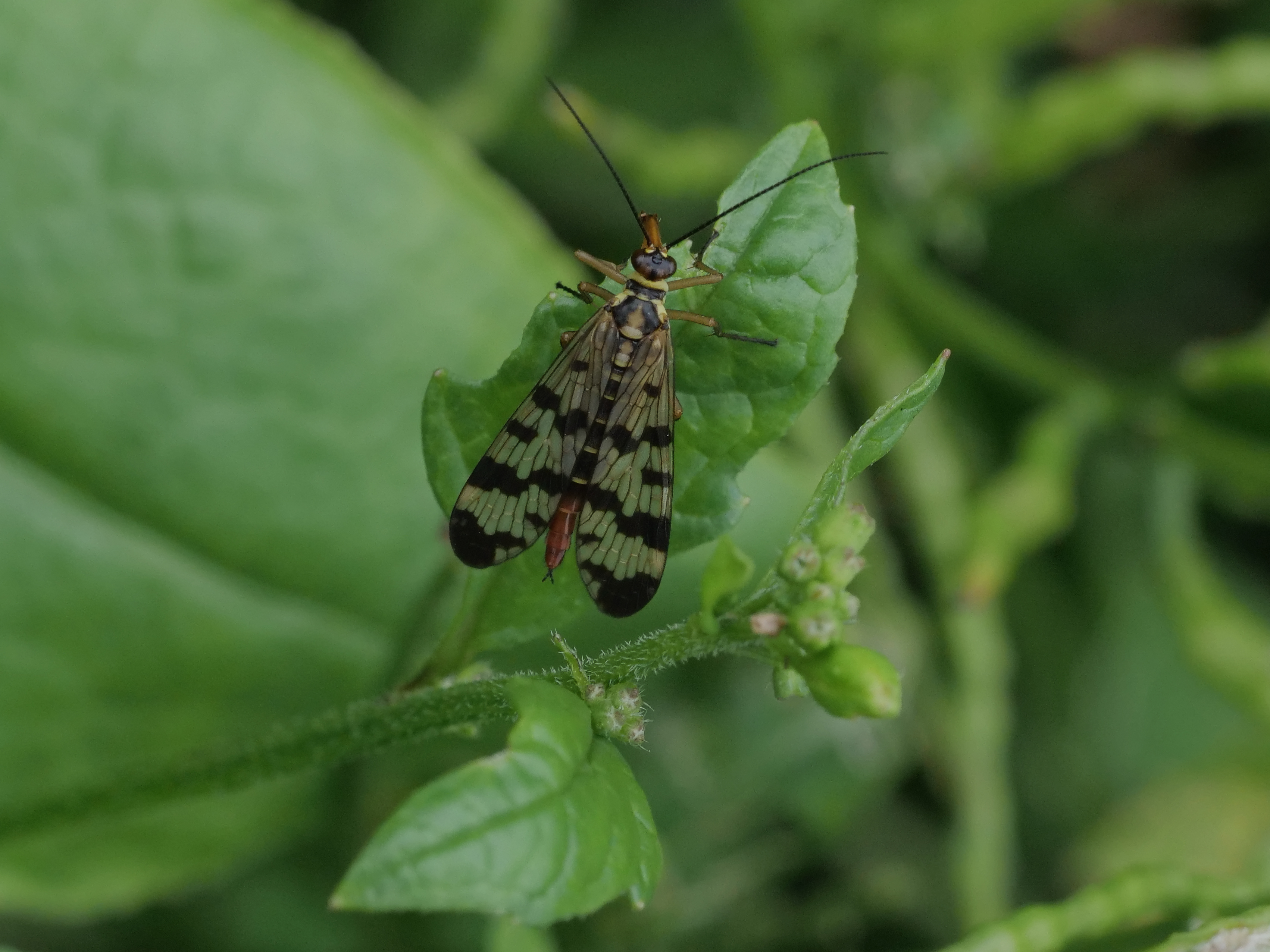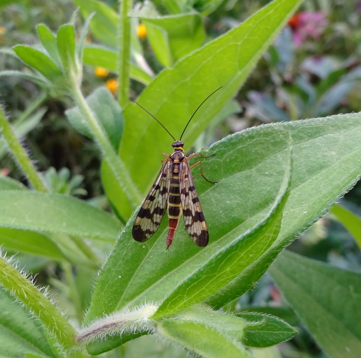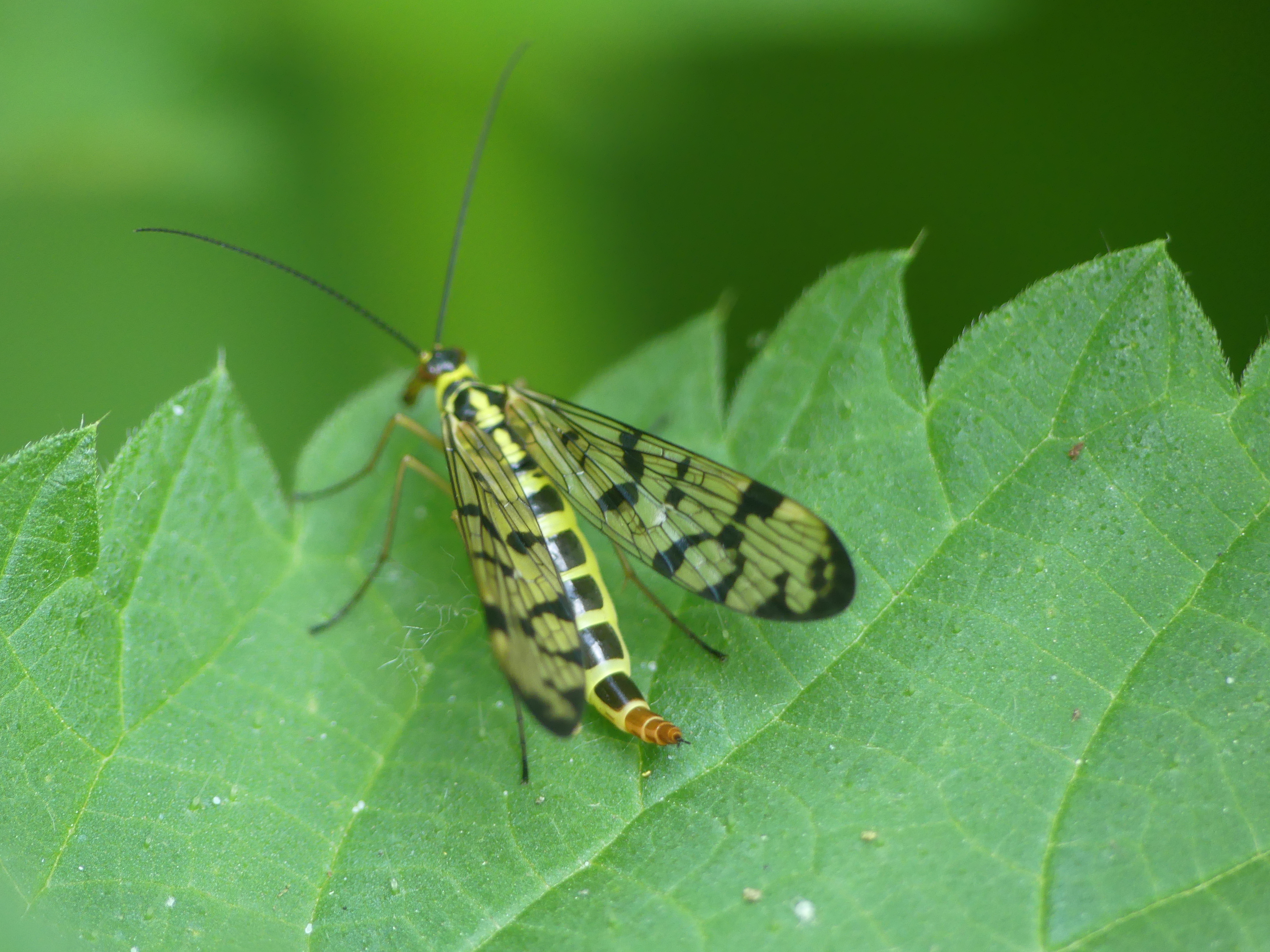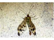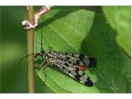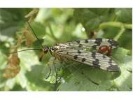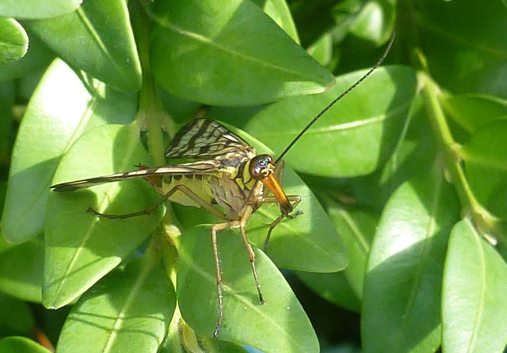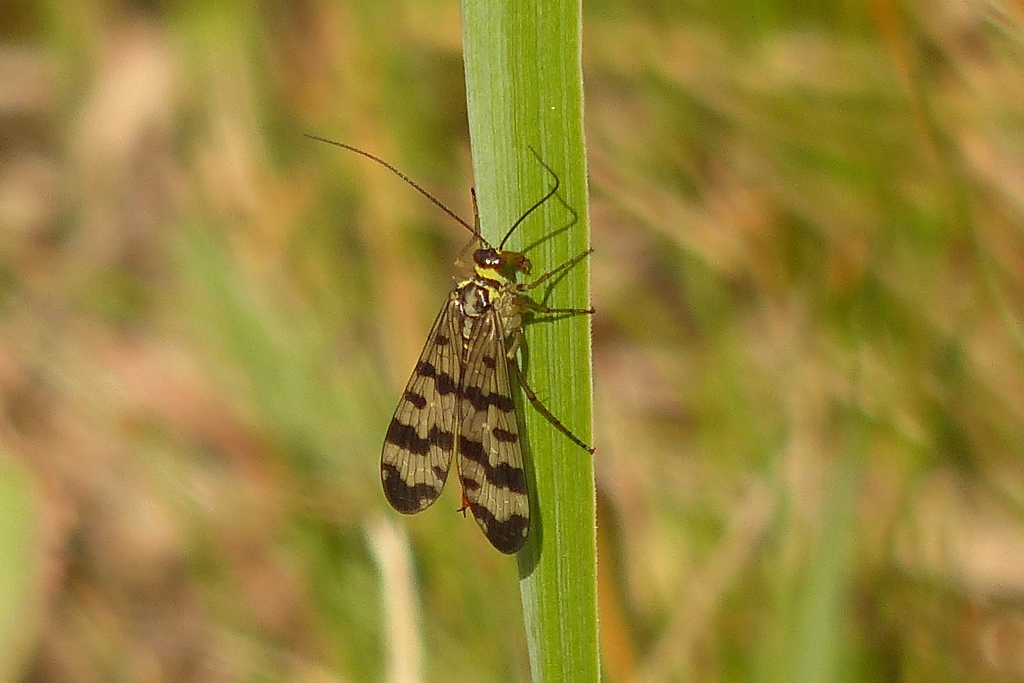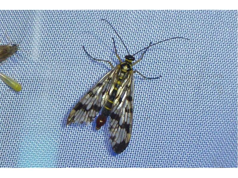 Skorpionsfliegen bei der Kopulation, (09.08.2010 im Tharandter Wald am Triebischsee). Das Männchen hält das Weibchen nicht nur mit dem zangenförmigen Abdominalfortsatz fest, sondern hat seine Flügel noch so über die des Weibchens gelegt, dass ein Fortfliegen unmöglich ist. Die Hochzeit findet an einer toten Raupe (von Gregärparasiten befallen) statt, an denen die Adulten Nahrung aufnehmen