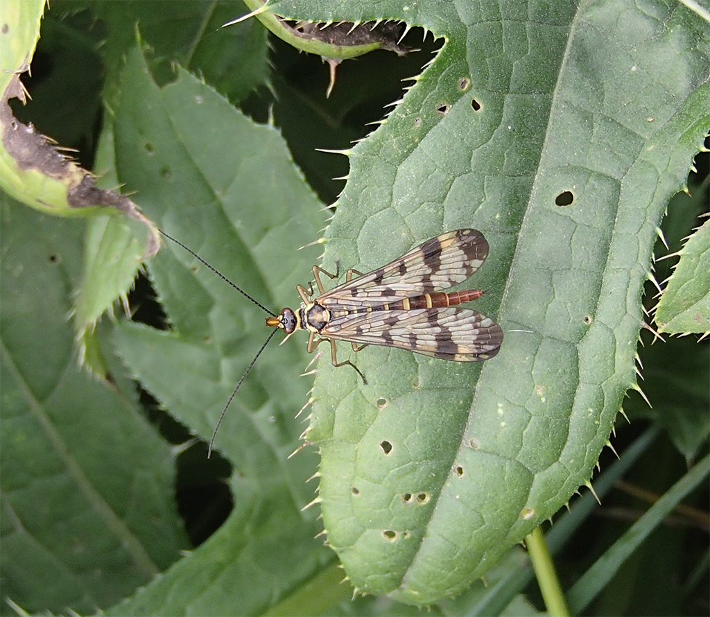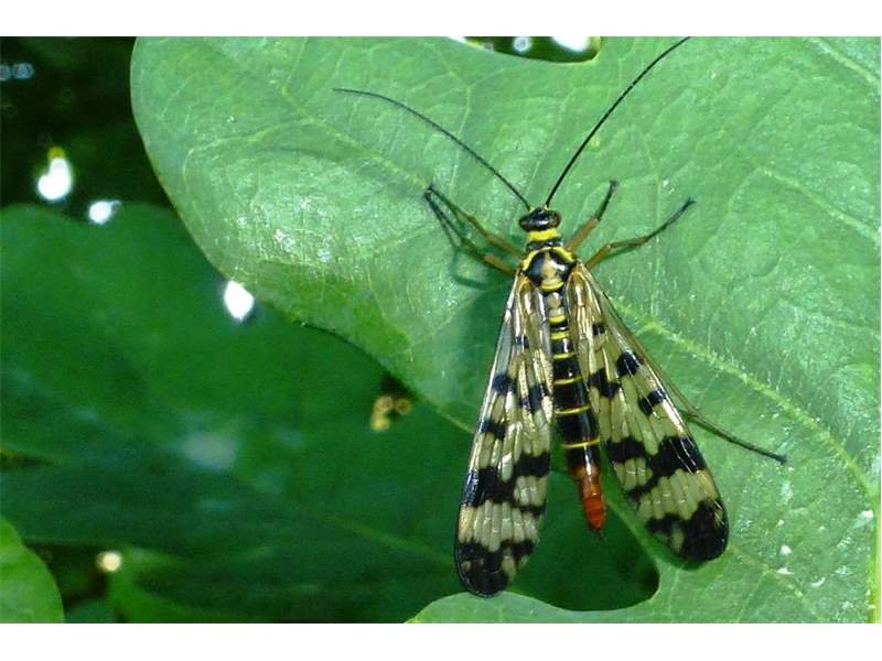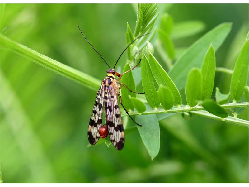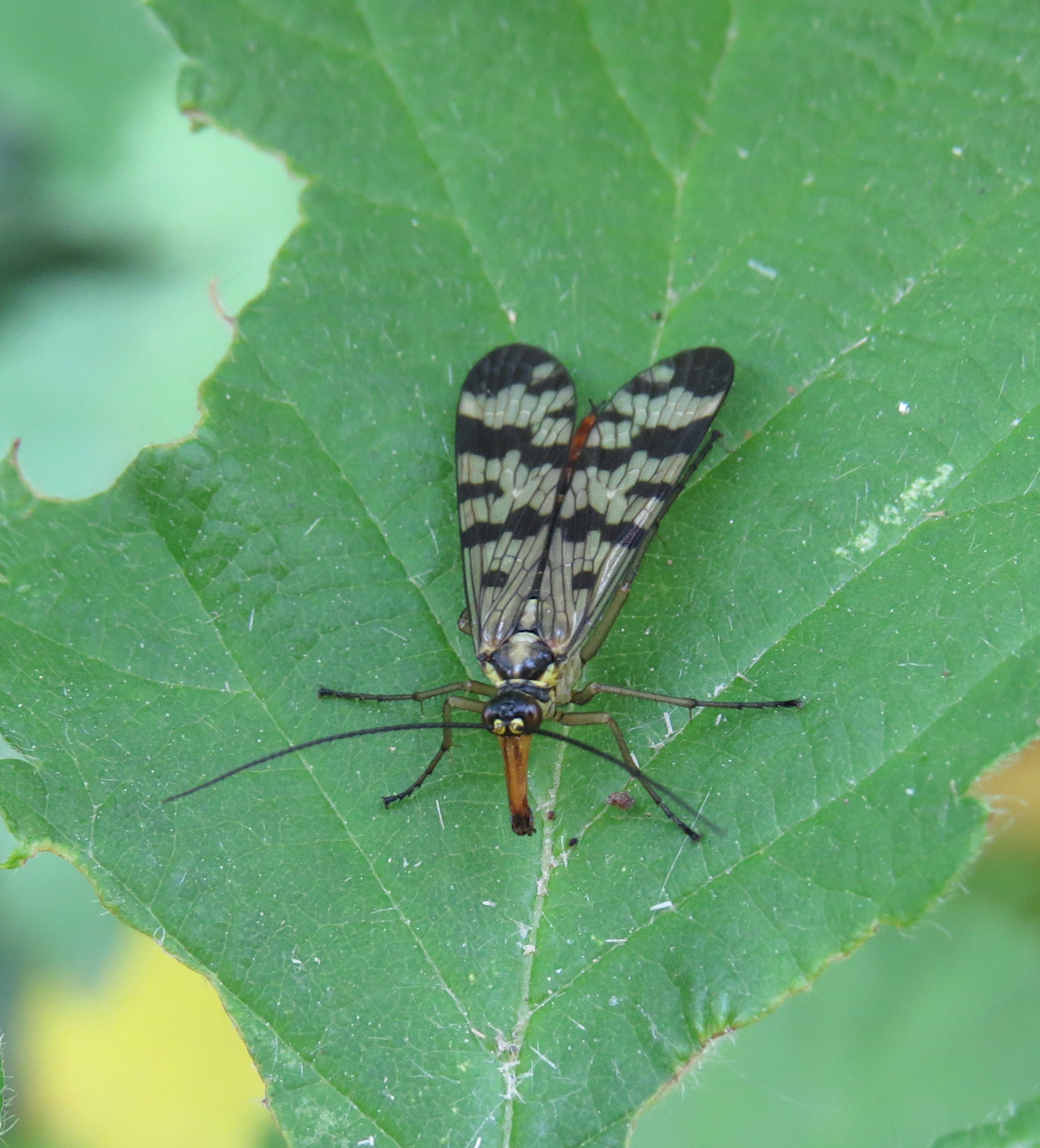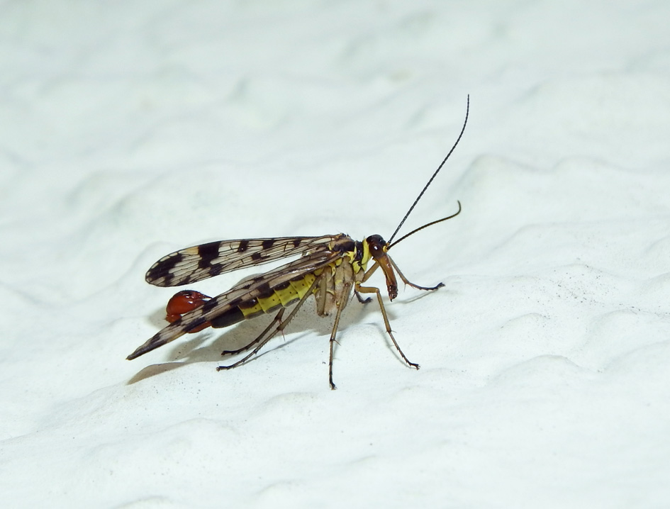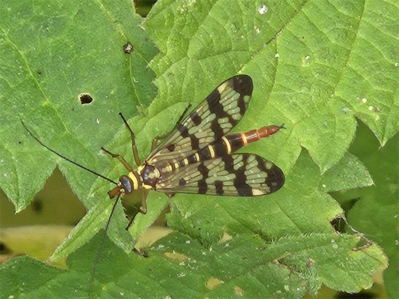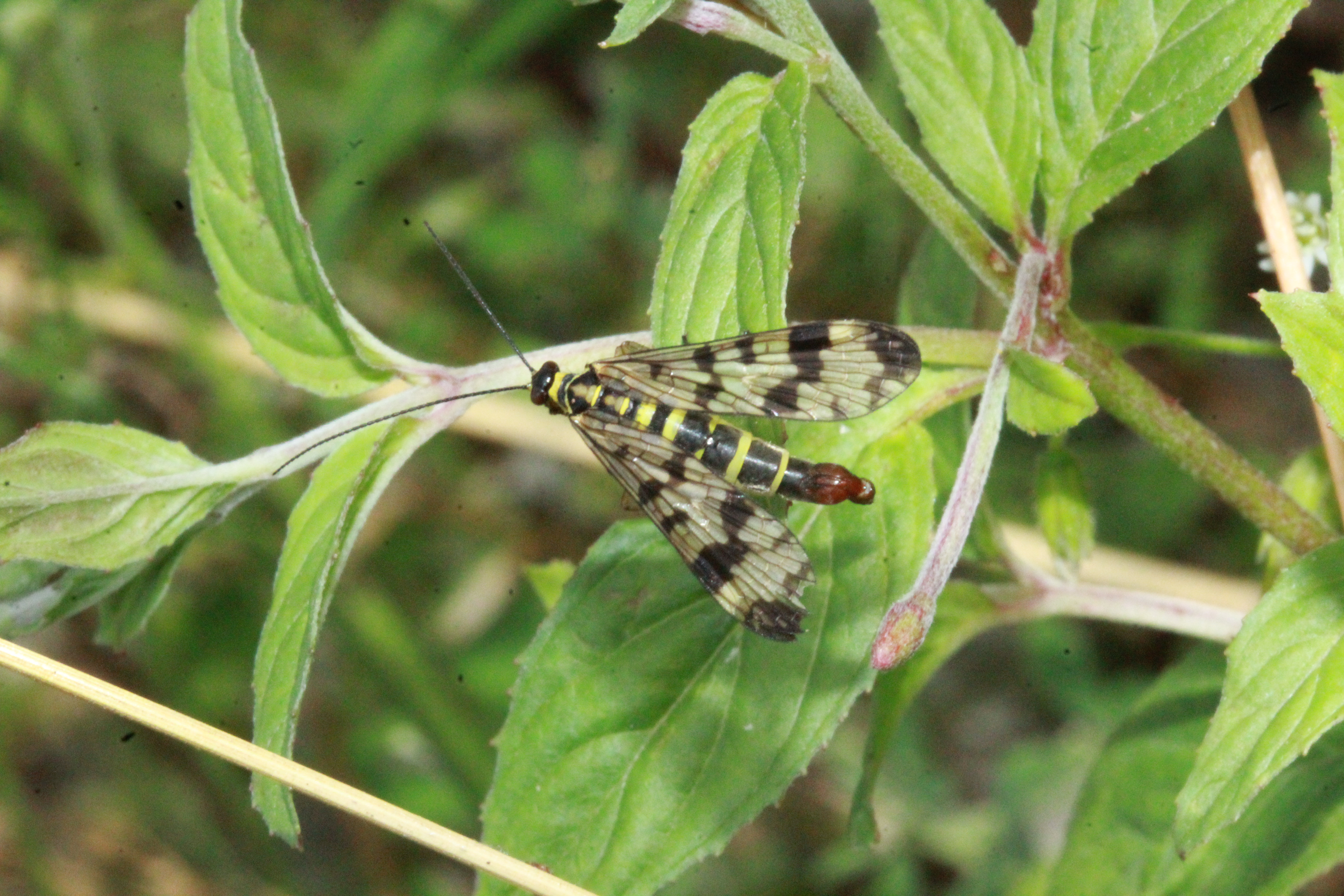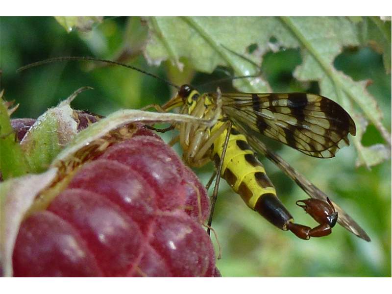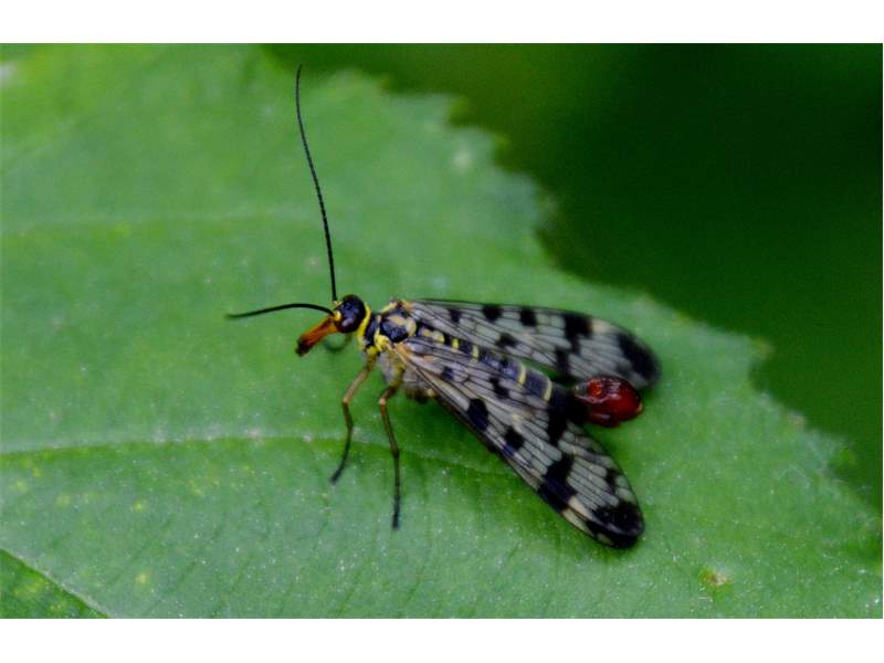 Skorpionsfliegen bei der Kopulation, (09.08.2010 im Tharandter Wald am Triebischsee). Das Männchen hält das Weibchen nicht nur mit dem zangenförmigen Abdominalfortsatz fest, sondern hat seine Flügel noch so über die des Weibchens gelegt, dass ein Fortfliegen unmöglich ist. Die Hochzeit findet an einer toten Raupe (von Gregärparasiten befallen) statt, an denen die Adulten Nahrung aufnehmen