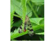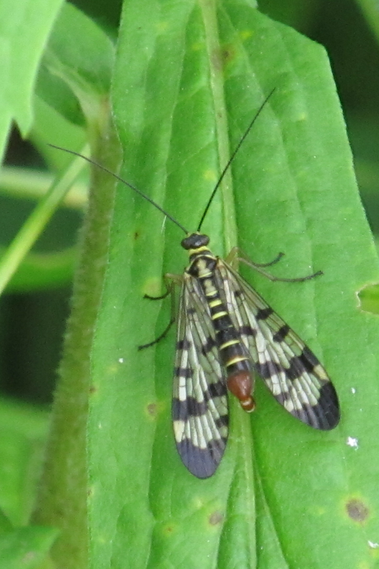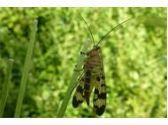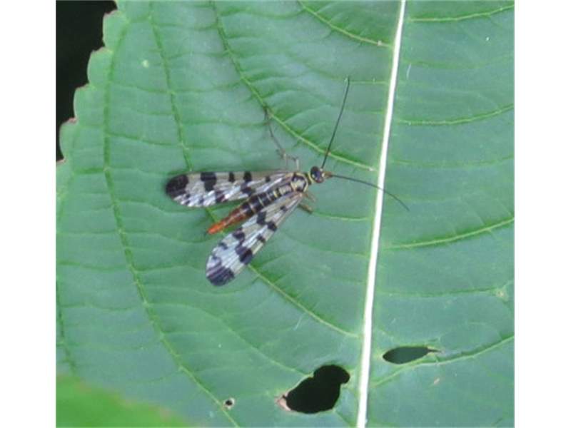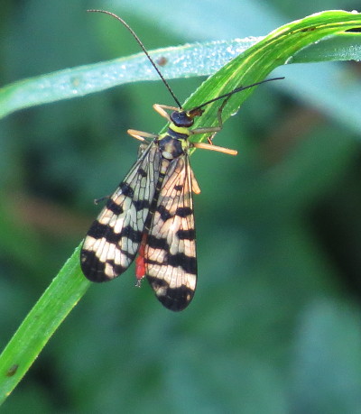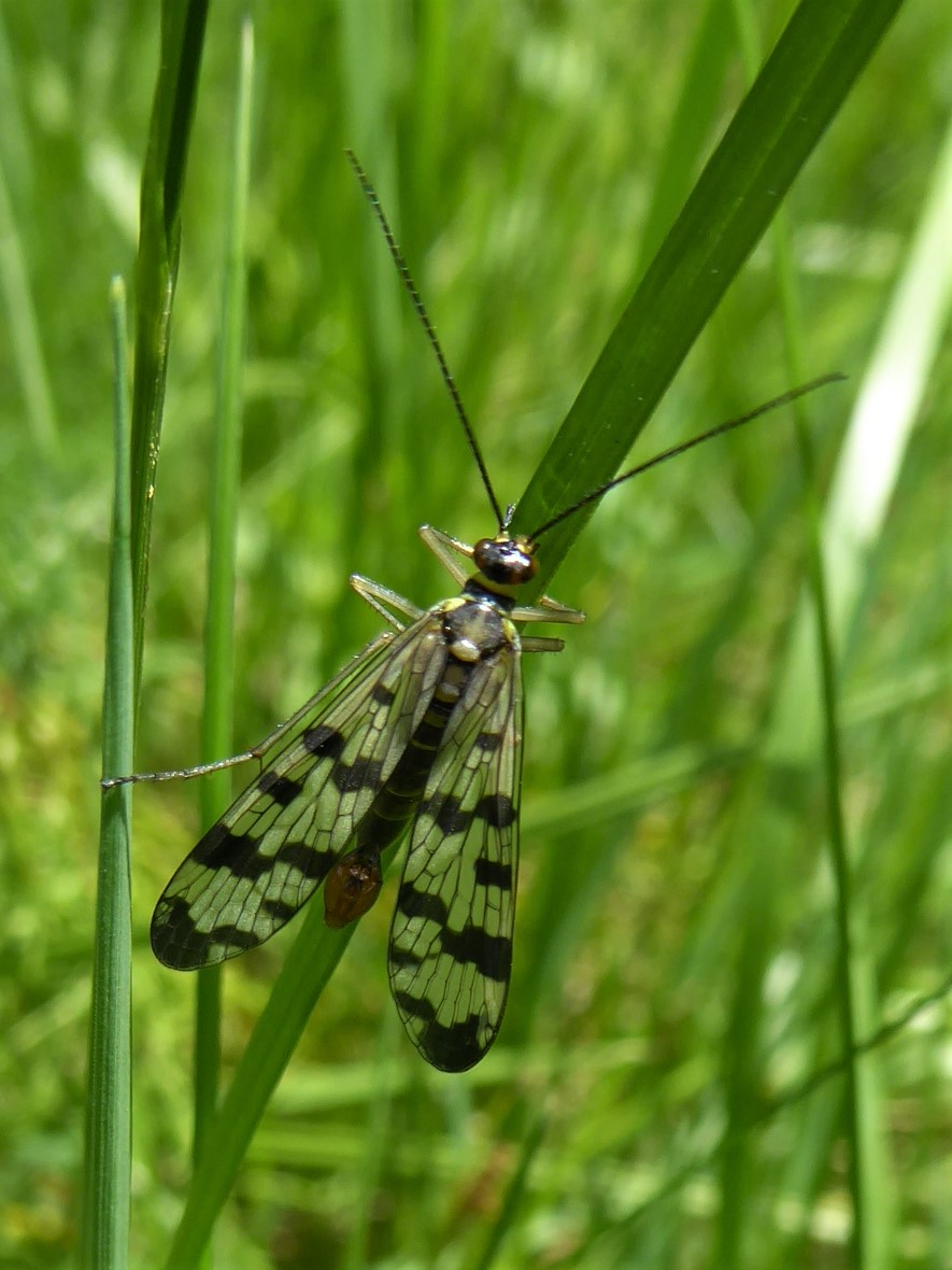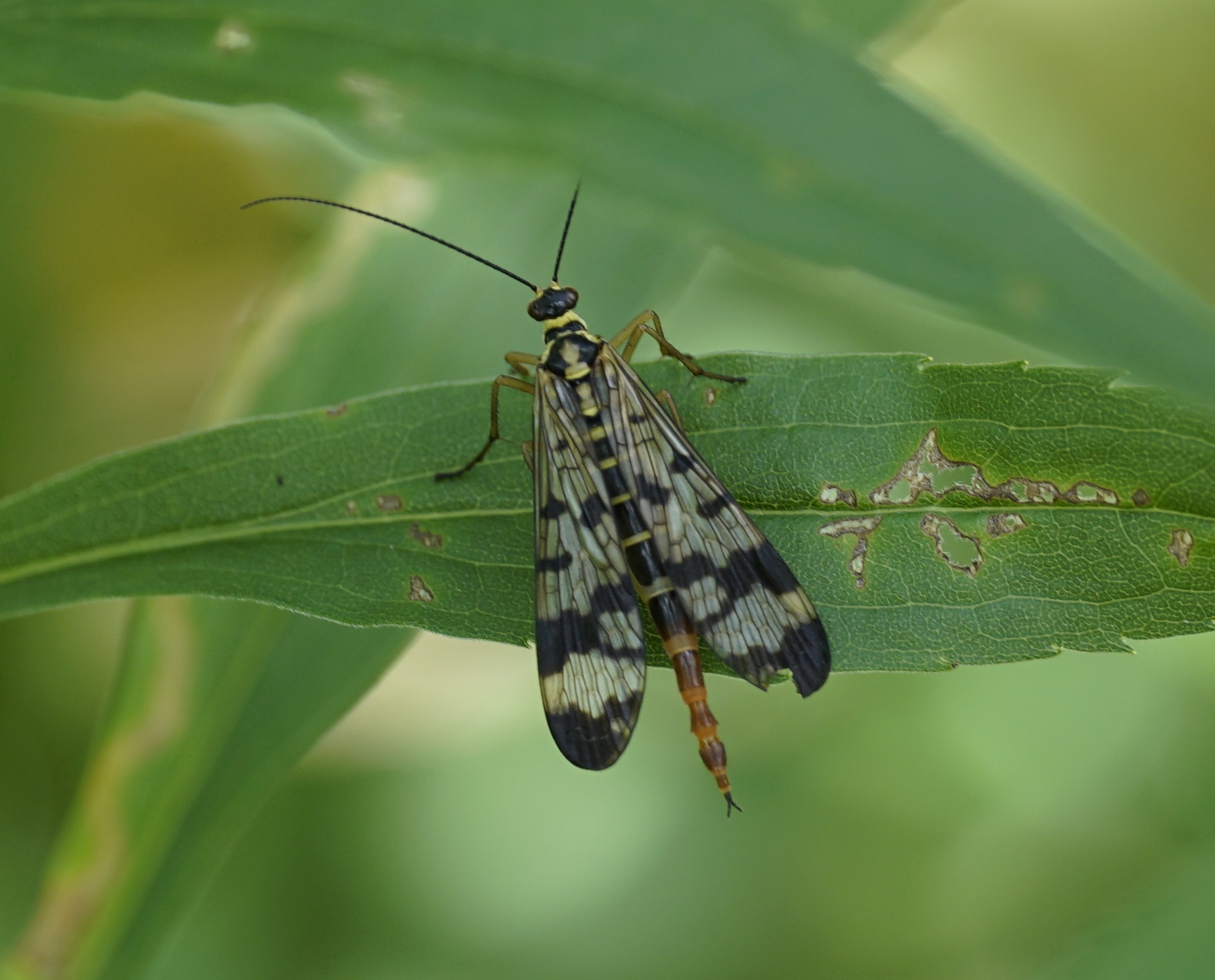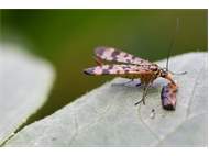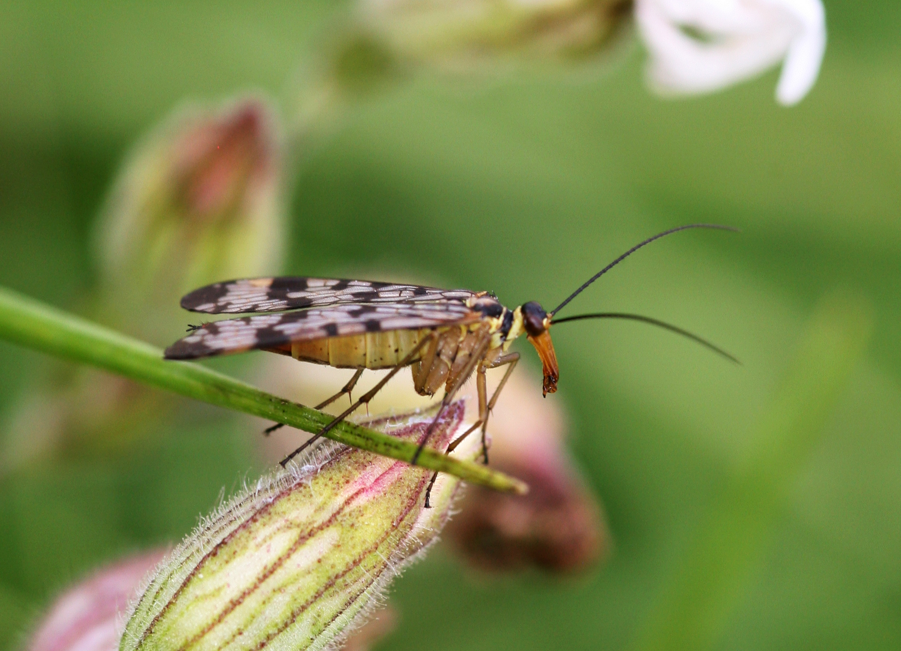 Skorpionsfliegen bei der Kopulation, (09.08.2010 im Tharandter Wald am Triebischsee). Das Männchen hält das Weibchen nicht nur mit dem zangenförmigen Abdominalfortsatz fest, sondern hat seine Flügel noch so über die des Weibchens gelegt, dass ein Fortfliegen unmöglich ist. Die Hochzeit findet an einer toten Raupe (von Gregärparasiten befallen) statt, an denen die Adulten Nahrung aufnehmen