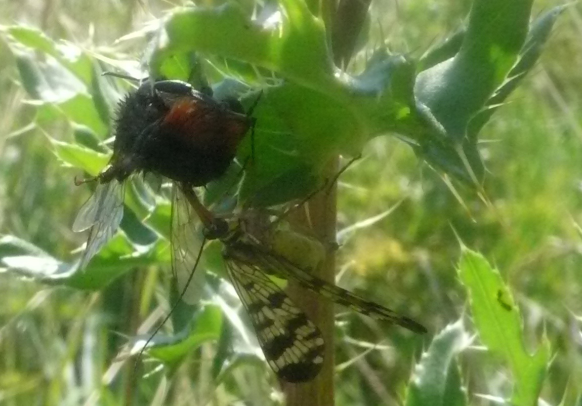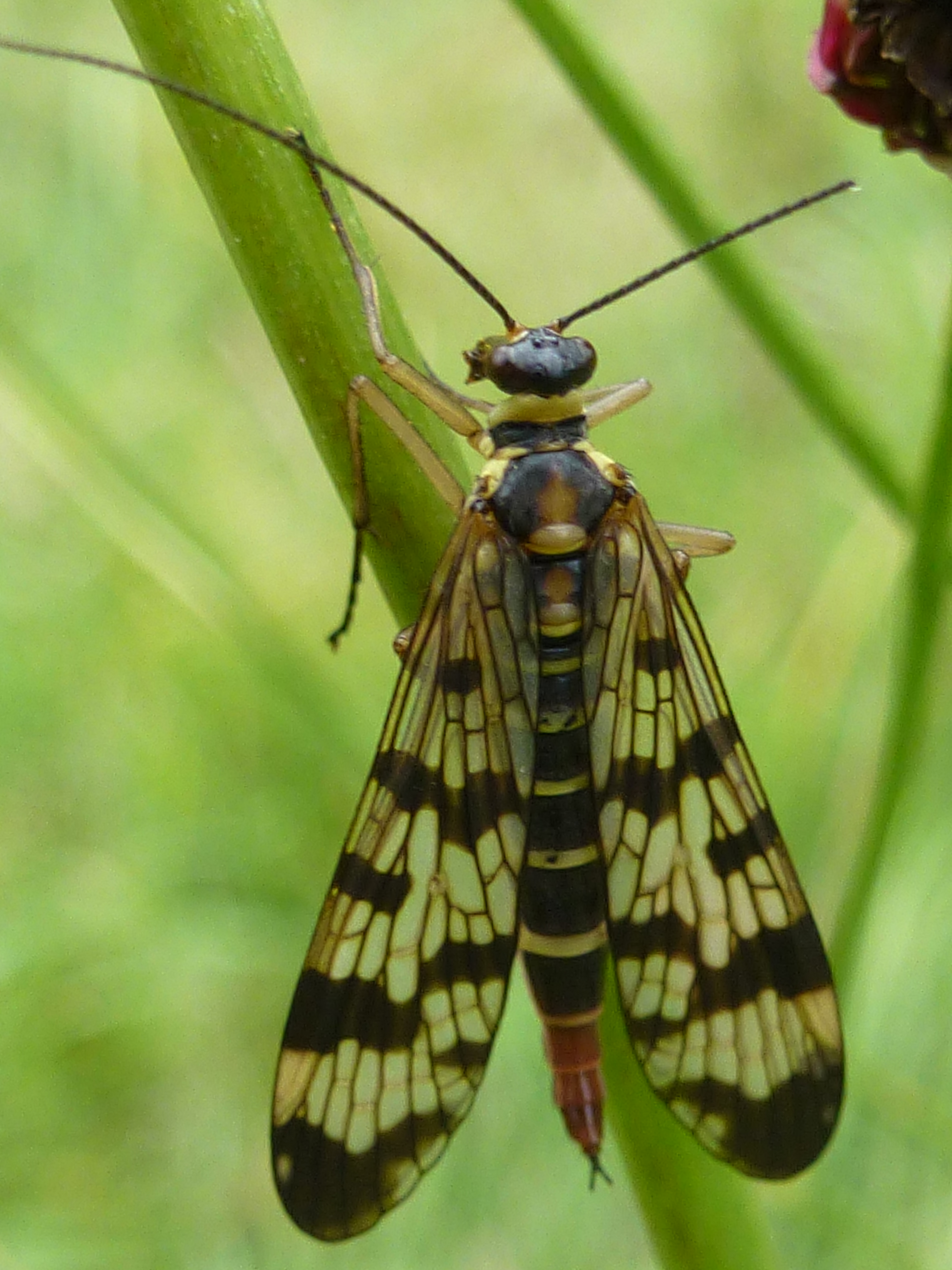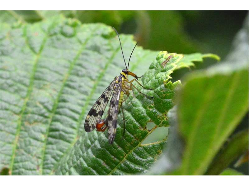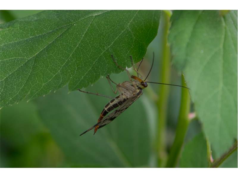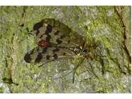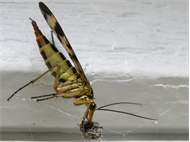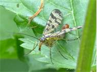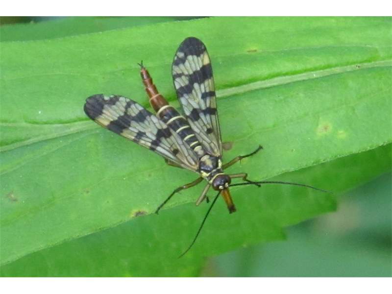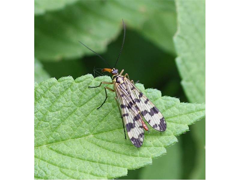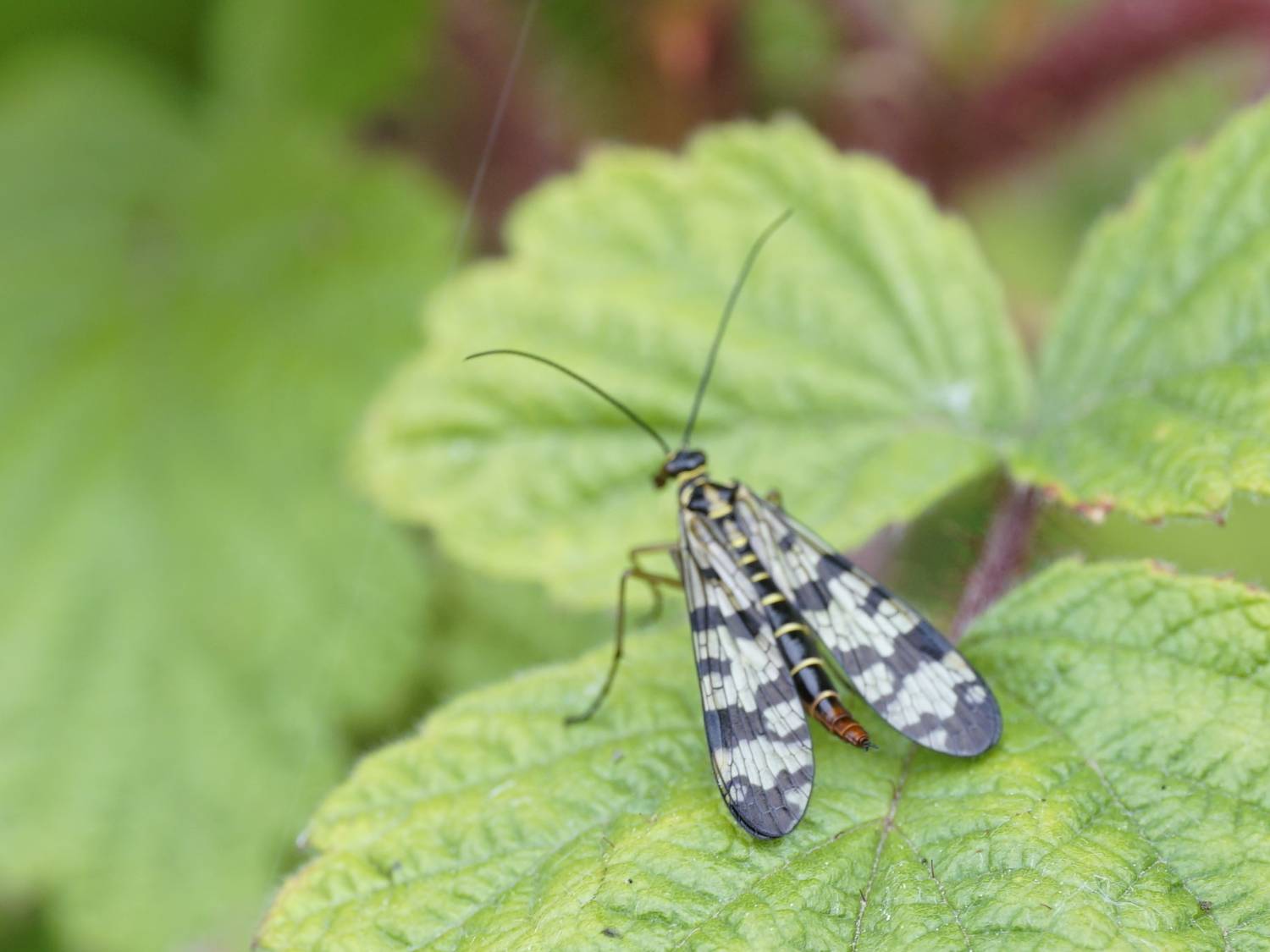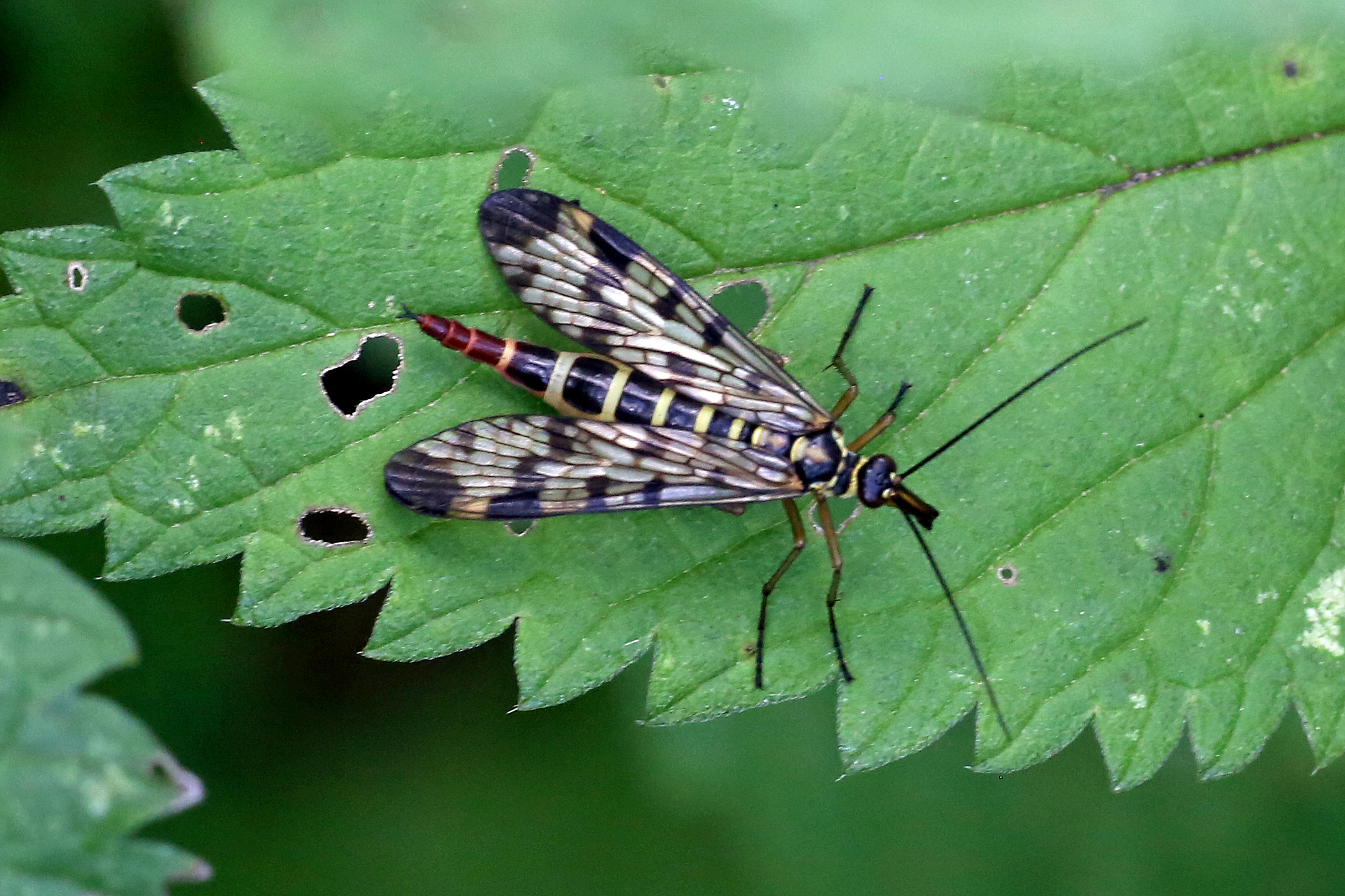 Skorpionsfliegen bei der Kopulation, (09.08.2010 im Tharandter Wald am Triebischsee). Das Männchen hält das Weibchen nicht nur mit dem zangenförmigen Abdominalfortsatz fest, sondern hat seine Flügel noch so über die des Weibchens gelegt, dass ein Fortfliegen unmöglich ist. Die Hochzeit findet an einer toten Raupe (von Gregärparasiten befallen) statt, an denen die Adulten Nahrung aufnehmen