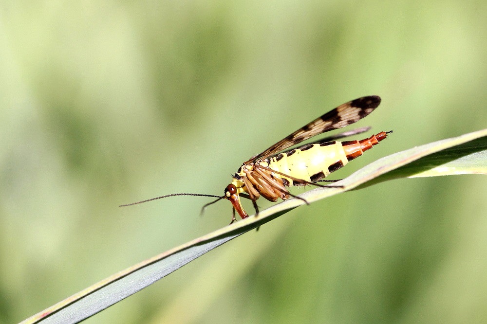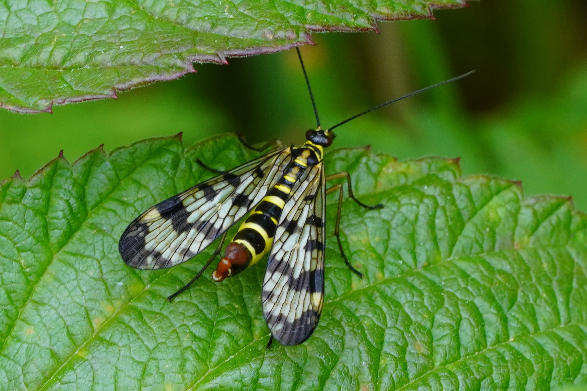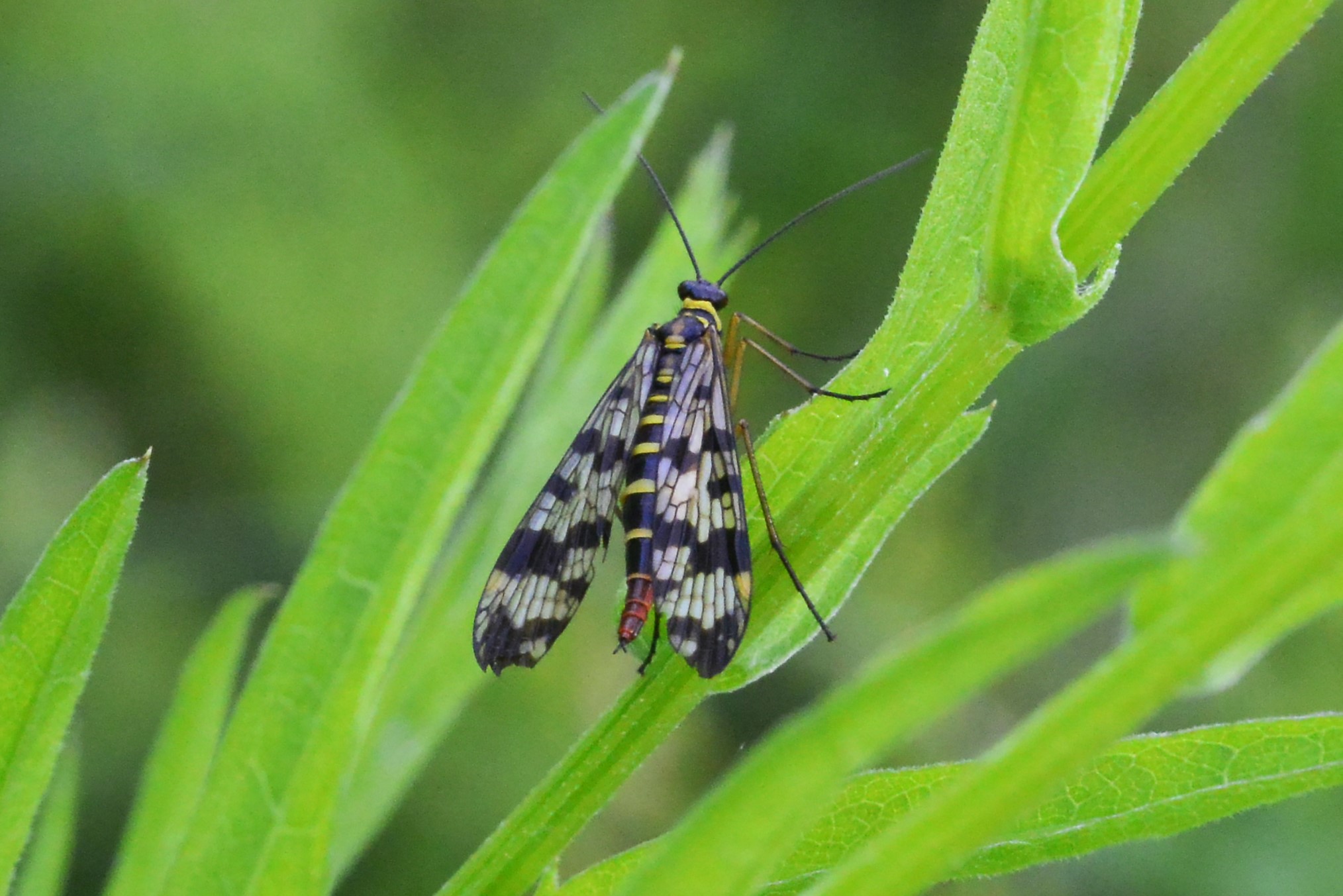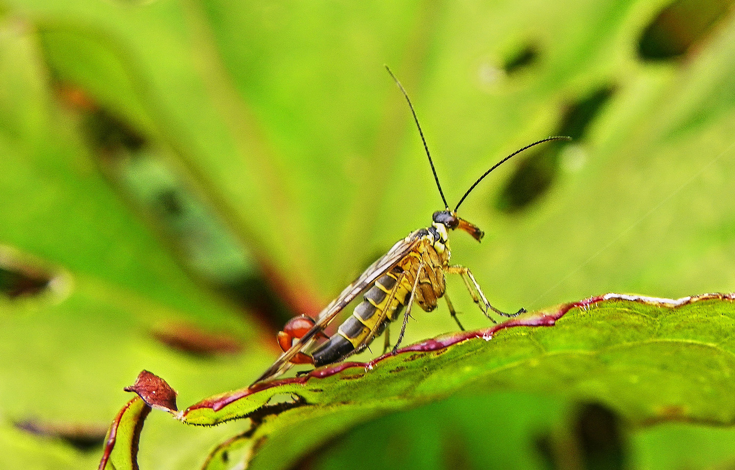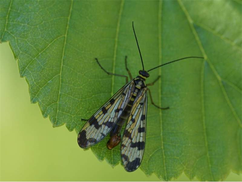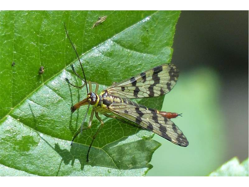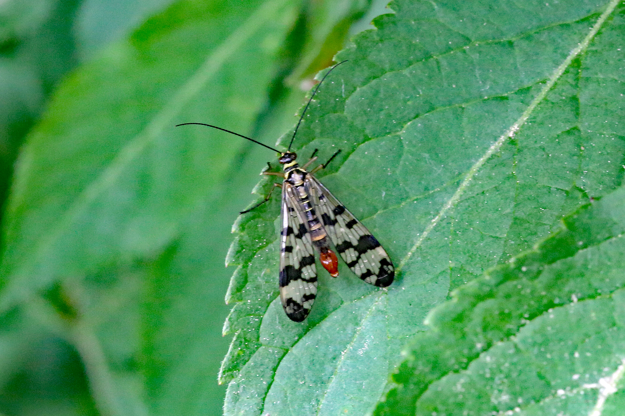 Skorpionsfliegen bei der Kopulation, (09.08.2010 im Tharandter Wald am Triebischsee). Das Männchen hält das Weibchen nicht nur mit dem zangenförmigen Abdominalfortsatz fest, sondern hat seine Flügel noch so über die des Weibchens gelegt, dass ein Fortfliegen unmöglich ist. Die Hochzeit findet an einer toten Raupe (von Gregärparasiten befallen) statt, an denen die Adulten Nahrung aufnehmen