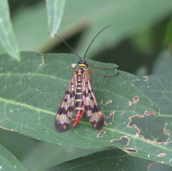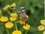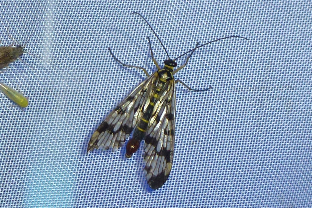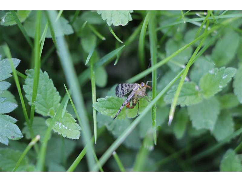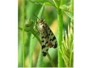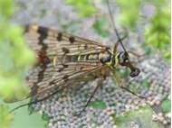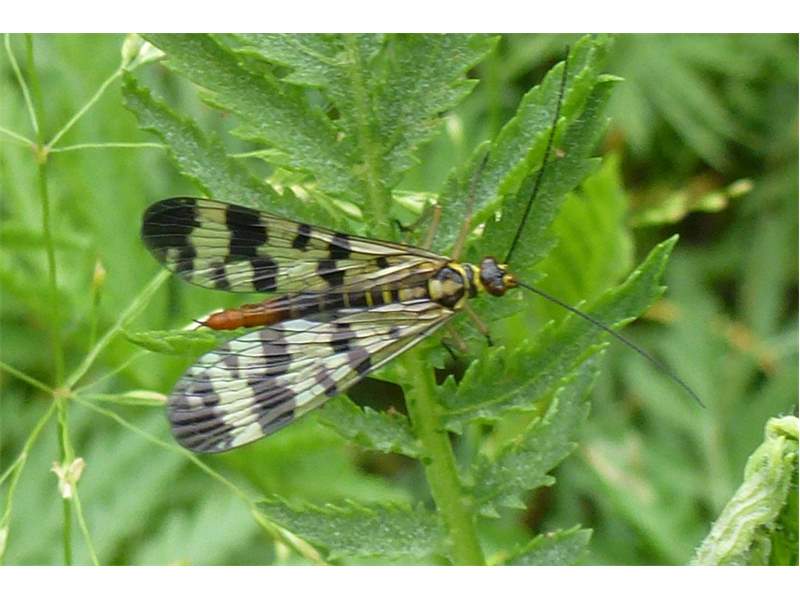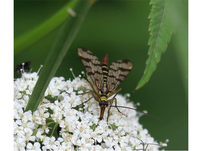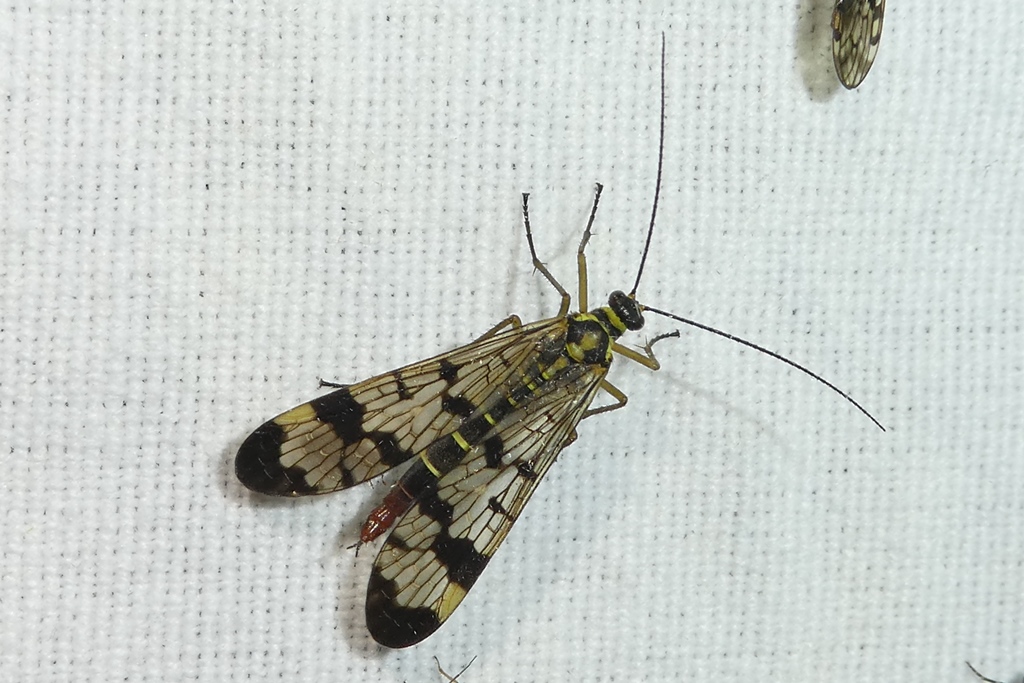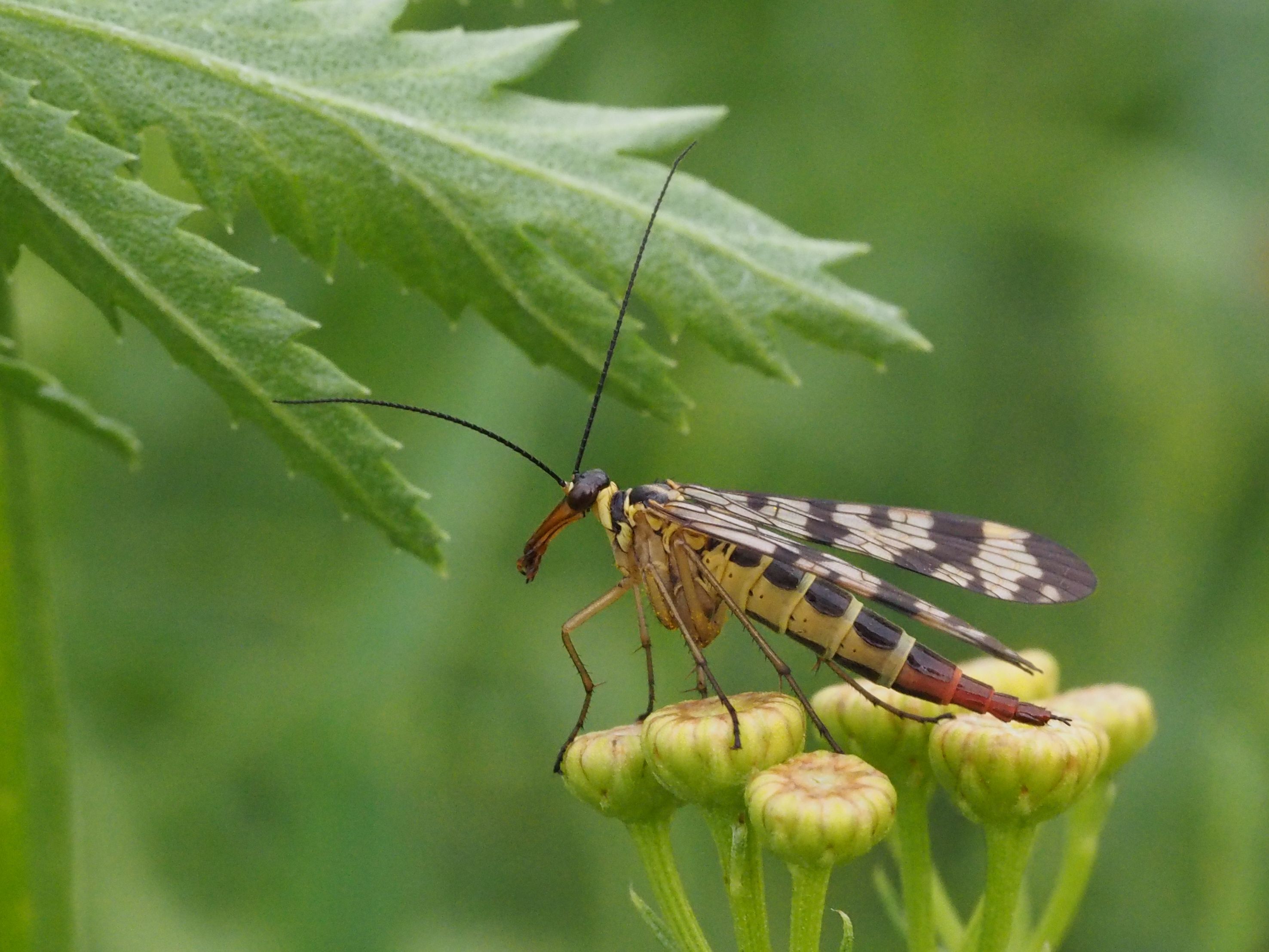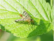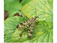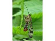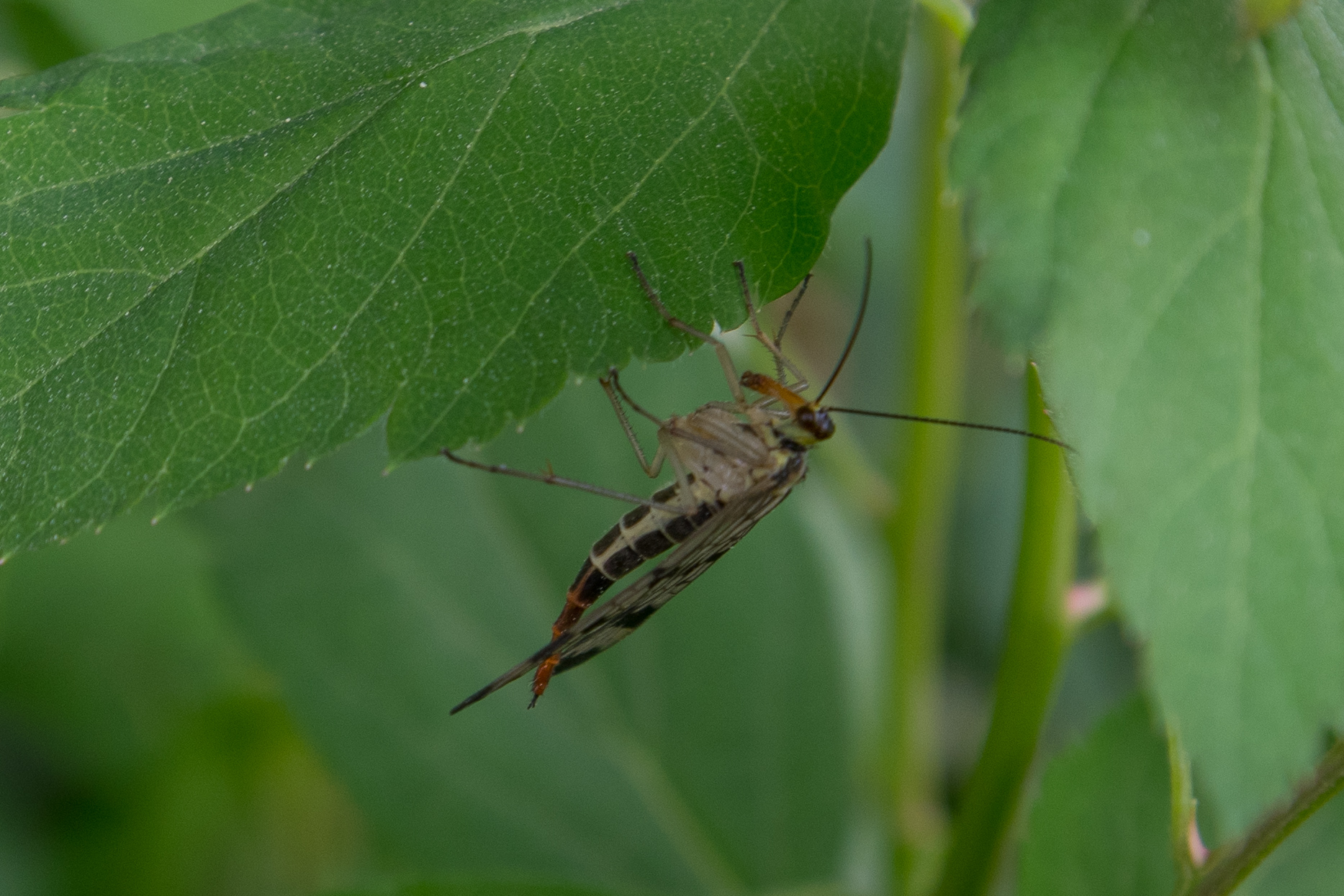 Skorpionsfliegen bei der Kopulation, (09.08.2010 im Tharandter Wald am Triebischsee). Das Männchen hält das Weibchen nicht nur mit dem zangenförmigen Abdominalfortsatz fest, sondern hat seine Flügel noch so über die des Weibchens gelegt, dass ein Fortfliegen unmöglich ist. Die Hochzeit findet an einer toten Raupe (von Gregärparasiten befallen) statt, an denen die Adulten Nahrung aufnehmen