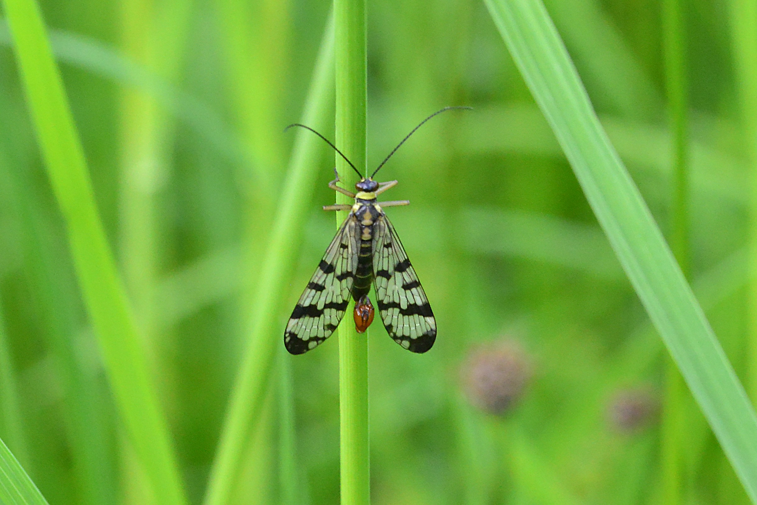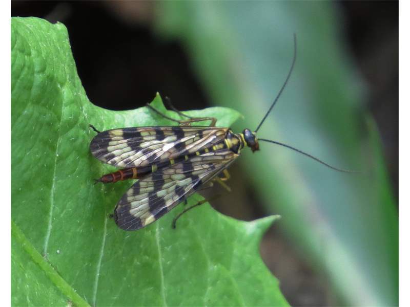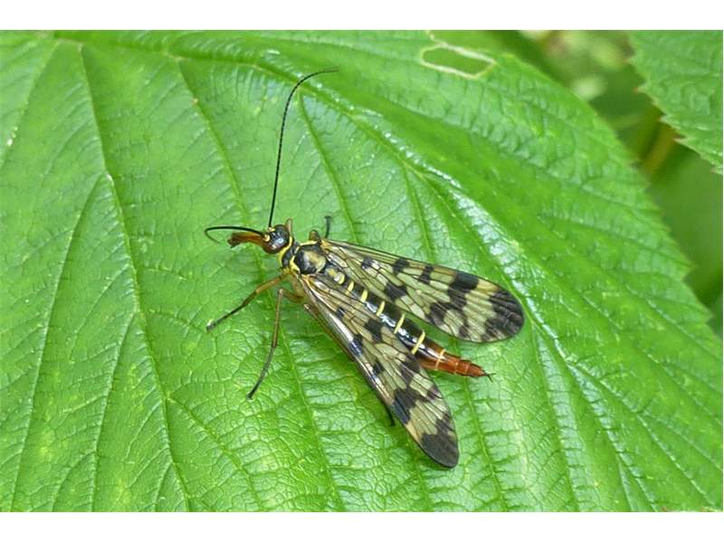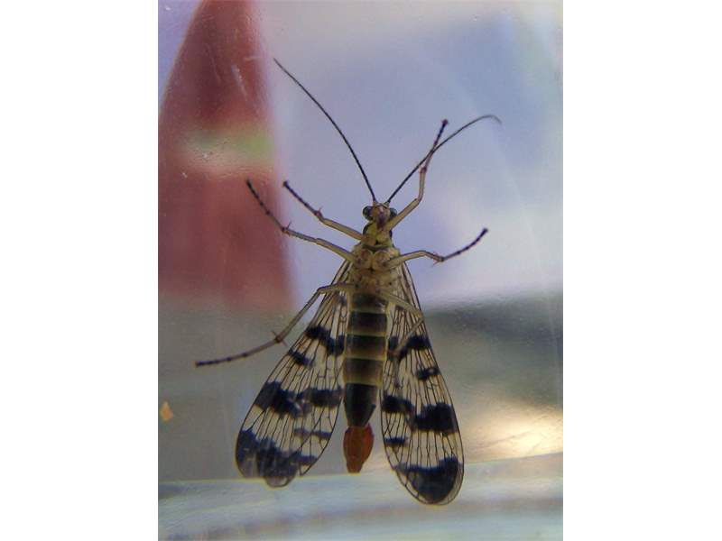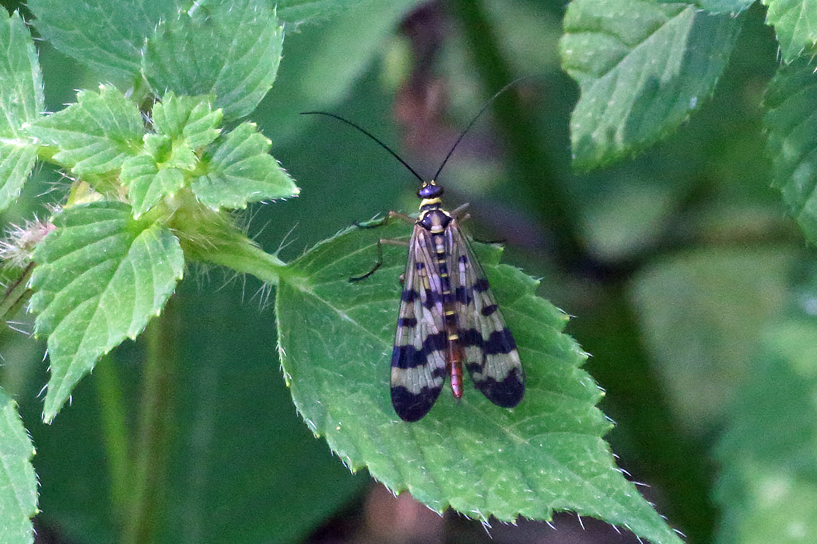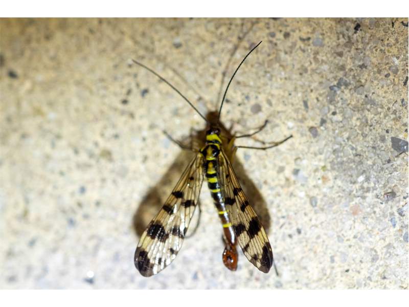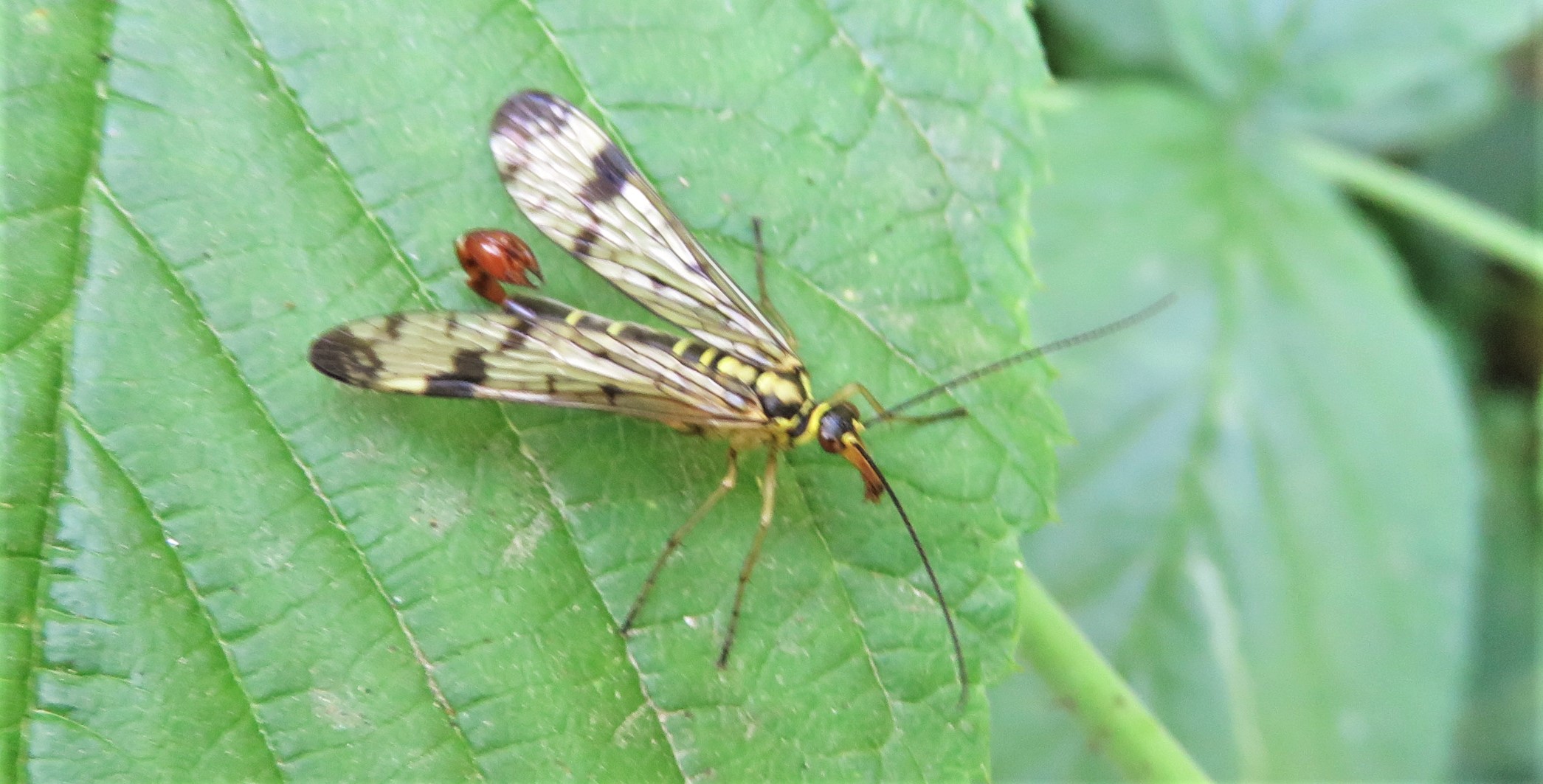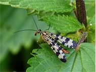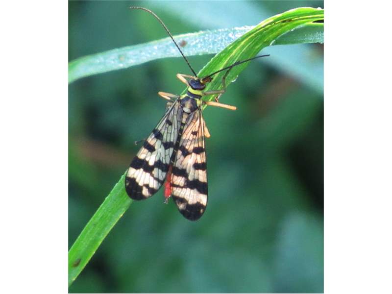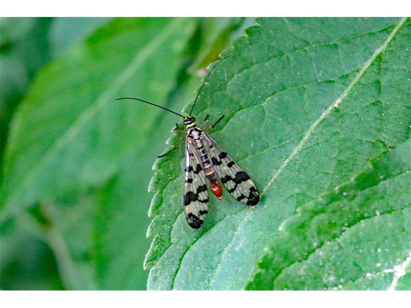 Skorpionsfliegen bei der Kopulation, (09.08.2010 im Tharandter Wald am Triebischsee). Das Männchen hält das Weibchen nicht nur mit dem zangenförmigen Abdominalfortsatz fest, sondern hat seine Flügel noch so über die des Weibchens gelegt, dass ein Fortfliegen unmöglich ist. Die Hochzeit findet an einer toten Raupe (von Gregärparasiten befallen) statt, an denen die Adulten Nahrung aufnehmen