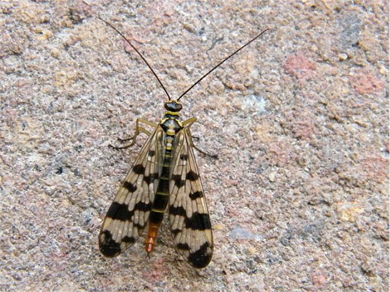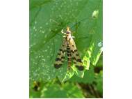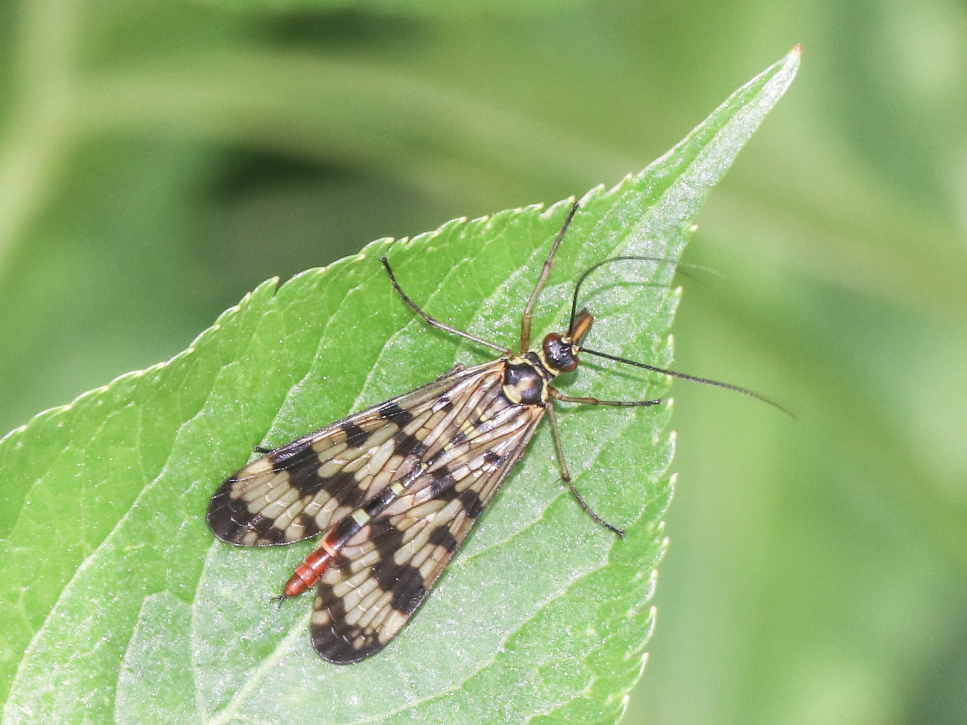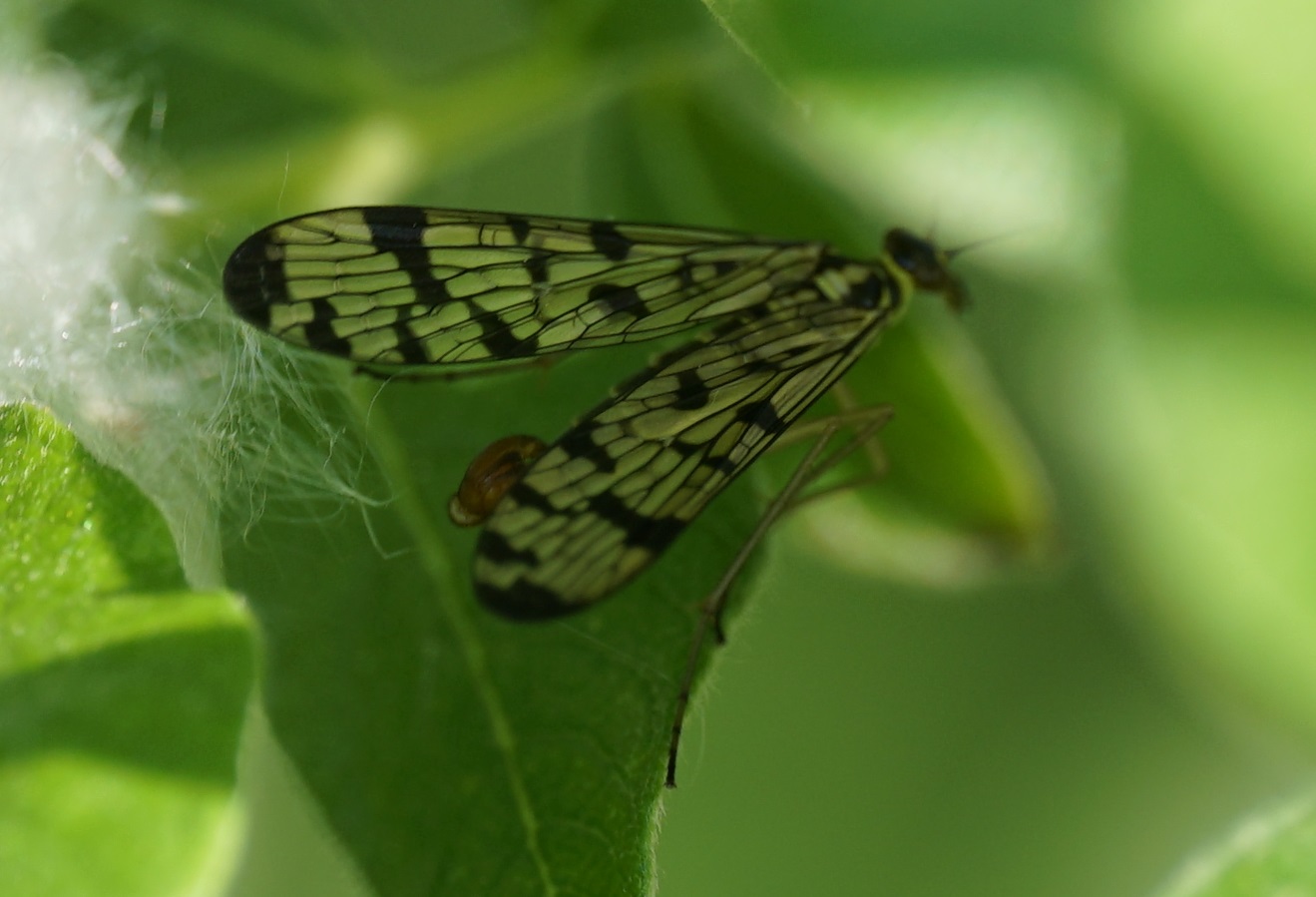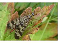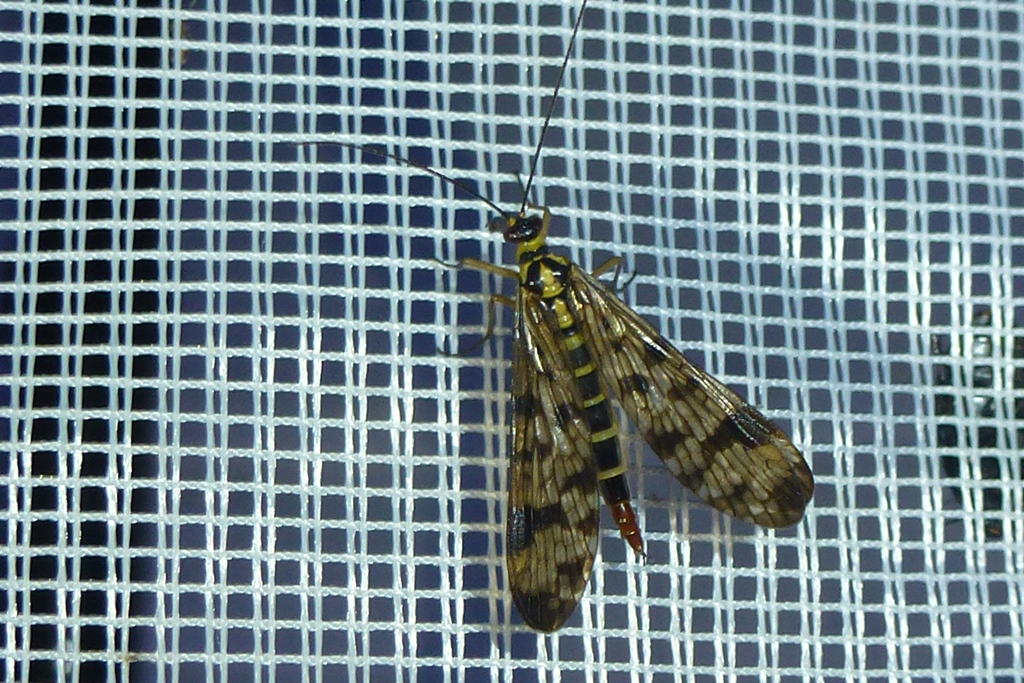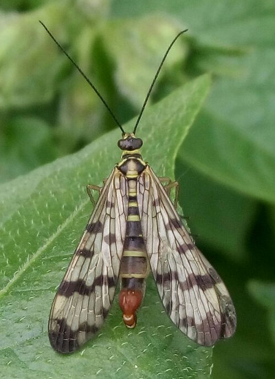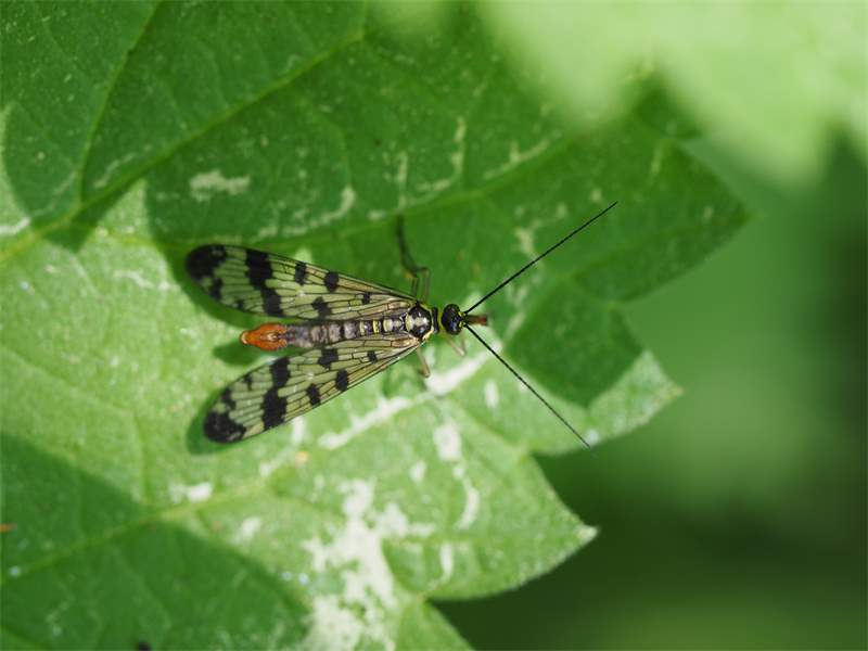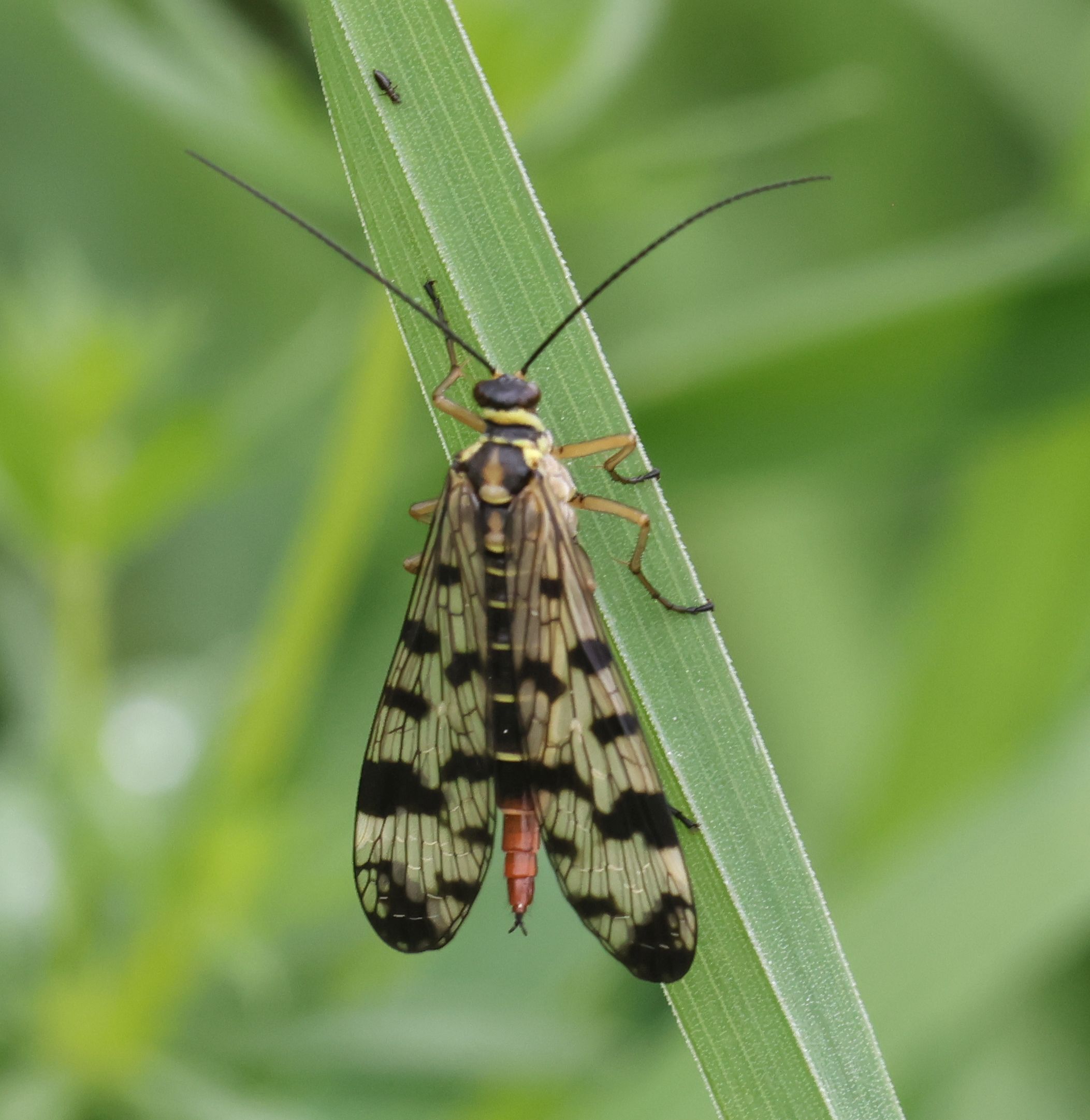 Skorpionsfliegen bei der Kopulation, (09.08.2010 im Tharandter Wald am Triebischsee). Das Männchen hält das Weibchen nicht nur mit dem zangenförmigen Abdominalfortsatz fest, sondern hat seine Flügel noch so über die des Weibchens gelegt, dass ein Fortfliegen unmöglich ist. Die Hochzeit findet an einer toten Raupe (von Gregärparasiten befallen) statt, an denen die Adulten Nahrung aufnehmen