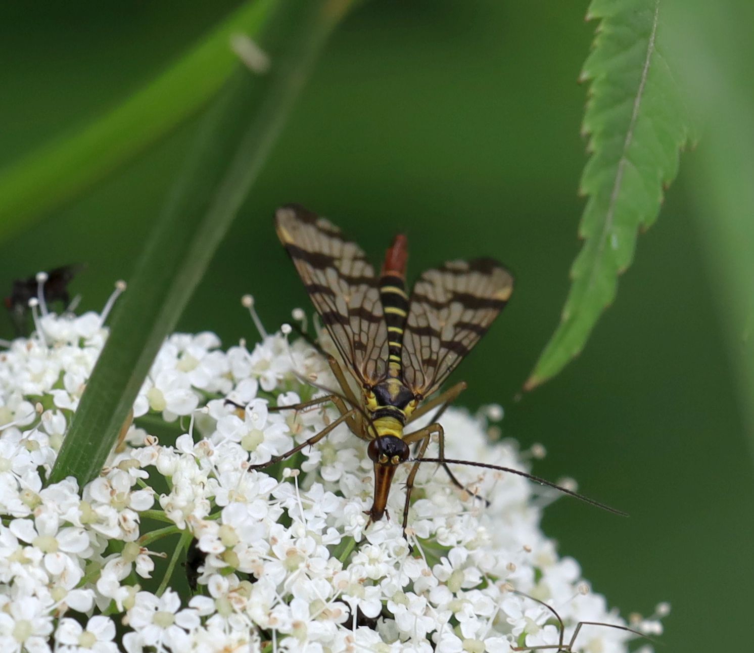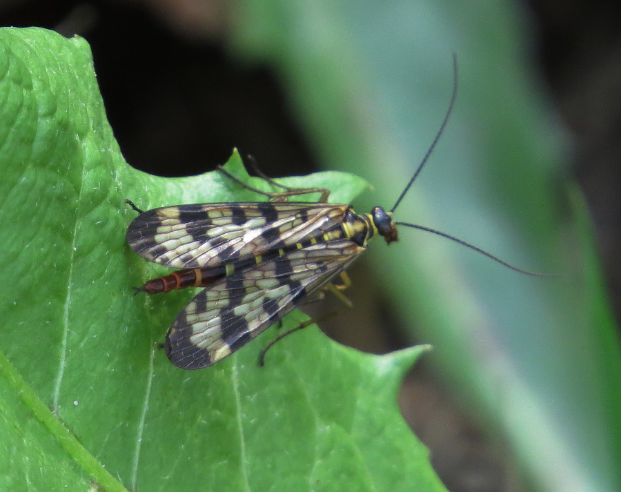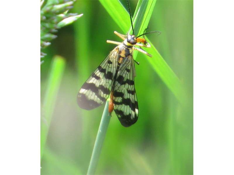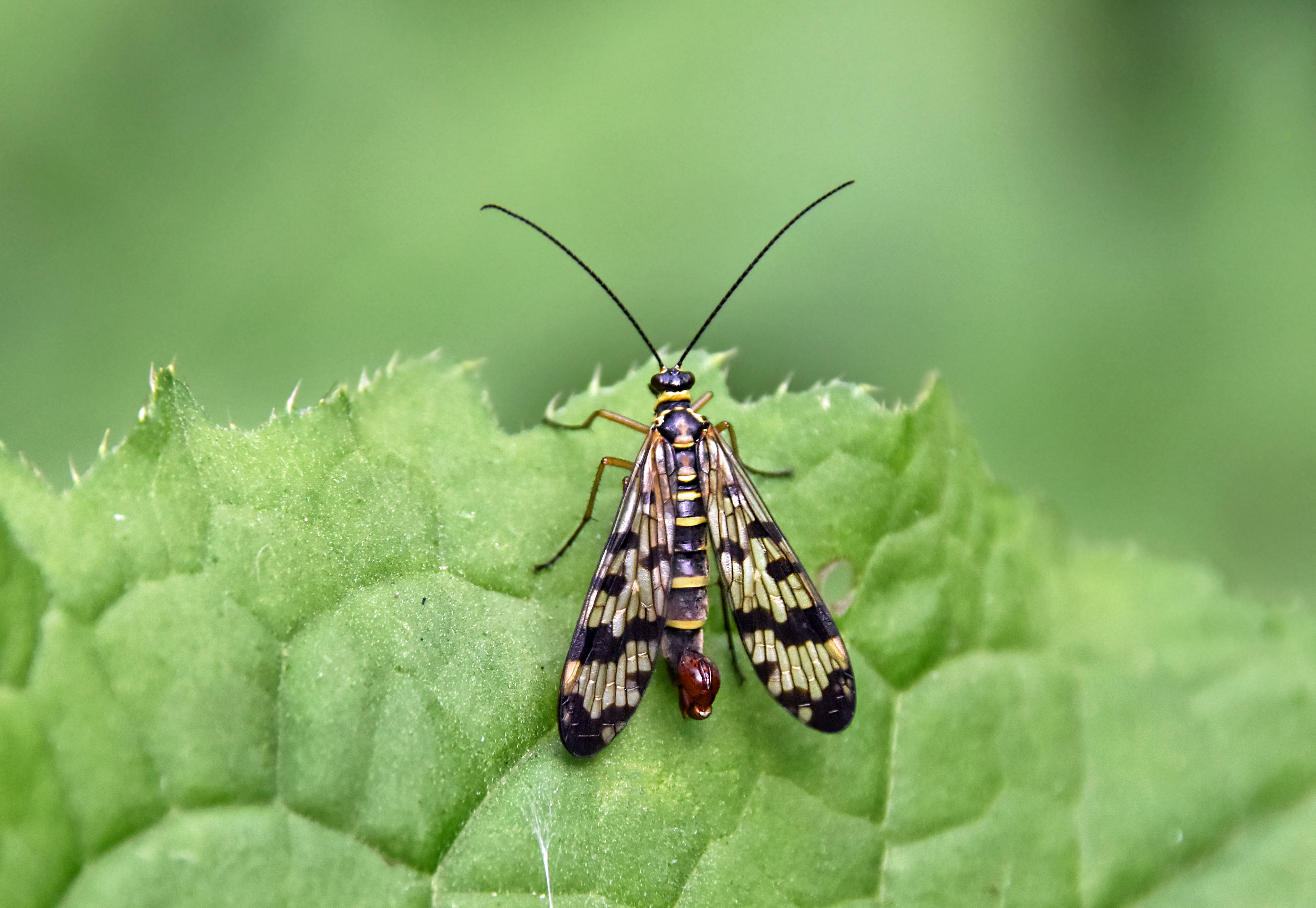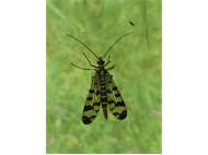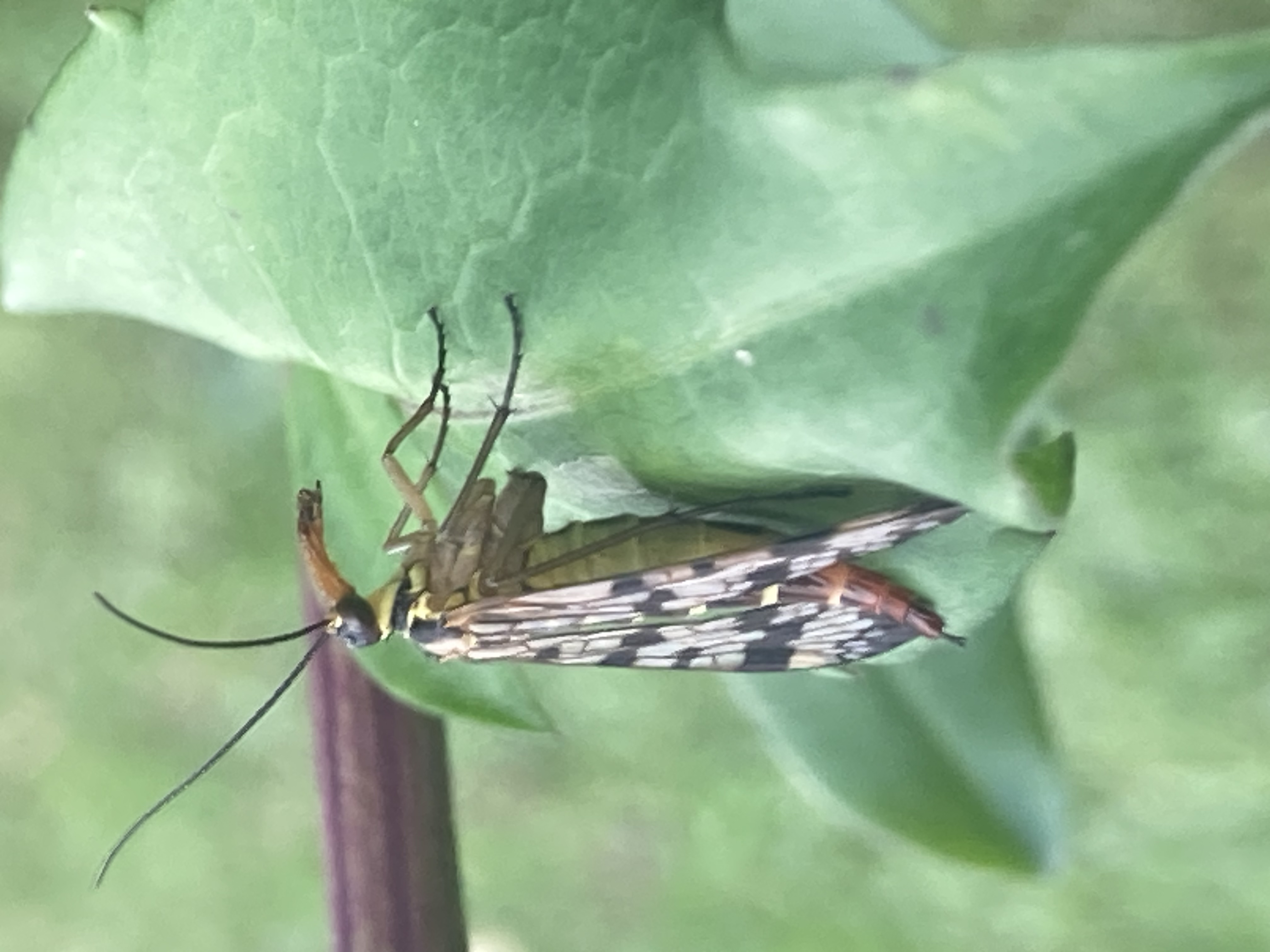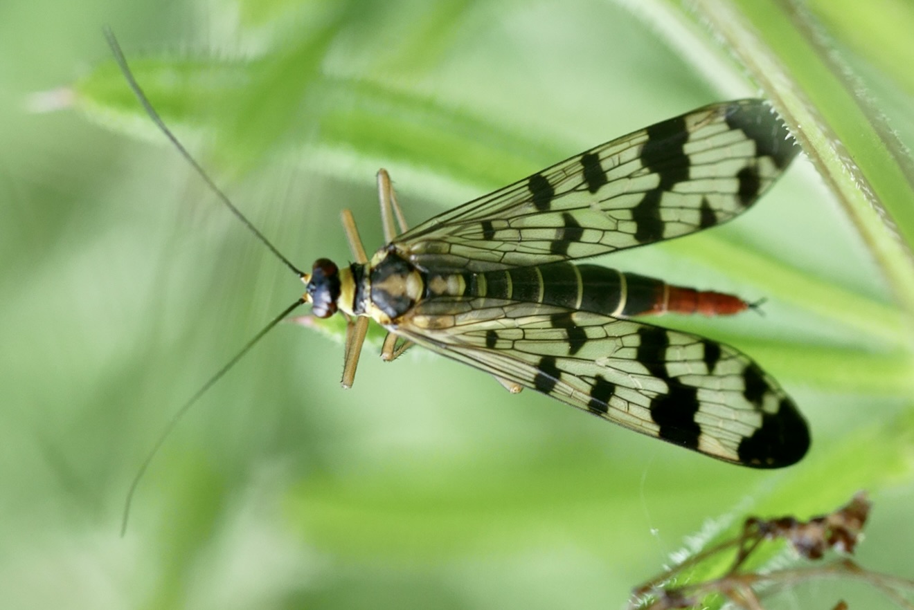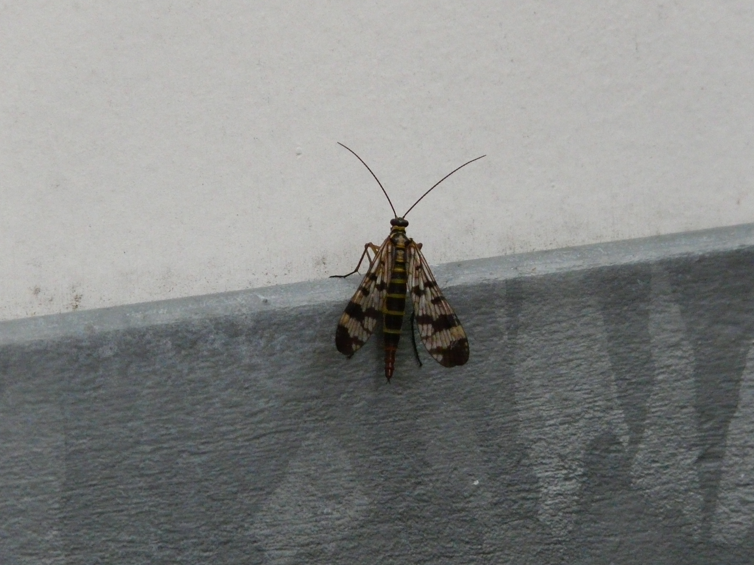 Skorpionsfliegen bei der Kopulation, (09.08.2010 im Tharandter Wald am Triebischsee). Das Männchen hält das Weibchen nicht nur mit dem zangenförmigen Abdominalfortsatz fest, sondern hat seine Flügel noch so über die des Weibchens gelegt, dass ein Fortfliegen unmöglich ist. Die Hochzeit findet an einer toten Raupe (von Gregärparasiten befallen) statt, an denen die Adulten Nahrung aufnehmen