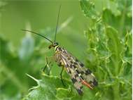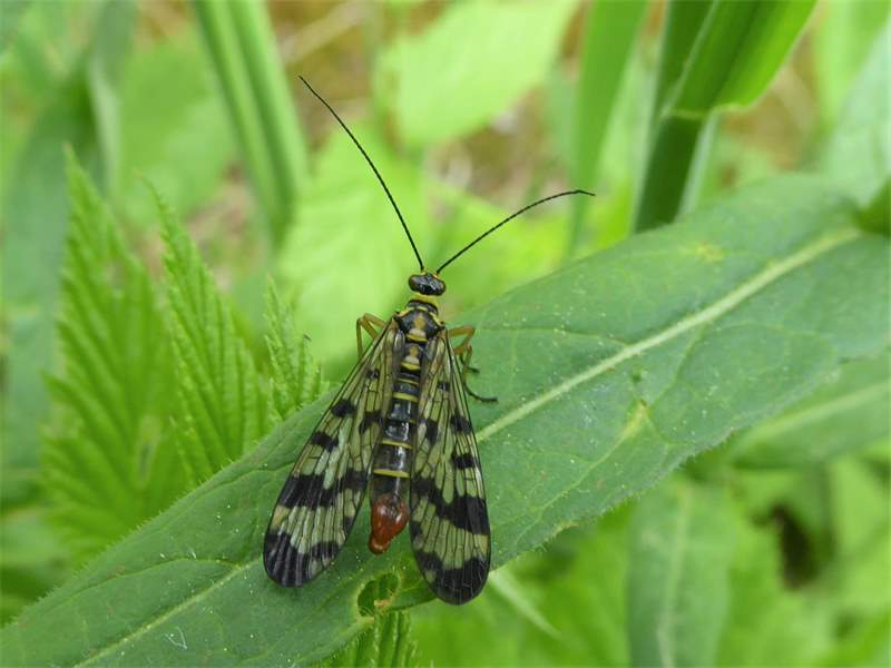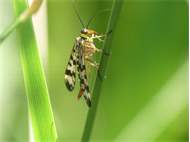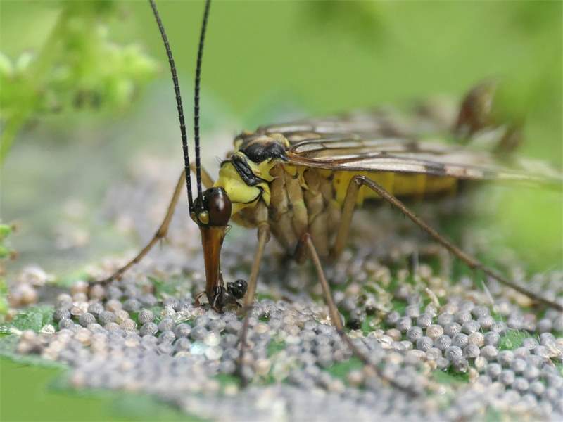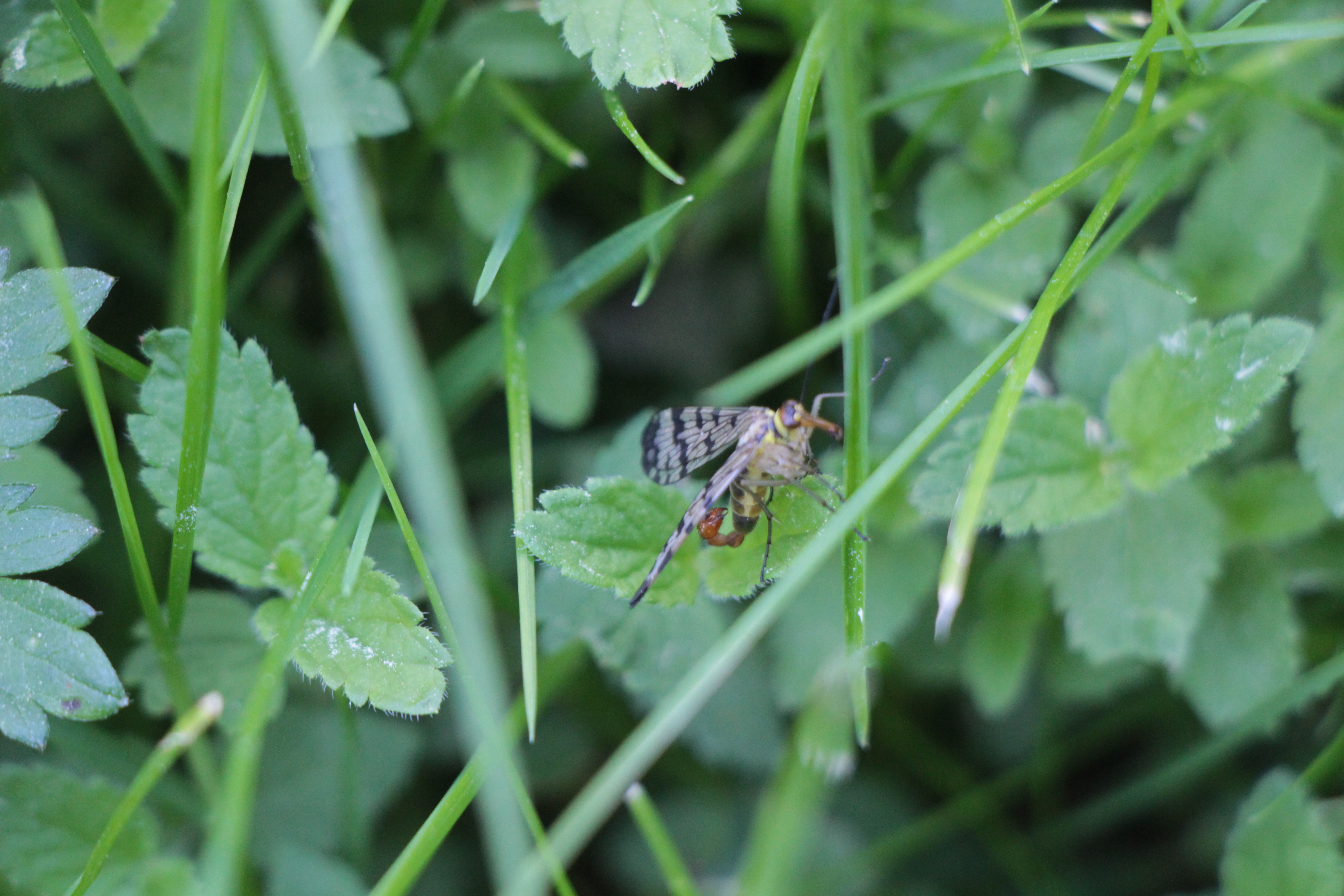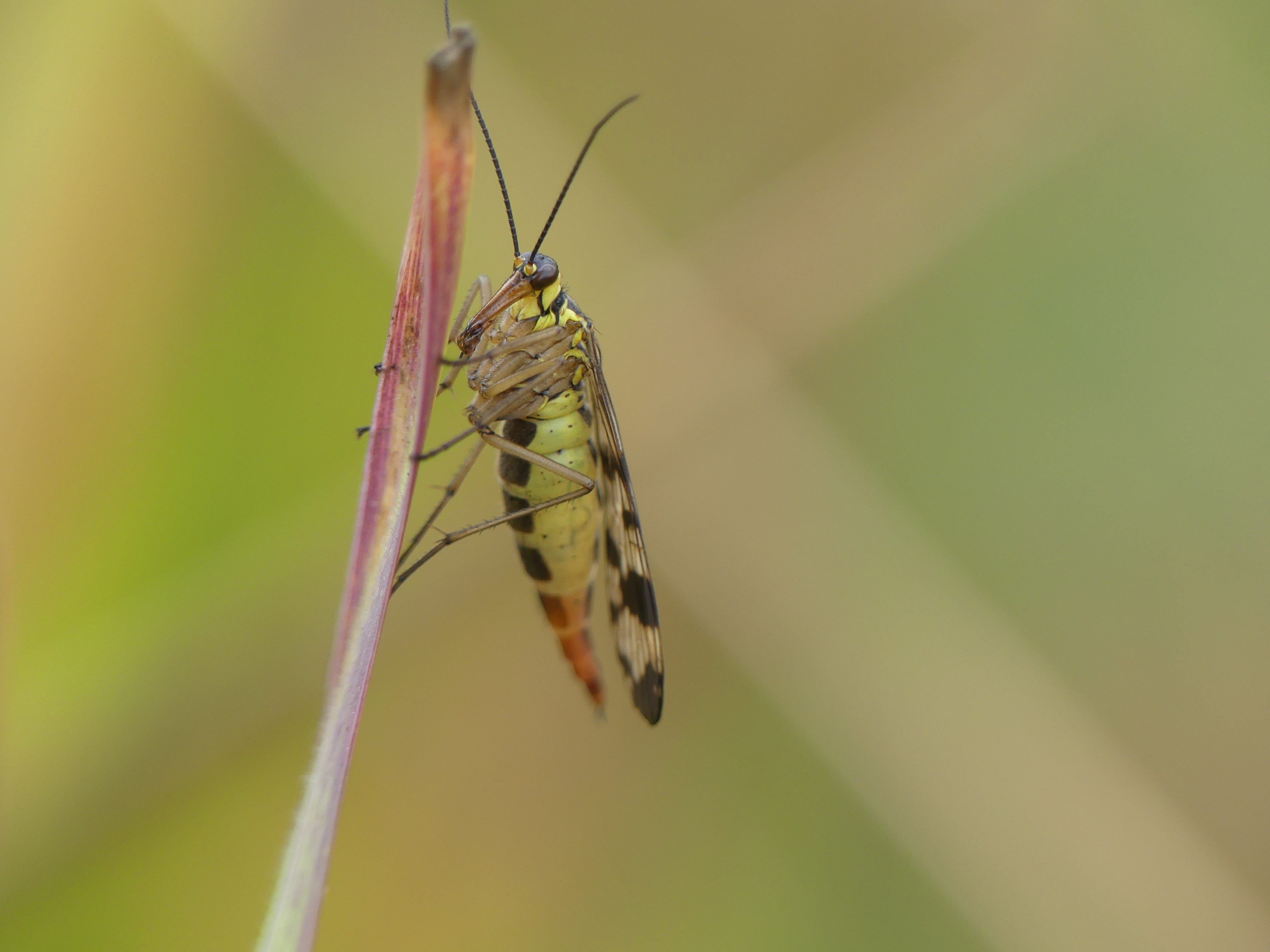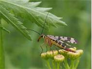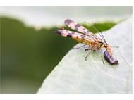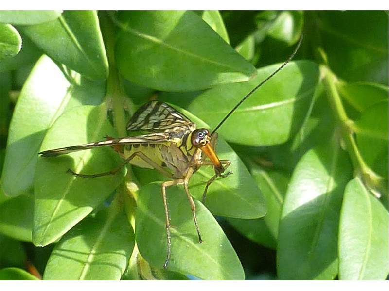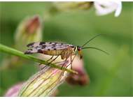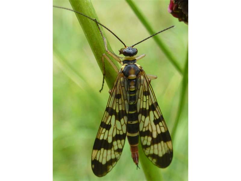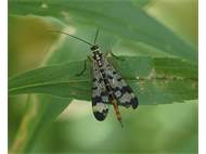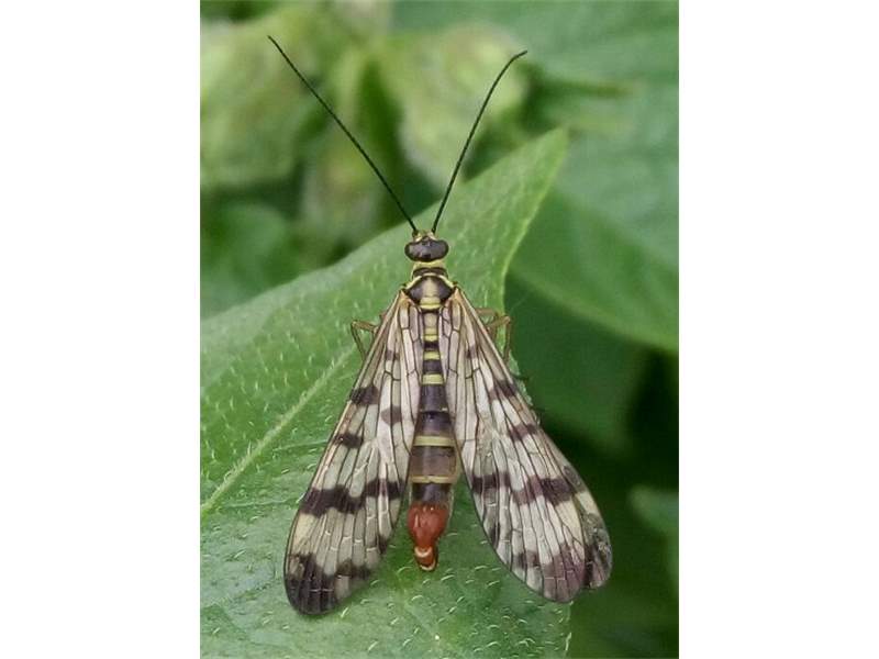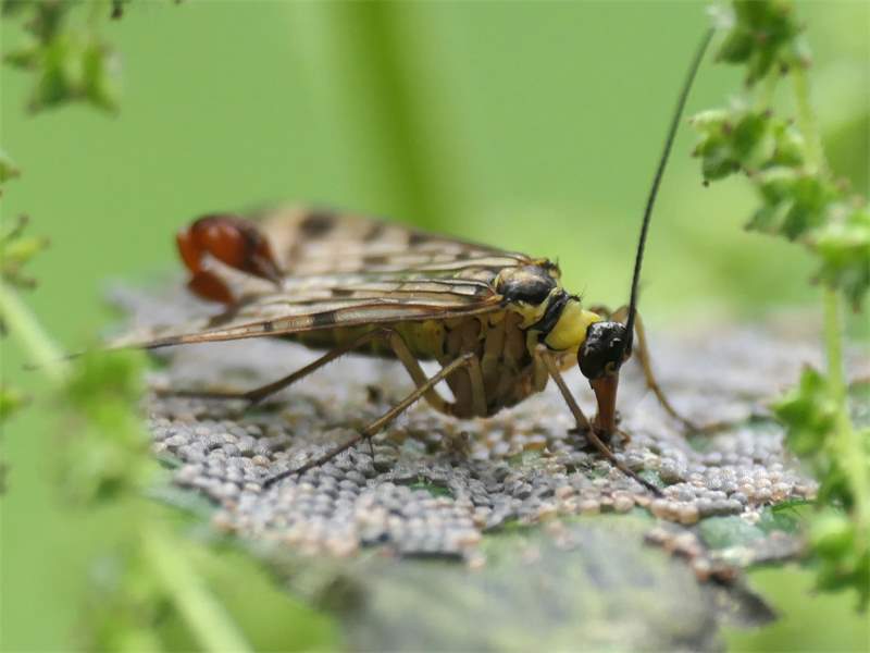 Skorpionsfliegen bei der Kopulation, (09.08.2010 im Tharandter Wald am Triebischsee). Das Männchen hält das Weibchen nicht nur mit dem zangenförmigen Abdominalfortsatz fest, sondern hat seine Flügel noch so über die des Weibchens gelegt, dass ein Fortfliegen unmöglich ist. Die Hochzeit findet an einer toten Raupe (von Gregärparasiten befallen) statt, an denen die Adulten Nahrung aufnehmen
