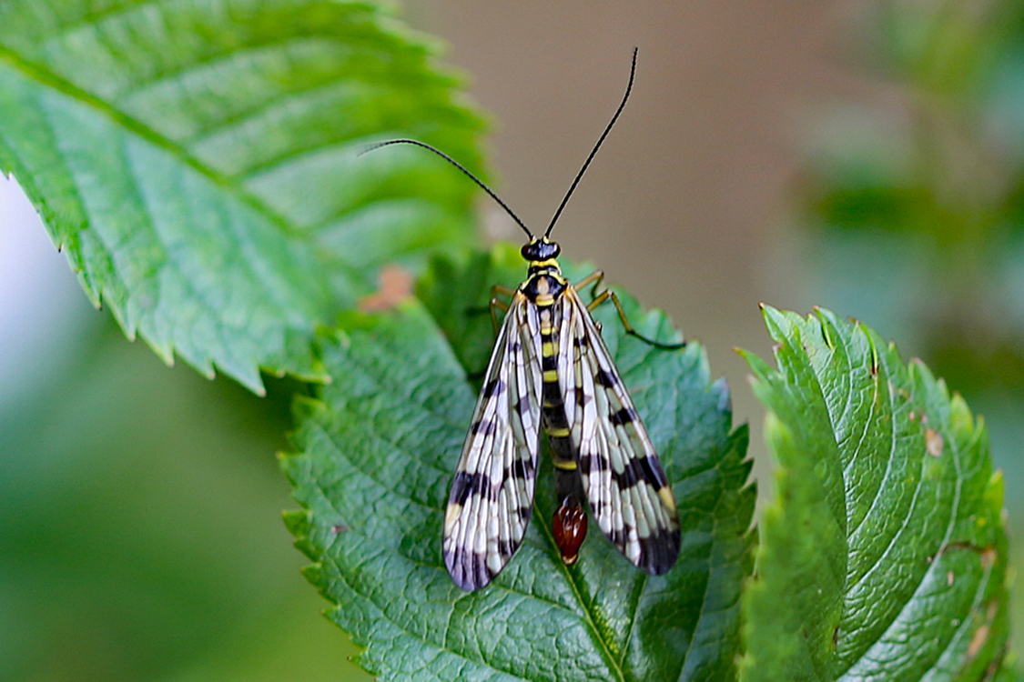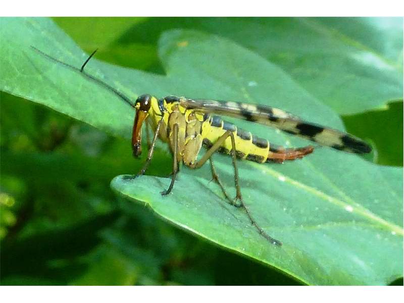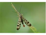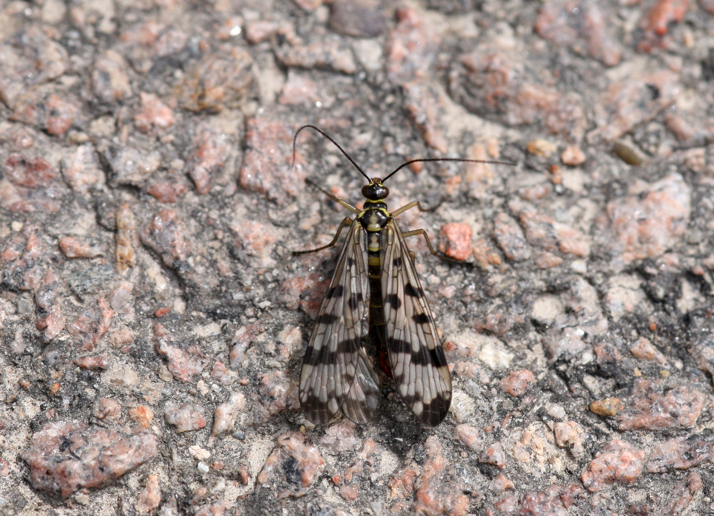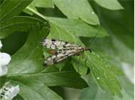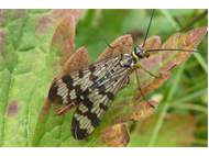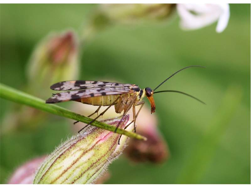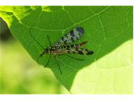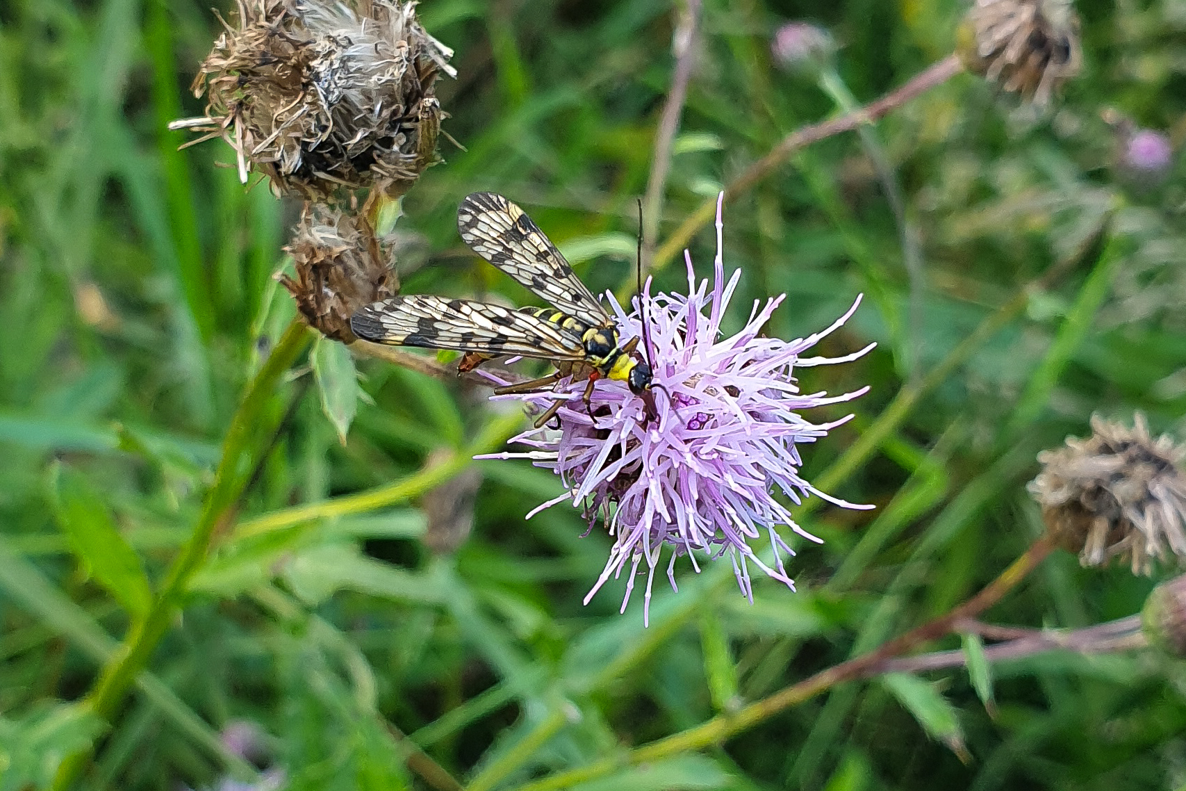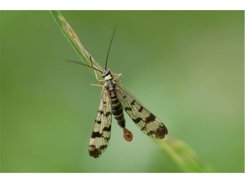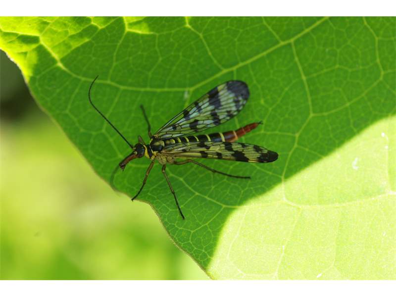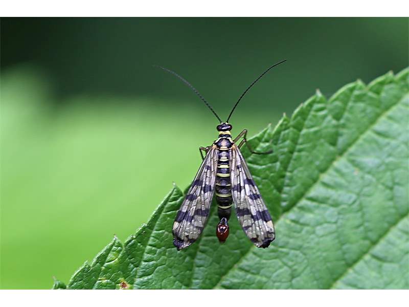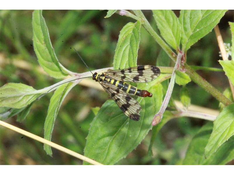 Skorpionsfliegen bei der Kopulation, (09.08.2010 im Tharandter Wald am Triebischsee). Das Männchen hält das Weibchen nicht nur mit dem zangenförmigen Abdominalfortsatz fest, sondern hat seine Flügel noch so über die des Weibchens gelegt, dass ein Fortfliegen unmöglich ist. Die Hochzeit findet an einer toten Raupe (von Gregärparasiten befallen) statt, an denen die Adulten Nahrung aufnehmen