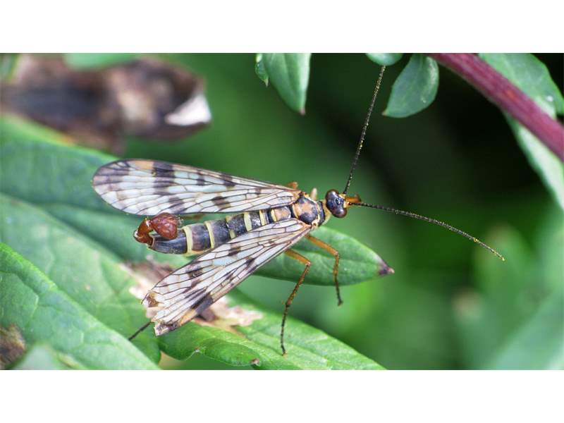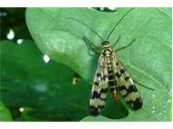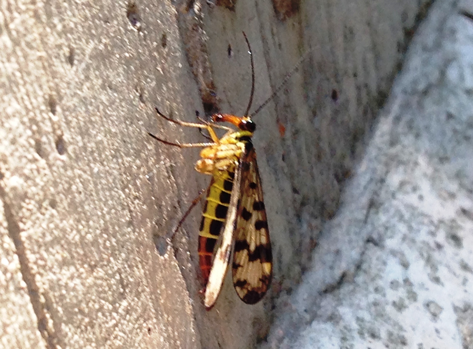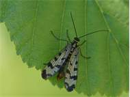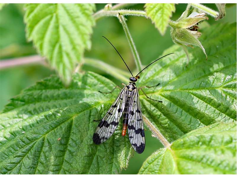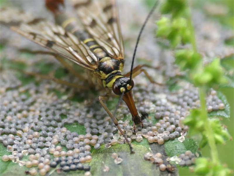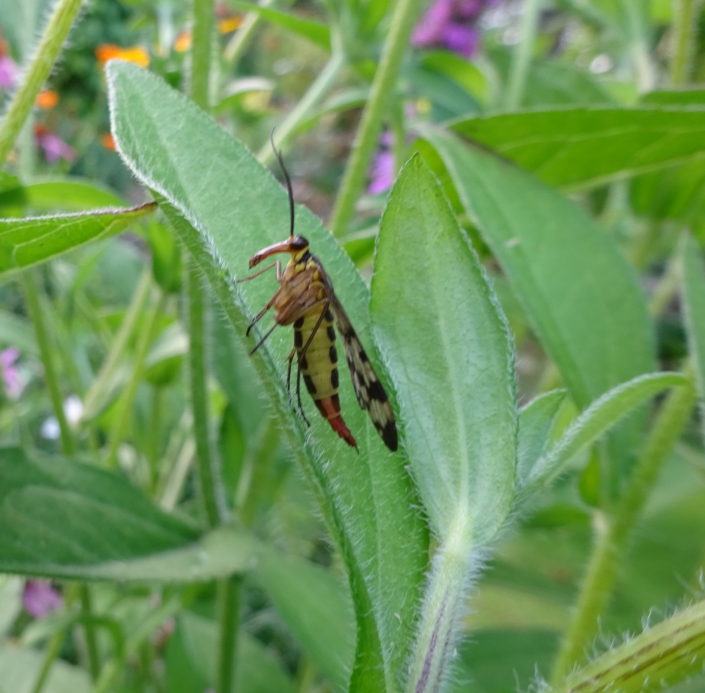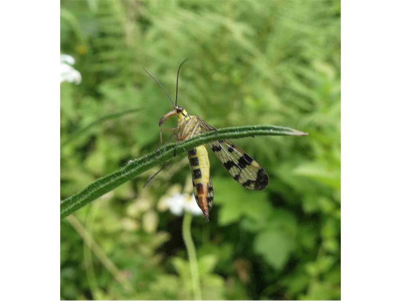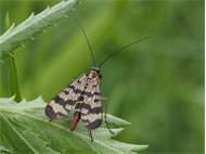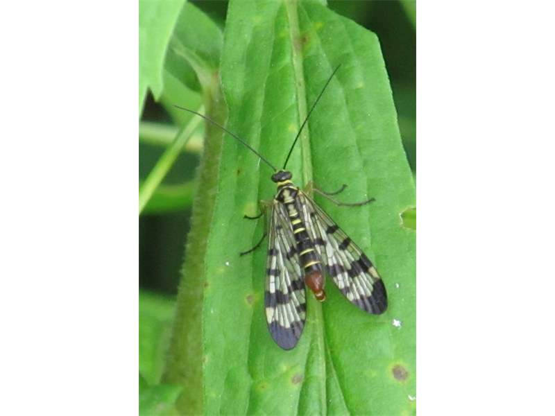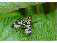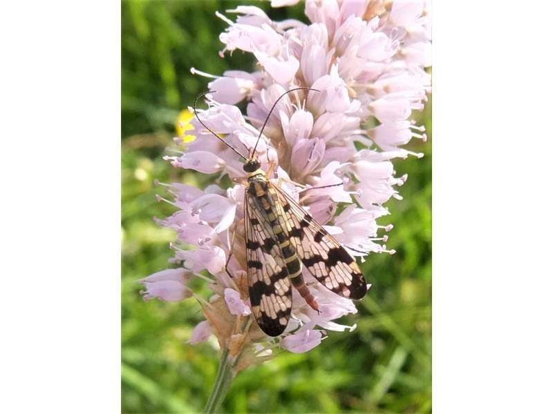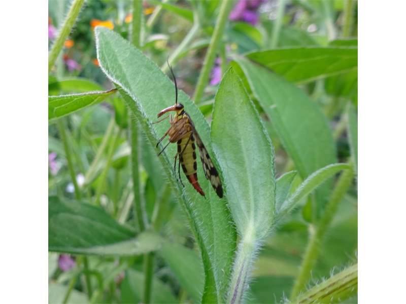 Skorpionsfliegen bei der Kopulation, (09.08.2010 im Tharandter Wald am Triebischsee). Das Männchen hält das Weibchen nicht nur mit dem zangenförmigen Abdominalfortsatz fest, sondern hat seine Flügel noch so über die des Weibchens gelegt, dass ein Fortfliegen unmöglich ist. Die Hochzeit findet an einer toten Raupe (von Gregärparasiten befallen) statt, an denen die Adulten Nahrung aufnehmen