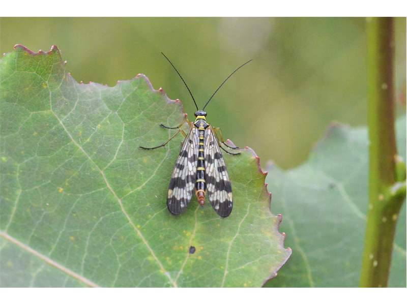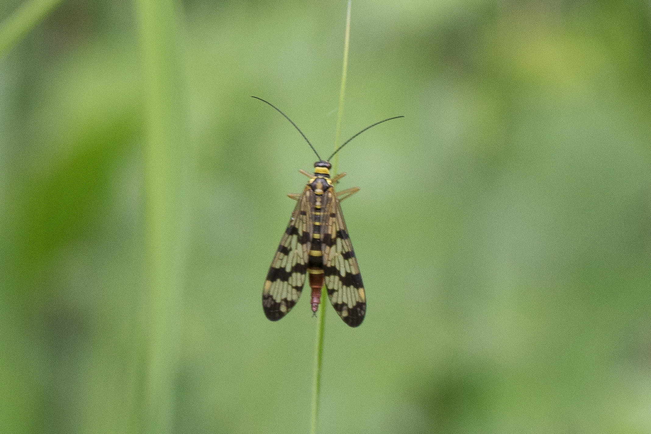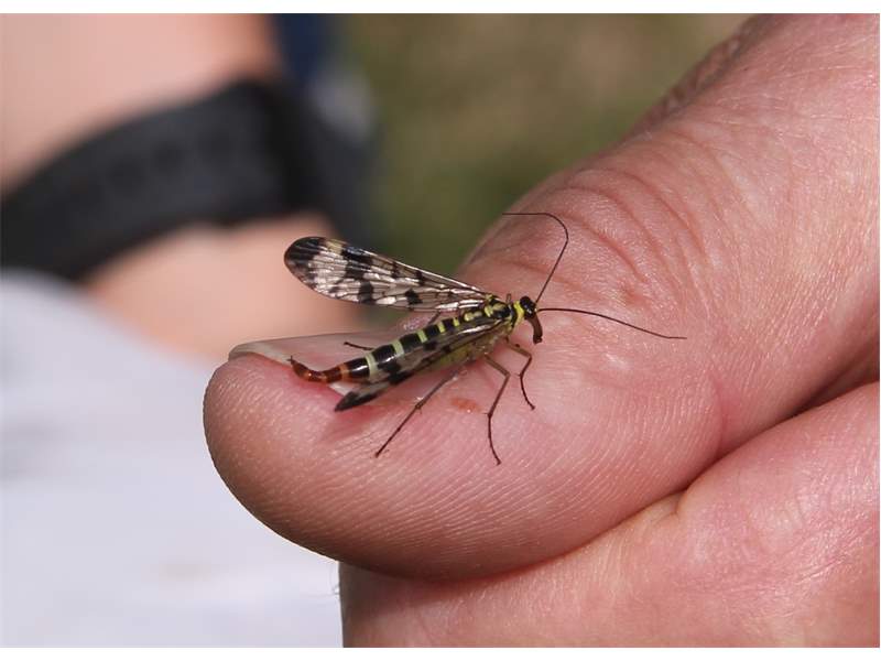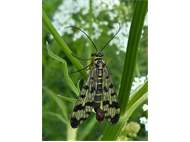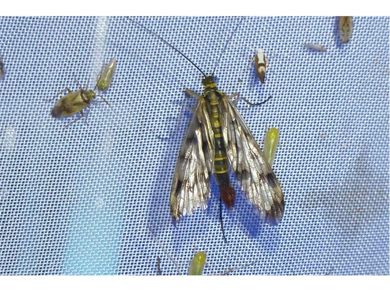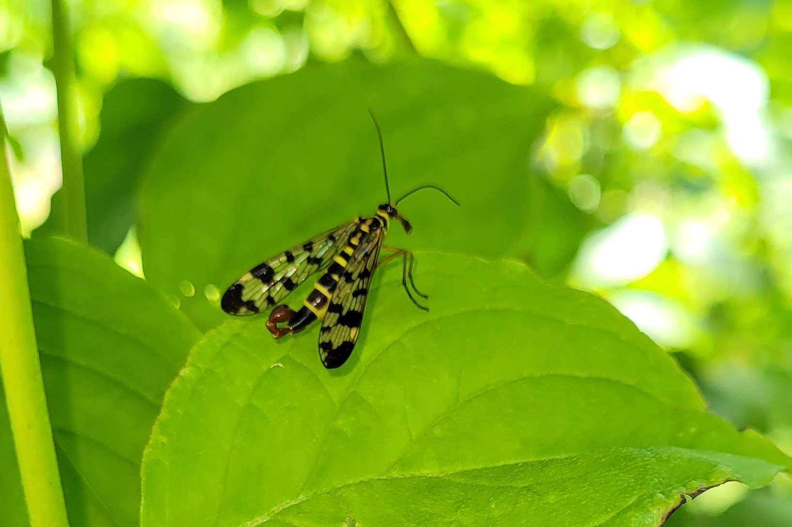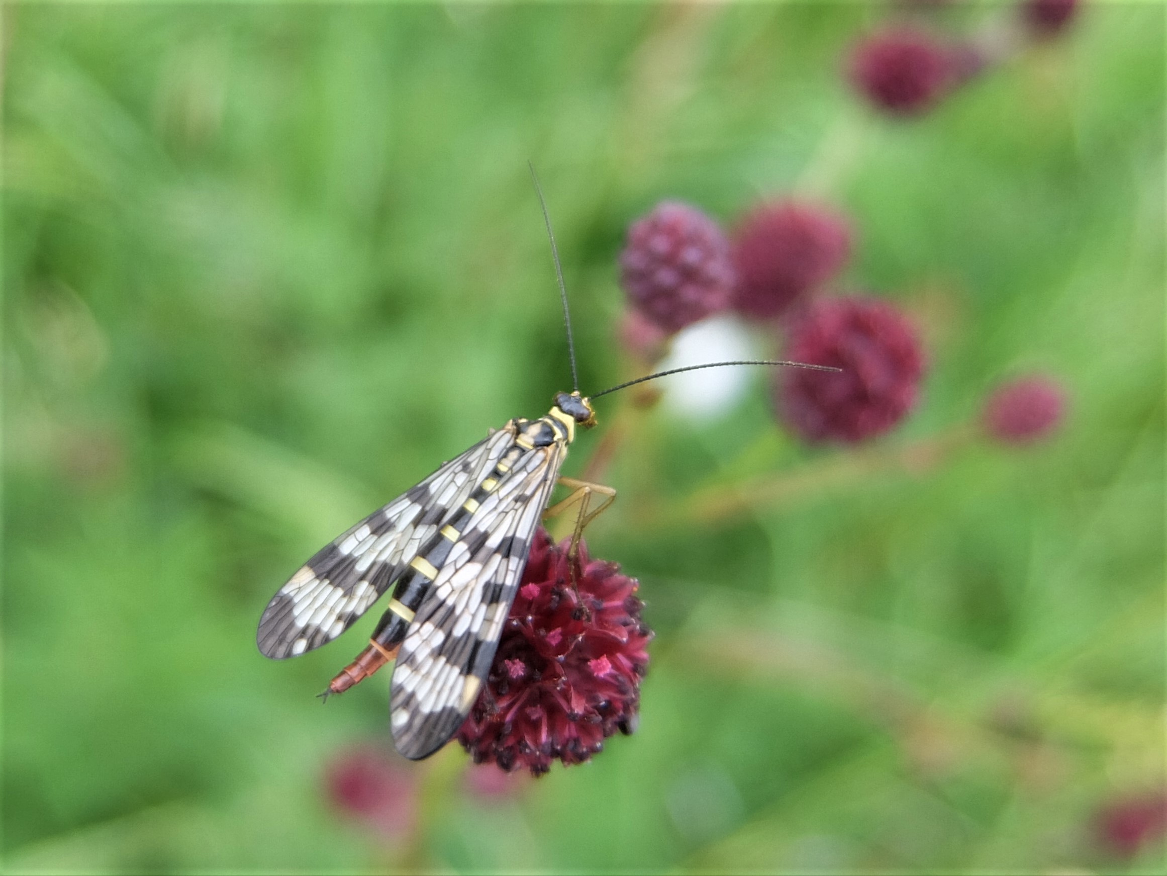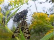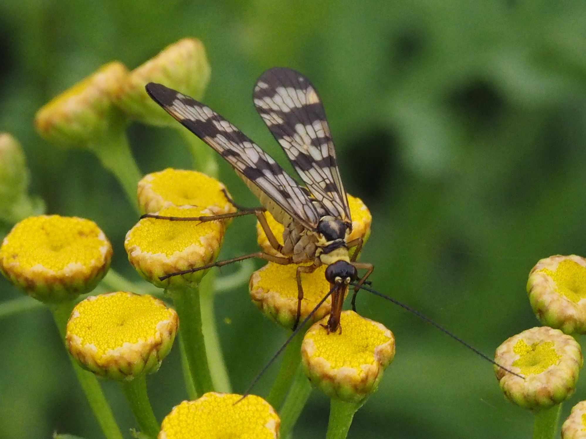 Skorpionsfliegen bei der Kopulation, (09.08.2010 im Tharandter Wald am Triebischsee). Das Männchen hält das Weibchen nicht nur mit dem zangenförmigen Abdominalfortsatz fest, sondern hat seine Flügel noch so über die des Weibchens gelegt, dass ein Fortfliegen unmöglich ist. Die Hochzeit findet an einer toten Raupe (von Gregärparasiten befallen) statt, an denen die Adulten Nahrung aufnehmen