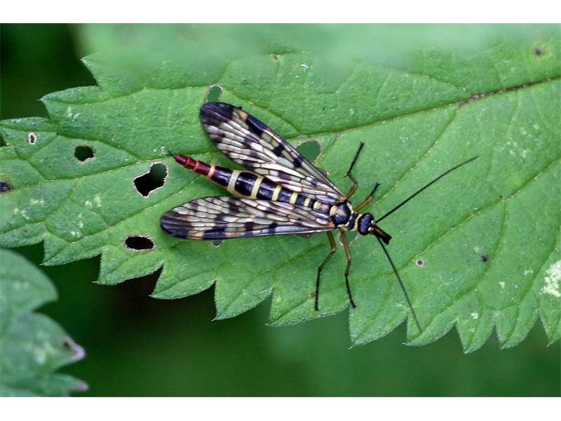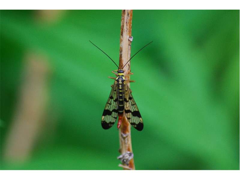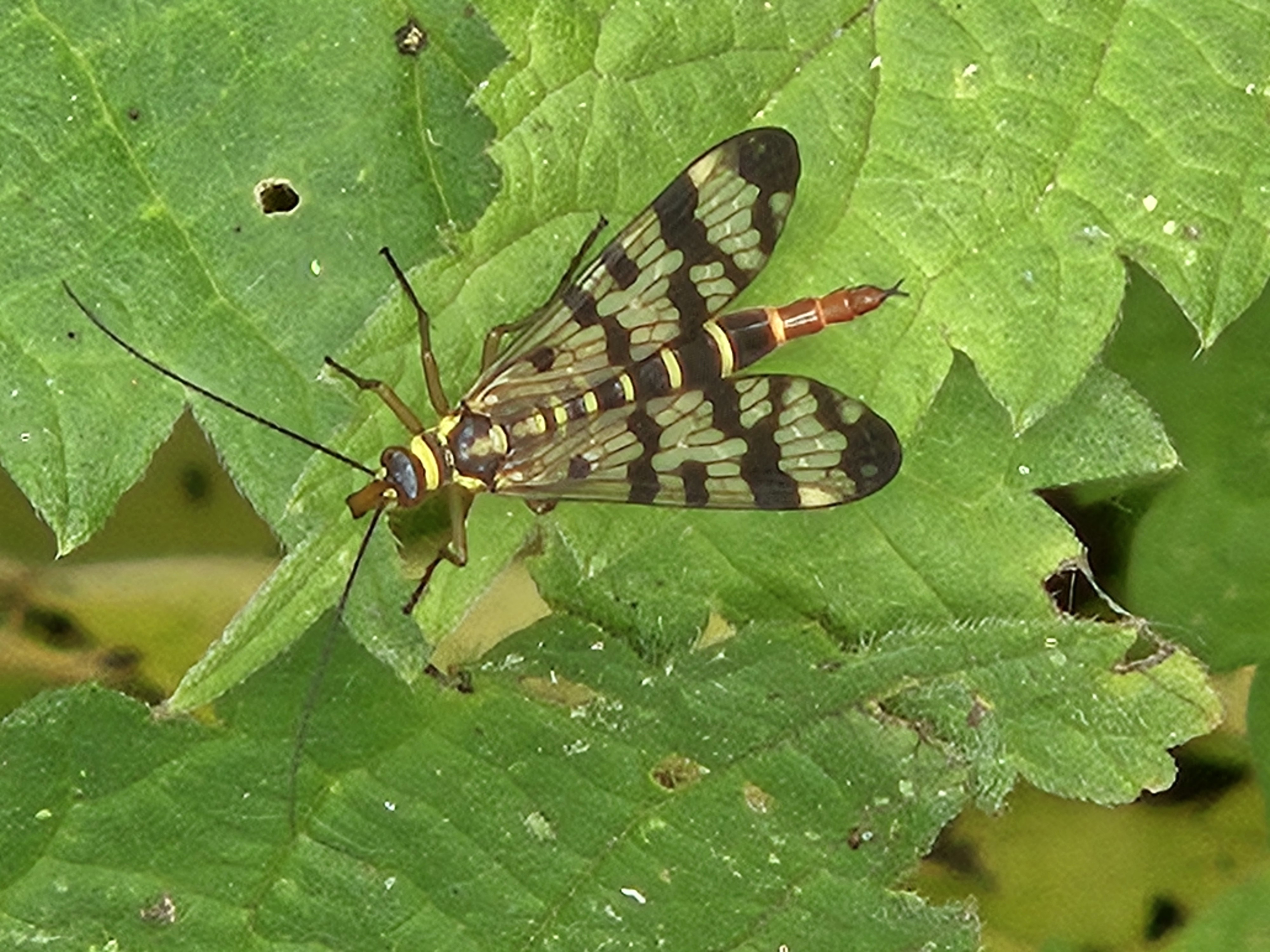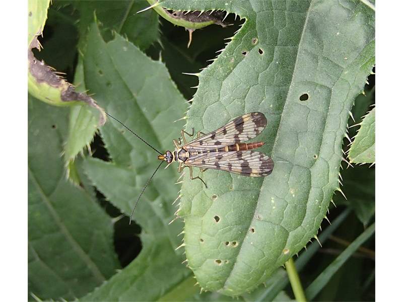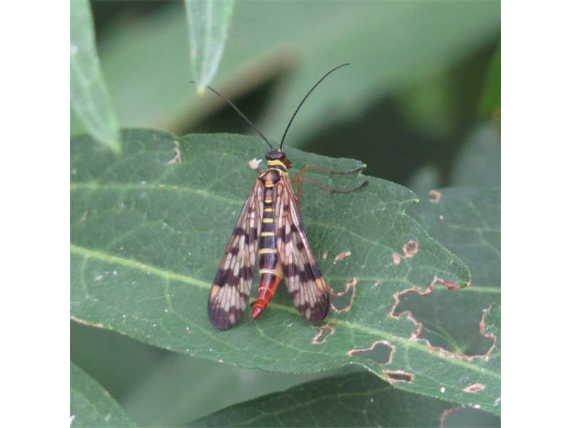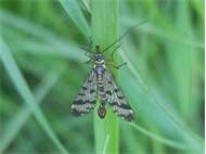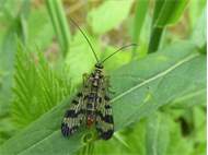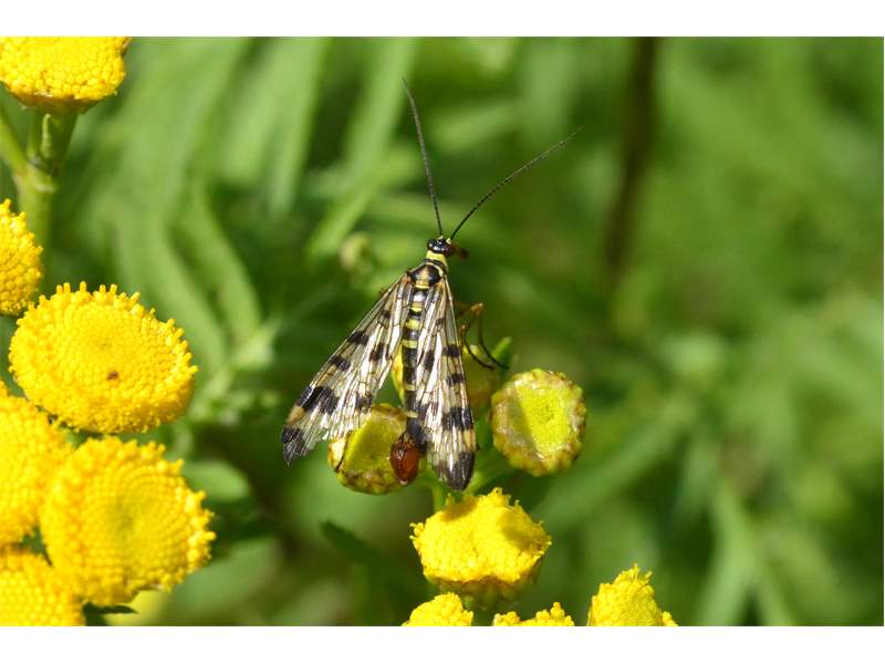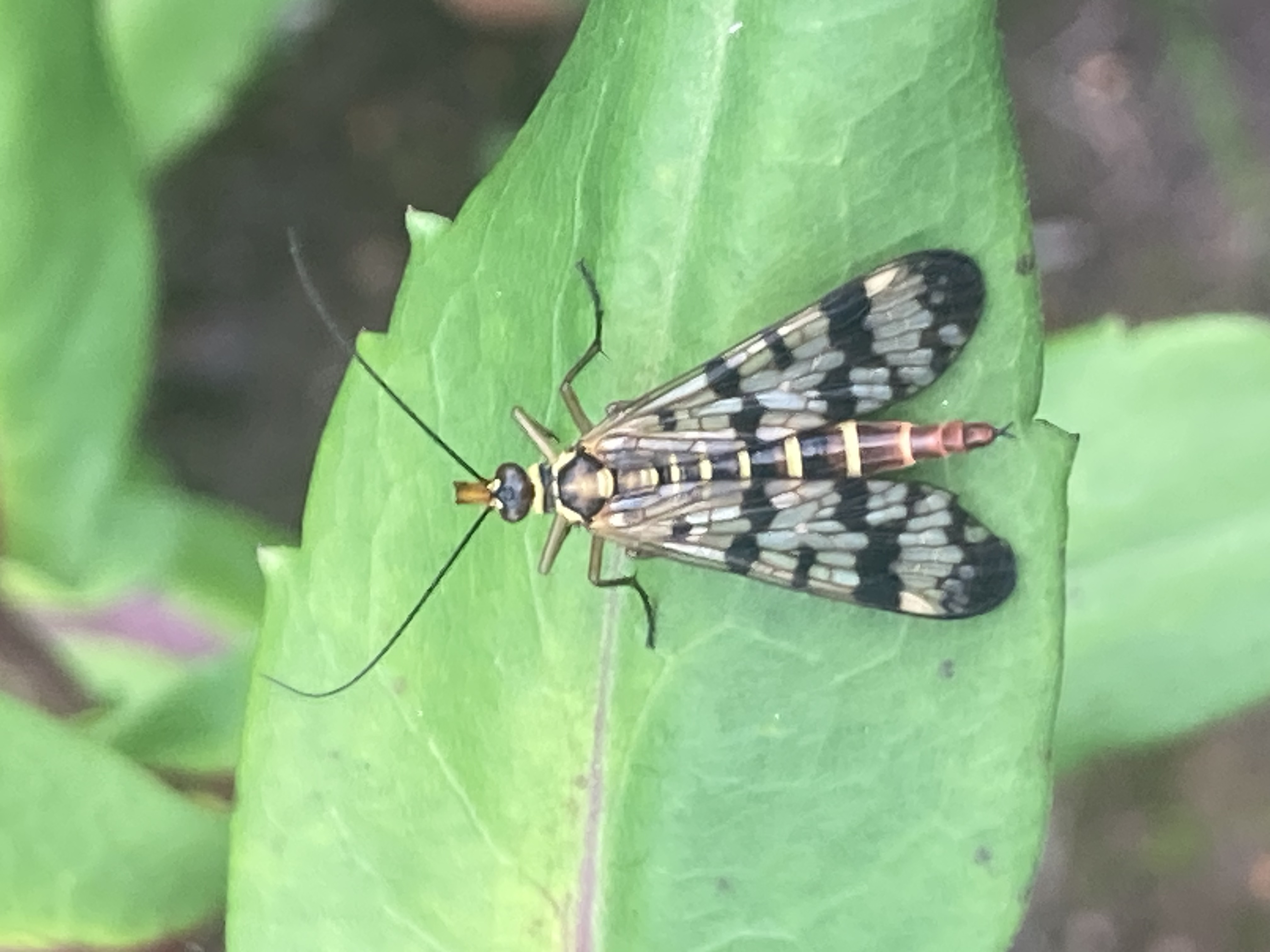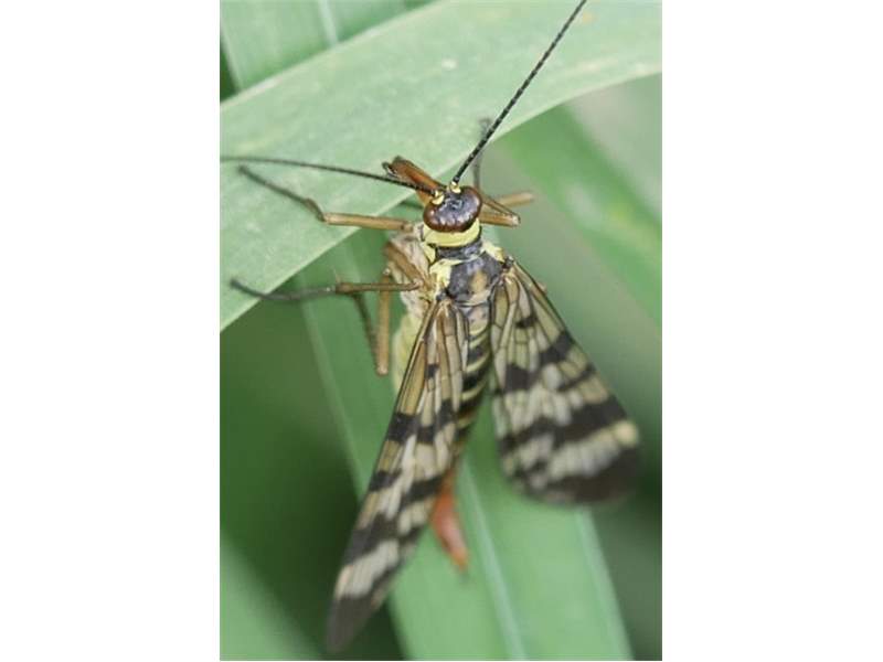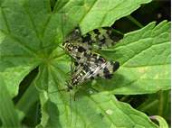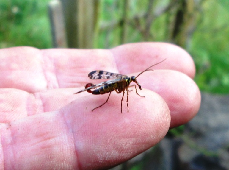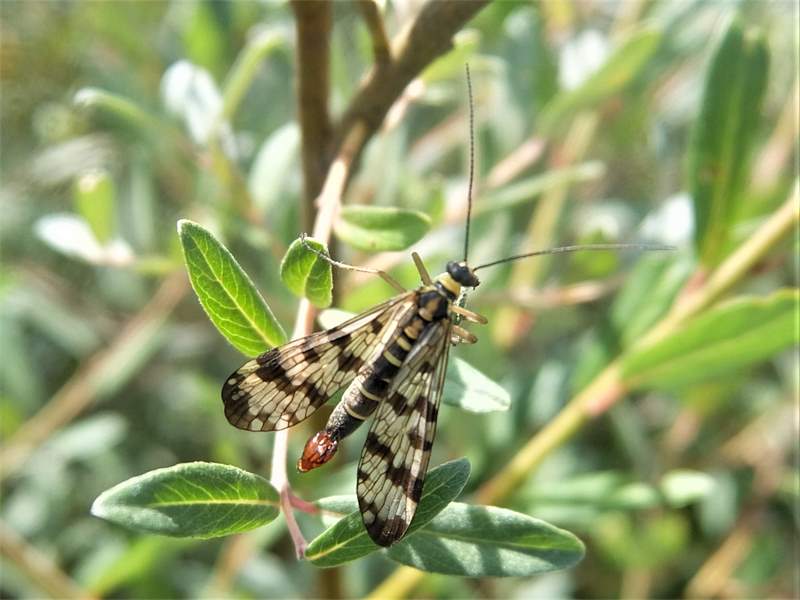 Skorpionsfliegen bei der Kopulation, (09.08.2010 im Tharandter Wald am Triebischsee). Das Männchen hält das Weibchen nicht nur mit dem zangenförmigen Abdominalfortsatz fest, sondern hat seine Flügel noch so über die des Weibchens gelegt, dass ein Fortfliegen unmöglich ist. Die Hochzeit findet an einer toten Raupe (von Gregärparasiten befallen) statt, an denen die Adulten Nahrung aufnehmen