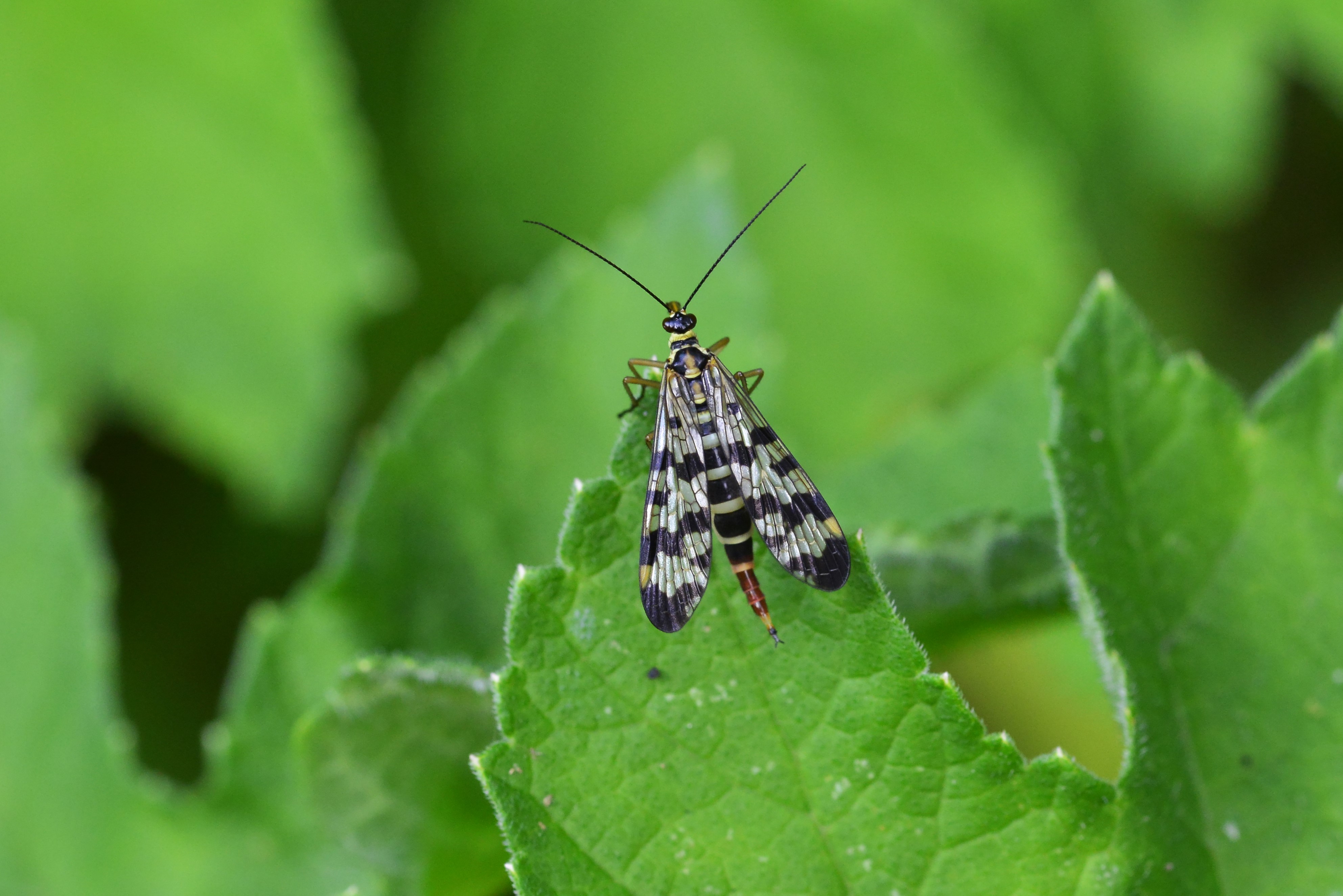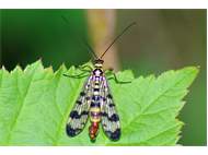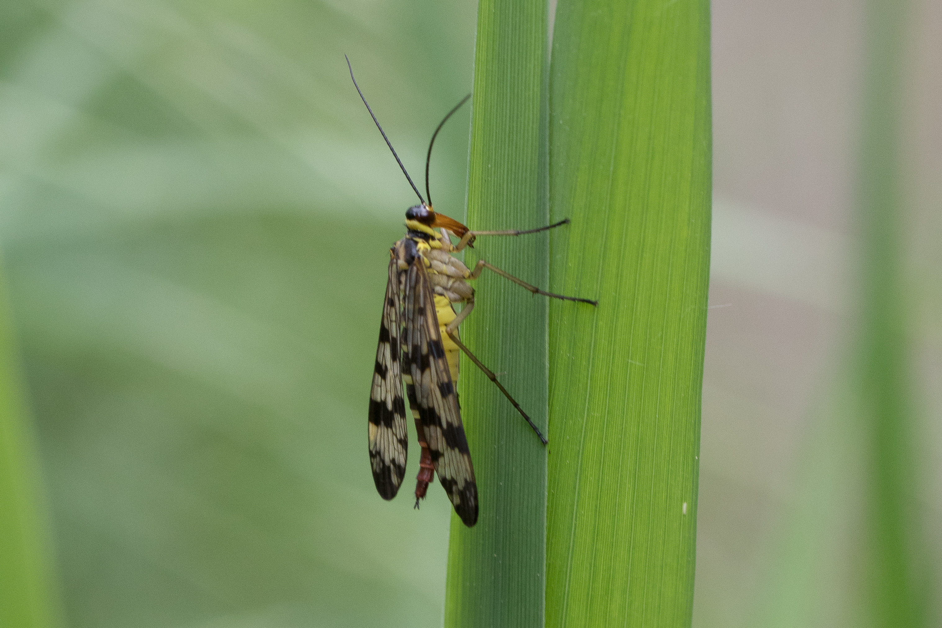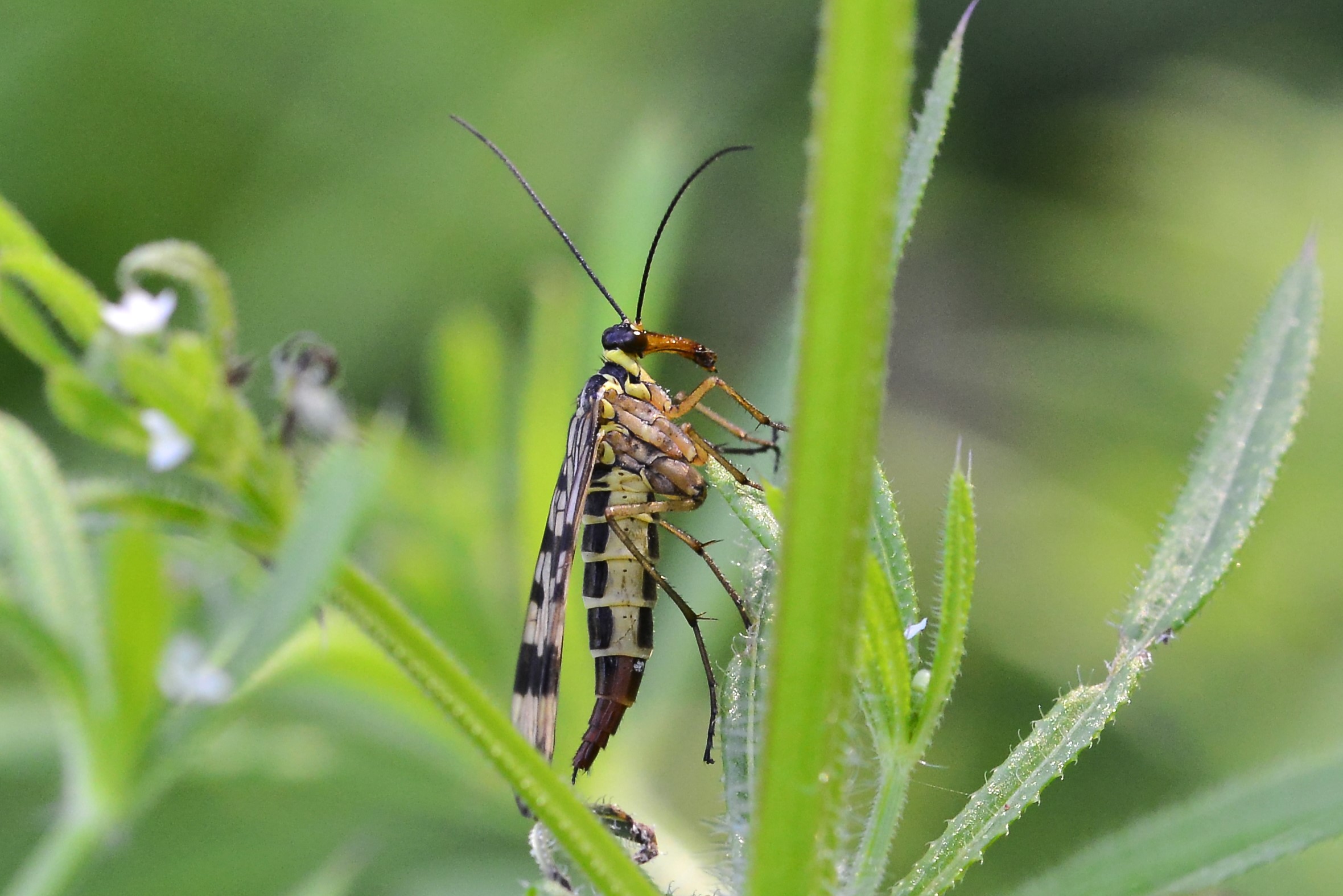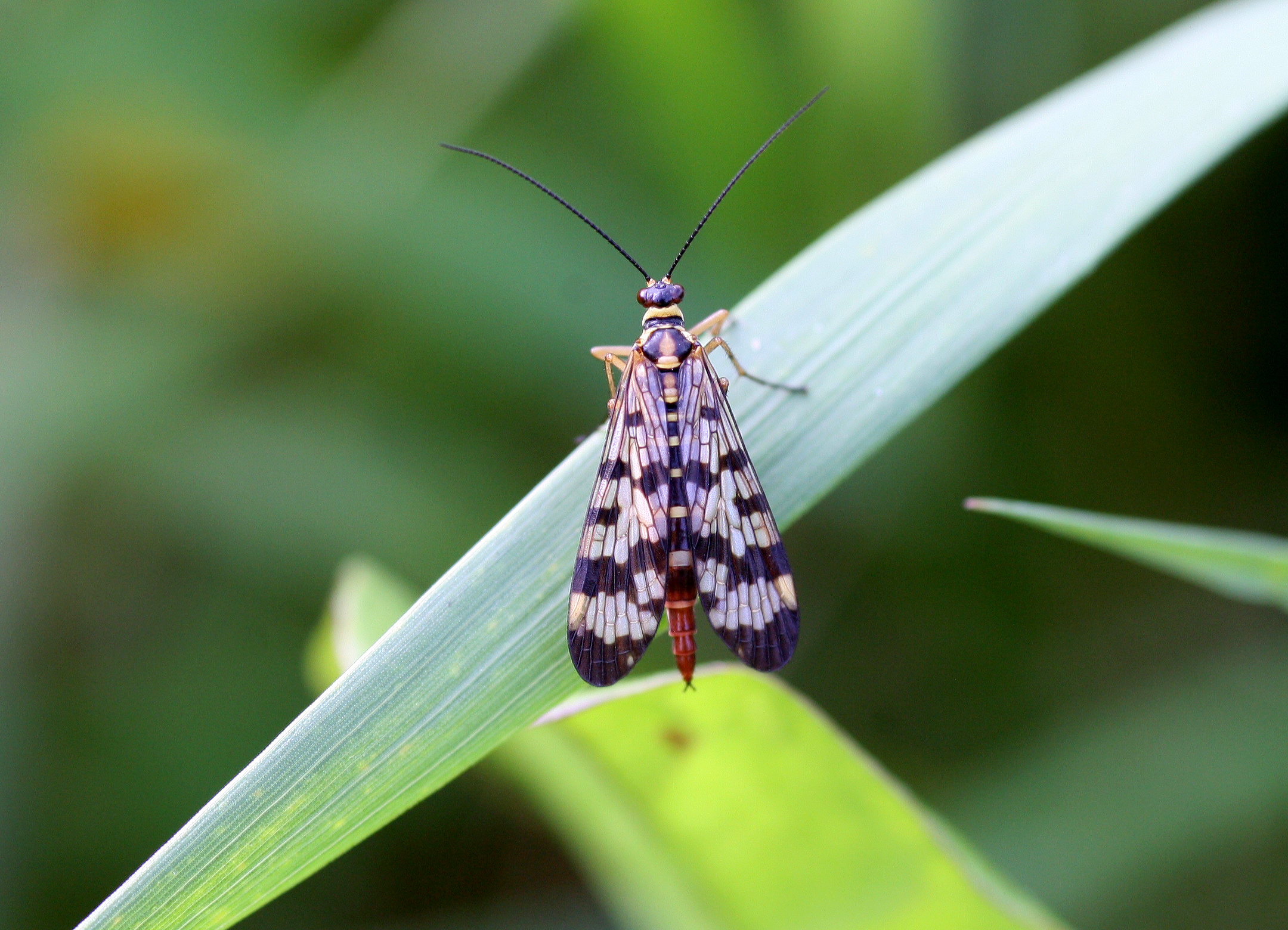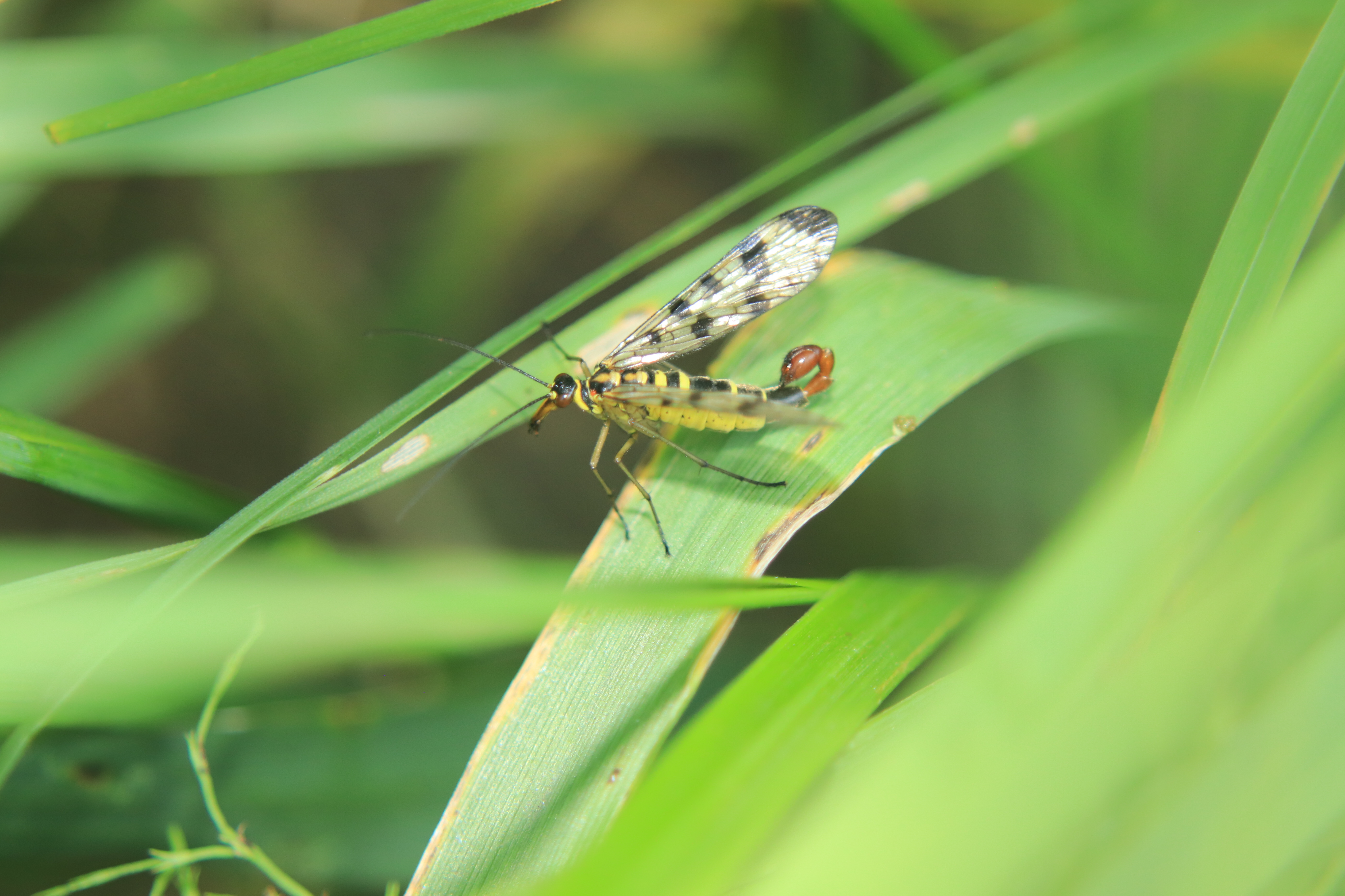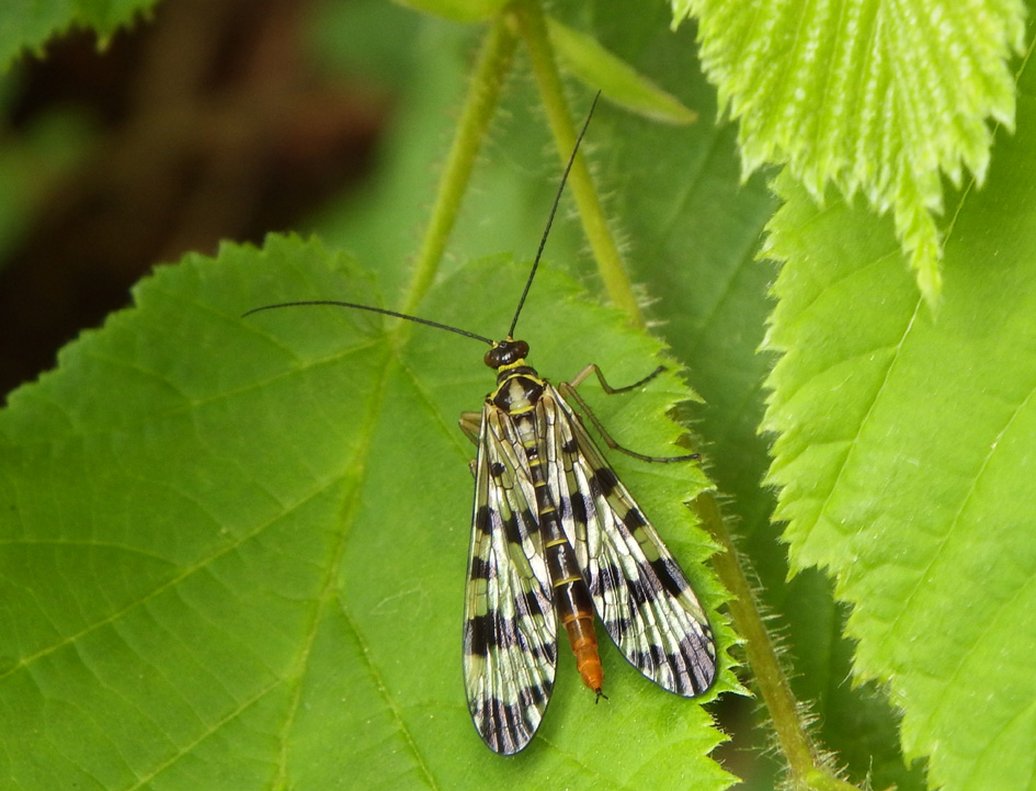 Skorpionsfliegen bei der Kopulation, (09.08.2010 im Tharandter Wald am Triebischsee). Das Männchen hält das Weibchen nicht nur mit dem zangenförmigen Abdominalfortsatz fest, sondern hat seine Flügel noch so über die des Weibchens gelegt, dass ein Fortfliegen unmöglich ist. Die Hochzeit findet an einer toten Raupe (von Gregärparasiten befallen) statt, an denen die Adulten Nahrung aufnehmen
