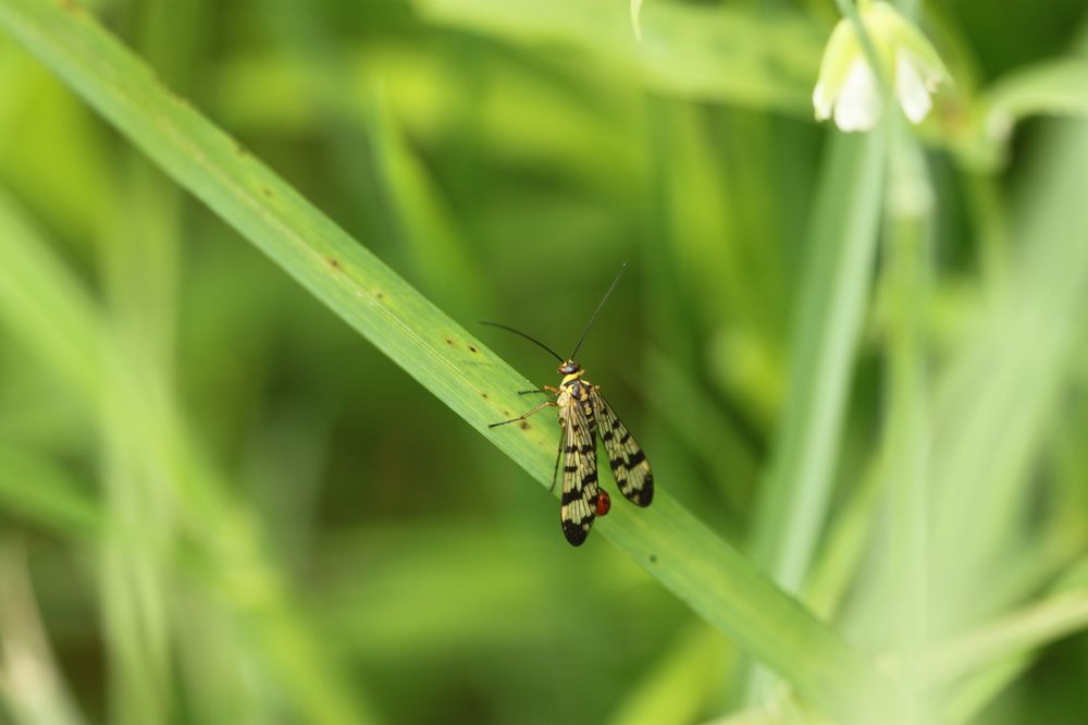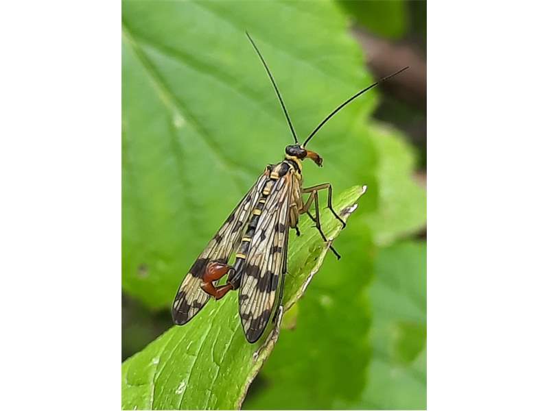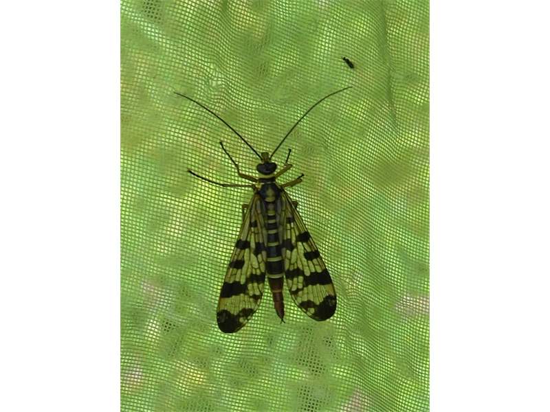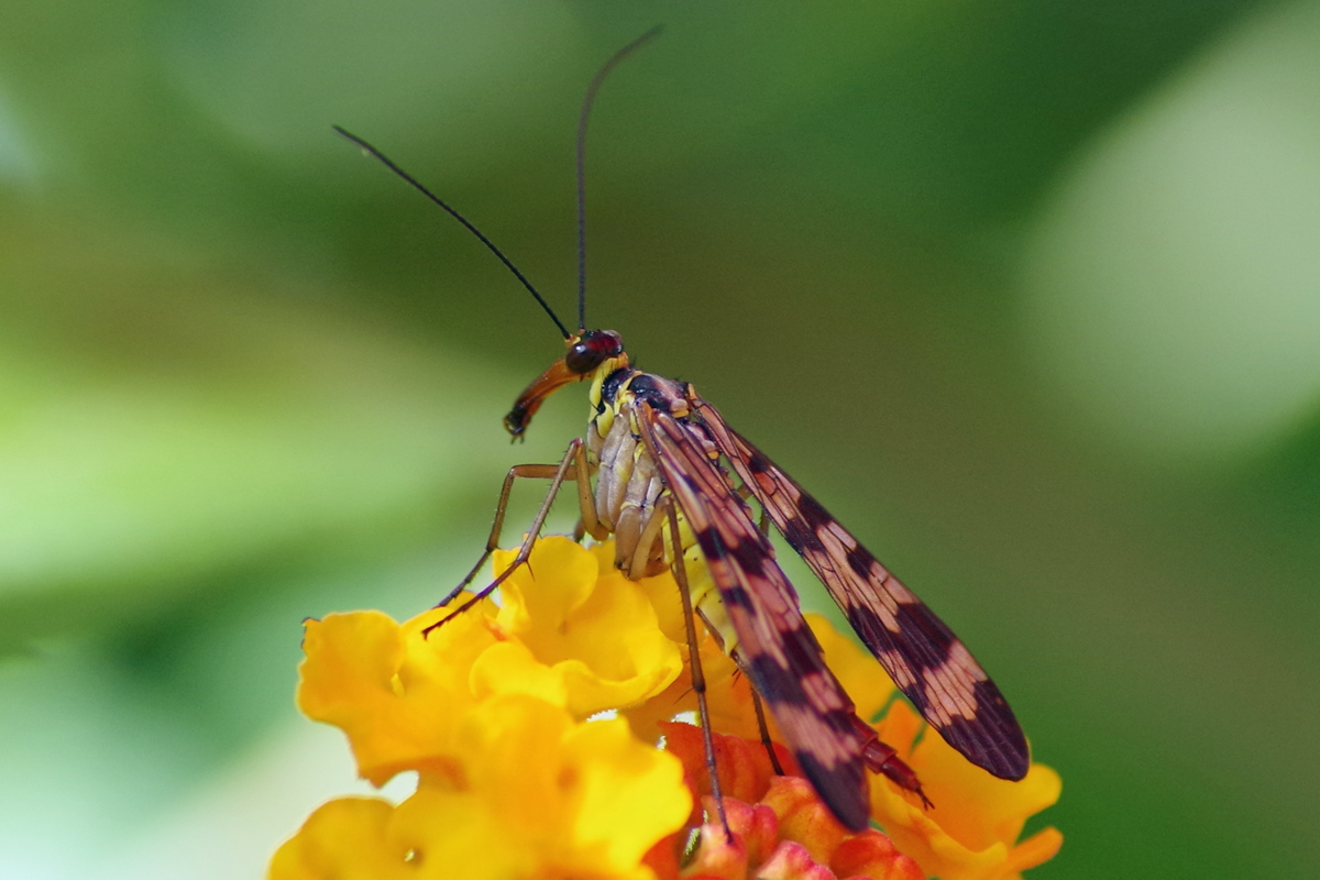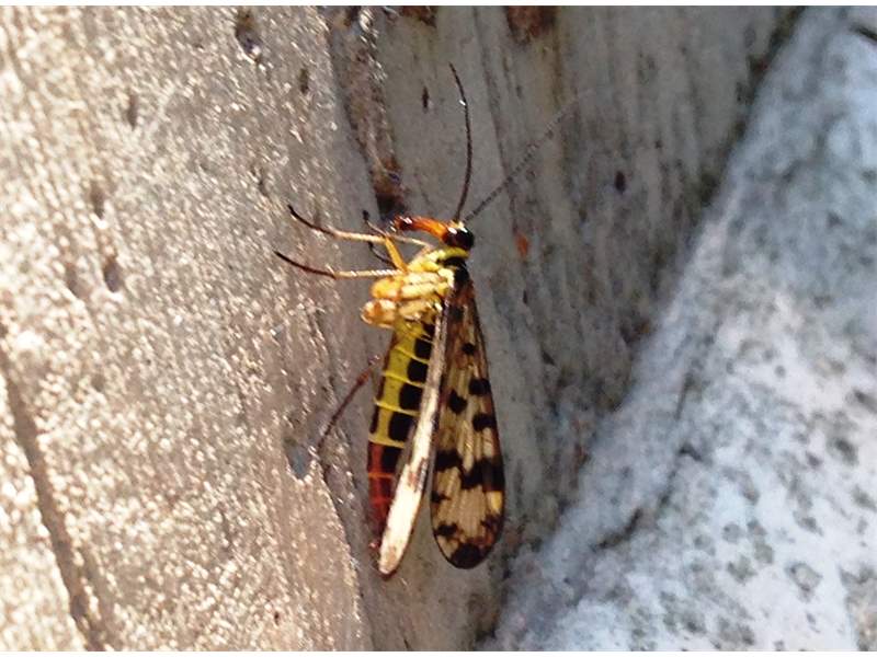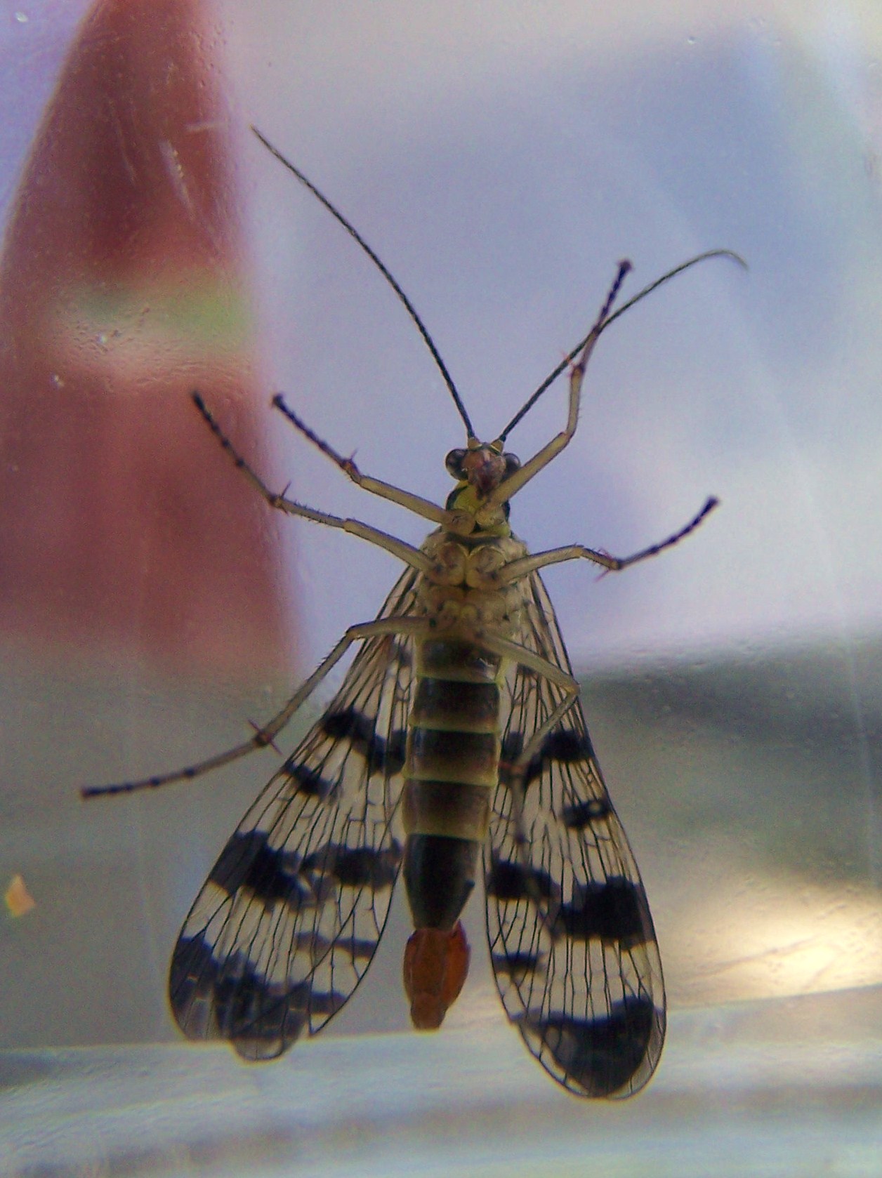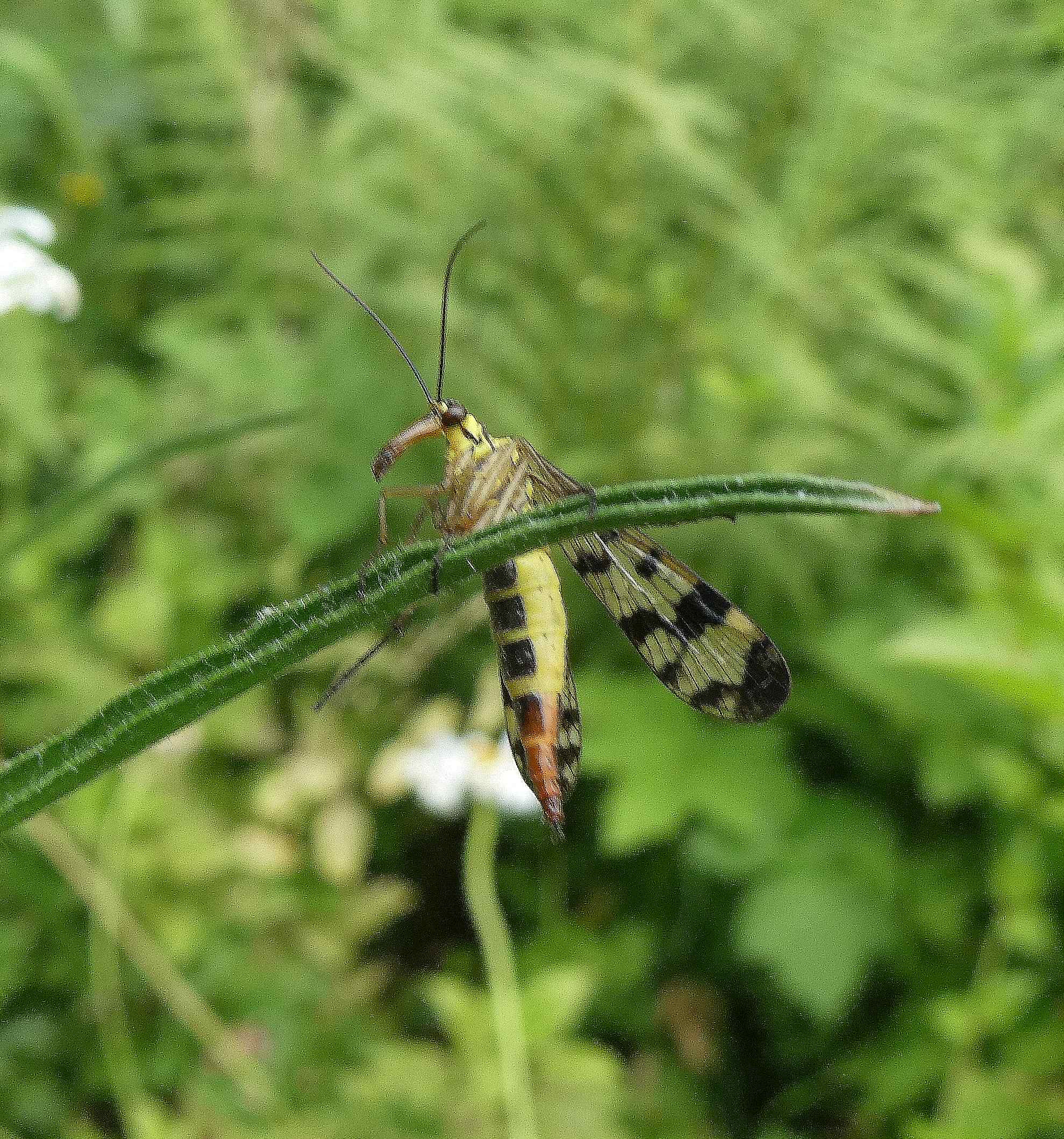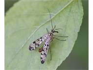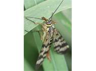 Skorpionsfliegen bei der Kopulation, (09.08.2010 im Tharandter Wald am Triebischsee). Das Männchen hält das Weibchen nicht nur mit dem zangenförmigen Abdominalfortsatz fest, sondern hat seine Flügel noch so über die des Weibchens gelegt, dass ein Fortfliegen unmöglich ist. Die Hochzeit findet an einer toten Raupe (von Gregärparasiten befallen) statt, an denen die Adulten Nahrung aufnehmen
