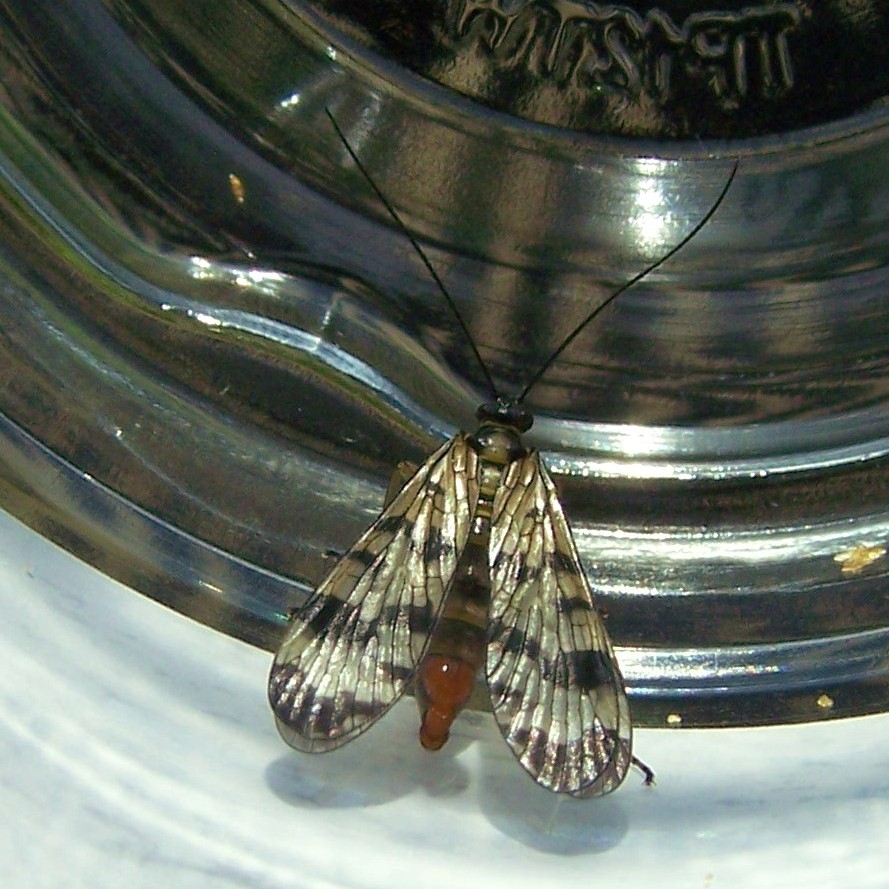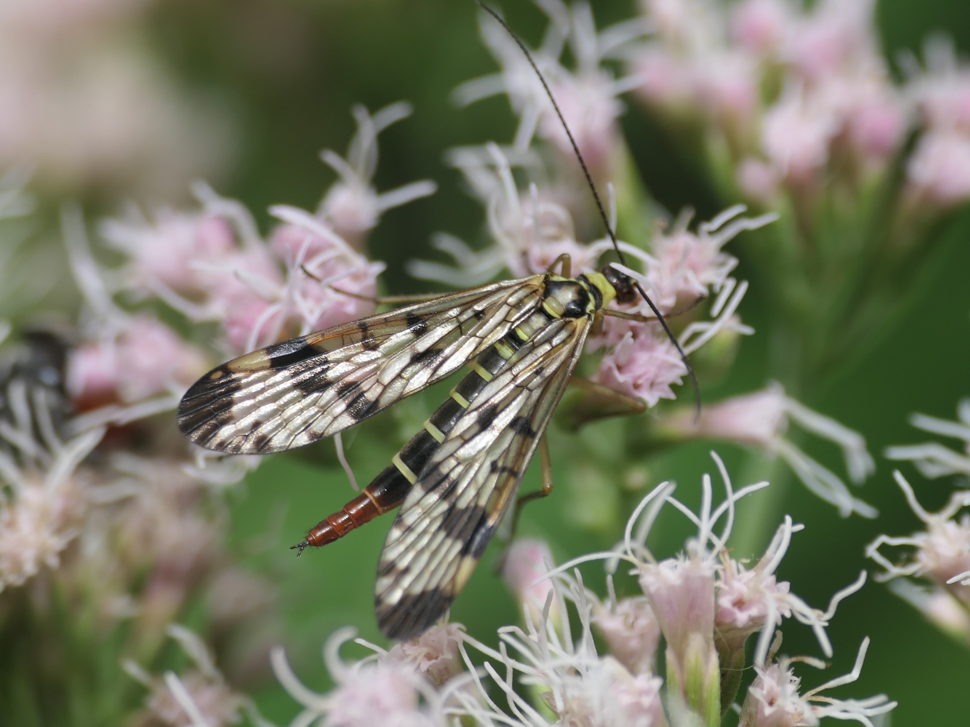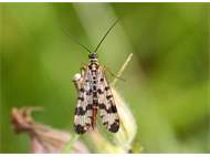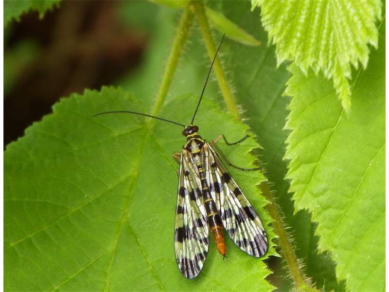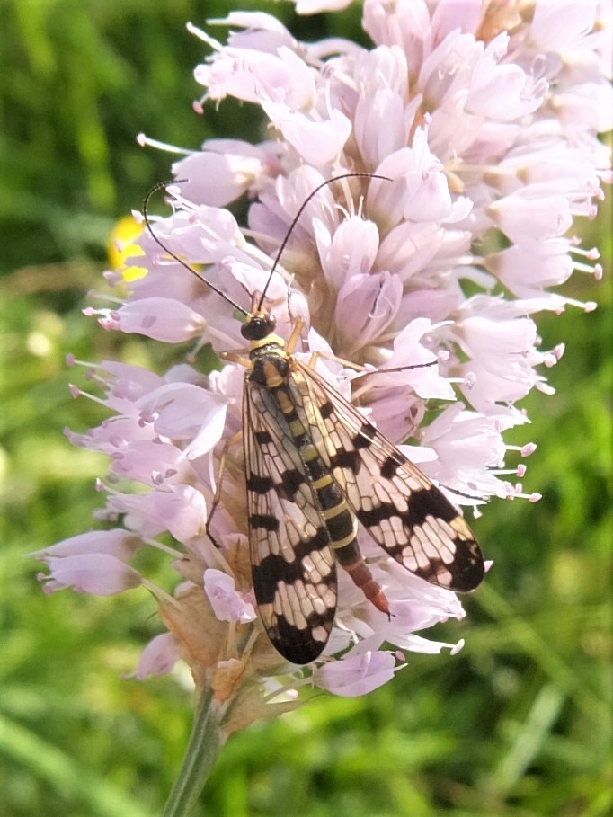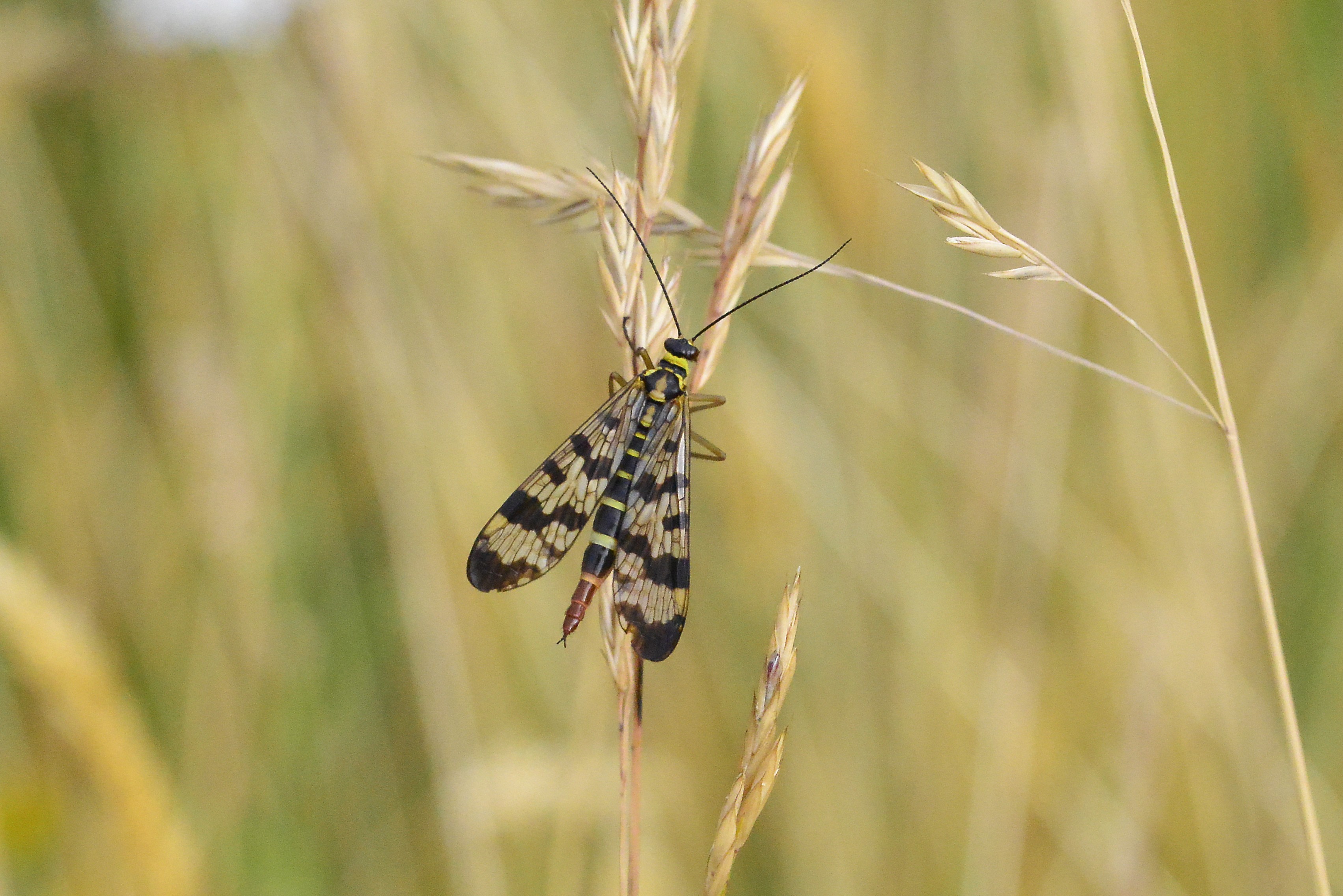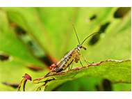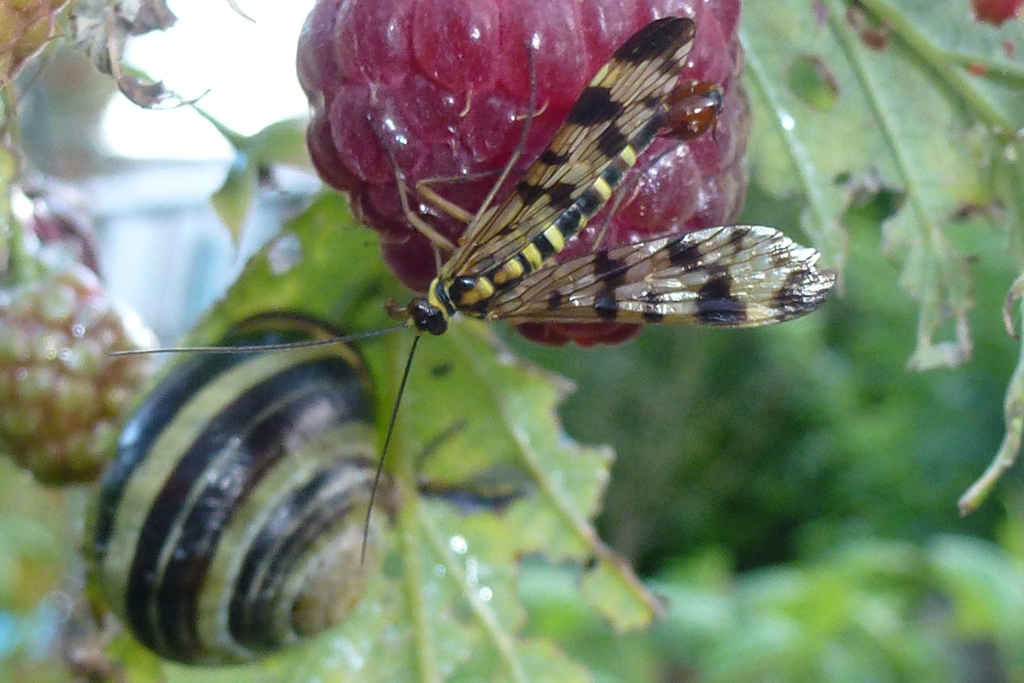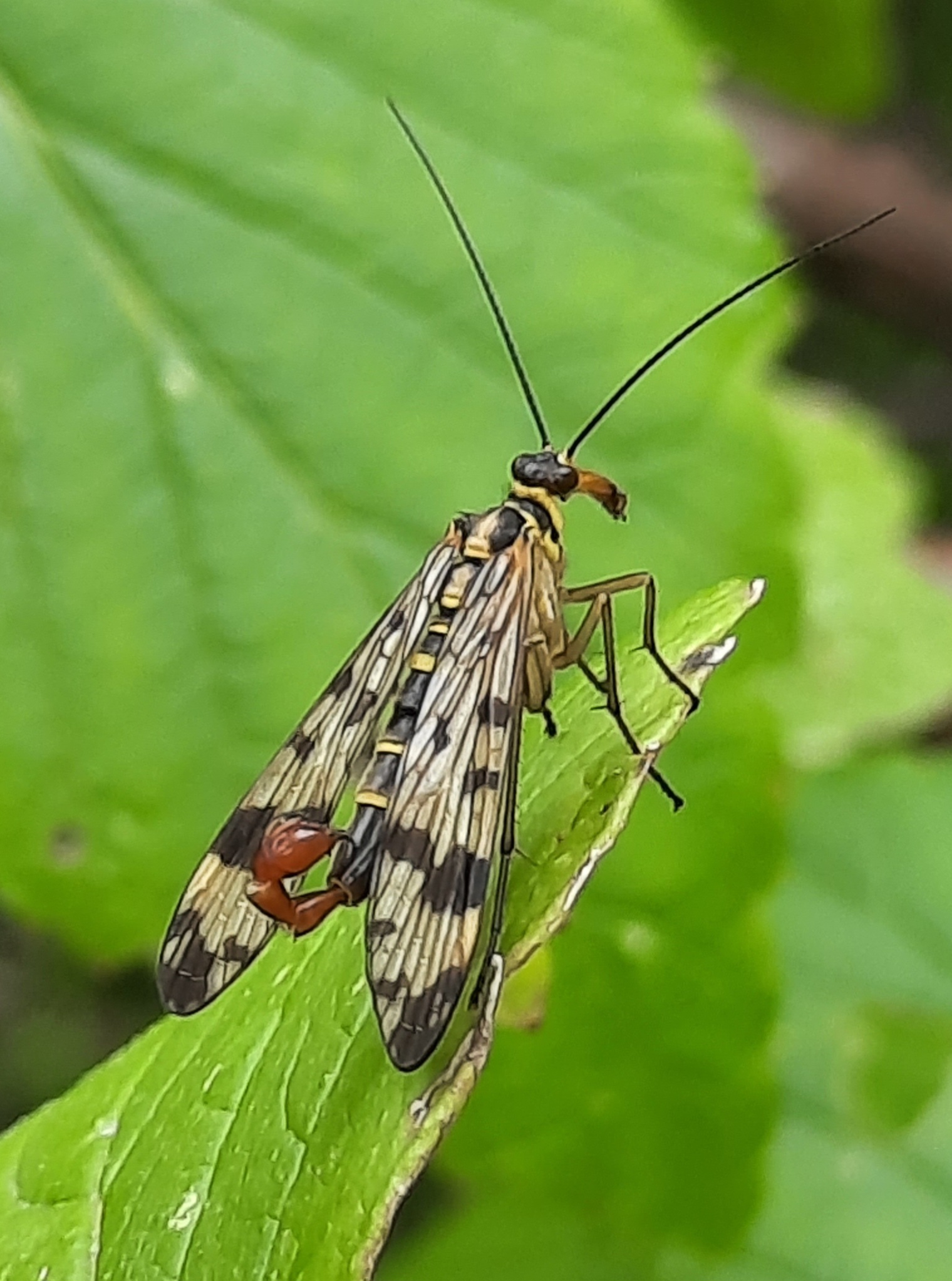 Skorpionsfliegen bei der Kopulation, (09.08.2010 im Tharandter Wald am Triebischsee). Das Männchen hält das Weibchen nicht nur mit dem zangenförmigen Abdominalfortsatz fest, sondern hat seine Flügel noch so über die des Weibchens gelegt, dass ein Fortfliegen unmöglich ist. Die Hochzeit findet an einer toten Raupe (von Gregärparasiten befallen) statt, an denen die Adulten Nahrung aufnehmen