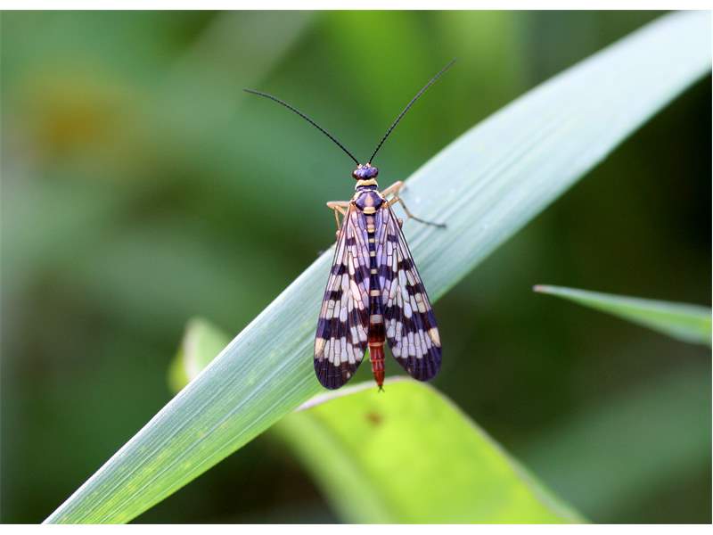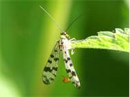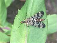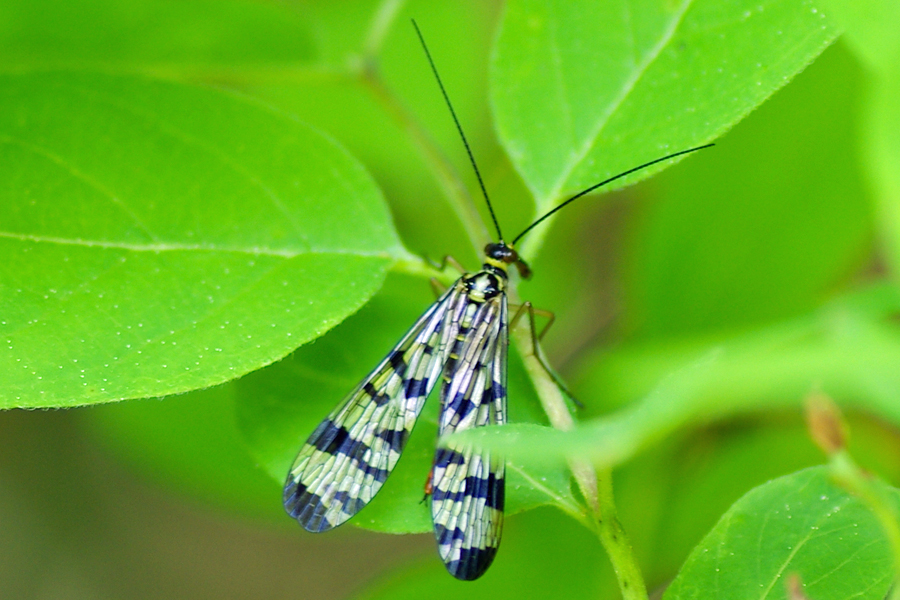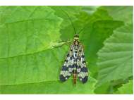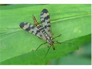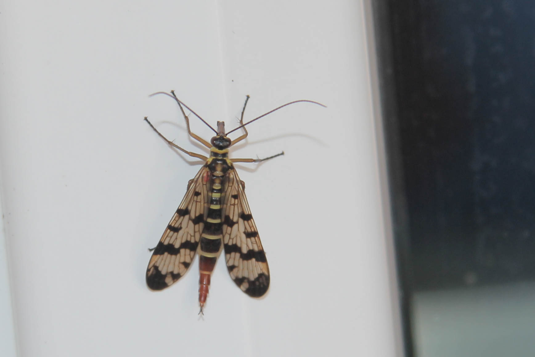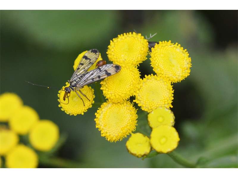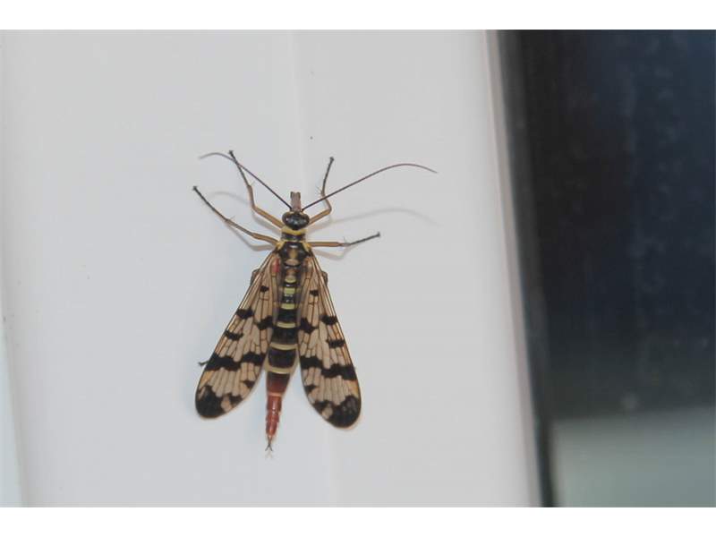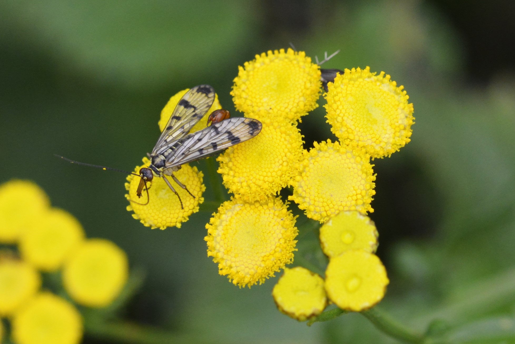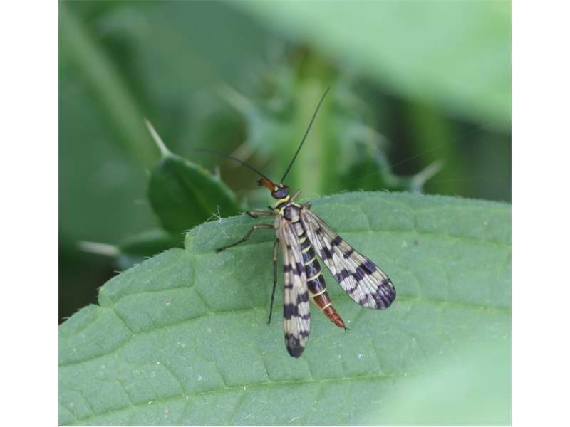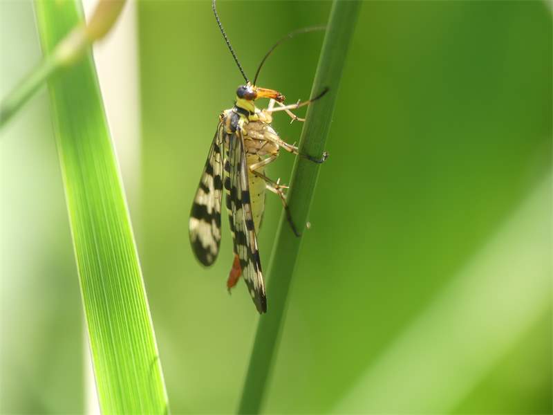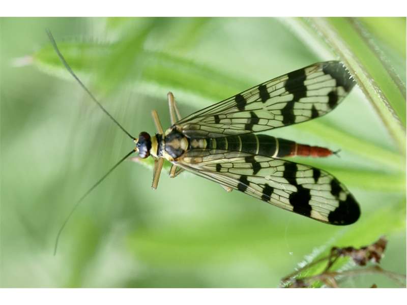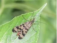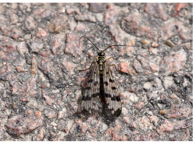 Skorpionsfliegen bei der Kopulation, (09.08.2010 im Tharandter Wald am Triebischsee). Das Männchen hält das Weibchen nicht nur mit dem zangenförmigen Abdominalfortsatz fest, sondern hat seine Flügel noch so über die des Weibchens gelegt, dass ein Fortfliegen unmöglich ist. Die Hochzeit findet an einer toten Raupe (von Gregärparasiten befallen) statt, an denen die Adulten Nahrung aufnehmen