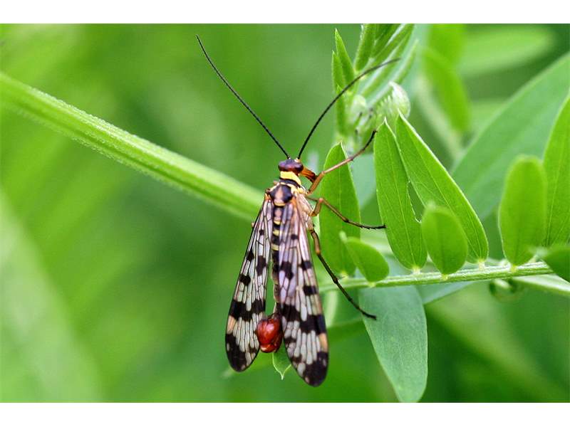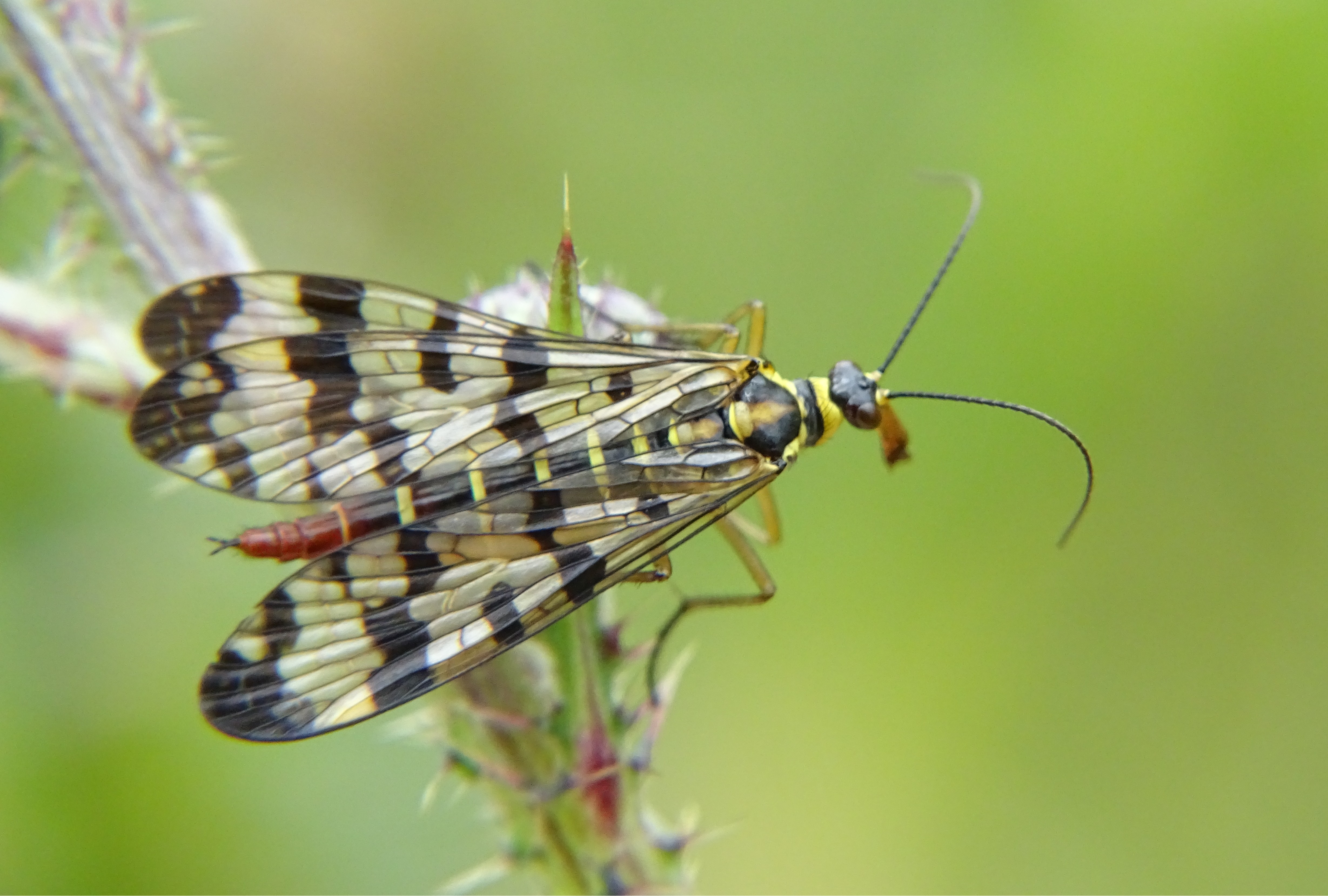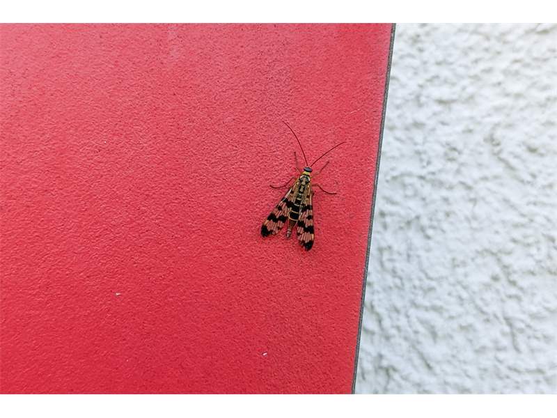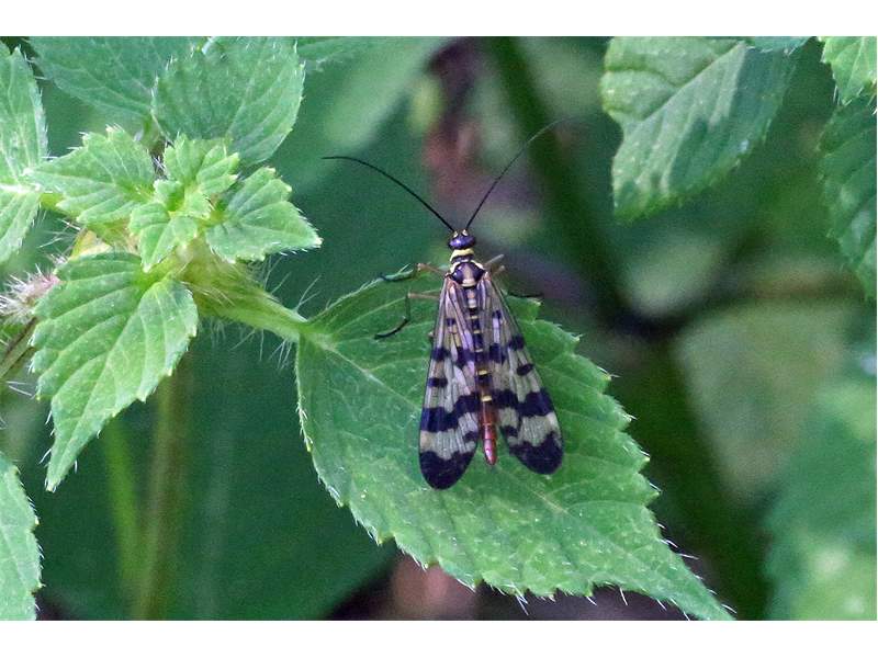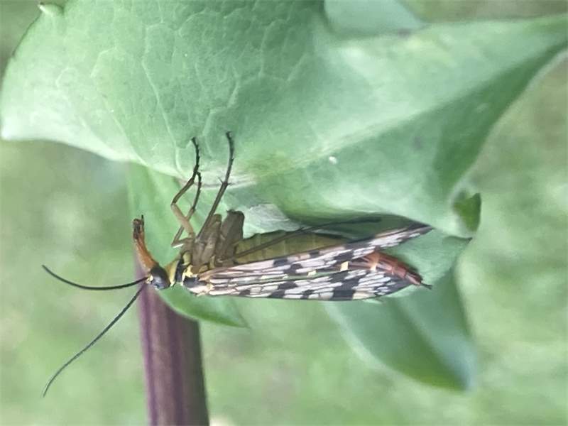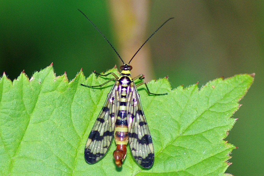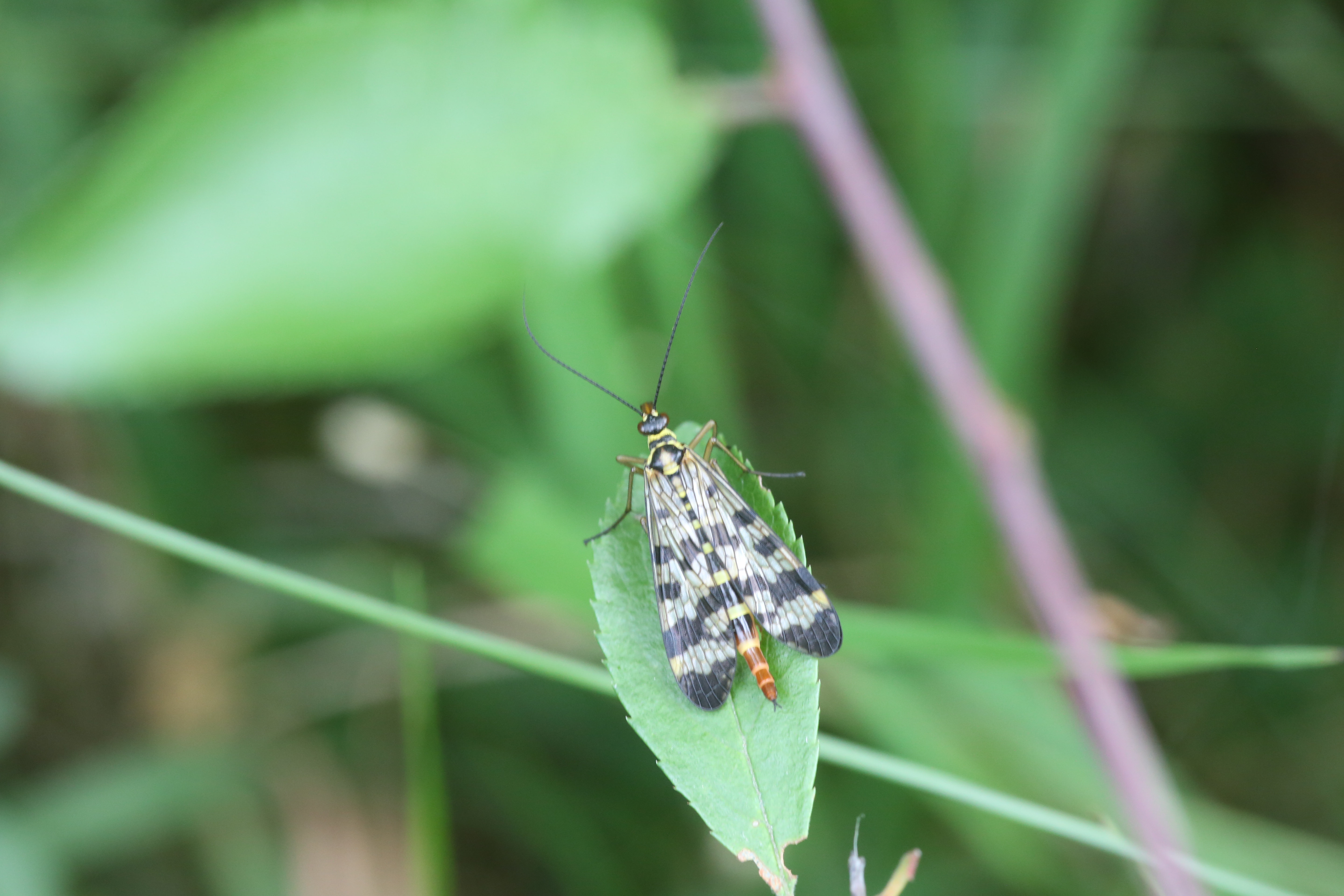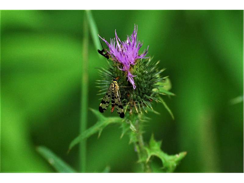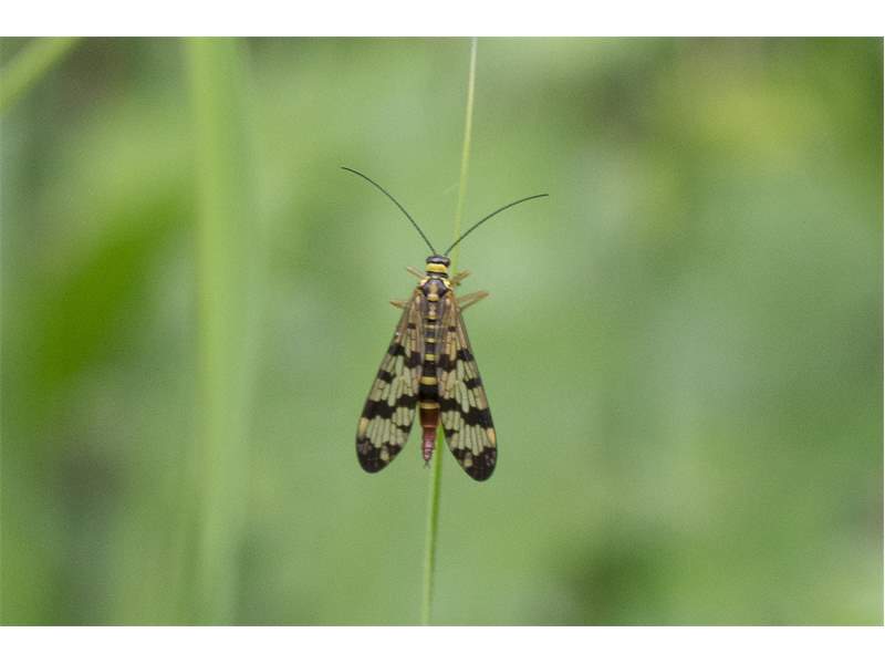 Skorpionsfliegen bei der Kopulation, (09.08.2010 im Tharandter Wald am Triebischsee). Das Männchen hält das Weibchen nicht nur mit dem zangenförmigen Abdominalfortsatz fest, sondern hat seine Flügel noch so über die des Weibchens gelegt, dass ein Fortfliegen unmöglich ist. Die Hochzeit findet an einer toten Raupe (von Gregärparasiten befallen) statt, an denen die Adulten Nahrung aufnehmen