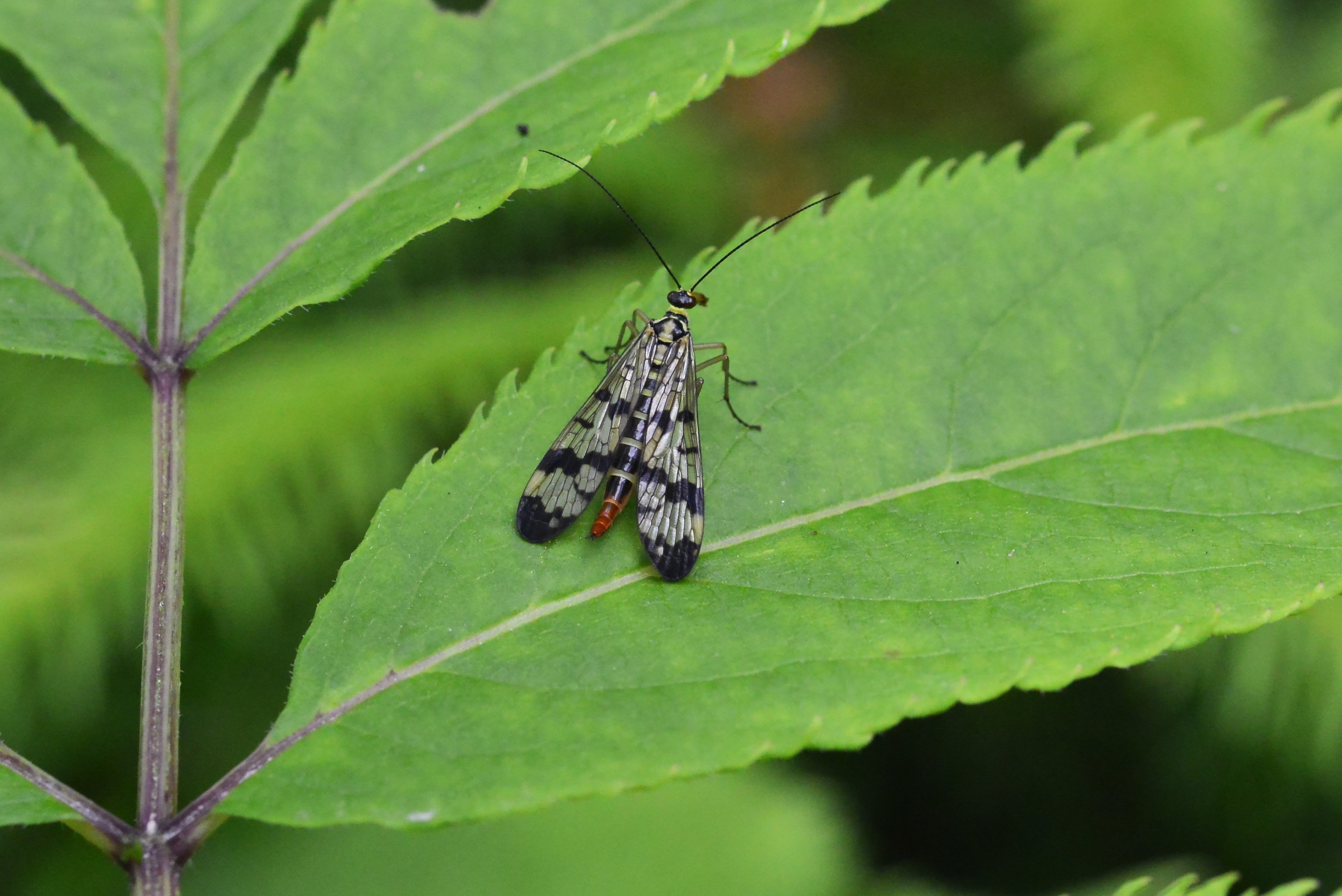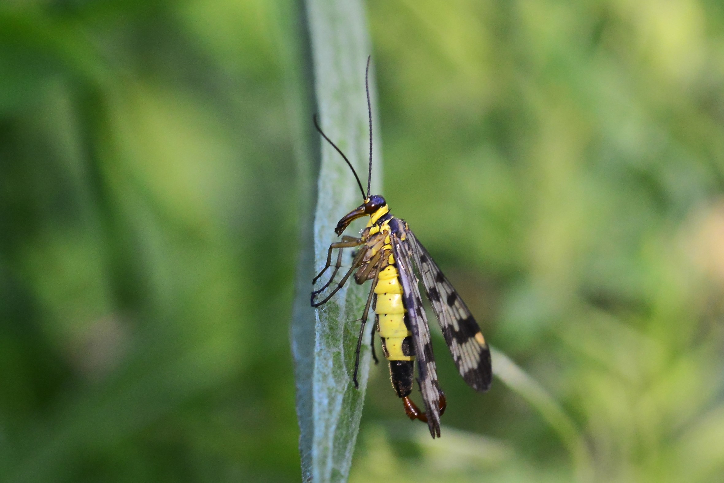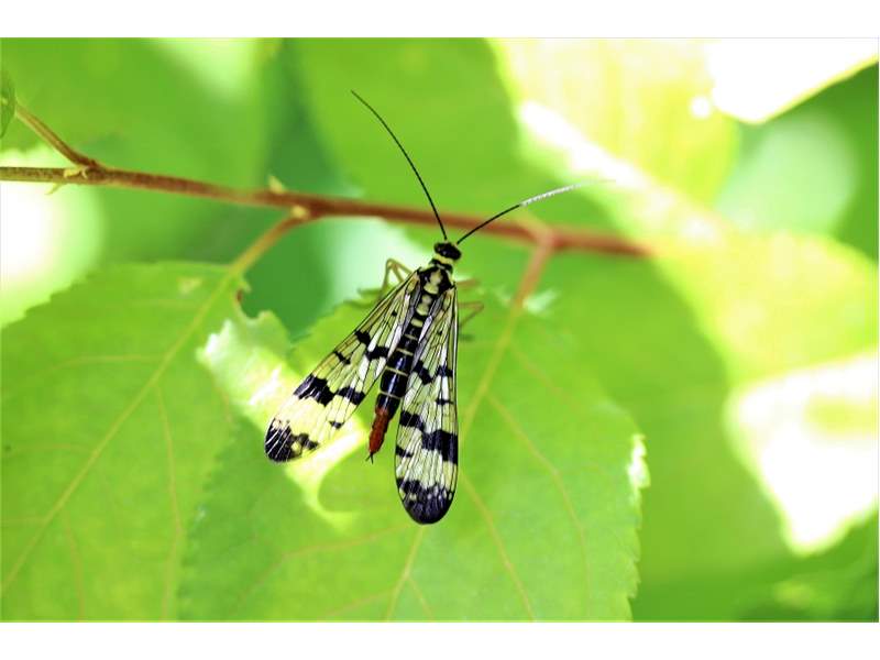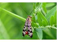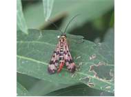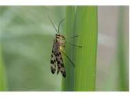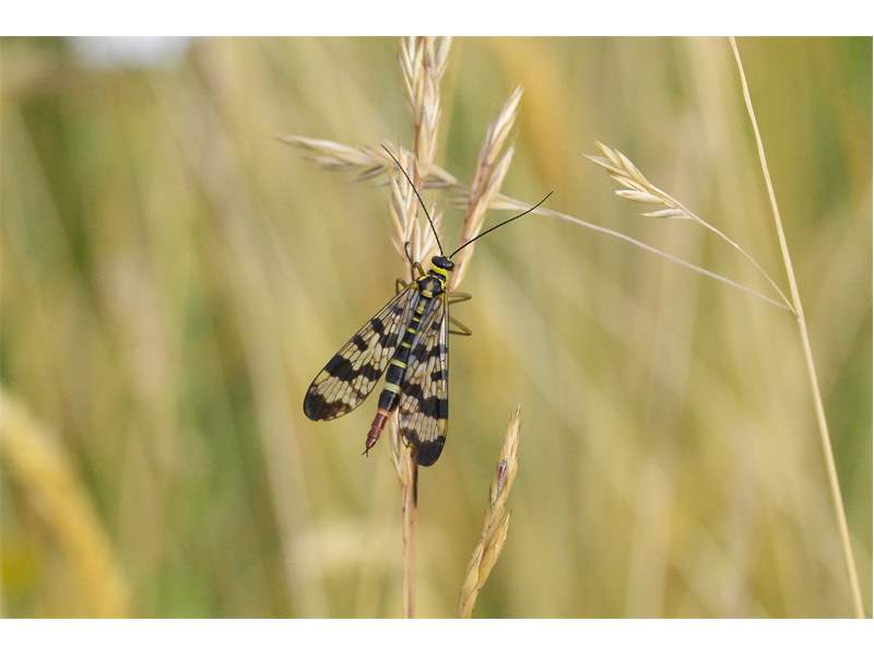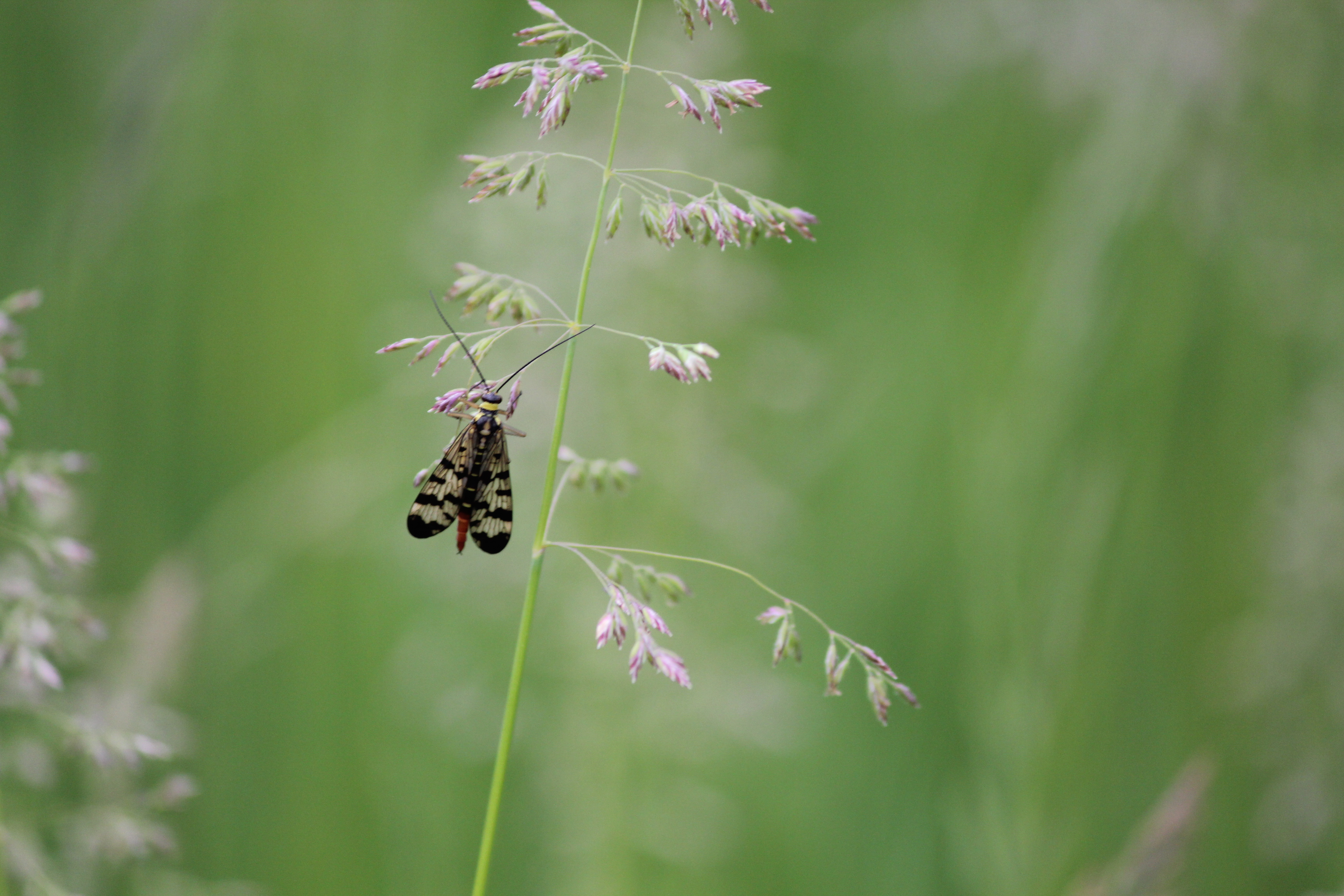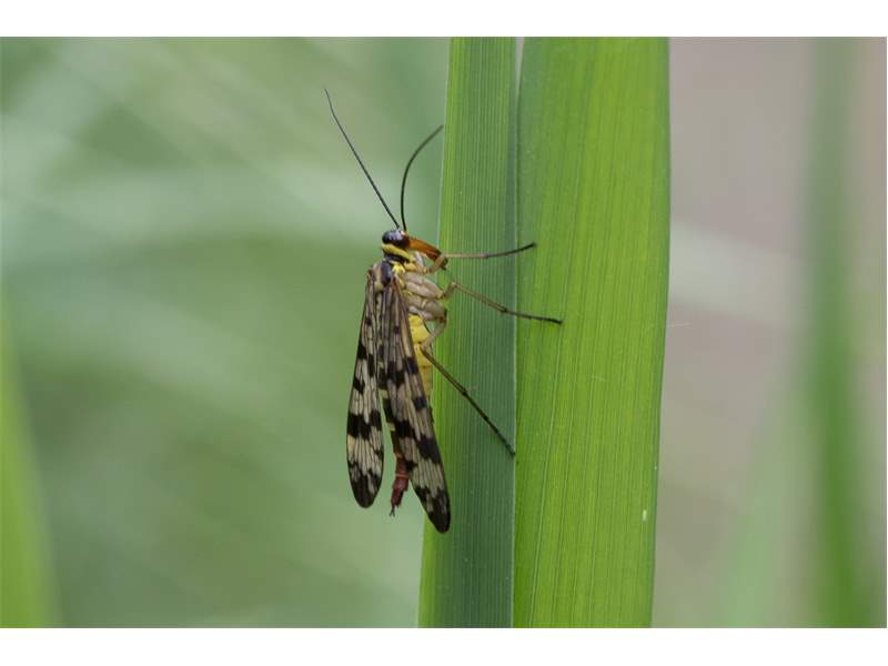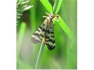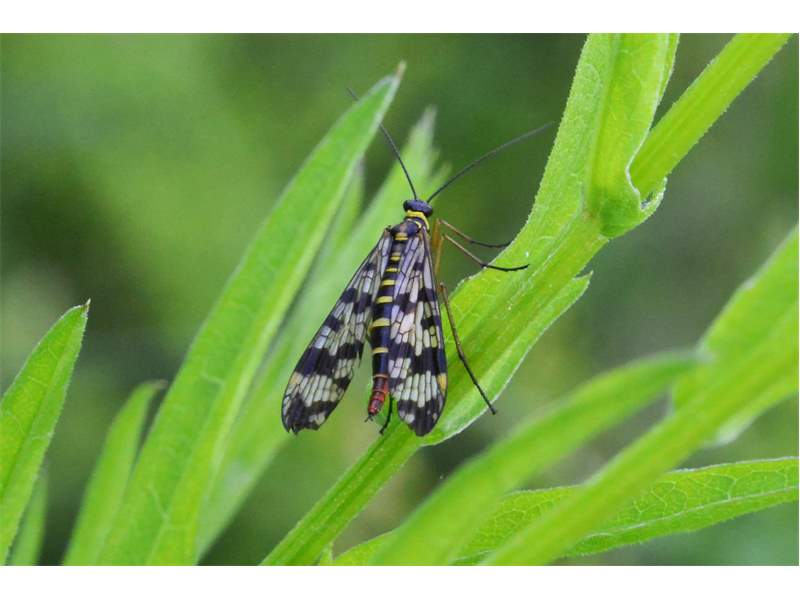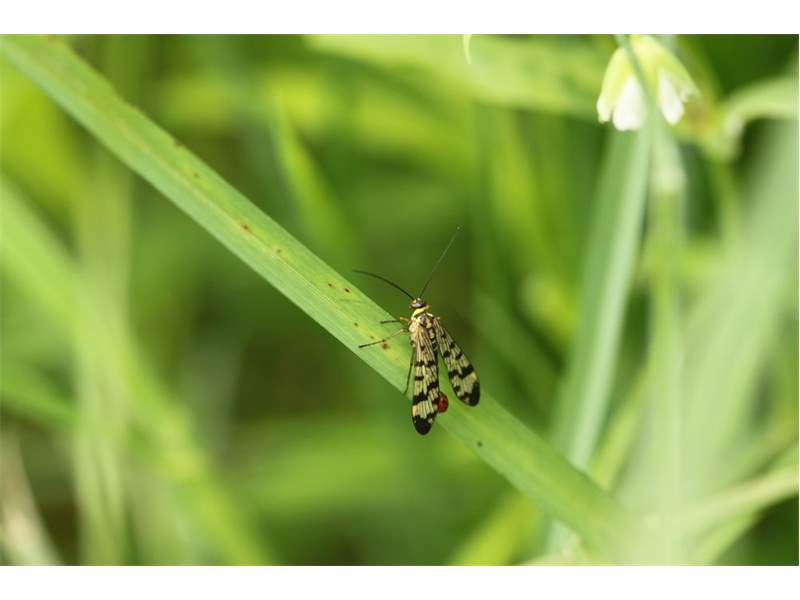 Skorpionsfliegen bei der Kopulation, (09.08.2010 im Tharandter Wald am Triebischsee). Das Männchen hält das Weibchen nicht nur mit dem zangenförmigen Abdominalfortsatz fest, sondern hat seine Flügel noch so über die des Weibchens gelegt, dass ein Fortfliegen unmöglich ist. Die Hochzeit findet an einer toten Raupe (von Gregärparasiten befallen) statt, an denen die Adulten Nahrung aufnehmen
