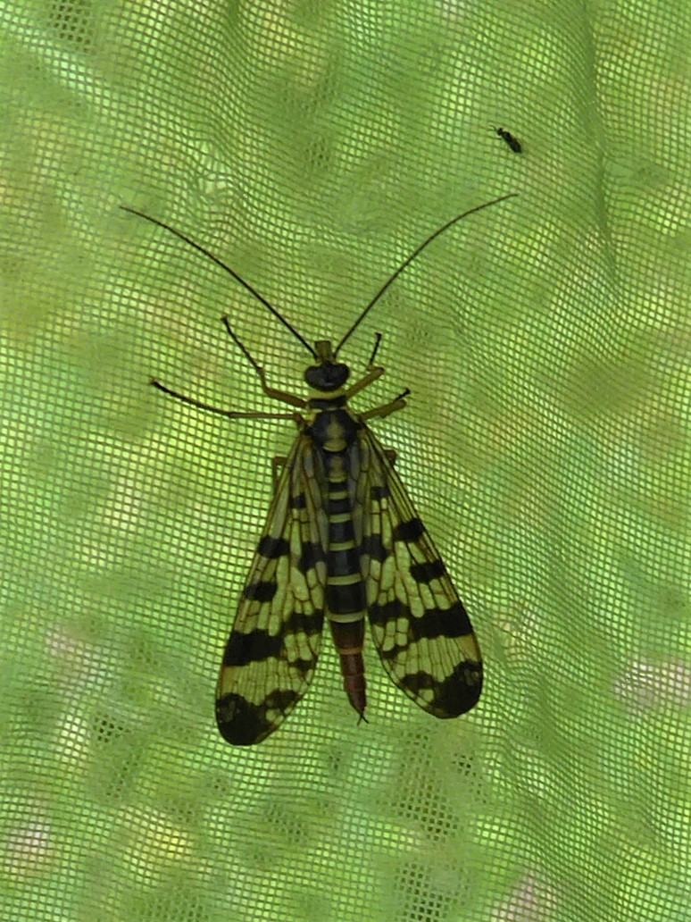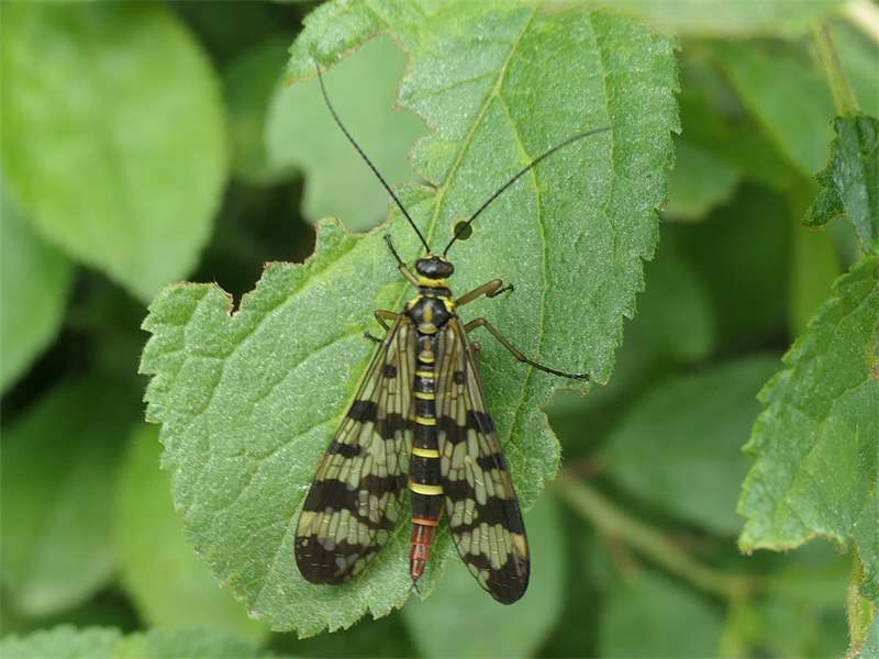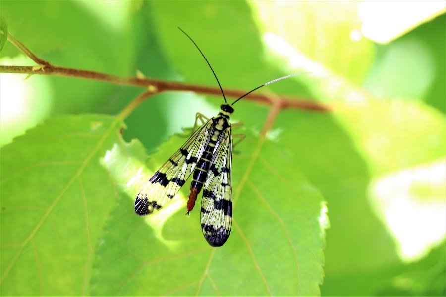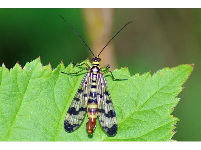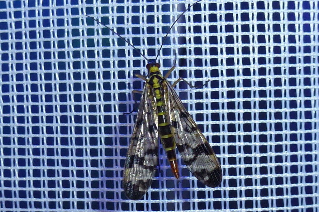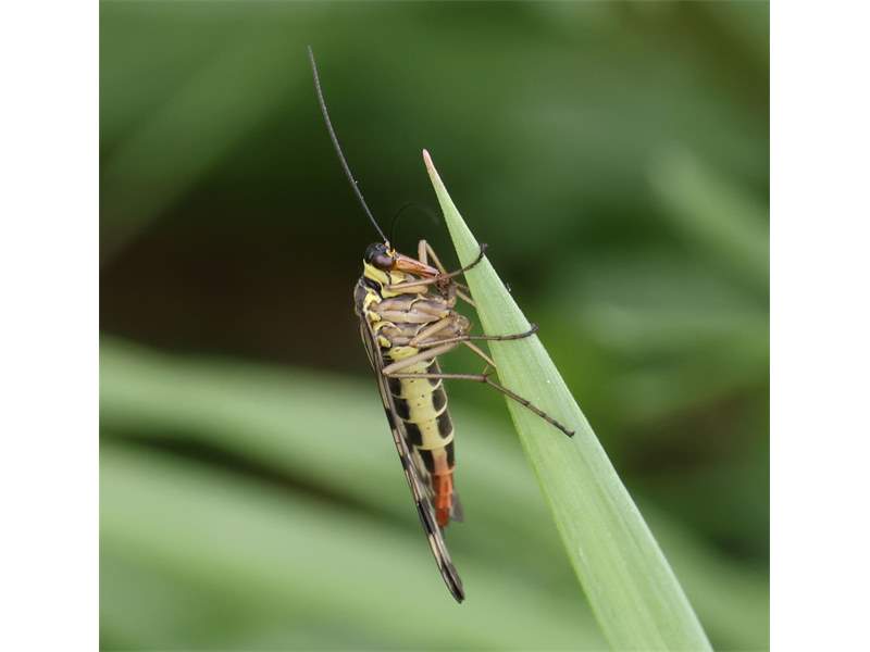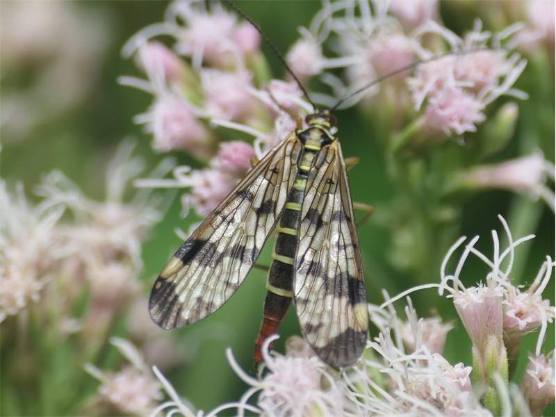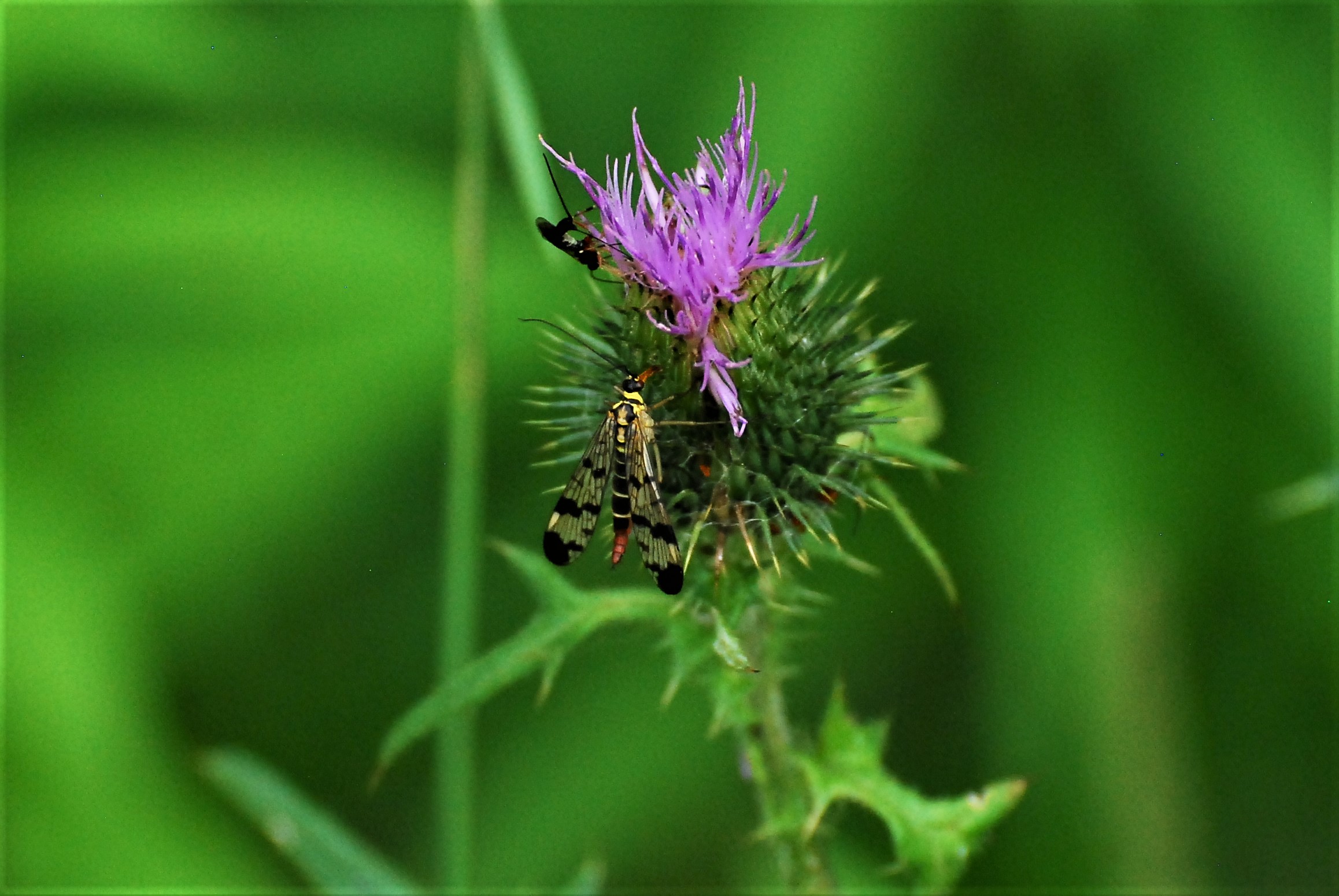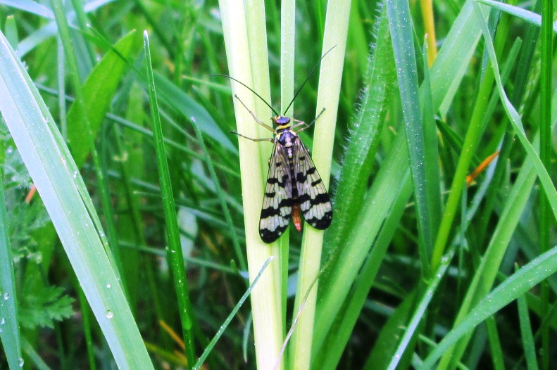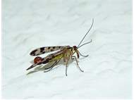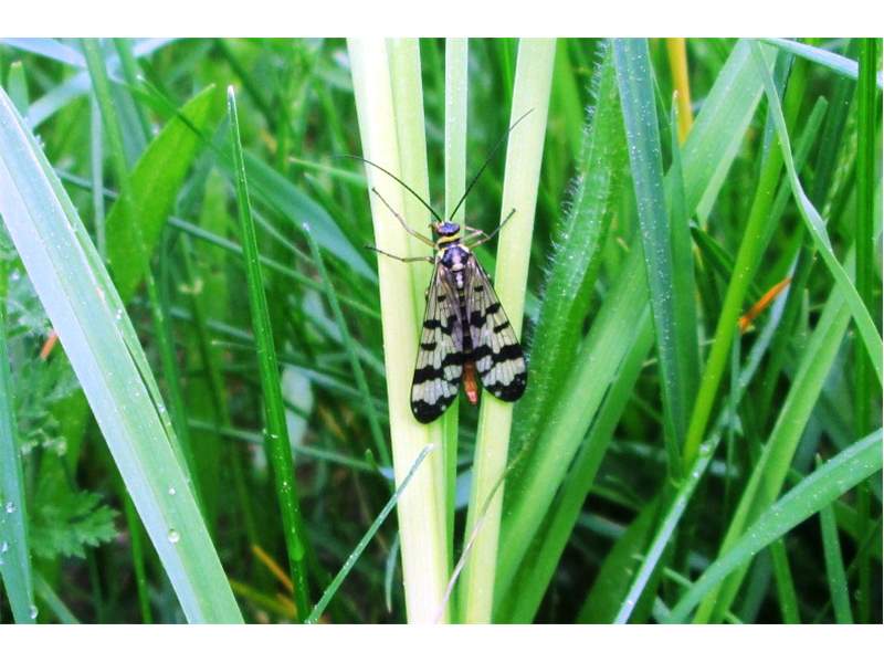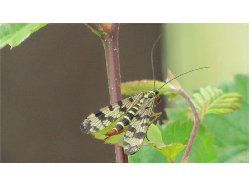 Skorpionsfliegen bei der Kopulation, (09.08.2010 im Tharandter Wald am Triebischsee). Das Männchen hält das Weibchen nicht nur mit dem zangenförmigen Abdominalfortsatz fest, sondern hat seine Flügel noch so über die des Weibchens gelegt, dass ein Fortfliegen unmöglich ist. Die Hochzeit findet an einer toten Raupe (von Gregärparasiten befallen) statt, an denen die Adulten Nahrung aufnehmen