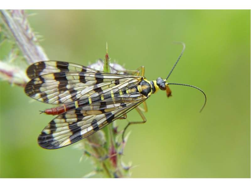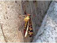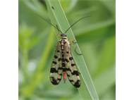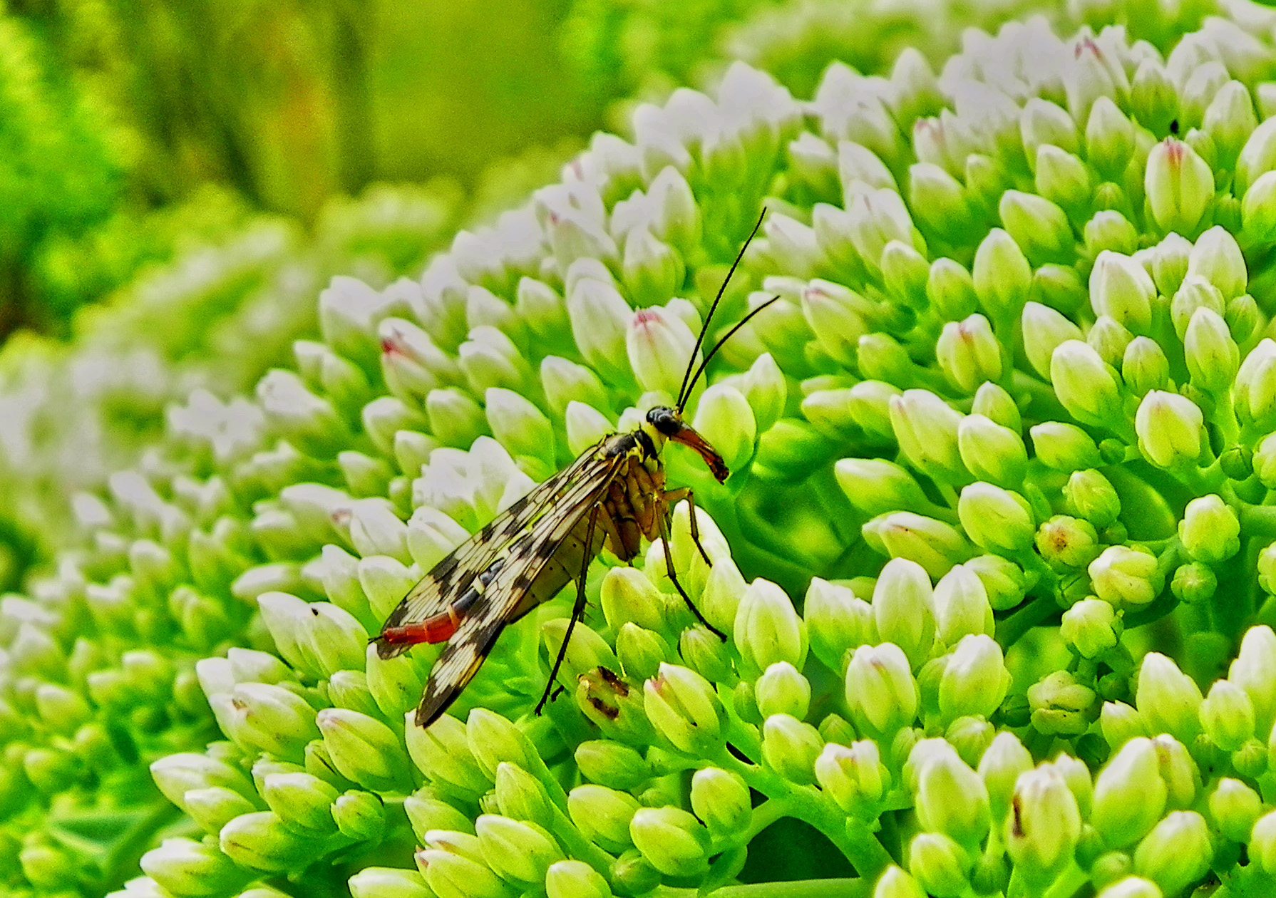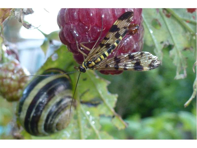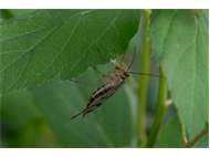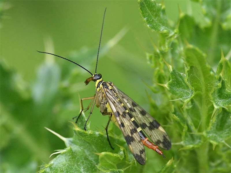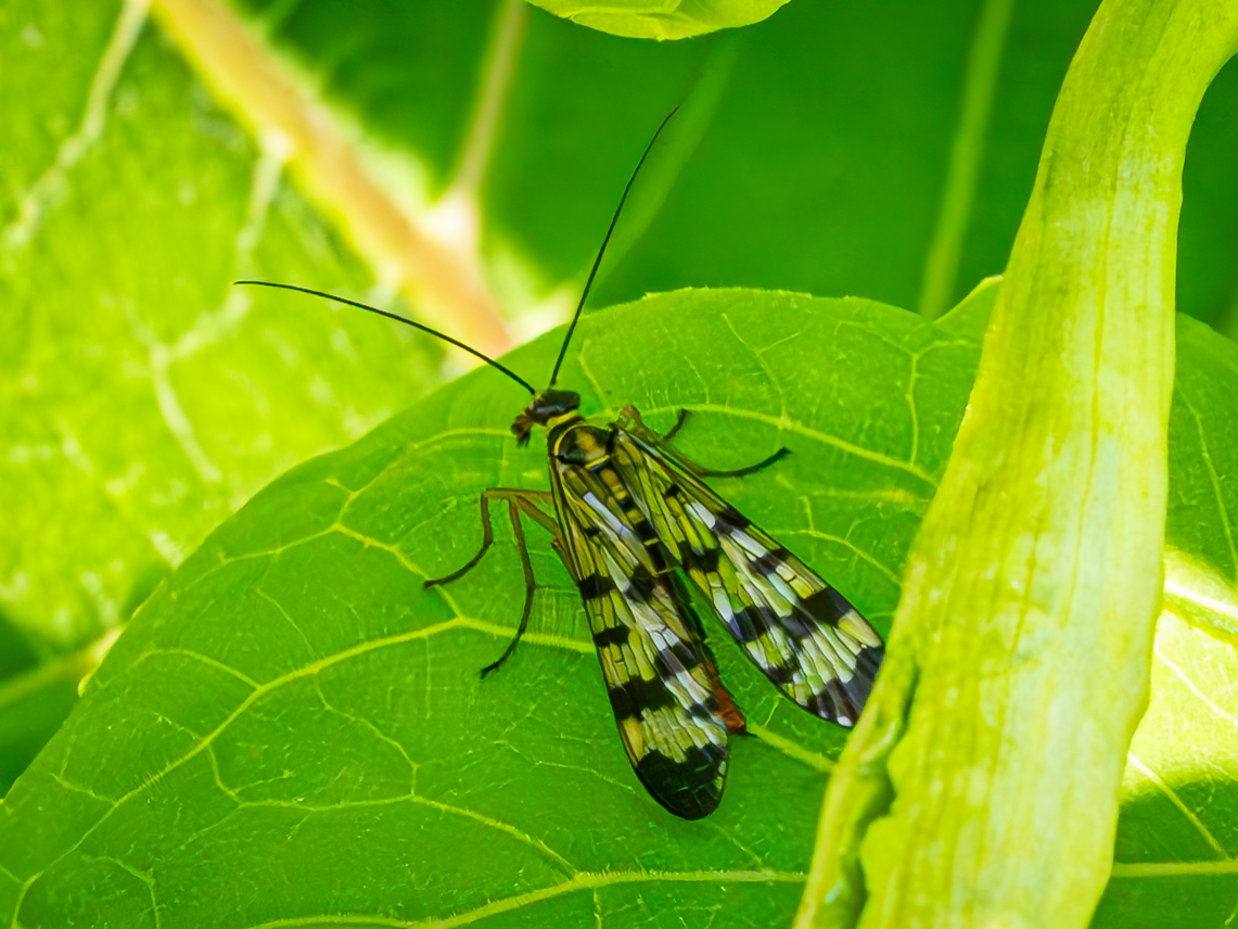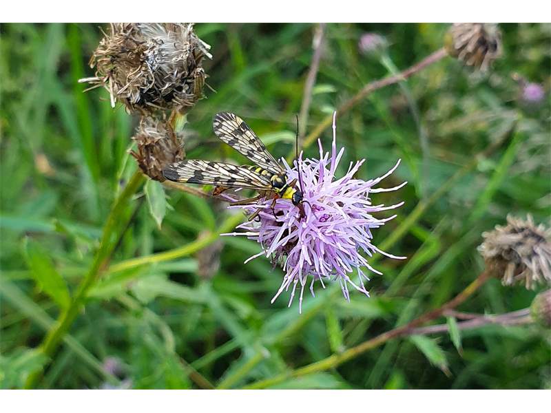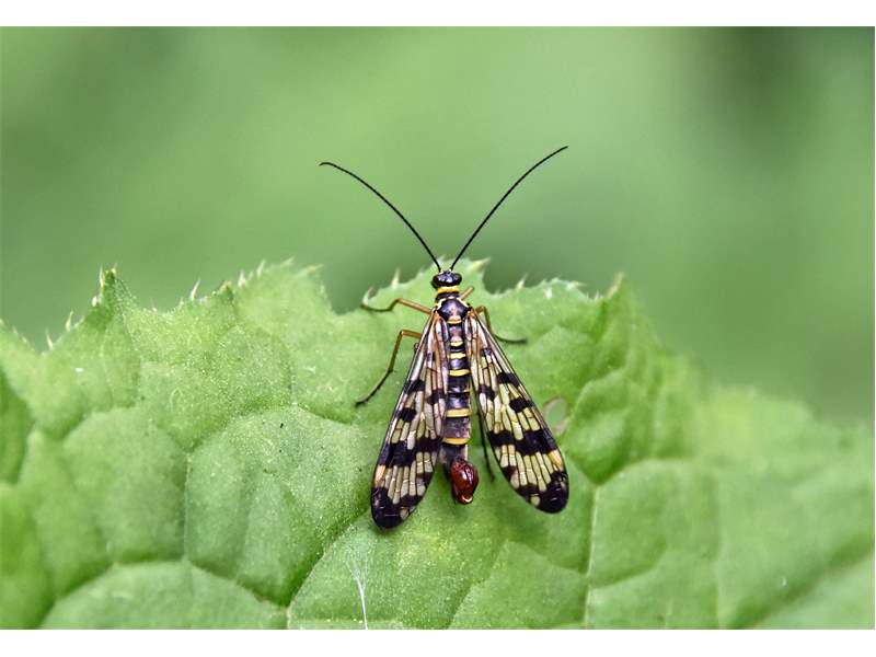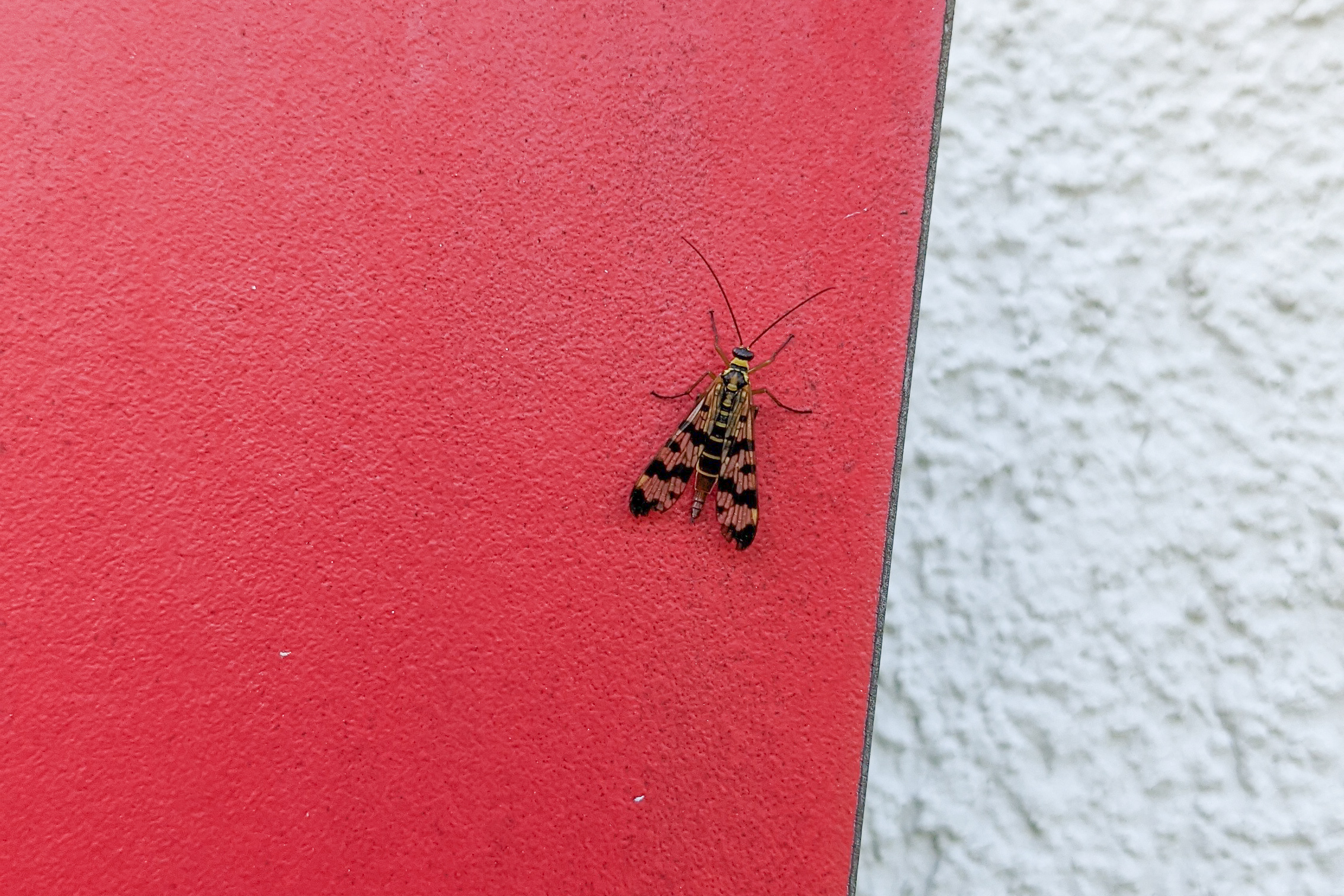Skorpionsfliegen bei der Kopulation, (09.08.2010 im Tharandter Wald am Triebischsee). Das Männchen hält das Weibchen nicht nur mit dem zangenförmigen Abdominalfortsatz fest, sondern hat seine Flügel noch so über die des Weibchens gelegt, dass ein Fortfliegen unmöglich ist. Die Hochzeit findet an einer toten Raupe (von Gregärparasiten befallen) statt, an denen die Adulten Nahrung aufnehmen