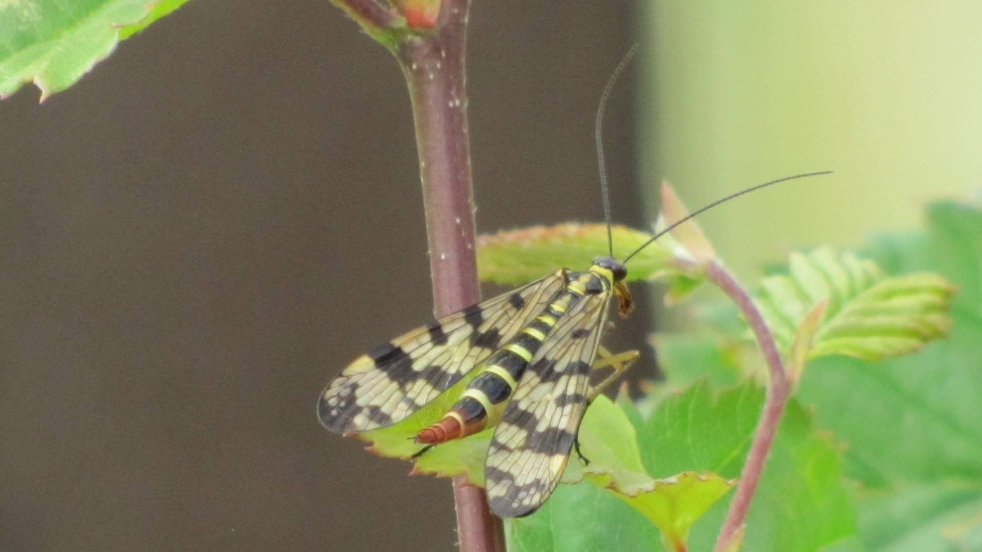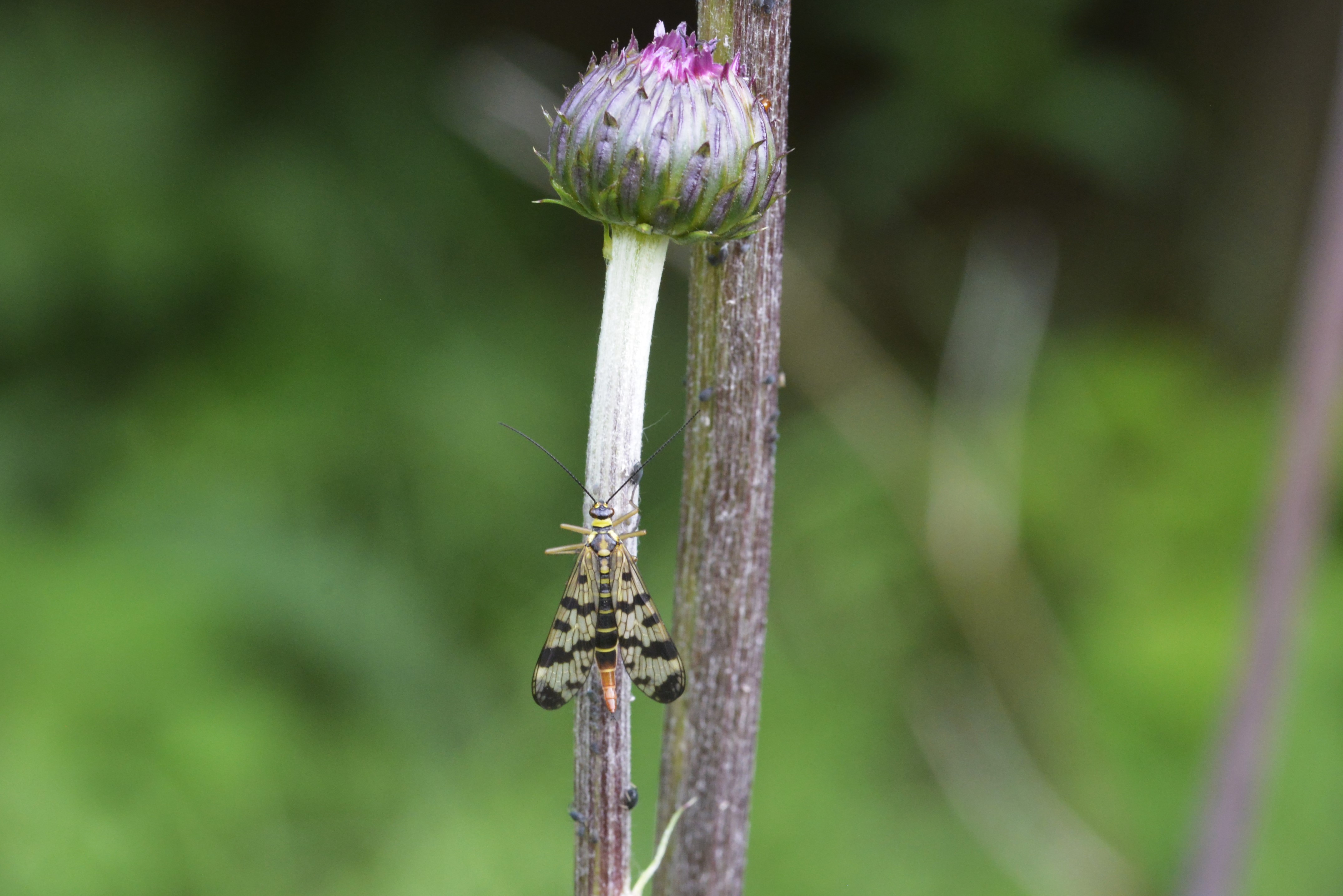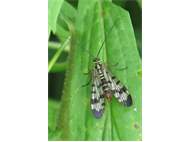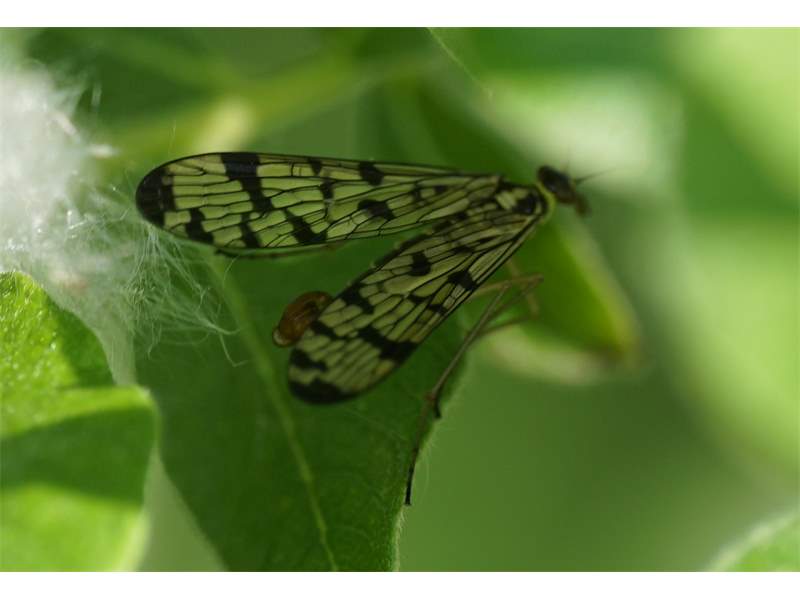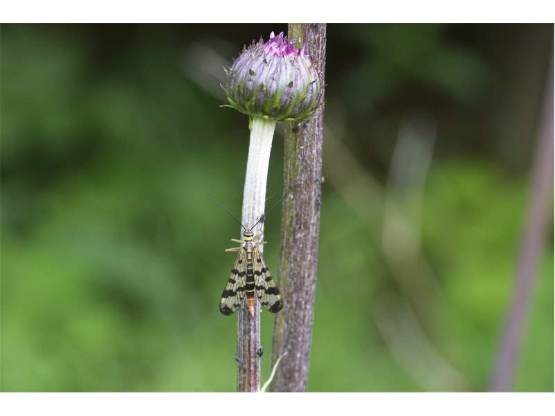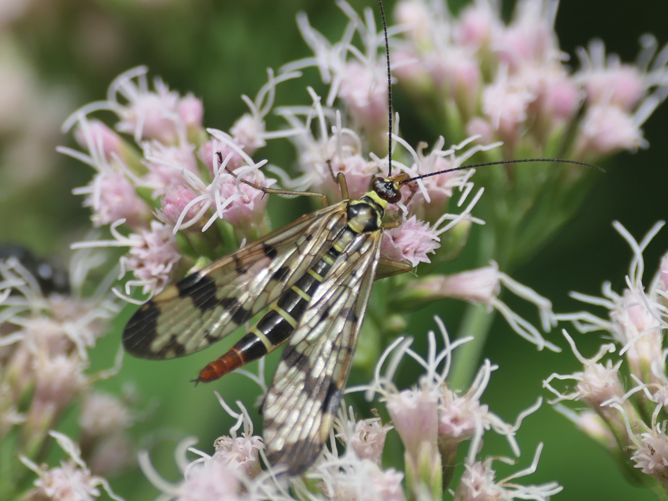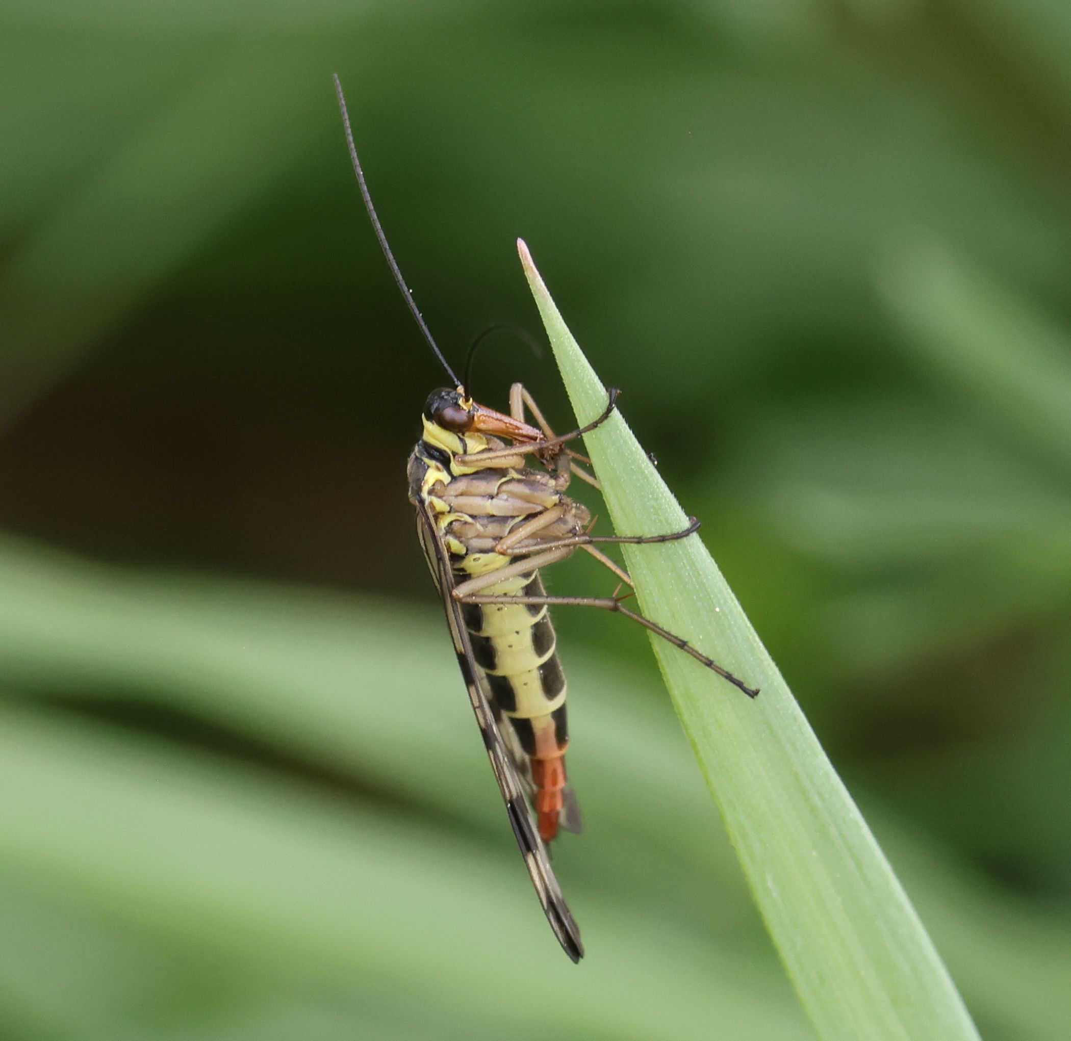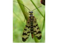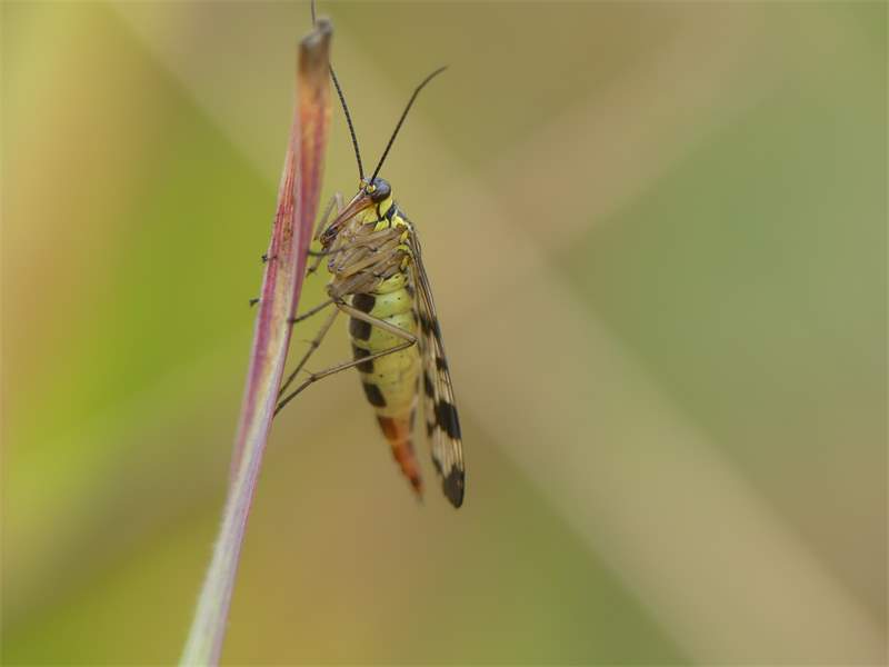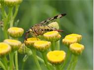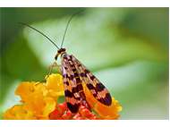 Skorpionsfliegen bei der Kopulation, (09.08.2010 im Tharandter Wald am Triebischsee). Das Männchen hält das Weibchen nicht nur mit dem zangenförmigen Abdominalfortsatz fest, sondern hat seine Flügel noch so über die des Weibchens gelegt, dass ein Fortfliegen unmöglich ist. Die Hochzeit findet an einer toten Raupe (von Gregärparasiten befallen) statt, an denen die Adulten Nahrung aufnehmen