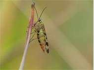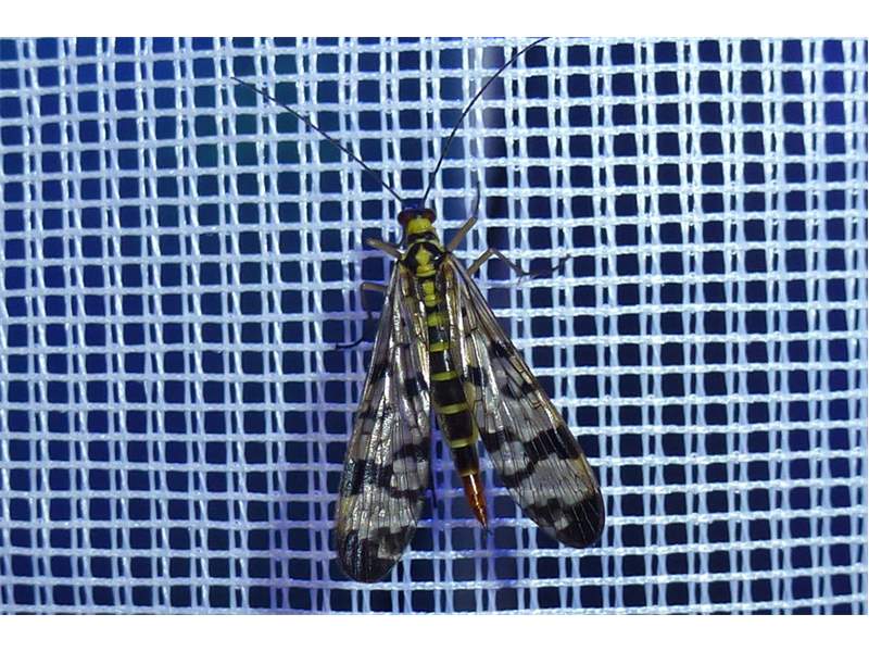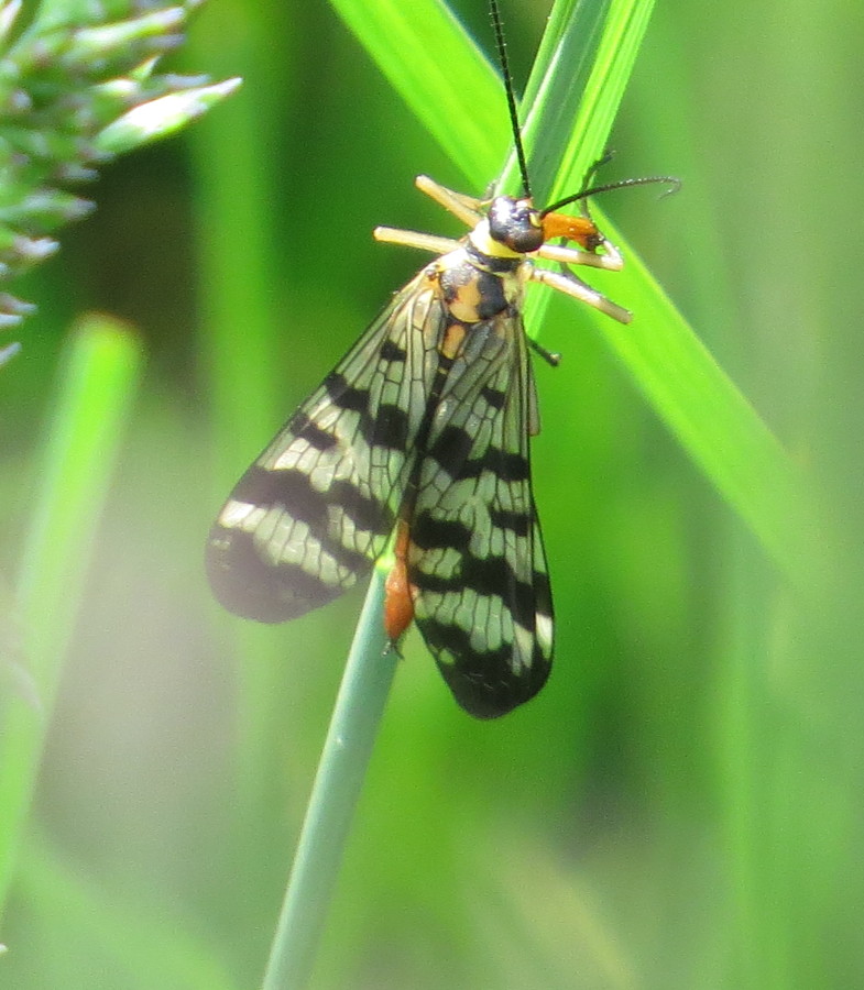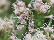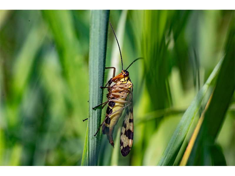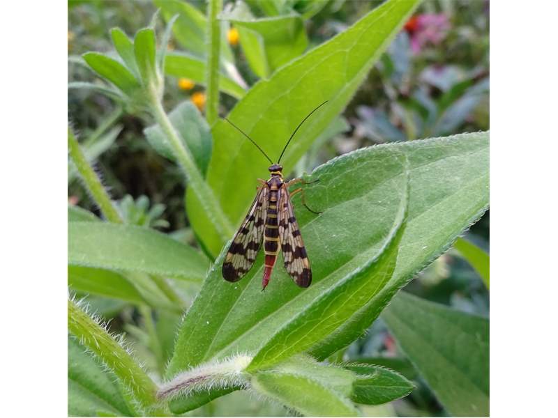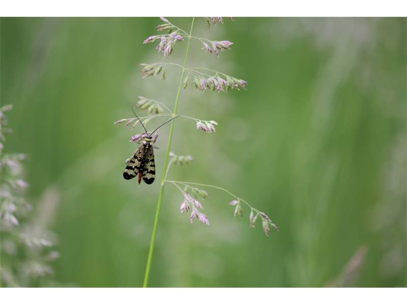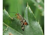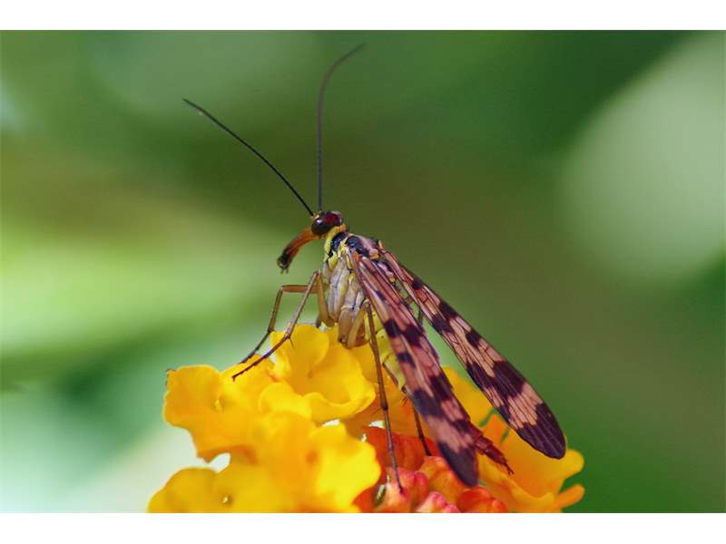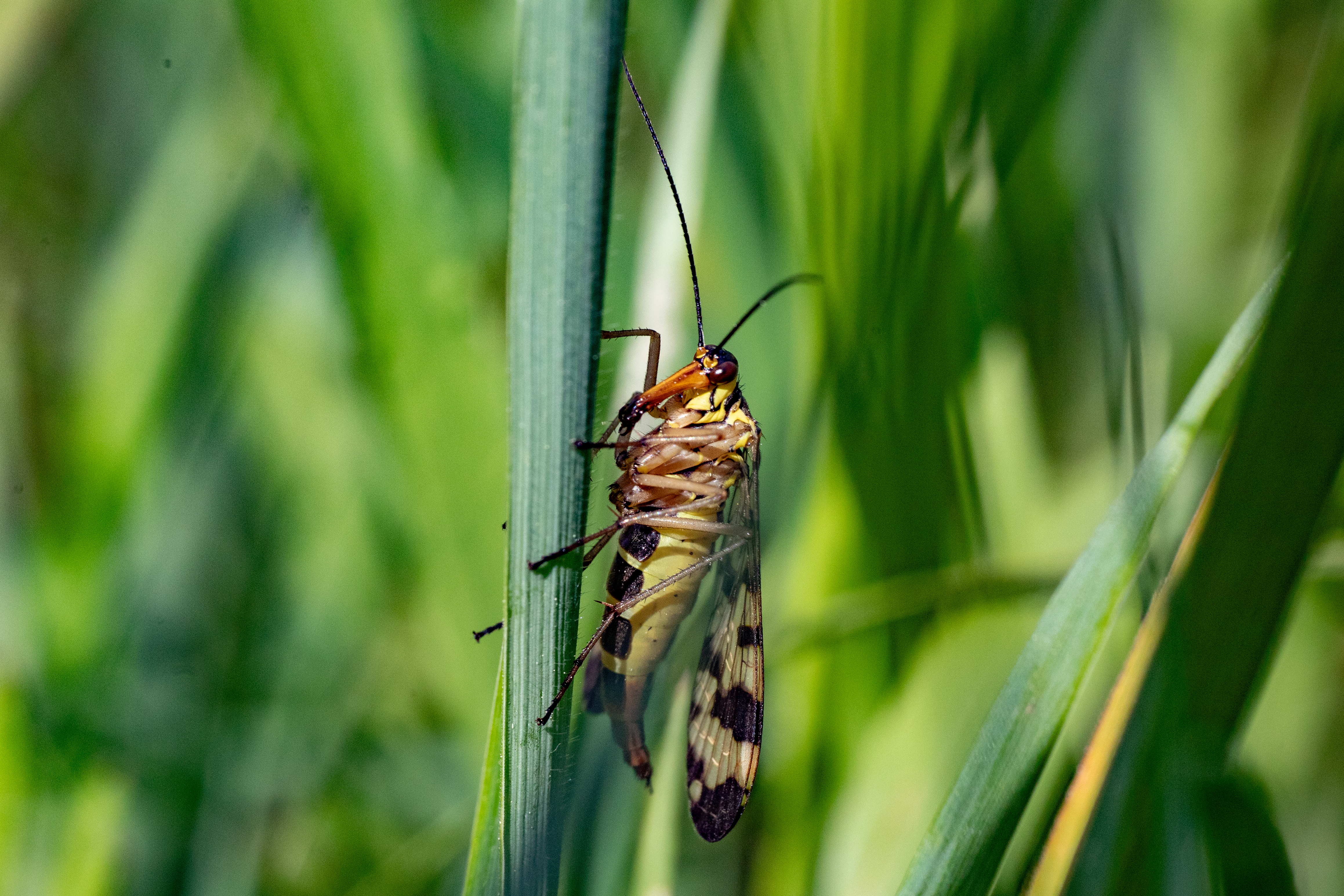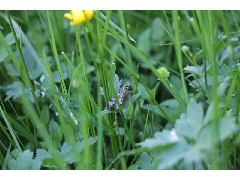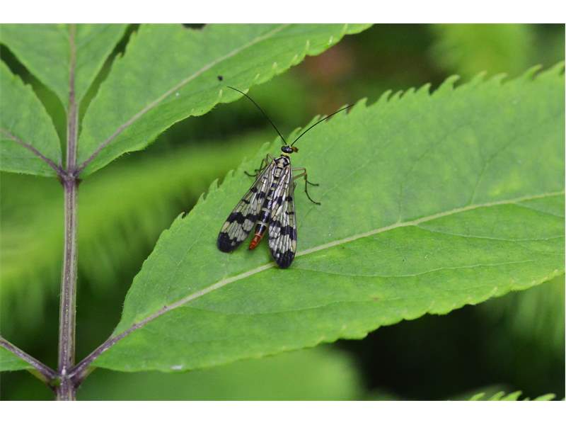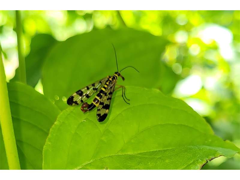 Skorpionsfliegen bei der Kopulation, (09.08.2010 im Tharandter Wald am Triebischsee). Das Männchen hält das Weibchen nicht nur mit dem zangenförmigen Abdominalfortsatz fest, sondern hat seine Flügel noch so über die des Weibchens gelegt, dass ein Fortfliegen unmöglich ist. Die Hochzeit findet an einer toten Raupe (von Gregärparasiten befallen) statt, an denen die Adulten Nahrung aufnehmen