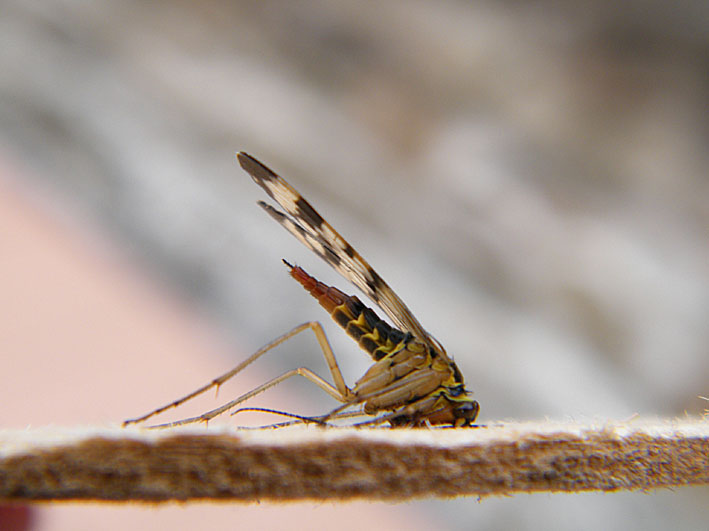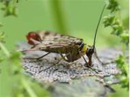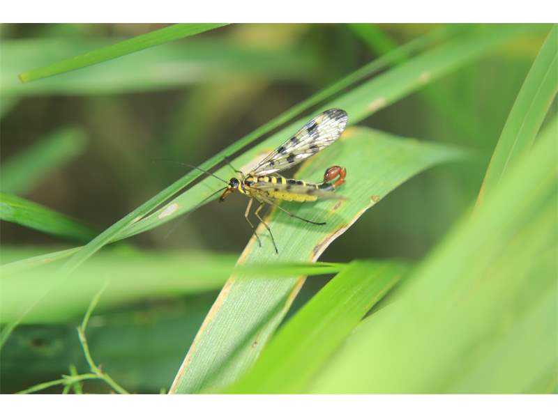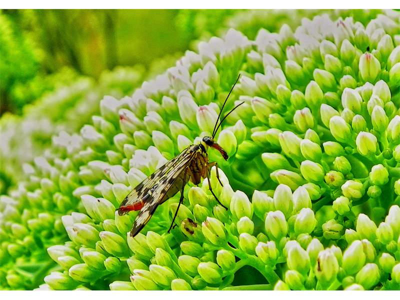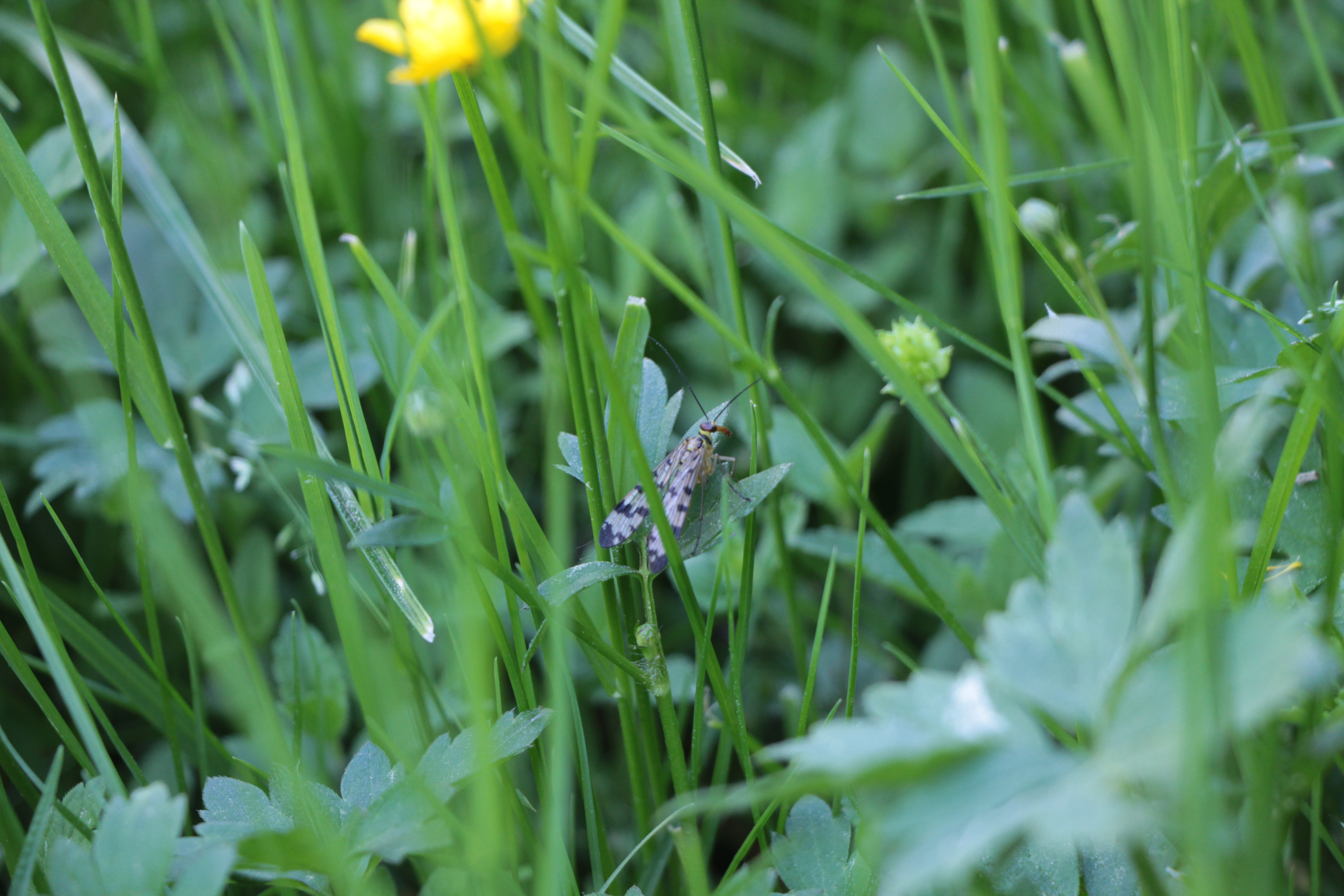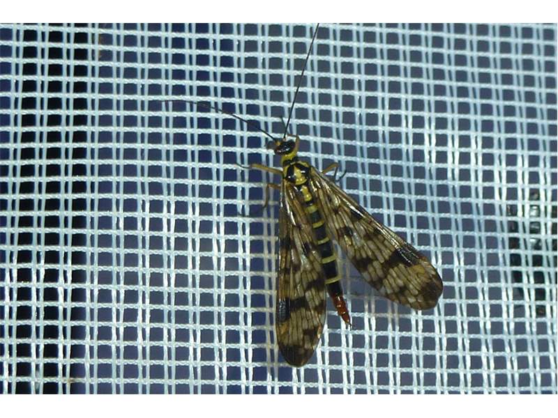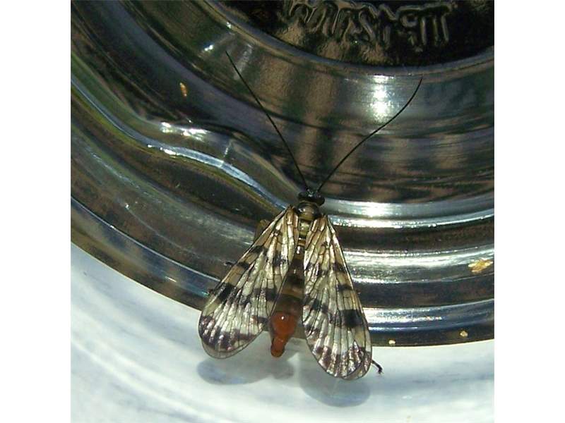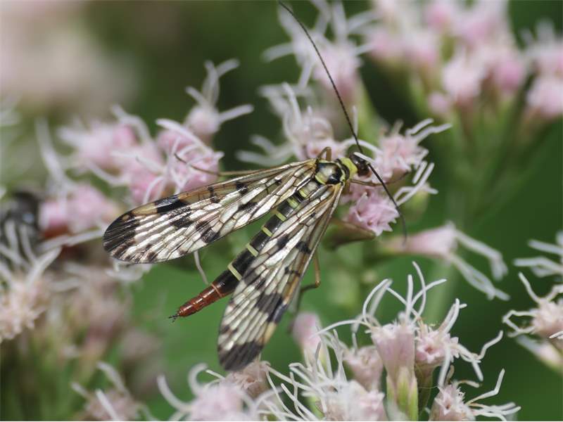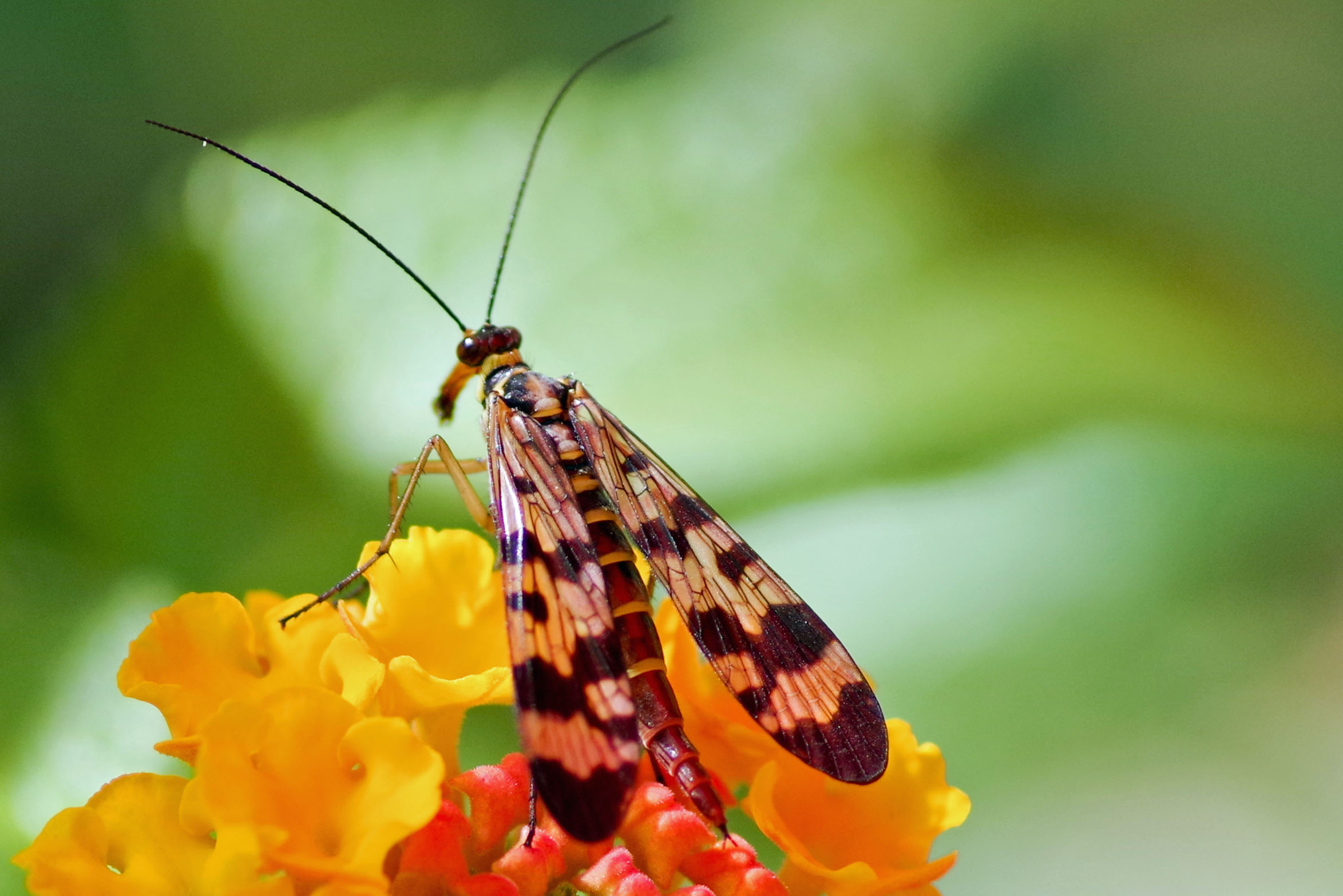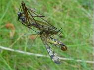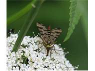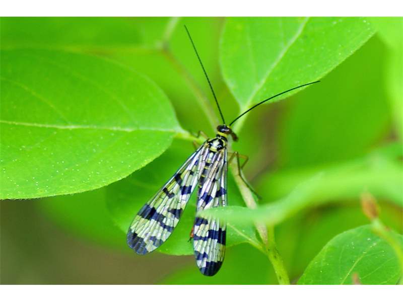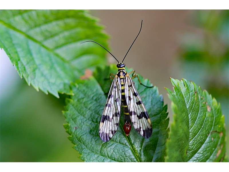 Skorpionsfliegen bei der Kopulation, (09.08.2010 im Tharandter Wald am Triebischsee). Das Männchen hält das Weibchen nicht nur mit dem zangenförmigen Abdominalfortsatz fest, sondern hat seine Flügel noch so über die des Weibchens gelegt, dass ein Fortfliegen unmöglich ist. Die Hochzeit findet an einer toten Raupe (von Gregärparasiten befallen) statt, an denen die Adulten Nahrung aufnehmen