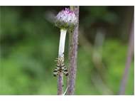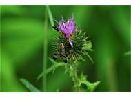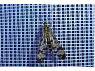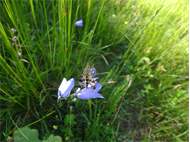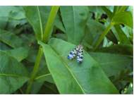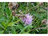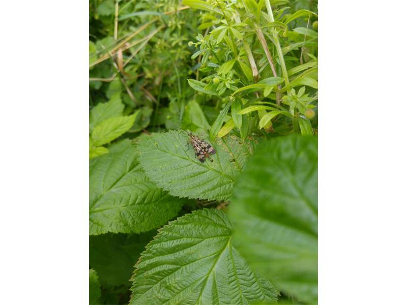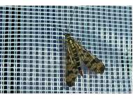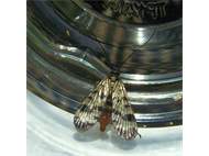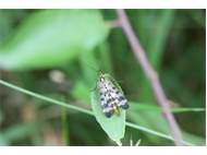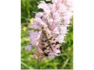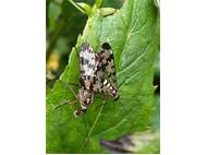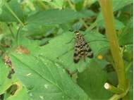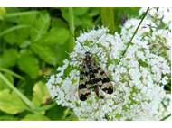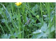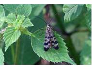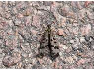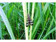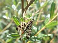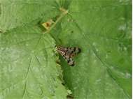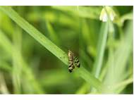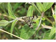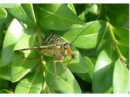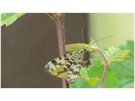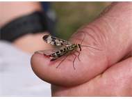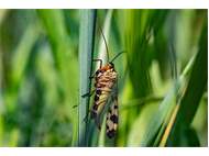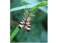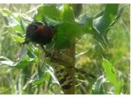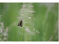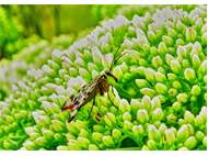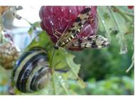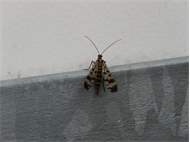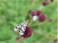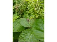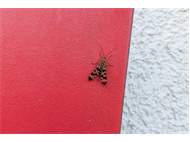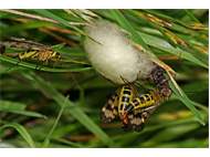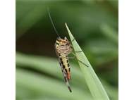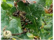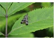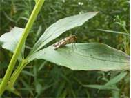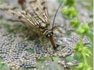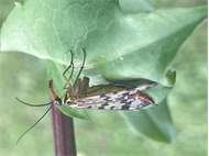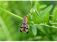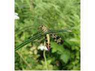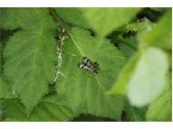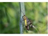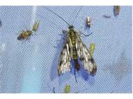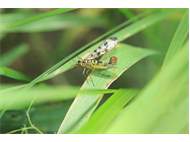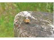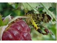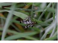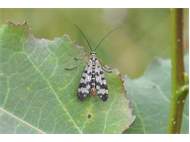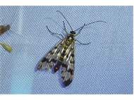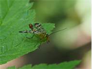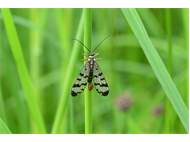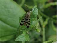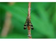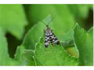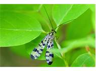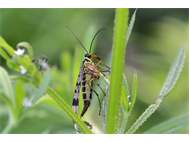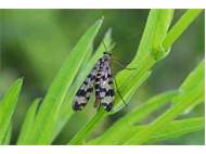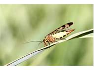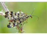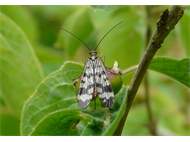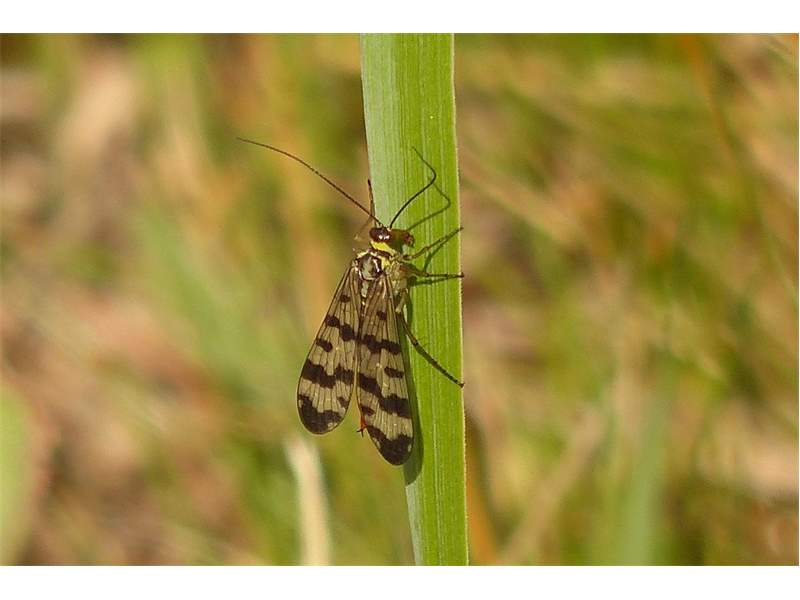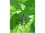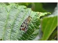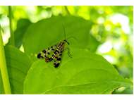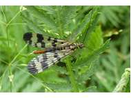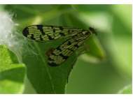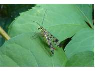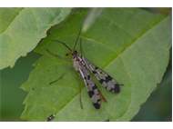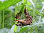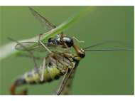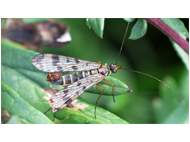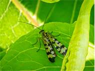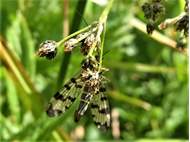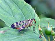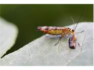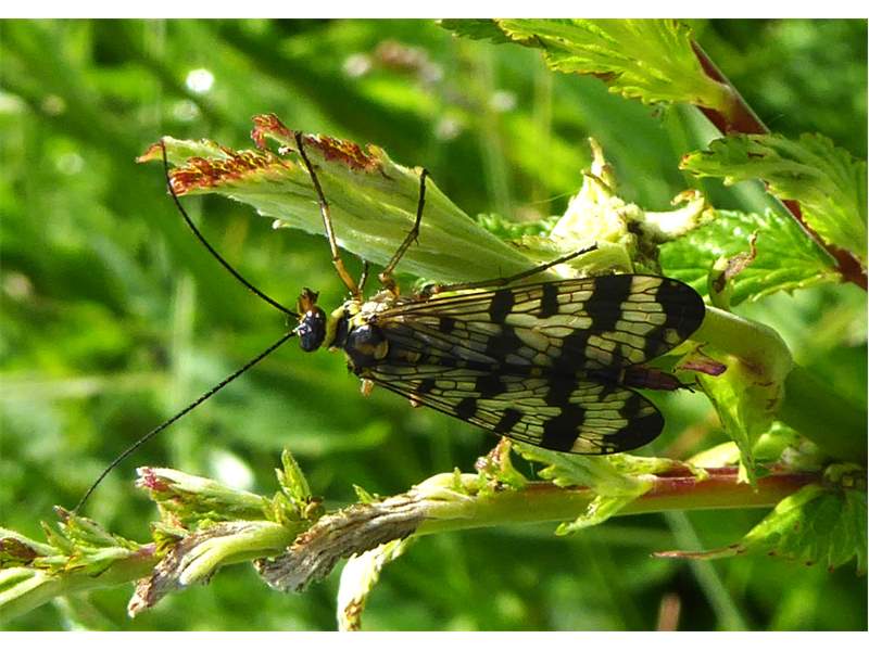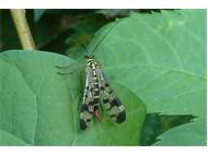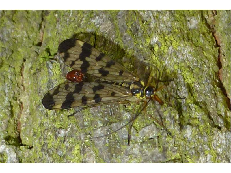 Skorpionsfliegen bei der Kopulation, (09.08.2010 im Tharandter Wald am Triebischsee). Das Männchen hält das Weibchen nicht nur mit dem zangenförmigen Abdominalfortsatz fest, sondern hat seine Flügel noch so über die des Weibchens gelegt, dass ein Fortfliegen unmöglich ist. Die Hochzeit findet an einer toten Raupe (von Gregärparasiten befallen) statt, an denen die Adulten Nahrung aufnehmen (© Lothar Brümmer )( Bild vergrößern)