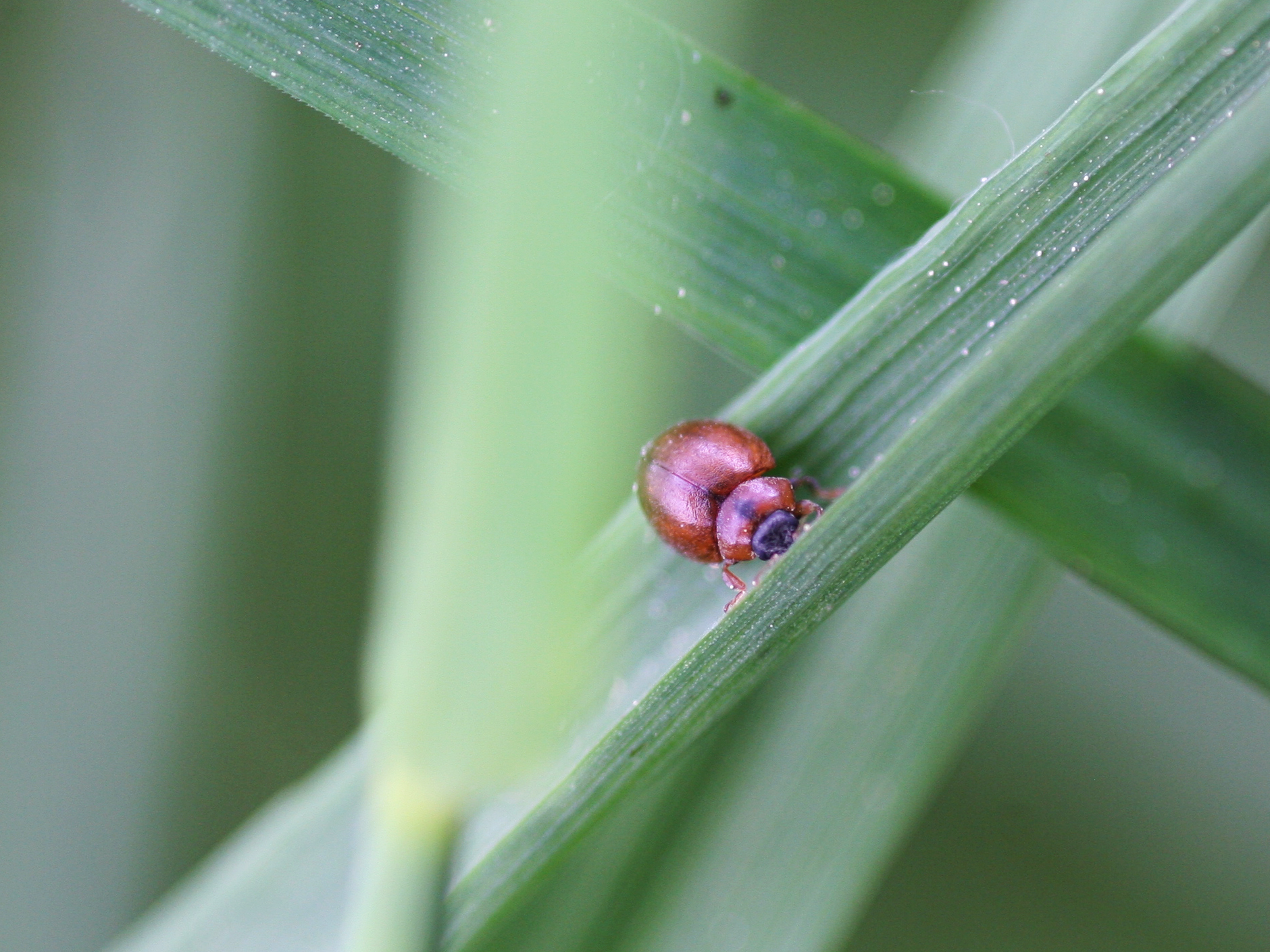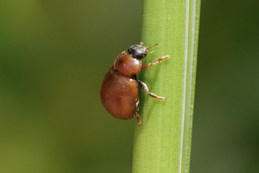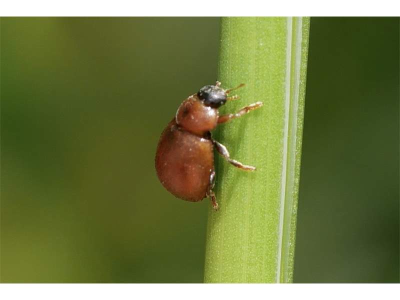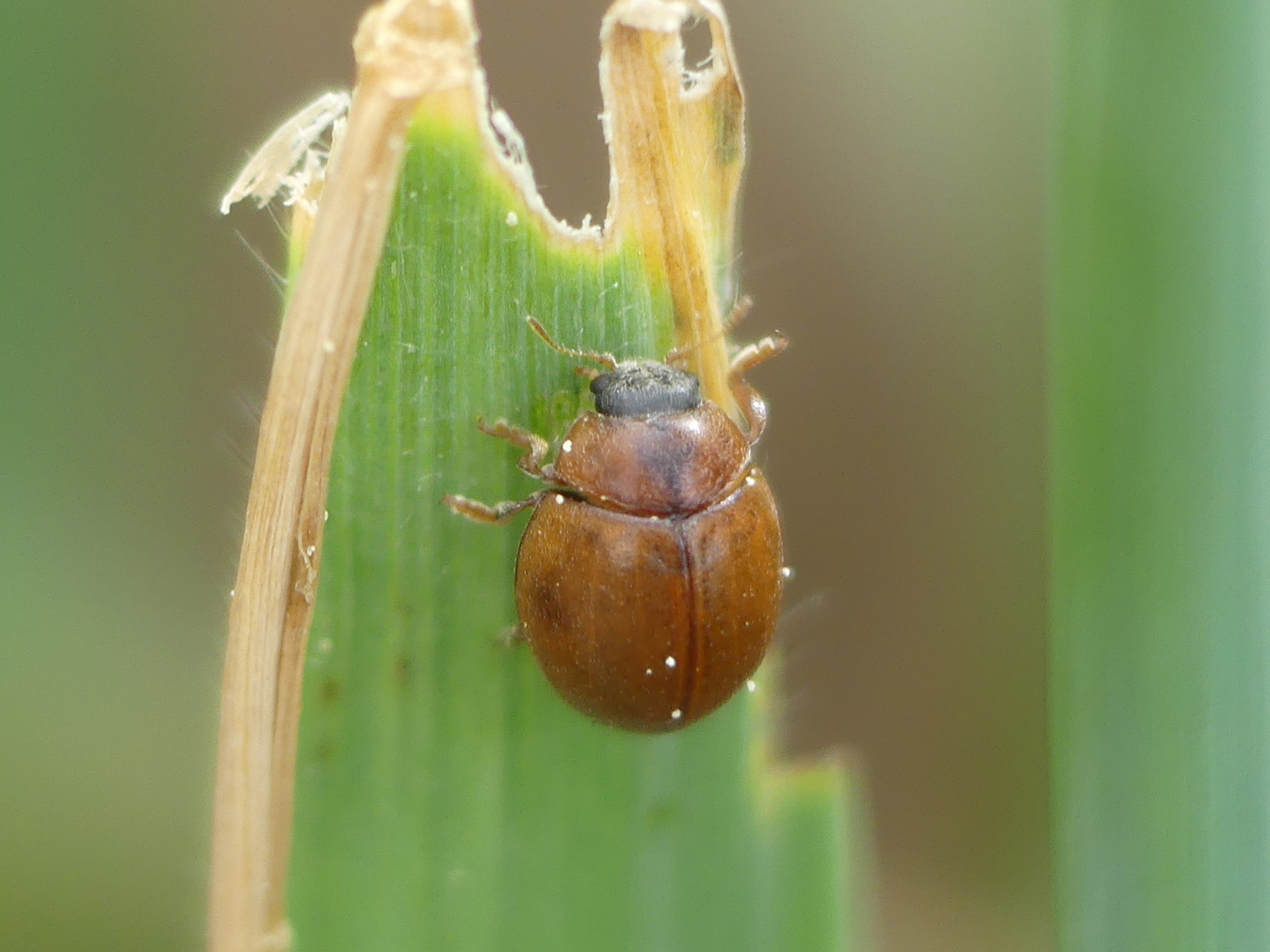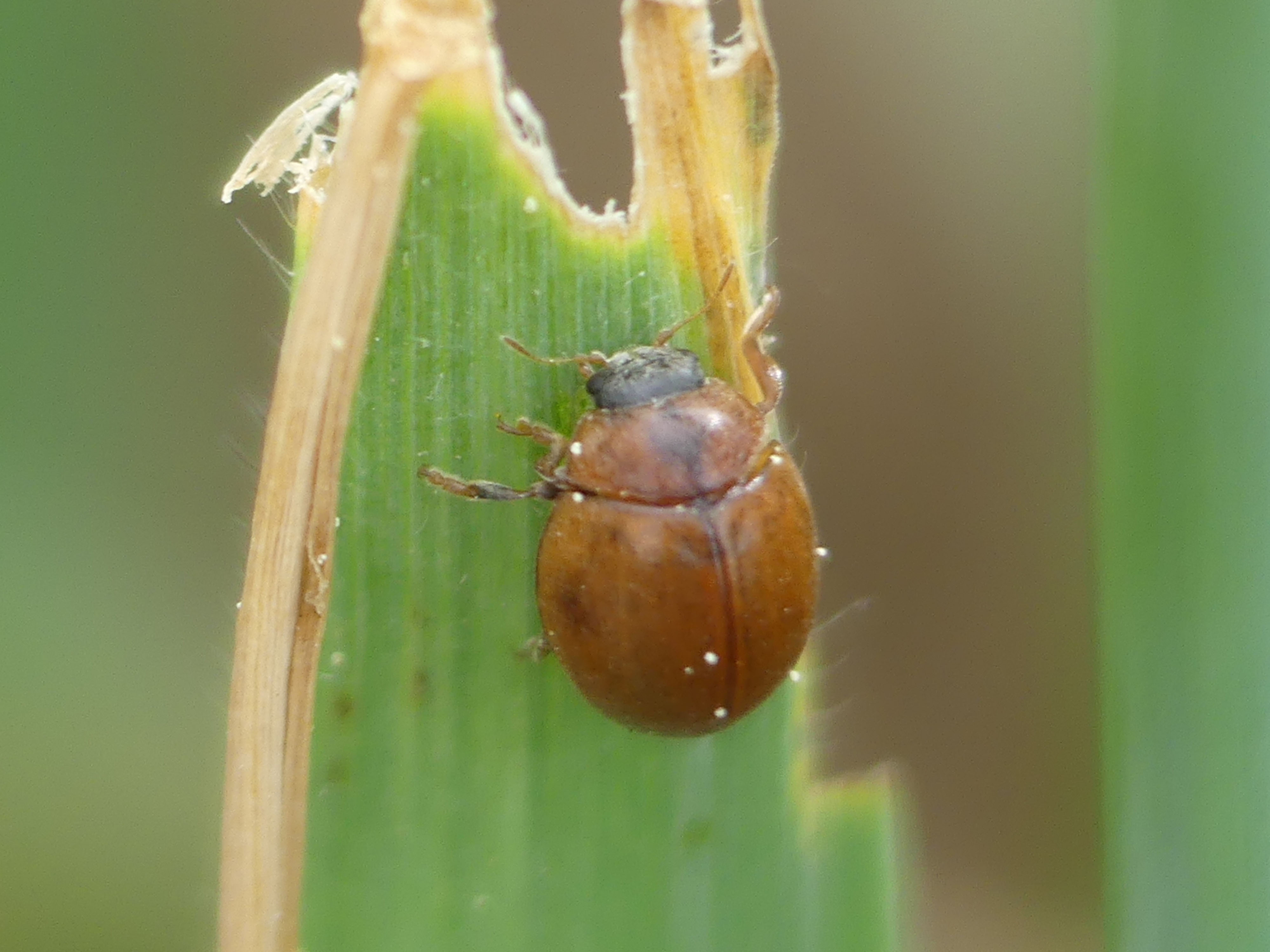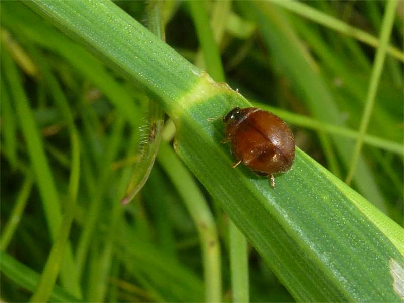 Gras-Marienkäfer (Cynegetis impunctata) in der Gemarkung Hohenprießnitz, Unterkreischaue, auf Rasen-Schmiele (Deschampsia cespitosa), April 2014