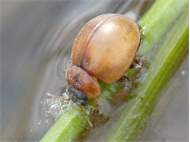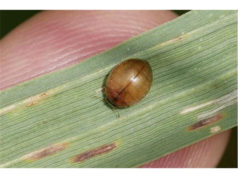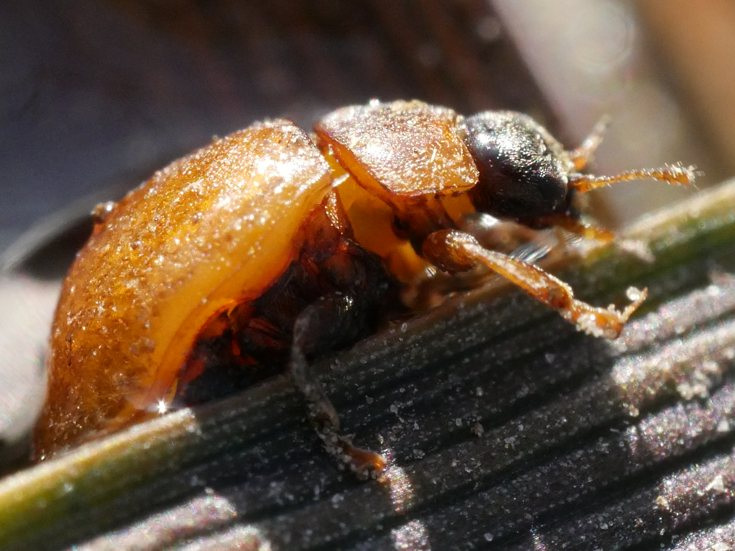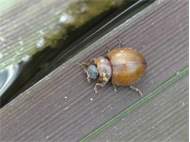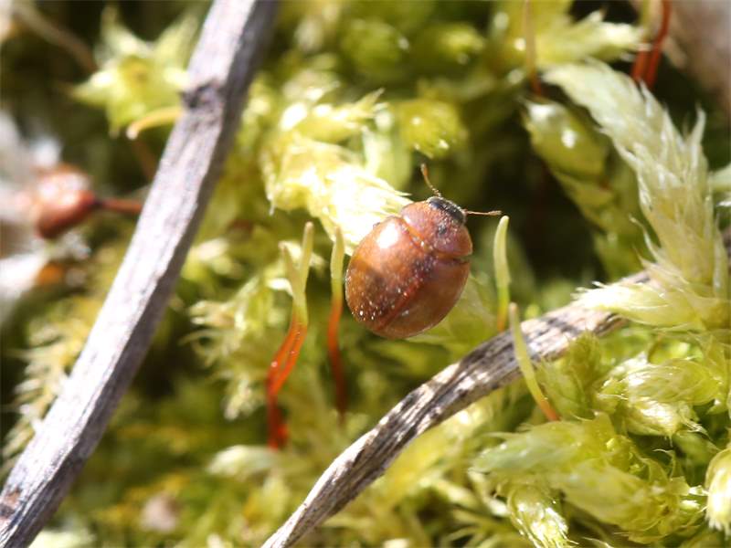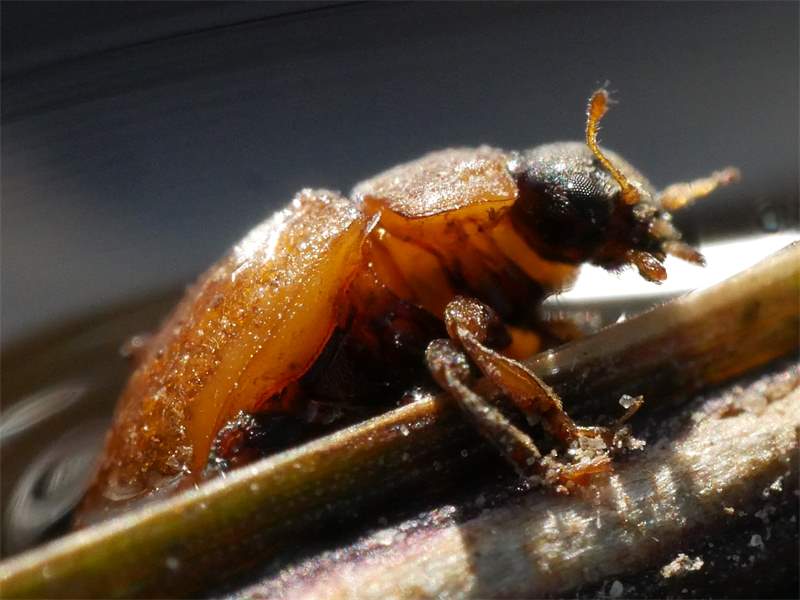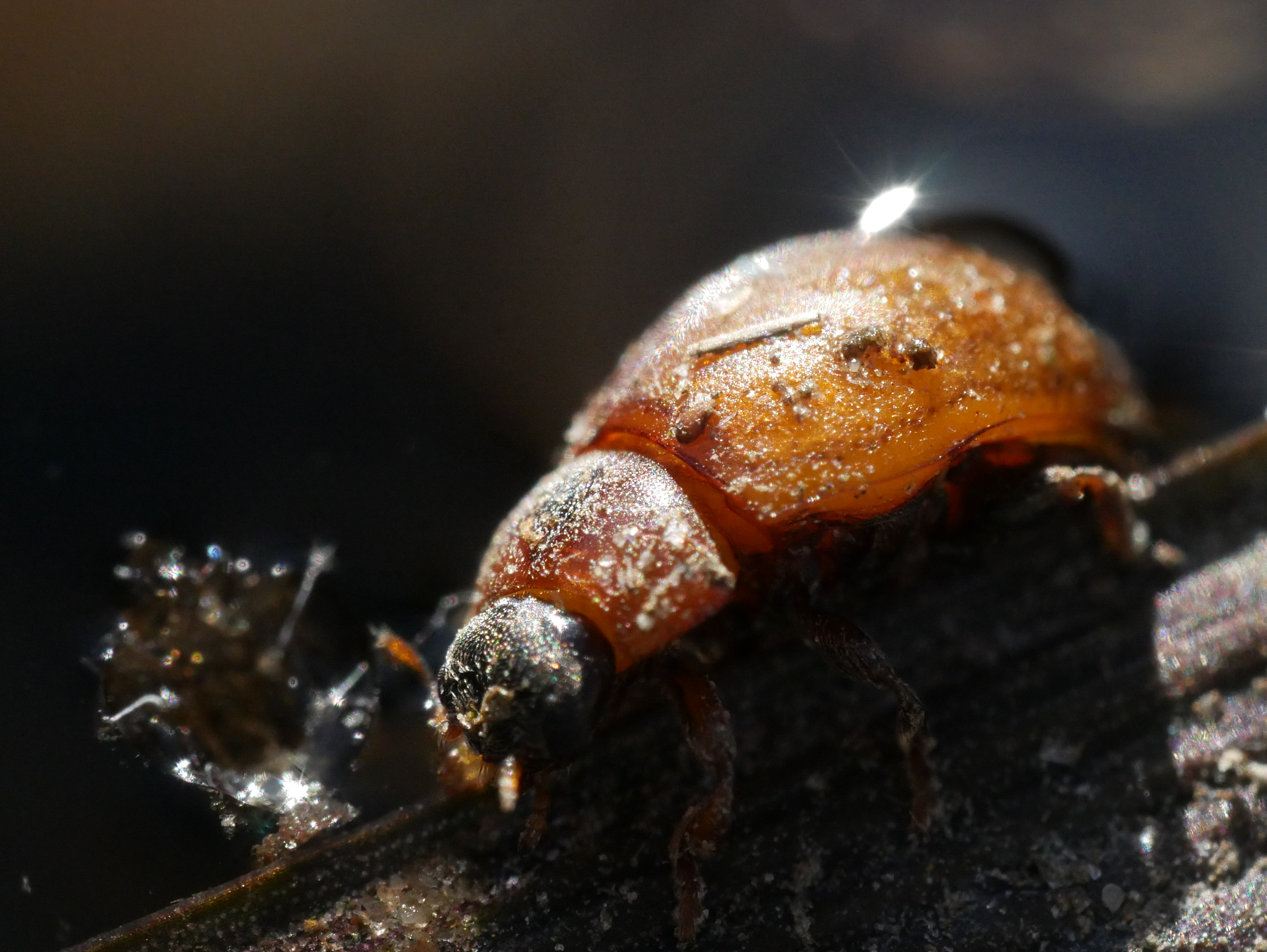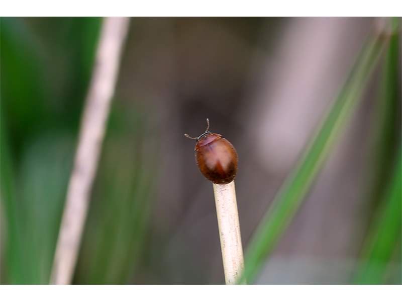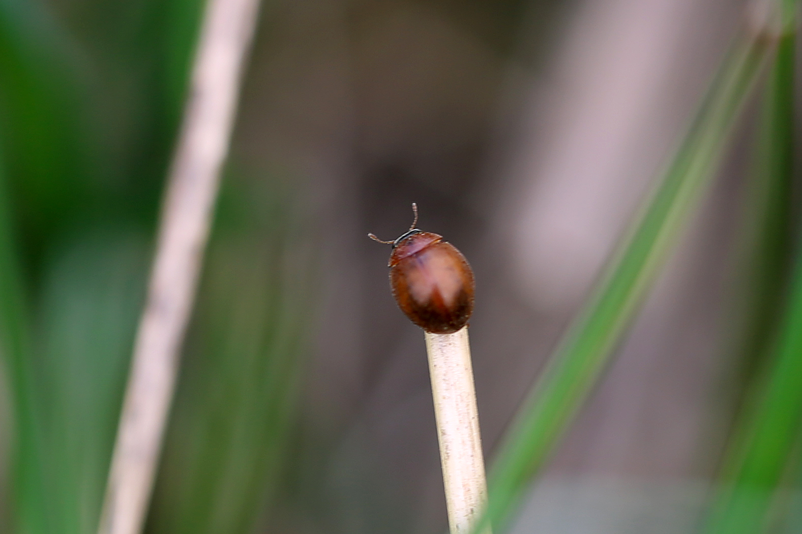 Gras-Marienkäfer (Cynegetis impunctata) in der Gemarkung Hohenprießnitz, Unterkreischaue, auf Rasen-Schmiele (Deschampsia cespitosa), April 2014