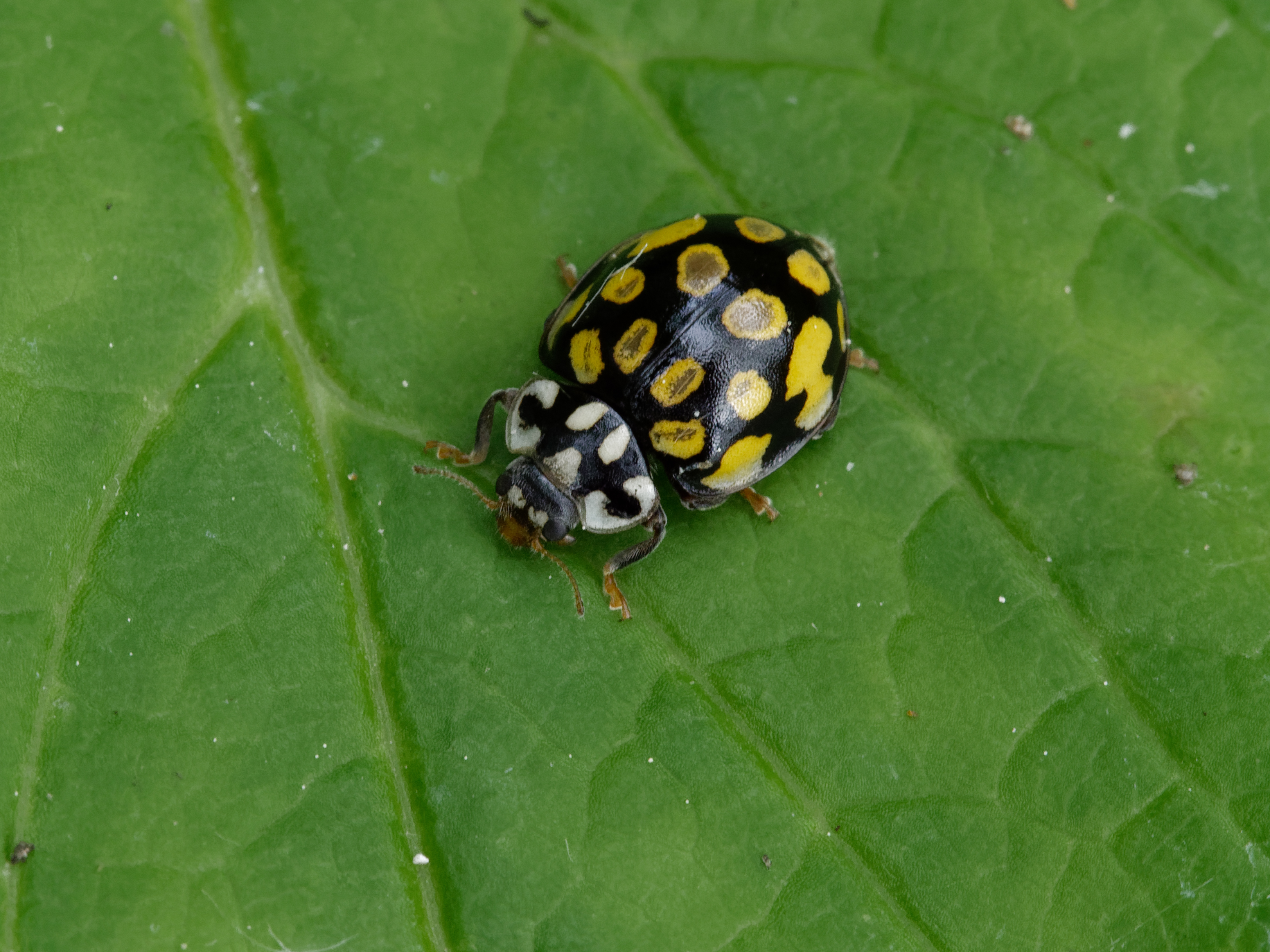 Thorax: Halsschild braun oder schwarz, an den Seiten mit einem großen breiten C-Fleck, vorn in der Mitte mit einem weißen Dreieck und hinten in der Mitte mit einem großen Doppelfleck. Flügeldecken schwarz oder braun mit weißlichen Flecken, bei schwarzen Individuen können die Flecke auch intensiv gelb sein; von den insgesamt 20 Flecken (Name!) sind die vorderen 4, in einem Halbkreis zum Halsschild angeordneten Flecke, charakteristisch.