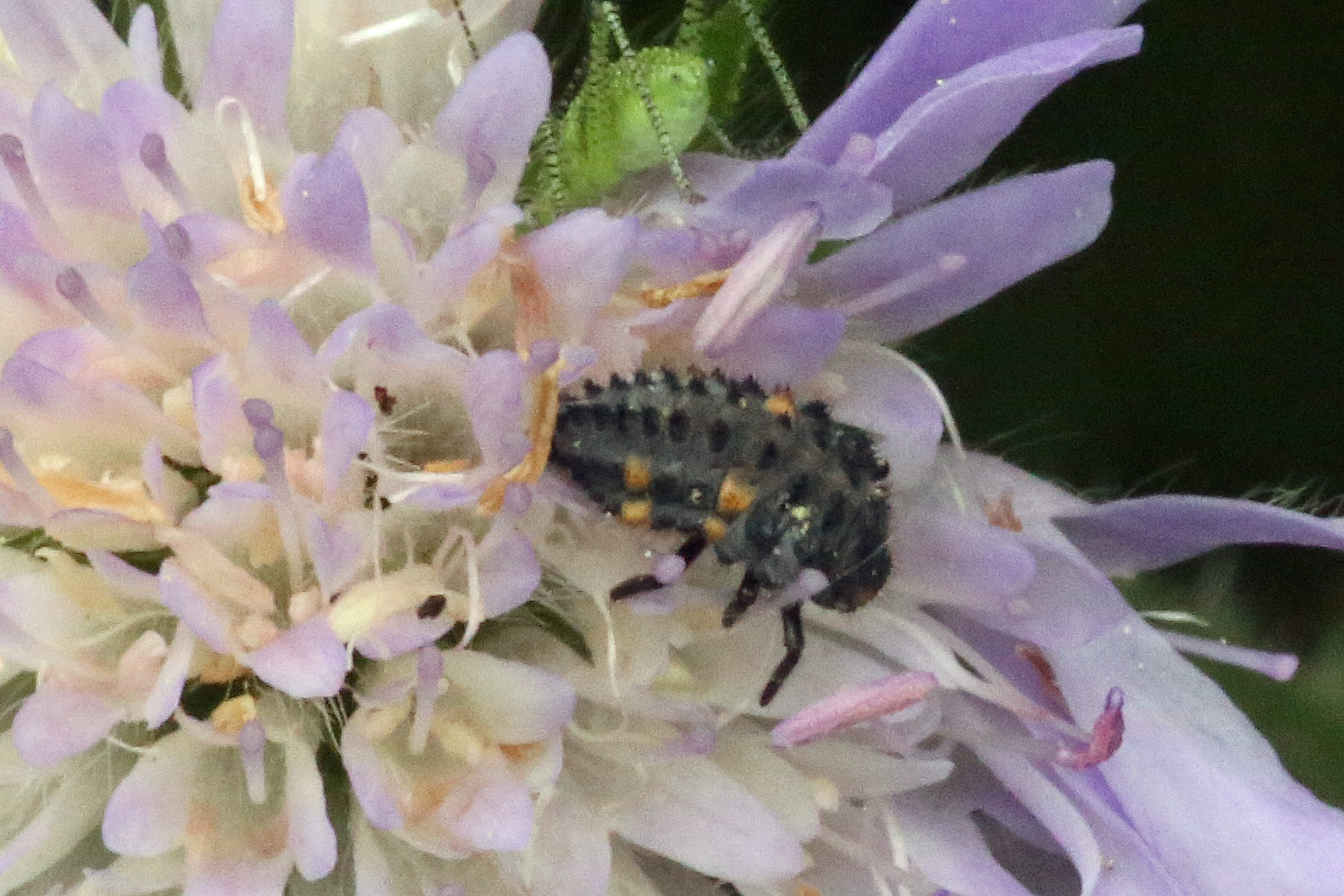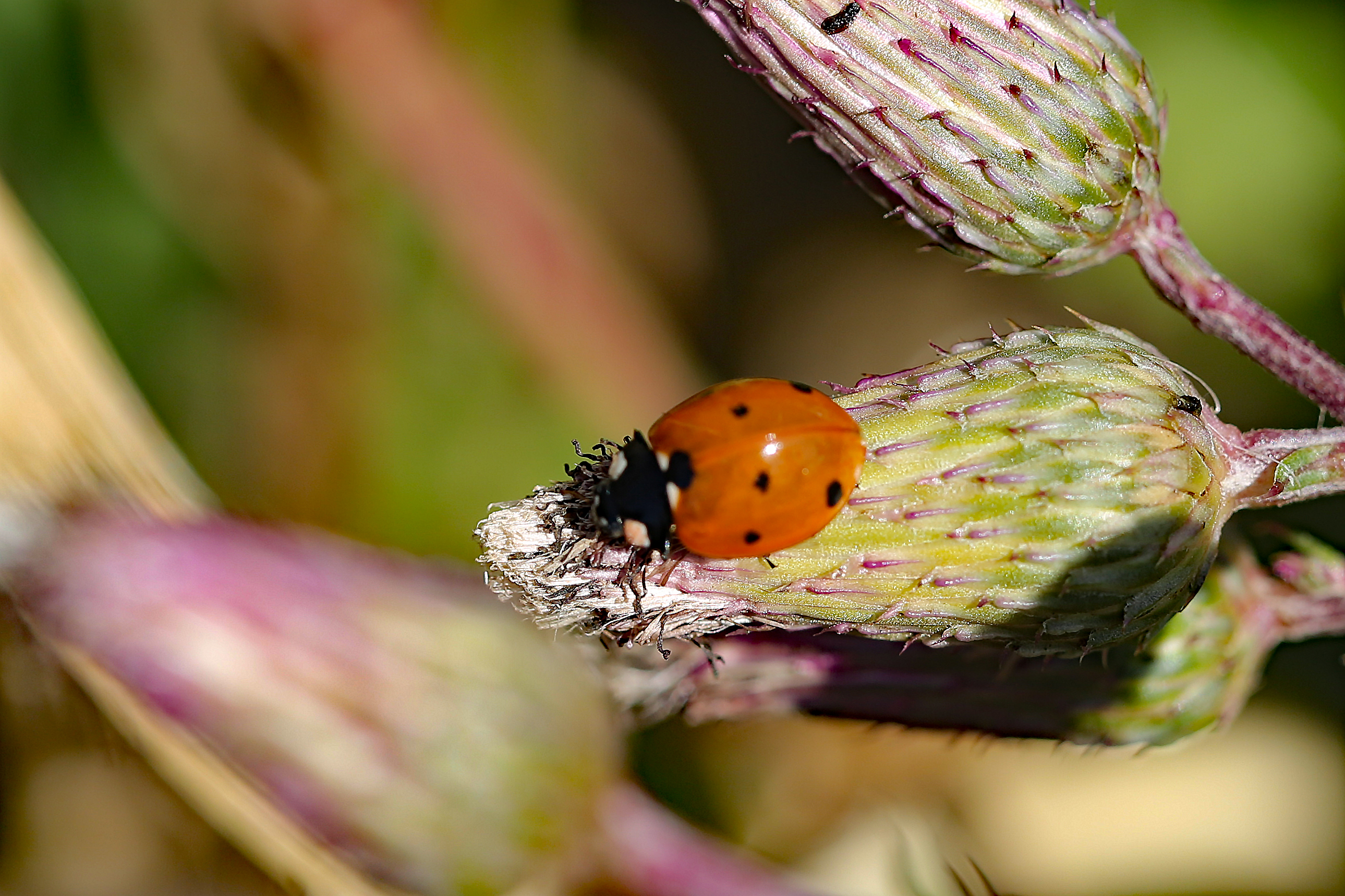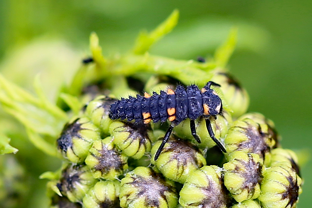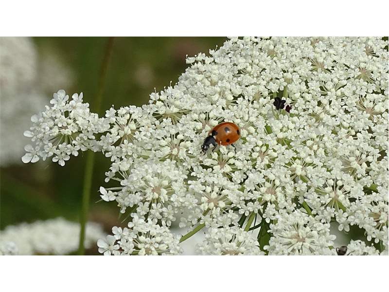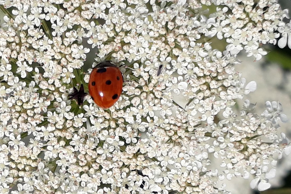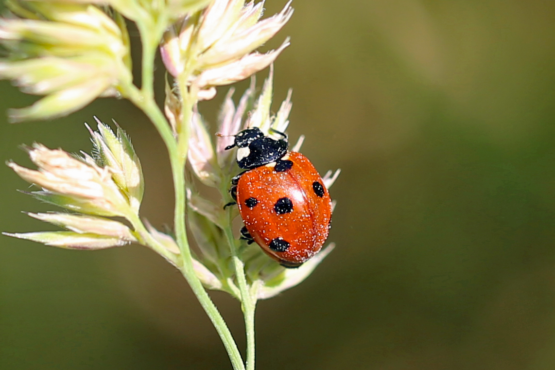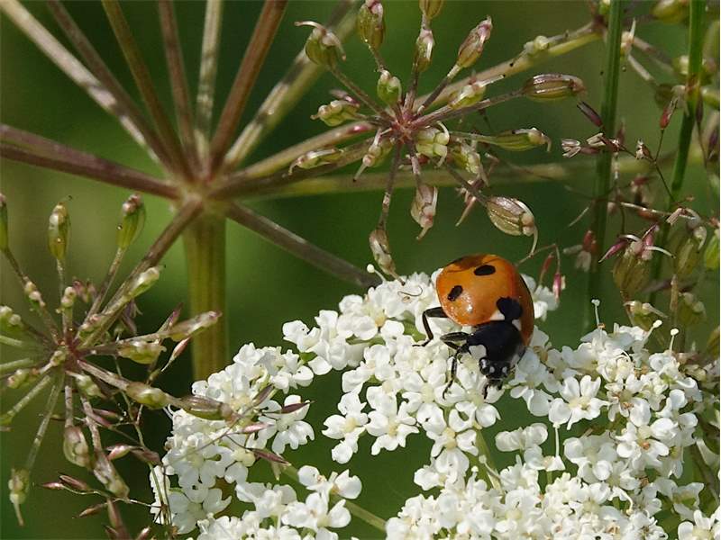 Siebenpunkt-Marienkäfer (Coccinella septempunctata Linnaeus, 1758) Brand-Erbisdorf OT Langenau, Oberreichenbacher Straße, Feldrand, Juli 2019, Sommertreffen