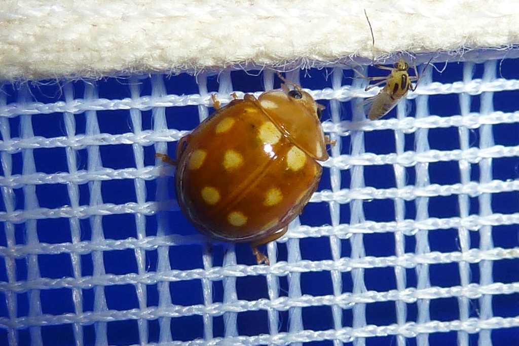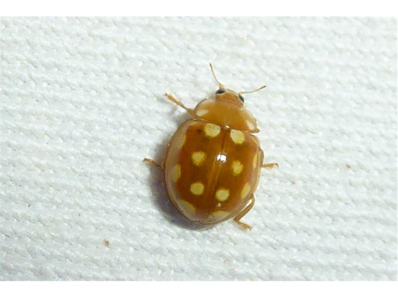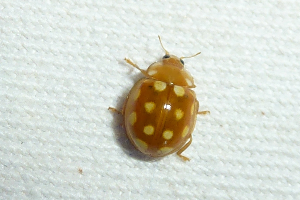 Thorax: Halsschild (Pronotum) hellbraun, in den Vorder- und Hinterecken mit je einem weißen Fleck sowie einer undeutlichen oder fehlenden Mittellinie, die am Hinterrand zu einem weißen Fleck erweitert ist, aber auch fehlen kann. Flügeldecken hellbraun, außen weiß gerandet, mit je (6–) 7 Punkten; diese sind auf jeder Flügeldecke in 4 Querreihen mit je 2-2-2-1 Punkten angeordnet. Der Punkt in den vorderen, äußeren Flügelecken ist schwach ausgeprägt und kann auch fehlen.