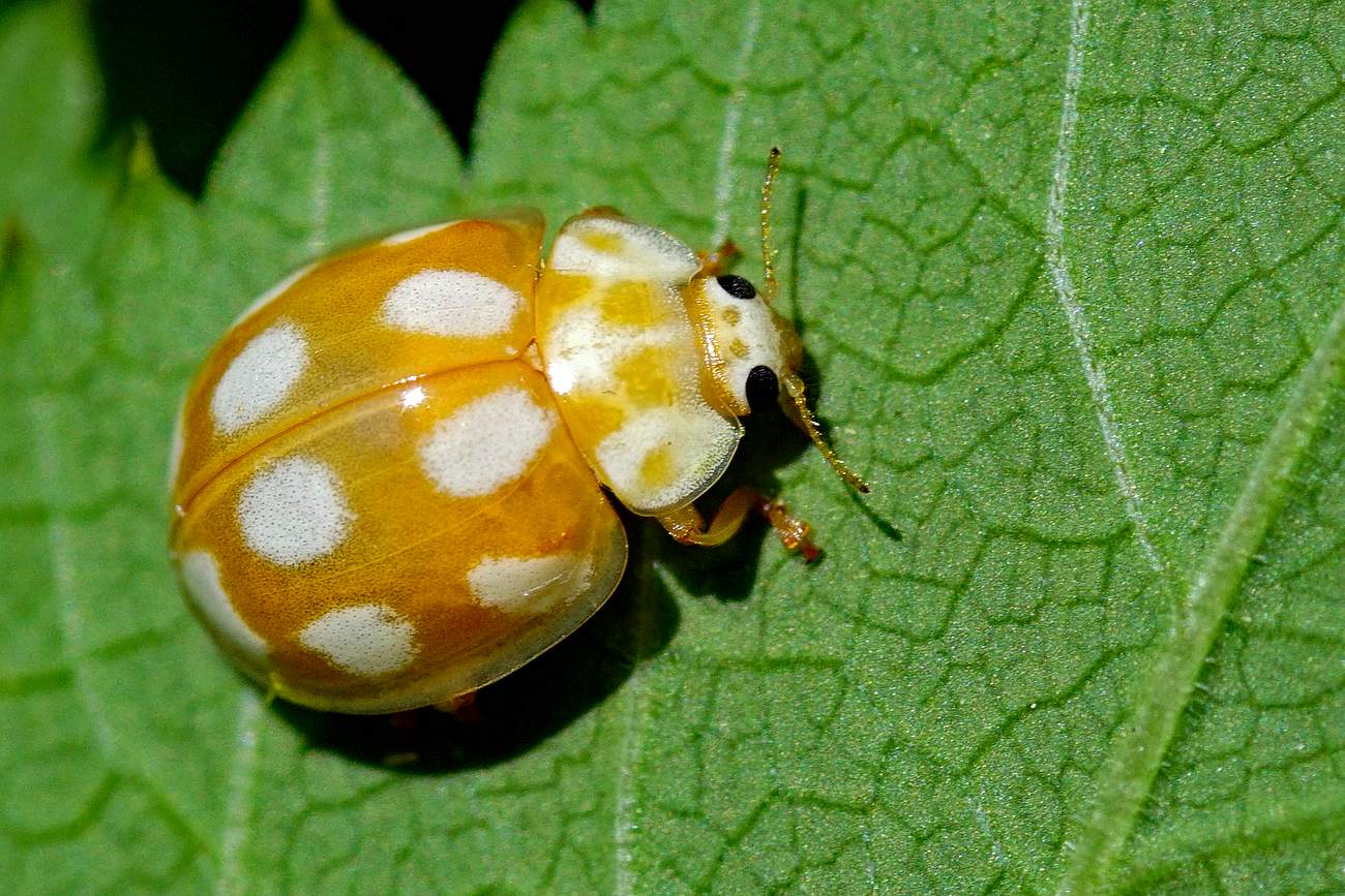 Thorax: Halsschild, Beine und Flügeldecken hellbraun. Halsschild vorn und seitlich verwaschen weiß gerandet, eine feine weiße Mittellinie sowie an den Hinterecken und am Hinterrand in der Mitte je ein verwaschener weißer Fleck. Flügeldecken (Elytren) mit 10 großen runden Punkten (Name!); diese sind auf jeder Flügeldecke in 3 Querreihen mit je 2-2-1 Punkten angeordnet.